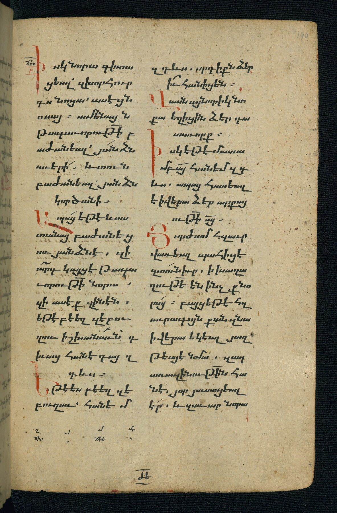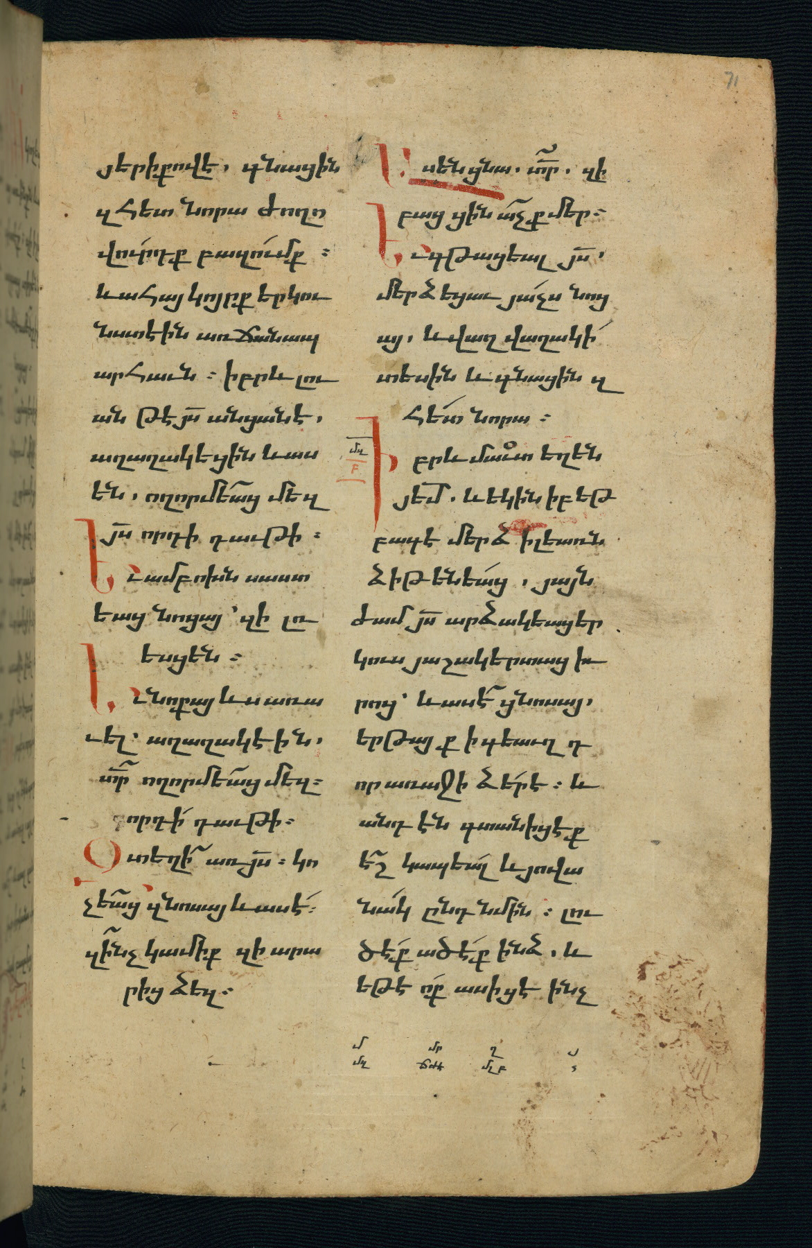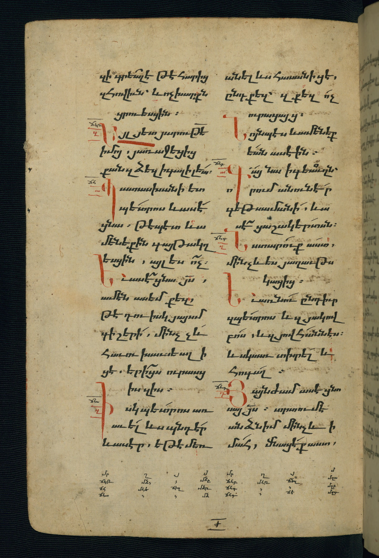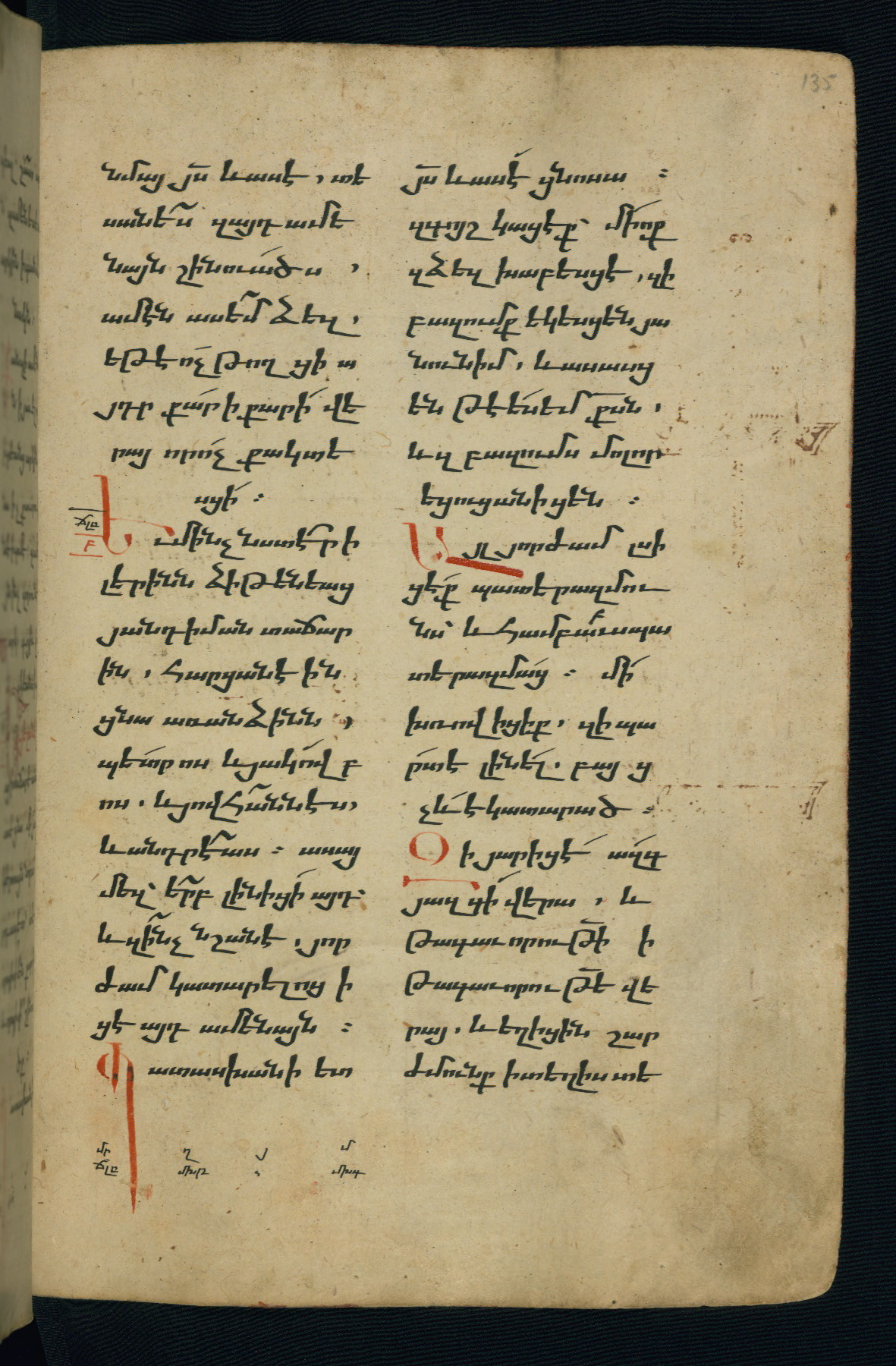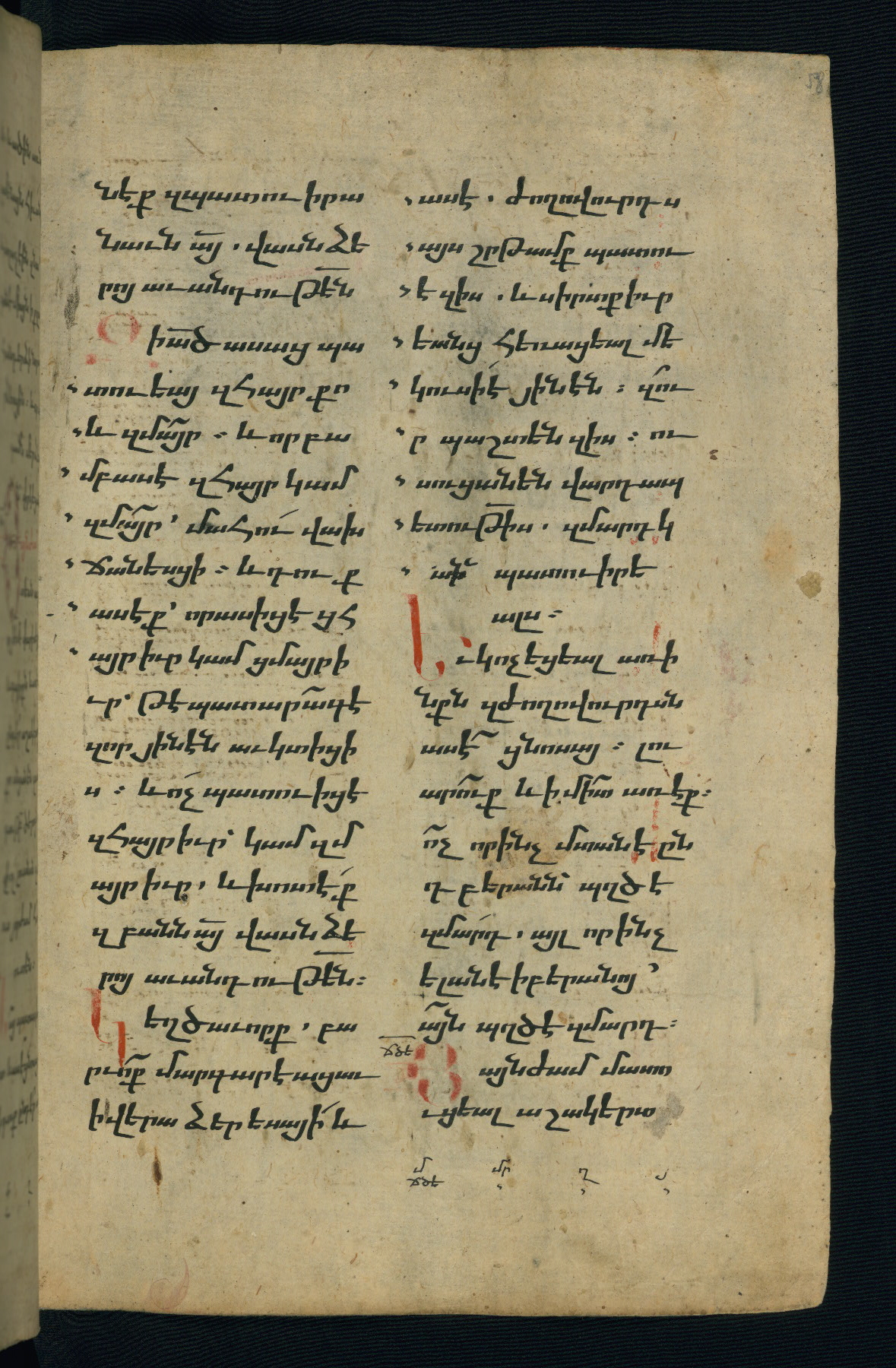 This Armenian Gospel book was produced in 904 of the Armenian era (1455 CE) at the monastery of Gamałiēl in Xizan by the scribe Yohannēs Vardapet, son of Vardan and Dilšat, and was illuminated by the priest Xačʿatur. The priest Pʿilipos commissioned the manuscript as a memorial to himself, his parents Łazar and Xutʿlumēlikʿ, and other relatives listed in the colophon on fols. 300r to 301v. Pʿilipos is depicted on fol. 14v alongside his brothers Yusēpʿ and Sultanša, as they kneel before the Virgin and Child enthroned (Theotokos). The book contains twenty-six full-page polychrome miniatures, including four Evangelist portraits; ornately designed canon tables; four decorated incipit pages; numerous marginal miniatures of floral and faunal motifs; and nineteen marginal miniatures of biblical characters or allusions to biblical narratives.