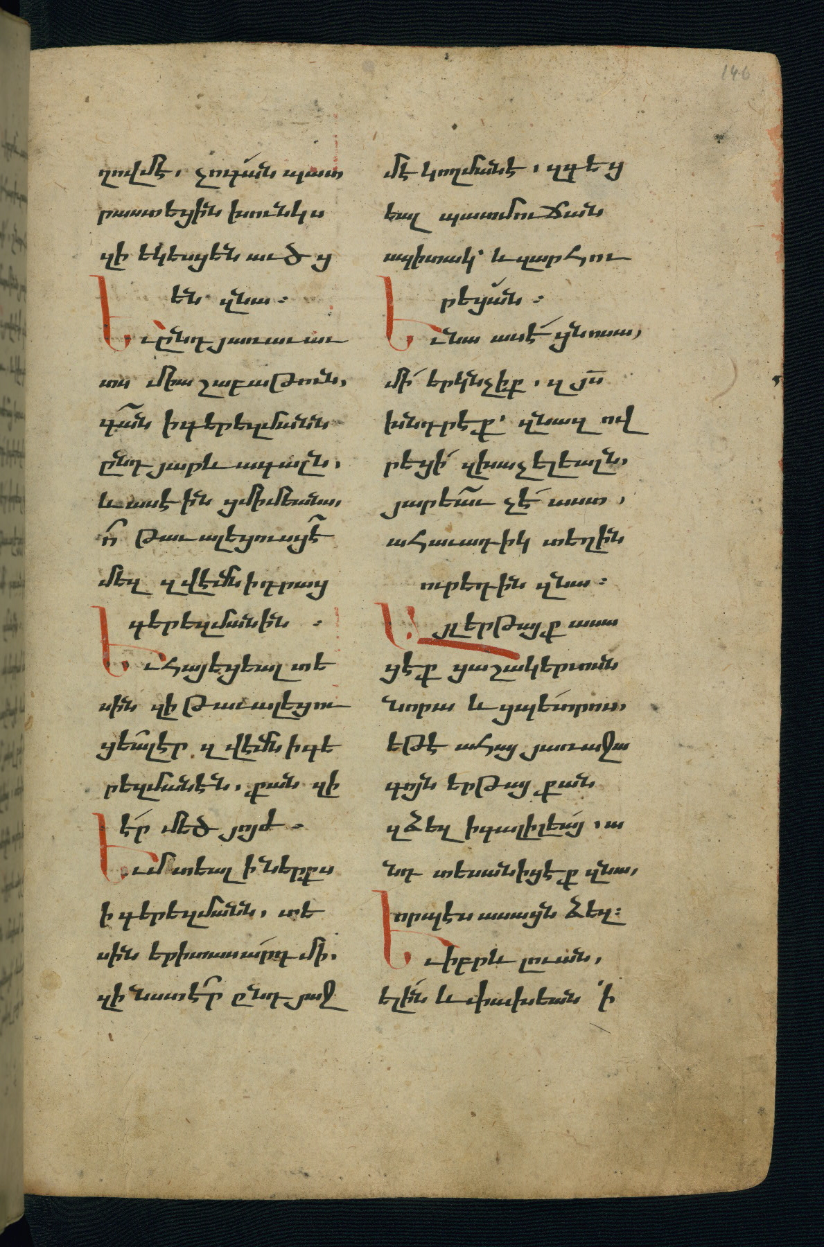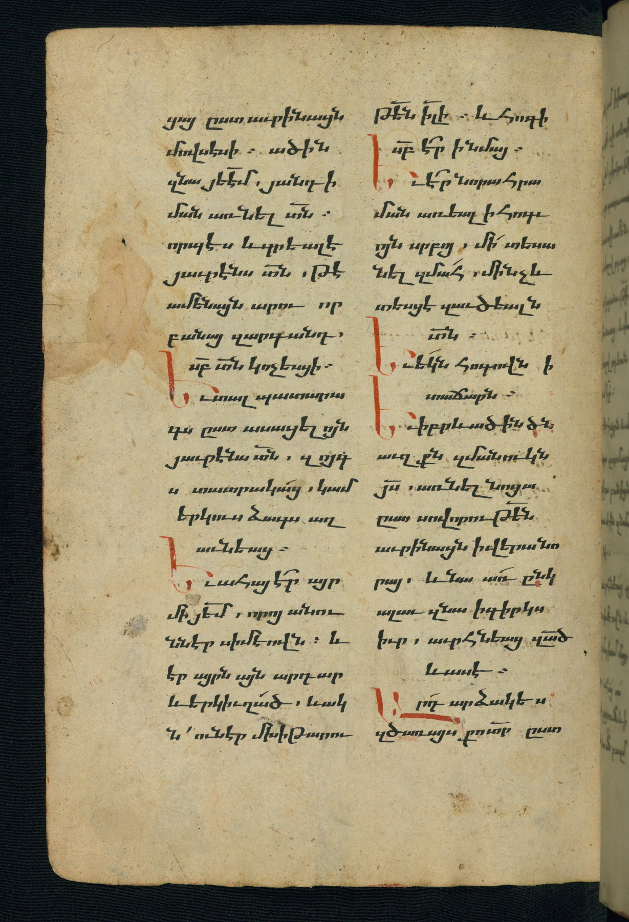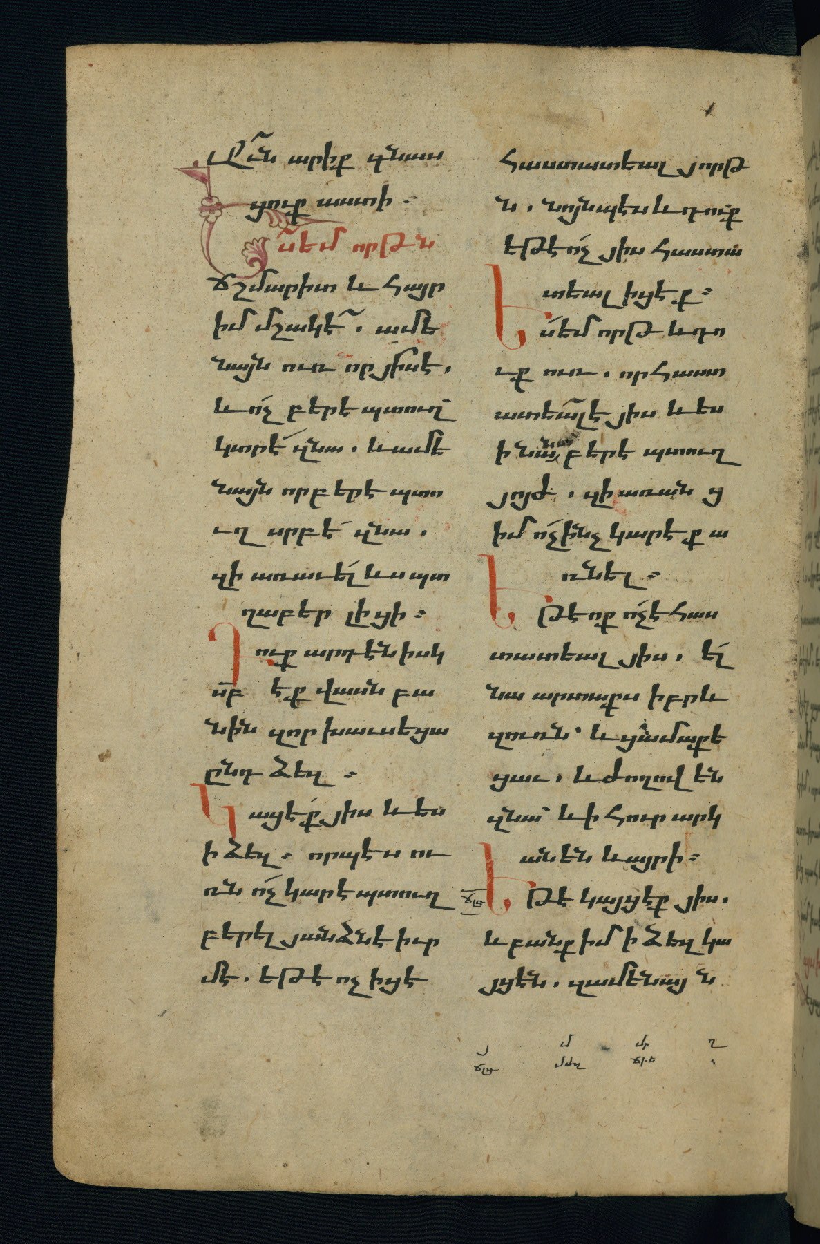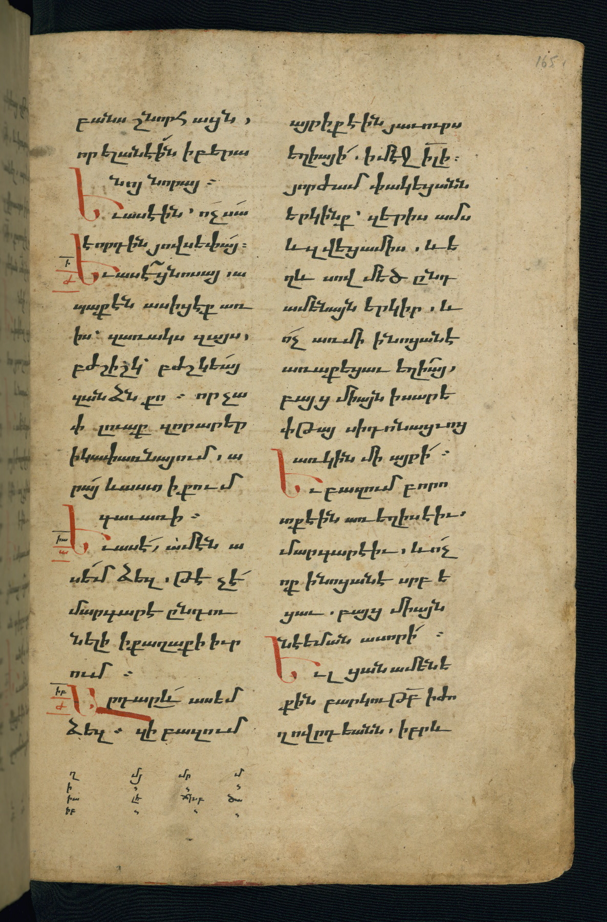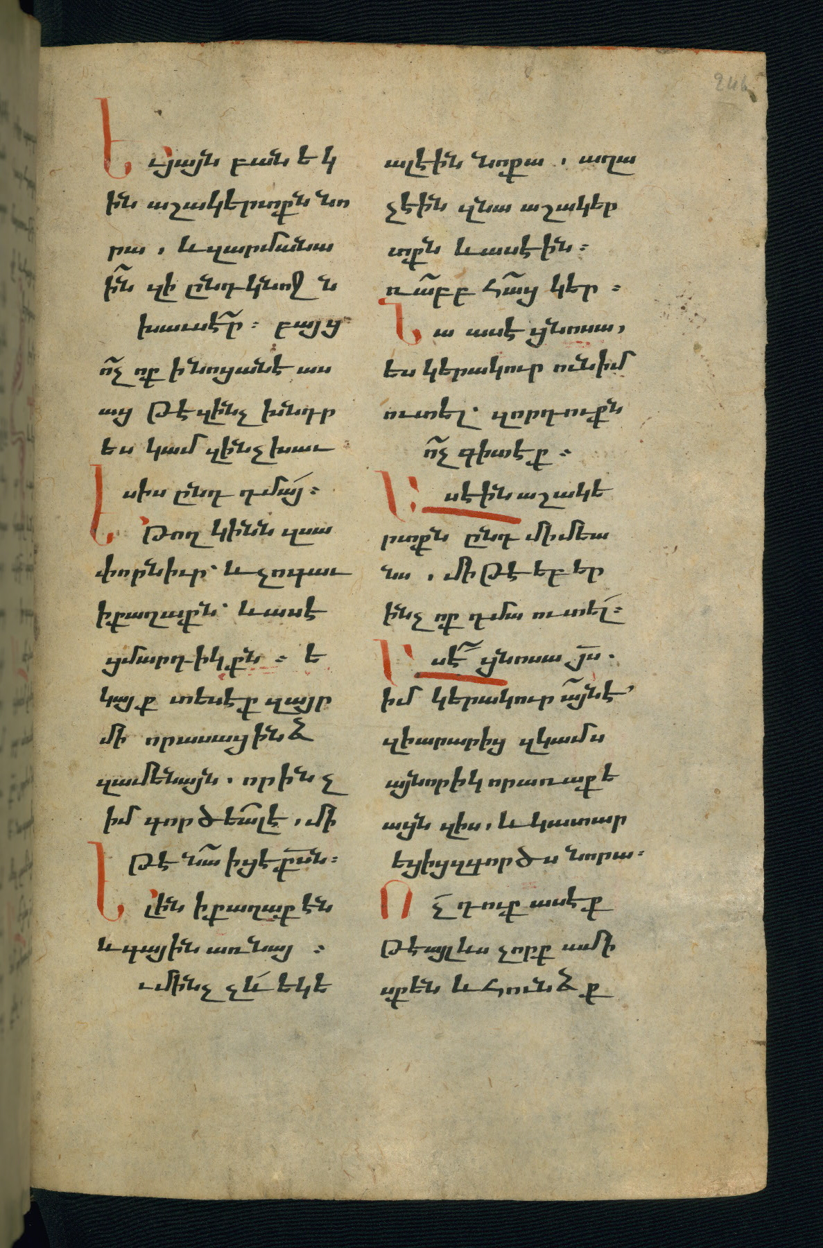 This Armenian Gospel book was produced in 904 of the Armenian era (1455 CE) at the monastery of Gamałiēl in Xizan by the scribe Yohannēs Vardapet, son of Vardan and Dilšat, and was illuminated by the priest Xačʿatur. The priest Pʿilipos commissioned the manuscript as a memorial to himself, his parents Łazar and Xutʿlumēlikʿ, and other relatives listed in the colophon on fols. 300r to 301v. Pʿilipos is depicted on fol. 14v alongside his brothers Yusēpʿ and Sultanša, as they kneel before the Virgin and Child enthroned (Theotokos). The book contains twenty-six full-page polychrome miniatures, including four Evangelist portraits; ornately designed canon tables; four decorated incipit pages; numerous marginal miniatures of floral and faunal motifs; and nineteen marginal miniatures of biblical characters or allusions to biblical narratives.