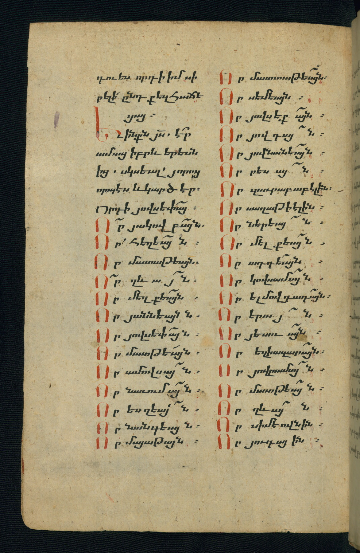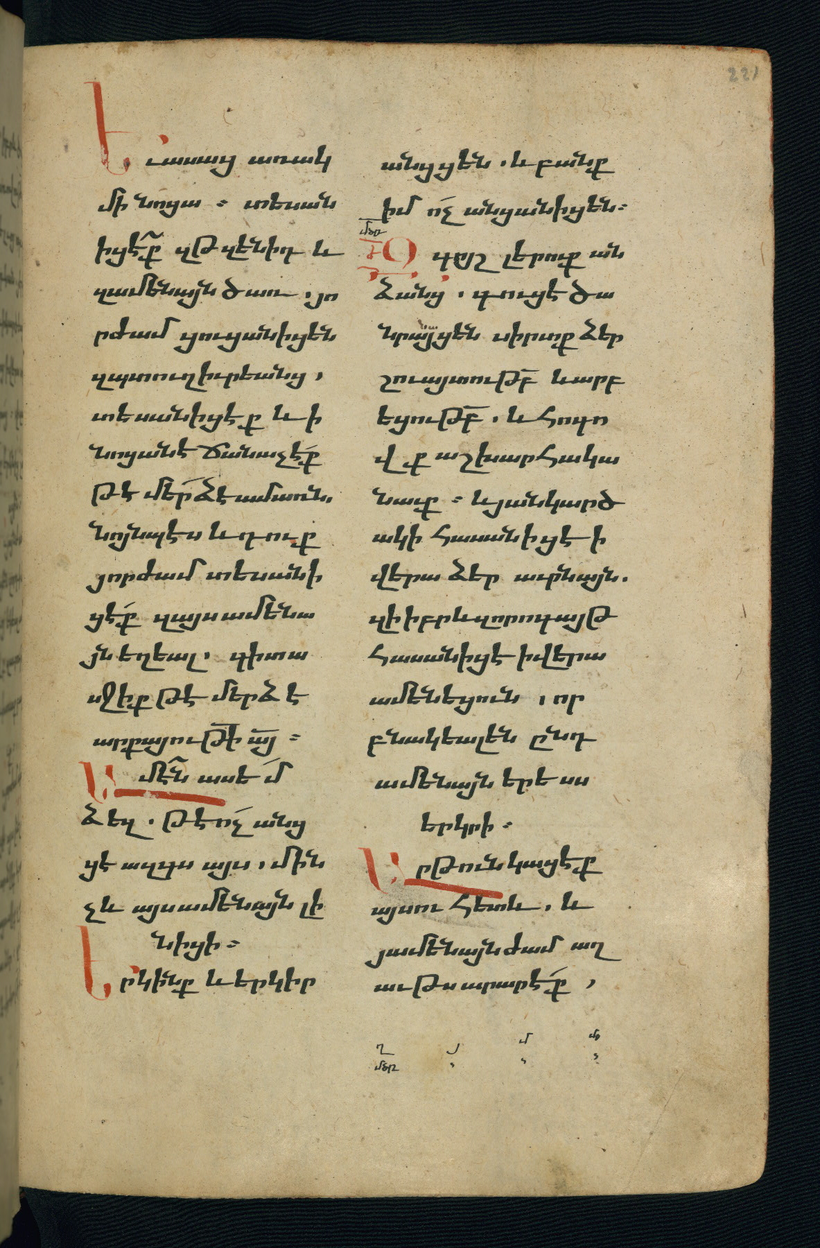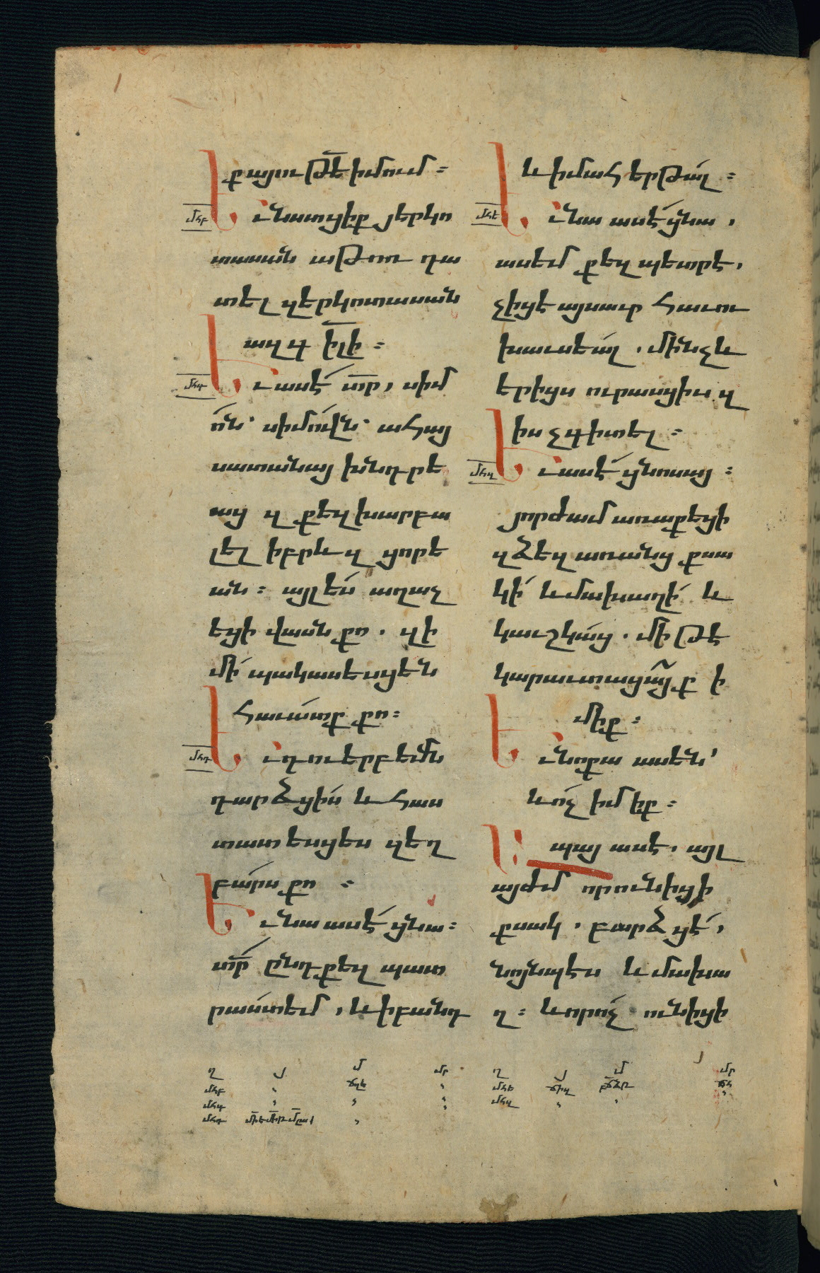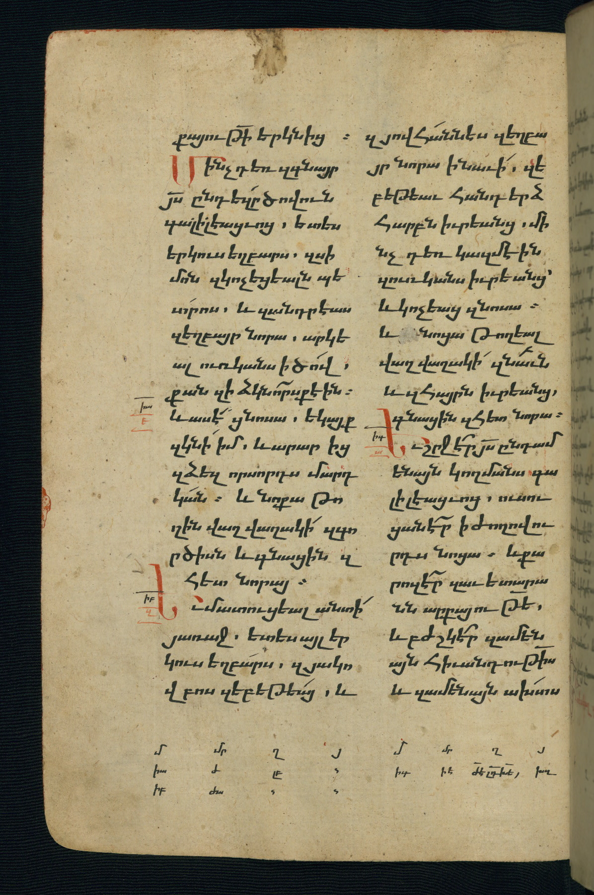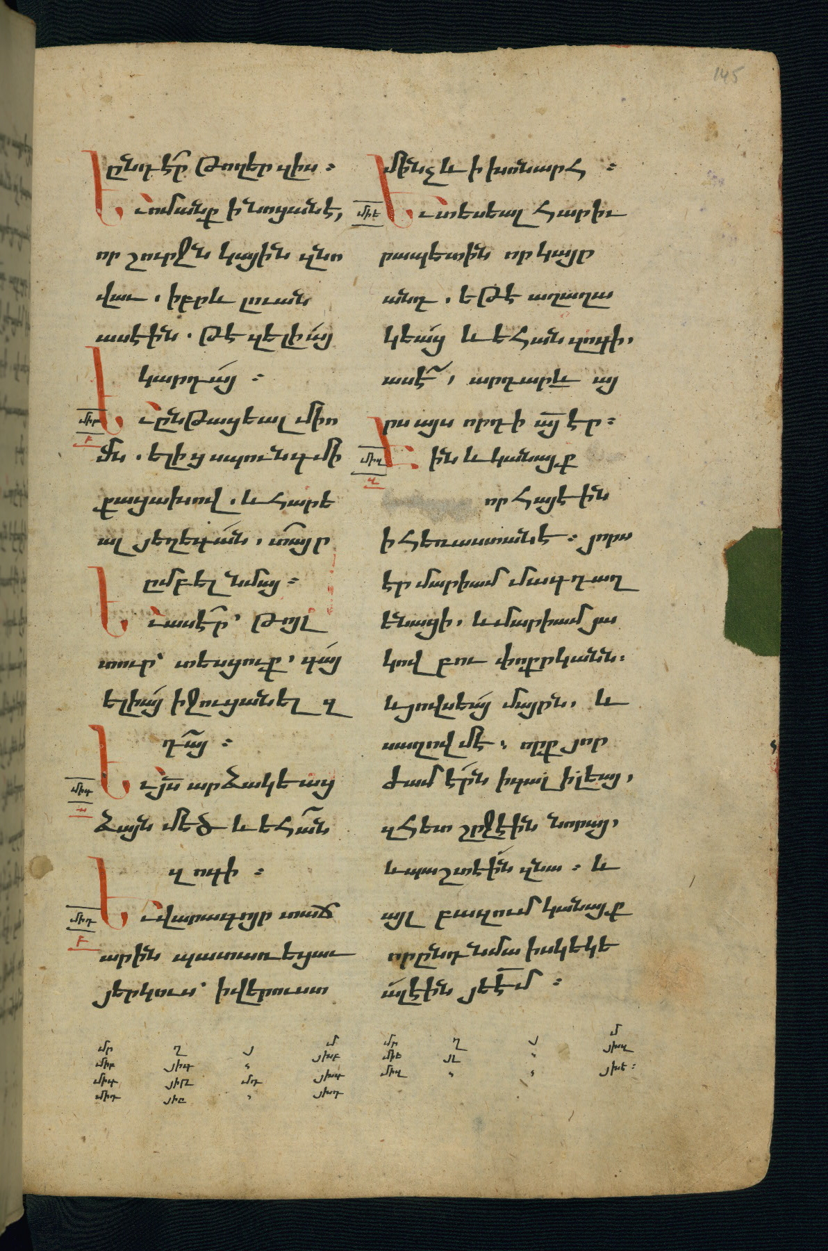 This Armenian Gospel book was produced in 904 of the Armenian era (1455 CE) at the monastery of Gamałiēl in Xizan by the scribe Yohannēs Vardapet, son of Vardan and Dilšat, and was illuminated by the priest Xačʿatur. The priest Pʿilipos commissioned the manuscript as a memorial to himself, his parents Łazar and Xutʿlumēlikʿ, and other relatives listed in the colophon on fols. 300r to 301v. Pʿilipos is depicted on fol. 14v alongside his brothers Yusēpʿ and Sultanša, as they kneel before the Virgin and Child enthroned (Theotokos). The book contains twenty-six full-page polychrome miniatures, including four Evangelist portraits; ornately designed canon tables; four decorated incipit pages; numerous marginal miniatures of floral and faunal motifs; and nineteen marginal miniatures of biblical characters or allusions to biblical narratives.