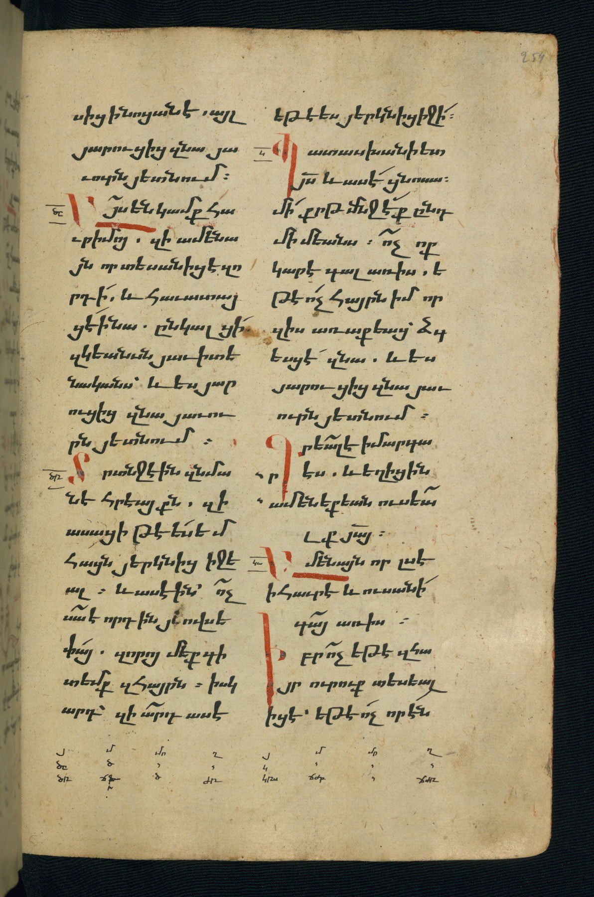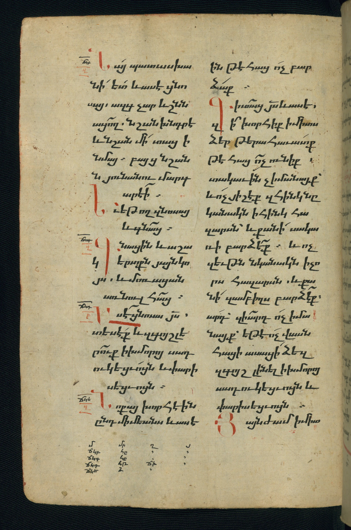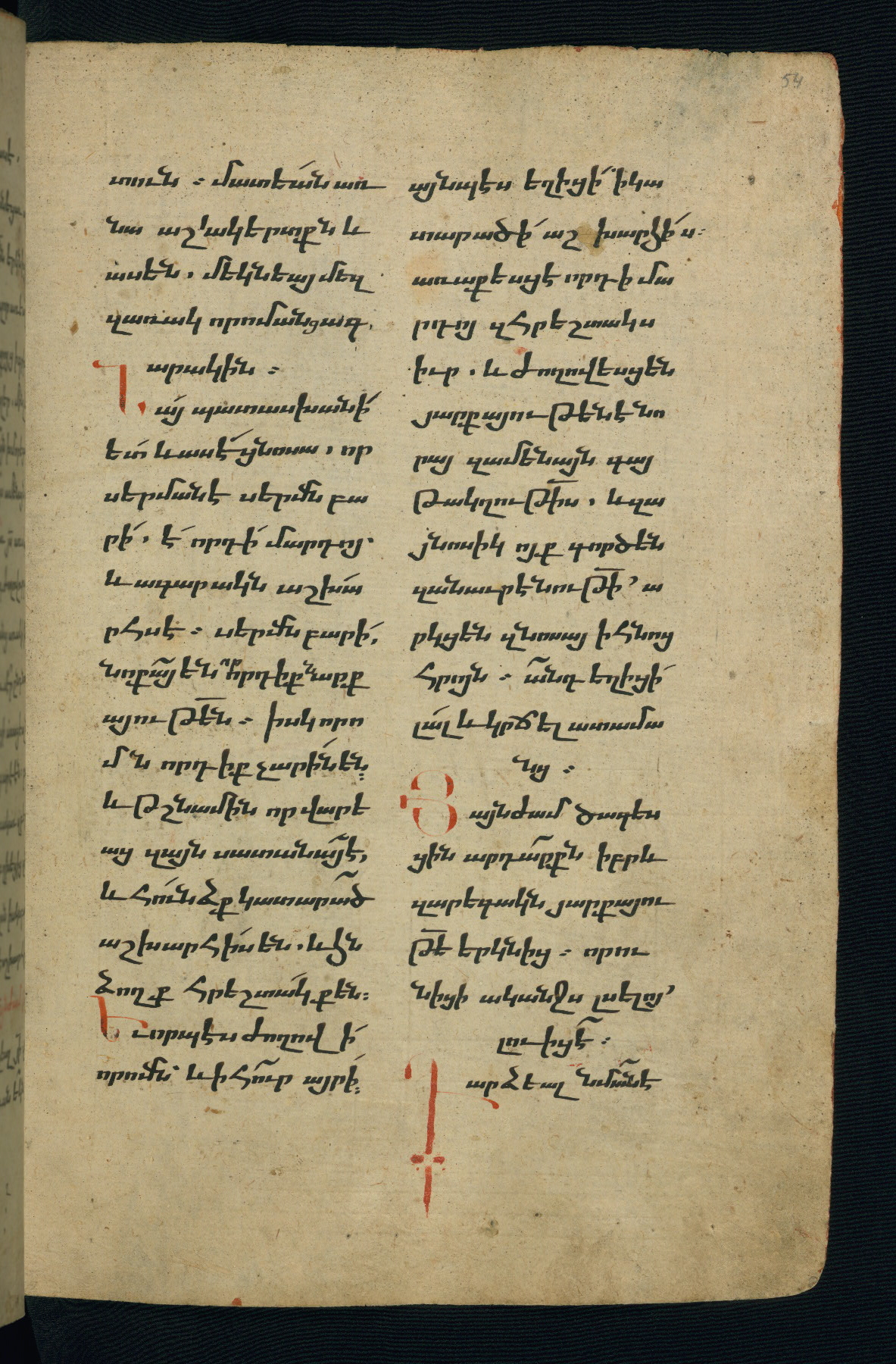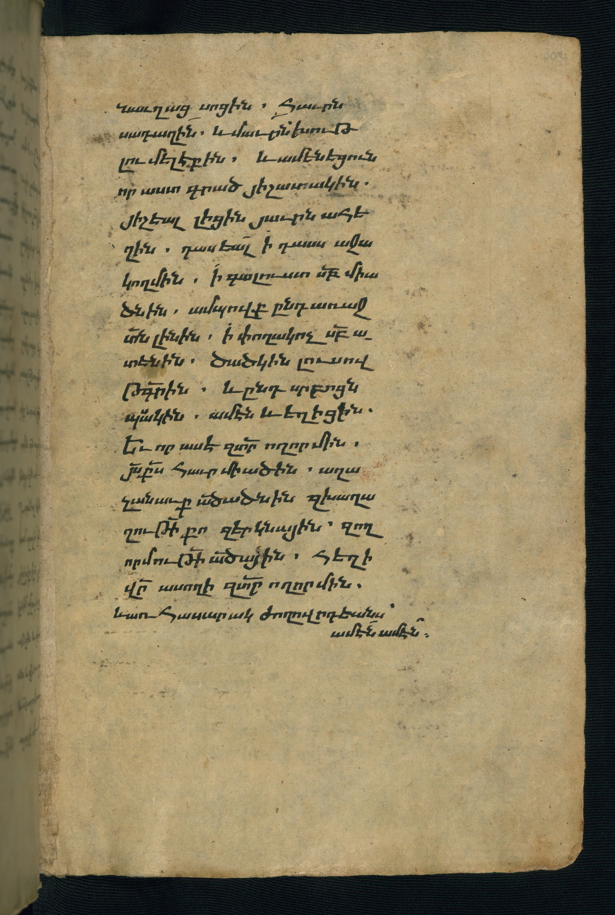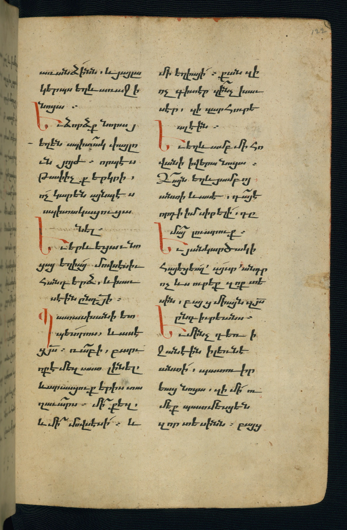 This Armenian Gospel book was produced in 904 of the Armenian era (1455 CE) at the monastery of Gamałiēl in Xizan by the scribe Yohannēs Vardapet, son of Vardan and Dilšat, and was illuminated by the priest Xačʿatur. The priest Pʿilipos commissioned the manuscript as a memorial to himself, his parents Łazar and Xutʿlumēlikʿ, and other relatives listed in the colophon on fols. 300r to 301v. Pʿilipos is depicted on fol. 14v alongside his brothers Yusēpʿ and Sultanša, as they kneel before the Virgin and Child enthroned (Theotokos). The book contains twenty-six full-page polychrome miniatures, including four Evangelist portraits; ornately designed canon tables; four decorated incipit pages; numerous marginal miniatures of floral and faunal motifs; and nineteen marginal miniatures of biblical characters or allusions to biblical narratives.