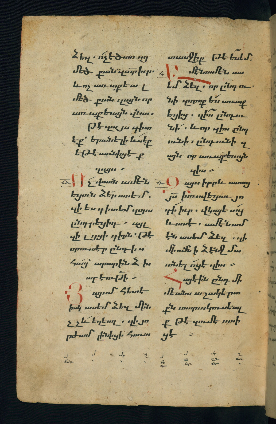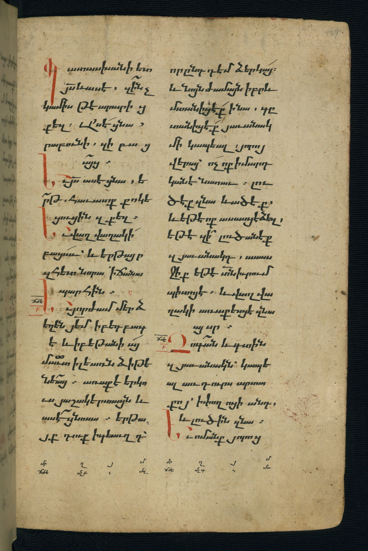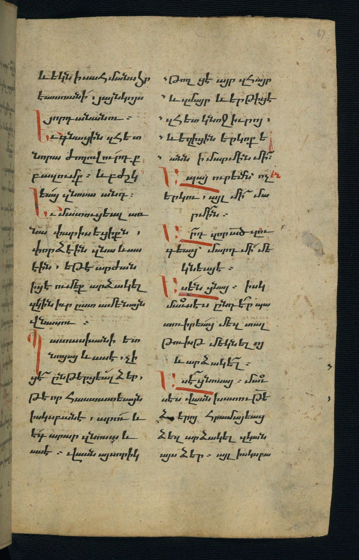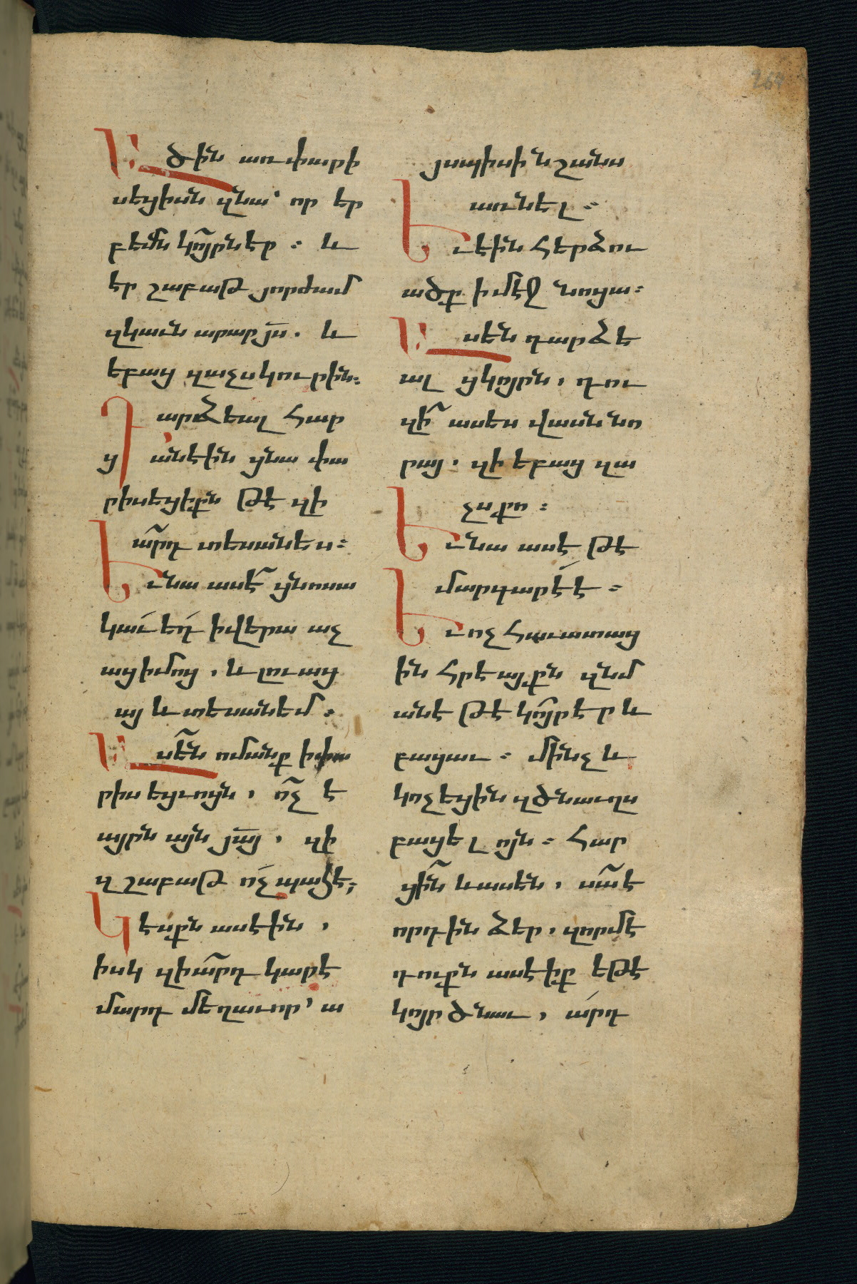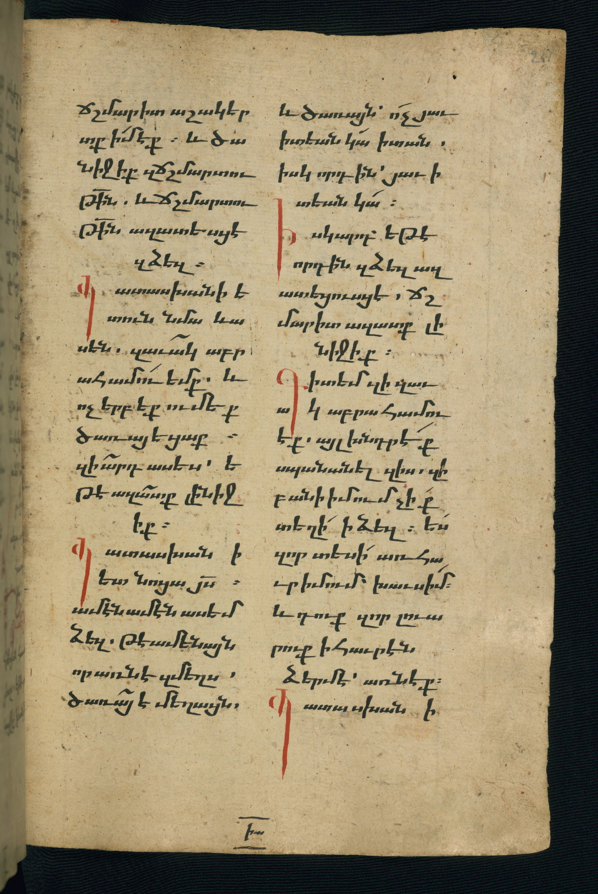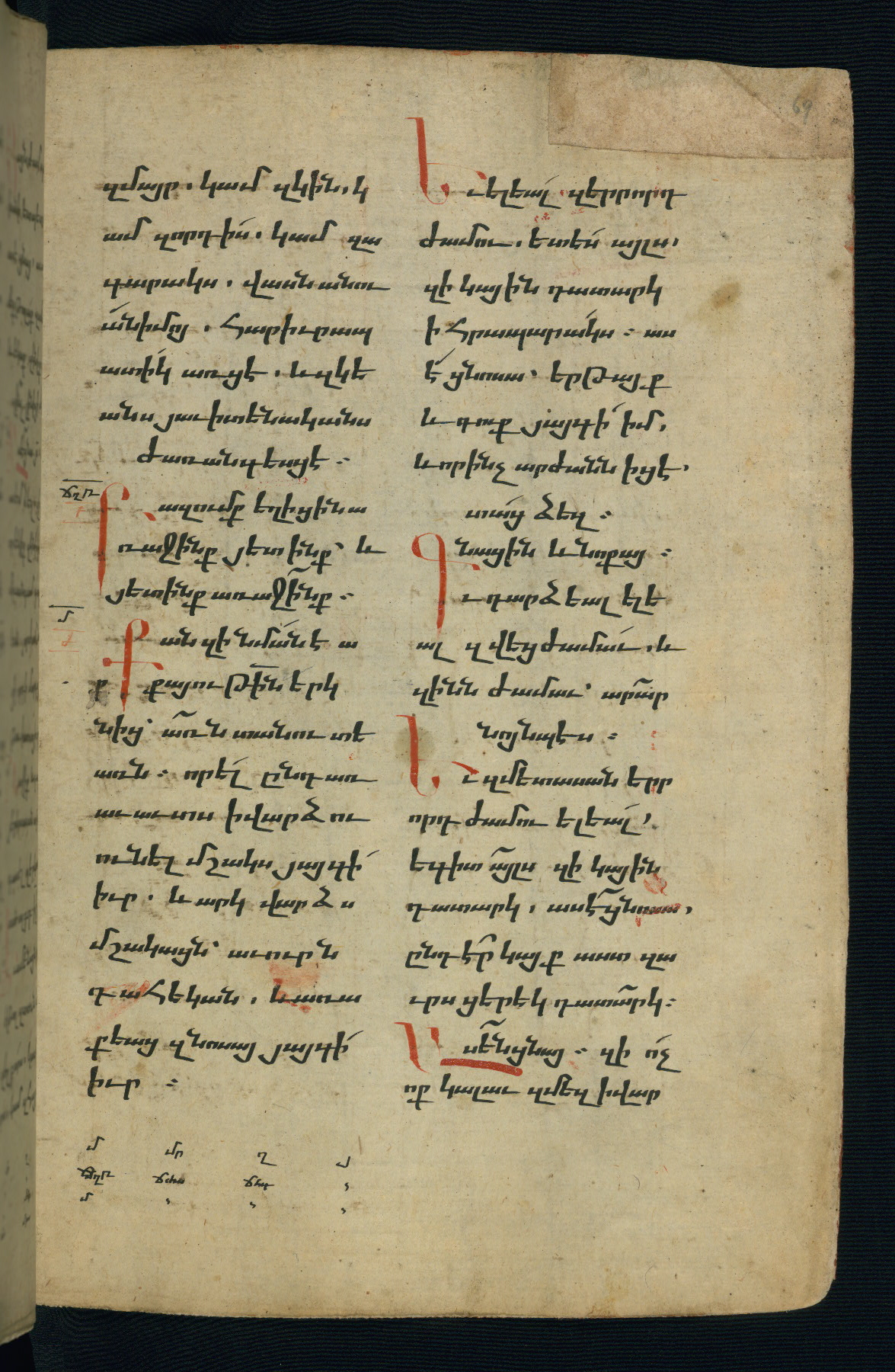This Armenian Gospel book was produced in 904 of the Armenian era (1455 CE) at the monastery of Gamałiēl in Xizan by the scribe Yohannēs Vardapet, son of Vardan and Dilšat, and was illuminated by the priest Xačʿatur. The priest Pʿilipos commissioned the manuscript as a memorial to himself, his parents Łazar and Xutʿlumēlikʿ, and other relatives listed in the colophon on fols. 300r to 301v. Pʿilipos is depicted on fol. 14v alongside his brothers Yusēpʿ and Sultanša, as they kneel before the Virgin and Child enthroned (Theotokos). The book contains twenty-six full-page polychrome miniatures, including four Evangelist portraits; ornately designed canon tables; four decorated incipit pages; numerous marginal miniatures of floral and faunal motifs; and nineteen marginal miniatures of biblical characters or allusions to biblical narratives.
