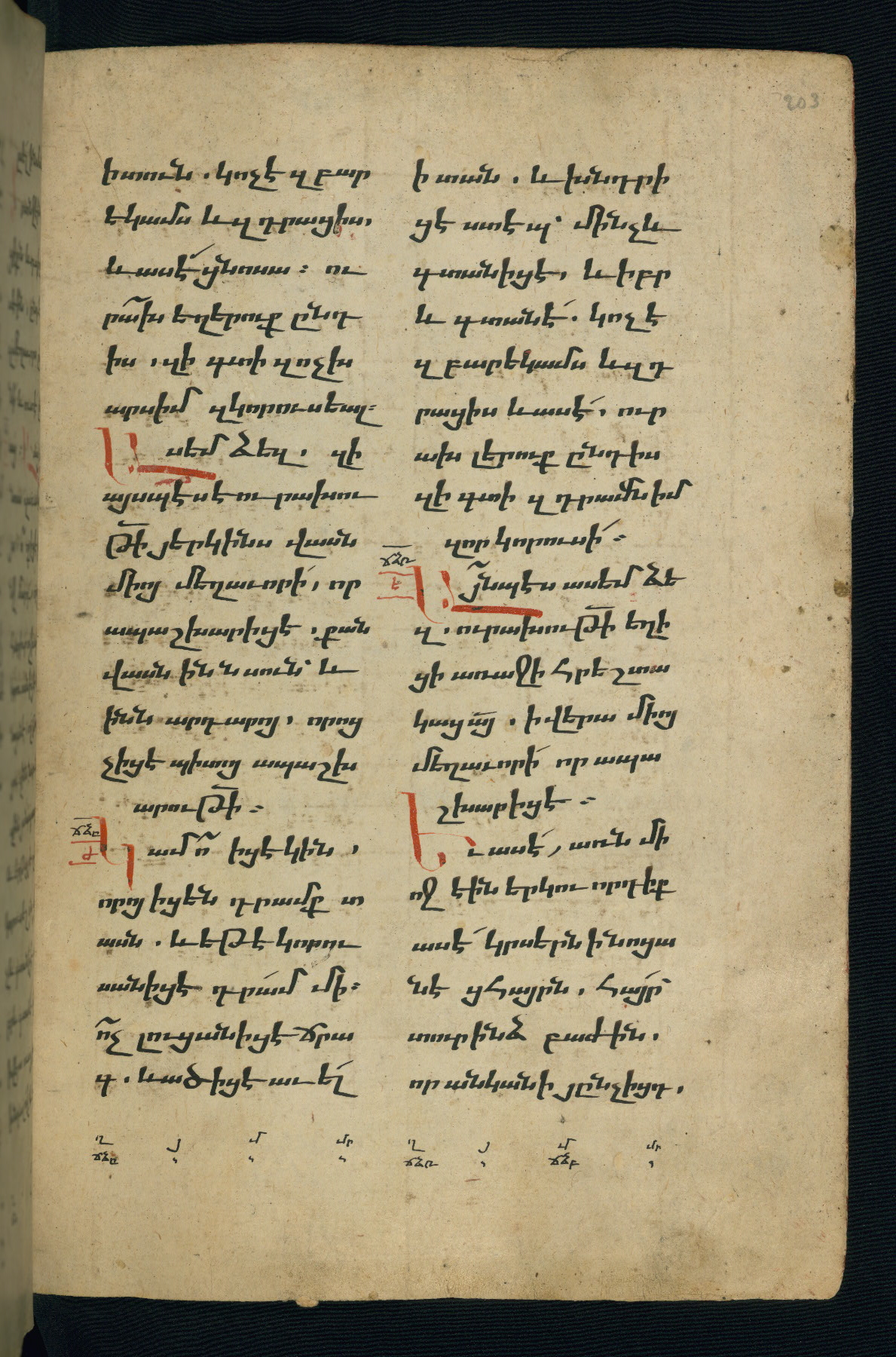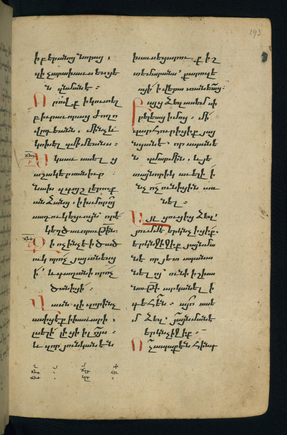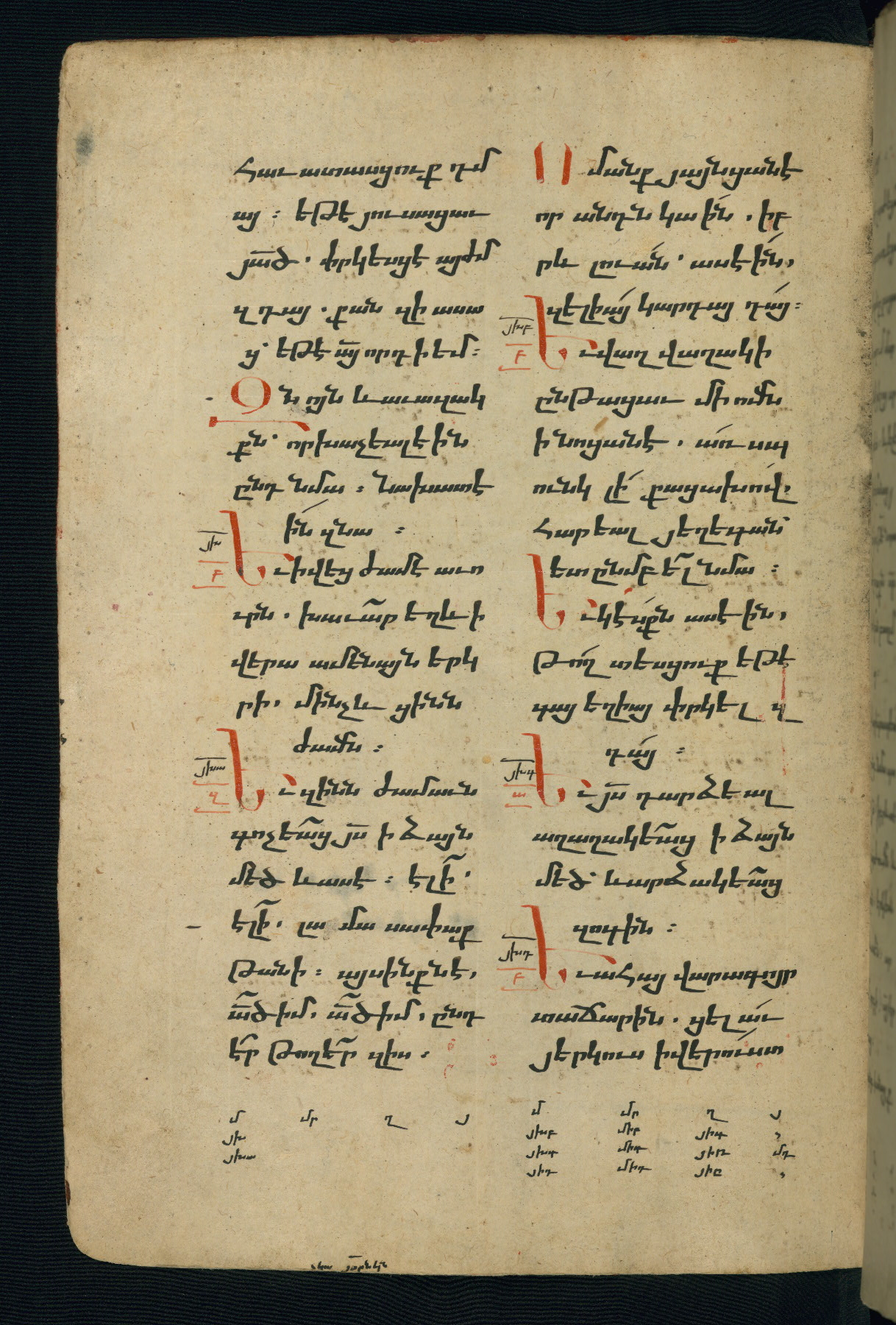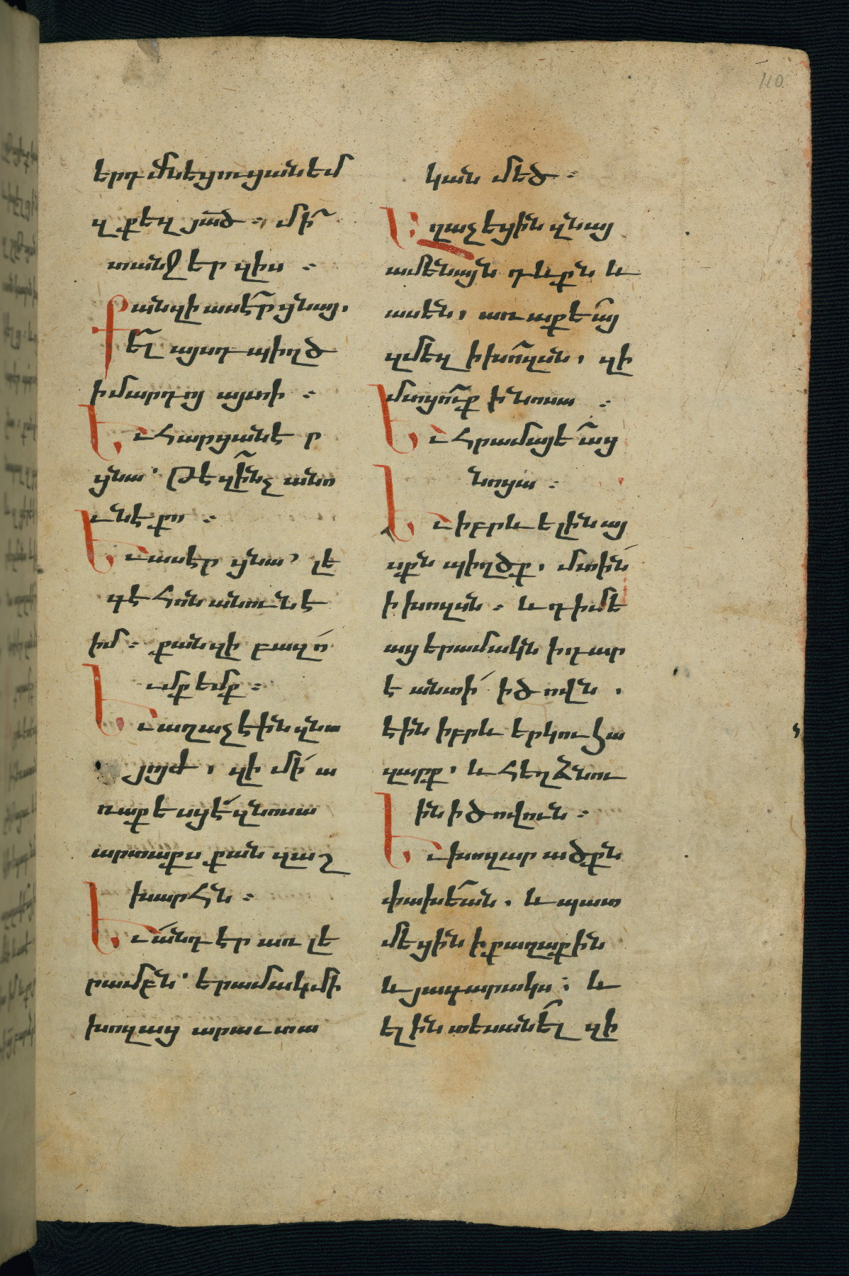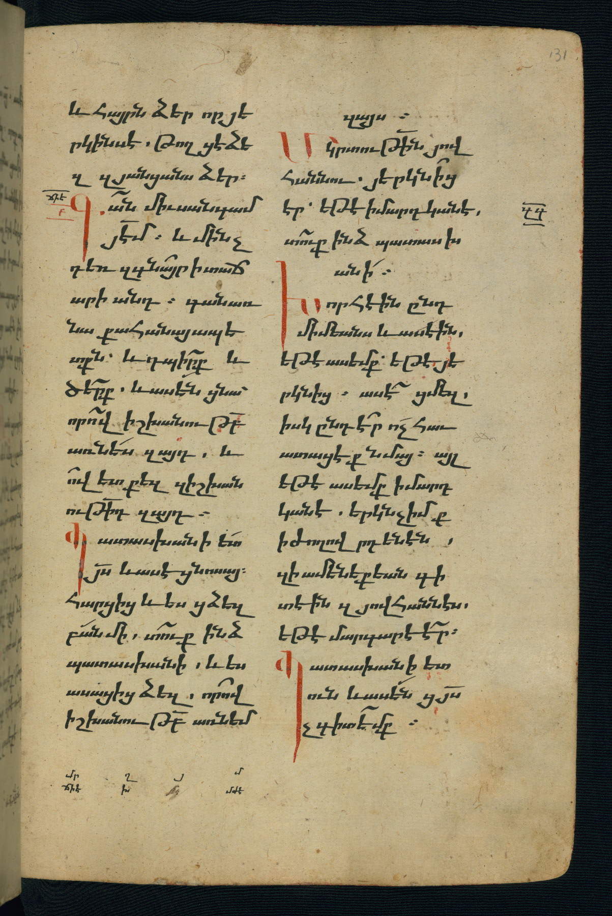 This Armenian Gospel book was produced in 904 of the Armenian era (1455 CE) at the monastery of Gamałiēl in Xizan by the scribe Yohannēs Vardapet, son of Vardan and Dilšat, and was illuminated by the priest Xačʿatur. The priest Pʿilipos commissioned the manuscript as a memorial to himself, his parents Łazar and Xutʿlumēlikʿ, and other relatives listed in the colophon on fols. 300r to 301v. Pʿilipos is depicted on fol. 14v alongside his brothers Yusēpʿ and Sultanša, as they kneel before the Virgin and Child enthroned (Theotokos). The book contains twenty-six full-page polychrome miniatures, including four Evangelist portraits; ornately designed canon tables; four decorated incipit pages; numerous marginal miniatures of floral and faunal motifs; and nineteen marginal miniatures of biblical characters or allusions to biblical narratives.