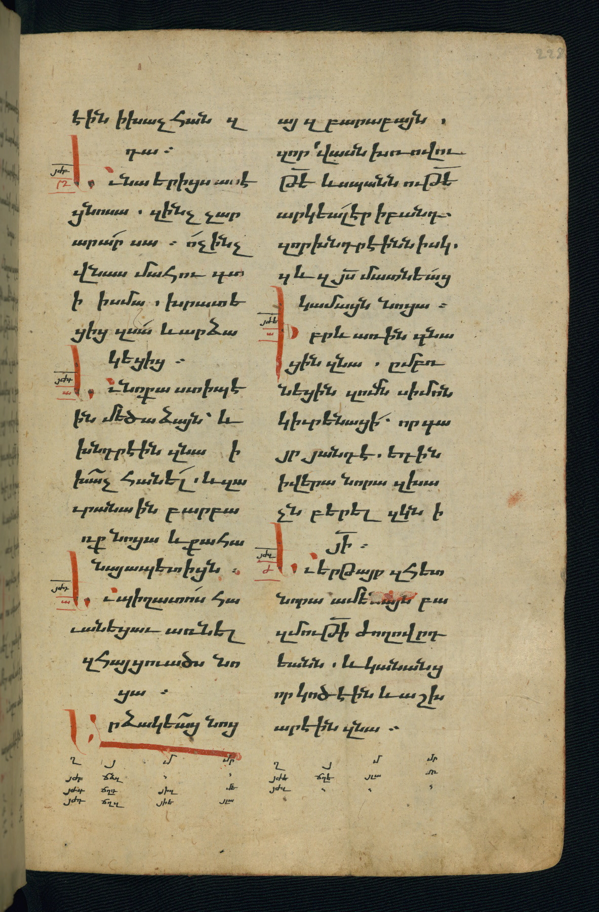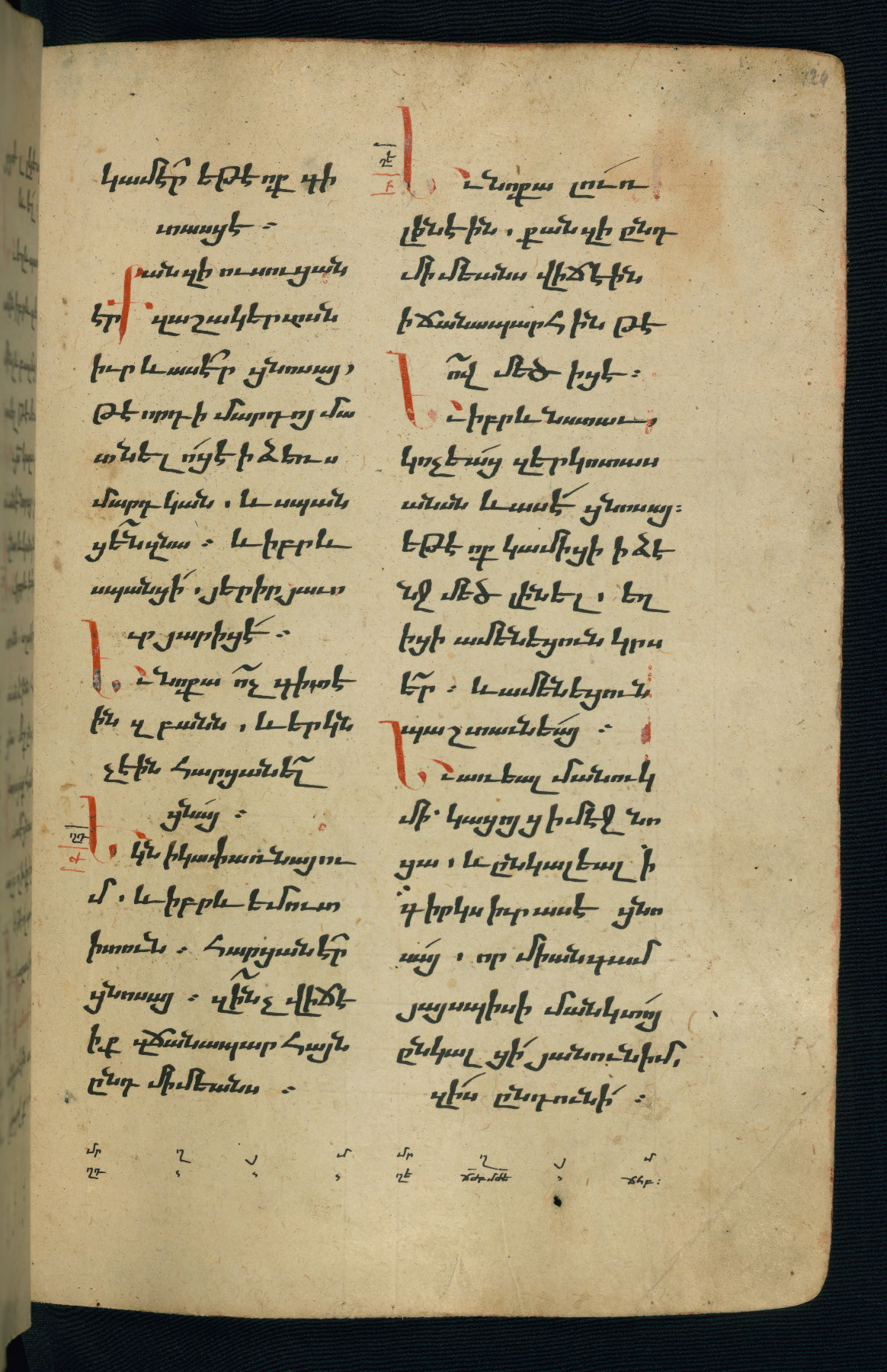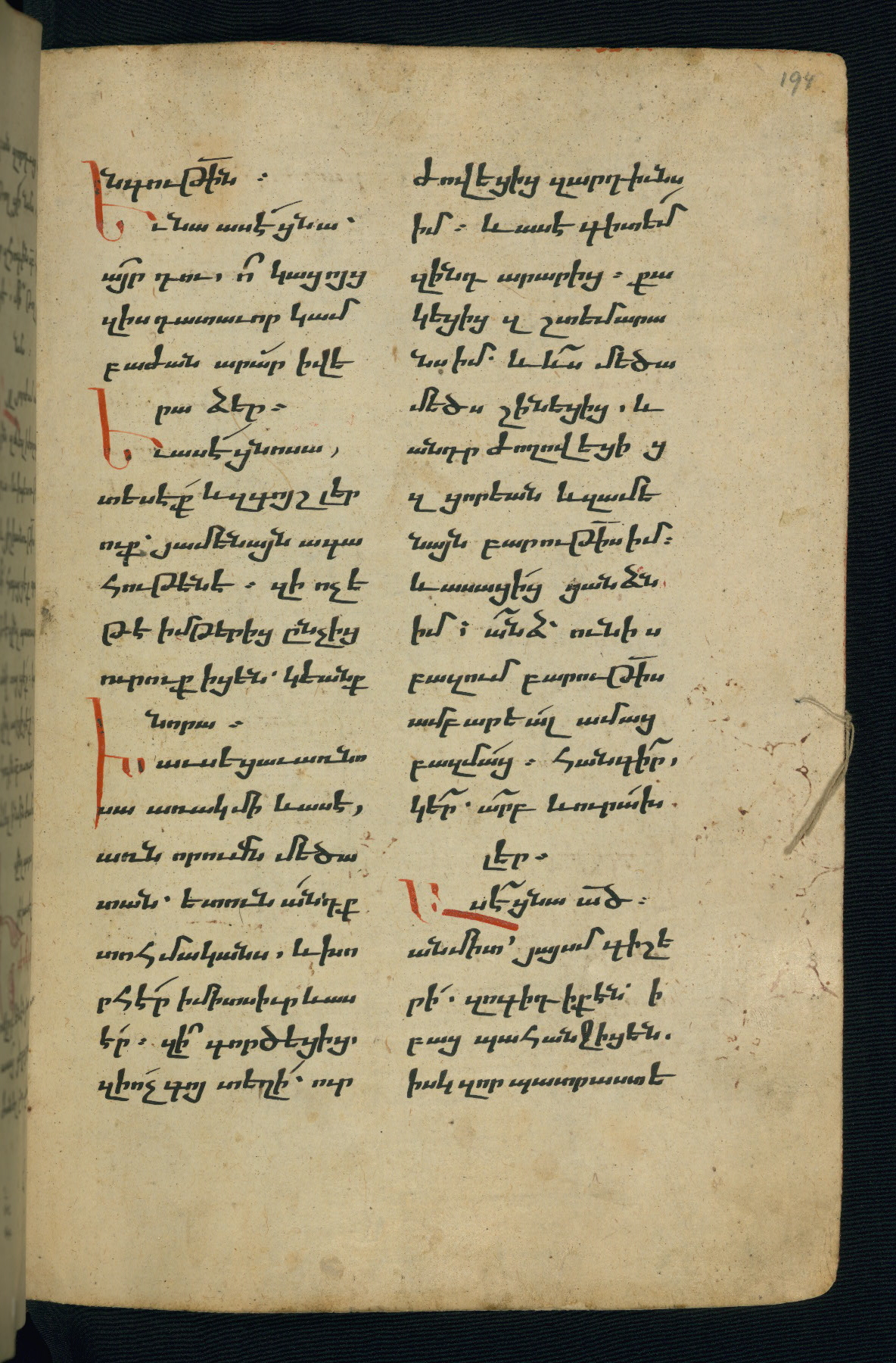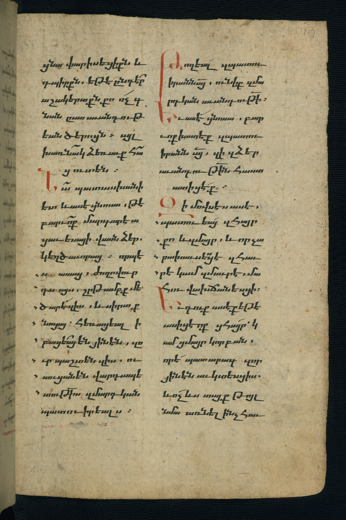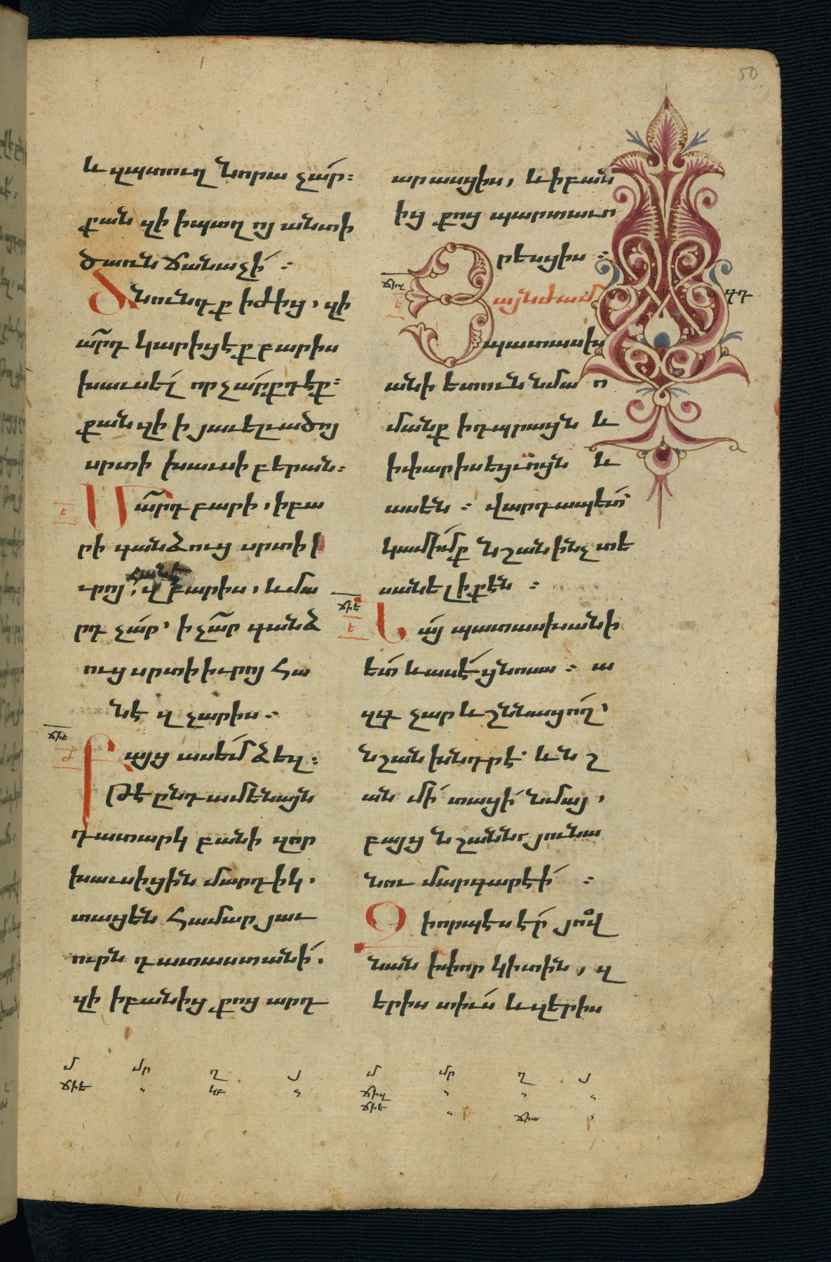 This Armenian Gospel book was produced in 904 of the Armenian era (1455 CE) at the monastery of Gamałiēl in Xizan by the scribe Yohannēs Vardapet, son of Vardan and Dilšat, and was illuminated by the priest Xačʿatur. The priest Pʿilipos commissioned the manuscript as a memorial to himself, his parents Łazar and Xutʿlumēlikʿ, and other relatives listed in the colophon on fols. 300r to 301v. Pʿilipos is depicted on fol. 14v alongside his brothers Yusēpʿ and Sultanša, as they kneel before the Virgin and Child enthroned (Theotokos). The book contains twenty-six full-page polychrome miniatures, including four Evangelist portraits; ornately designed canon tables; four decorated incipit pages; numerous marginal miniatures of floral and faunal motifs; and nineteen marginal miniatures of biblical characters or allusions to biblical narratives.