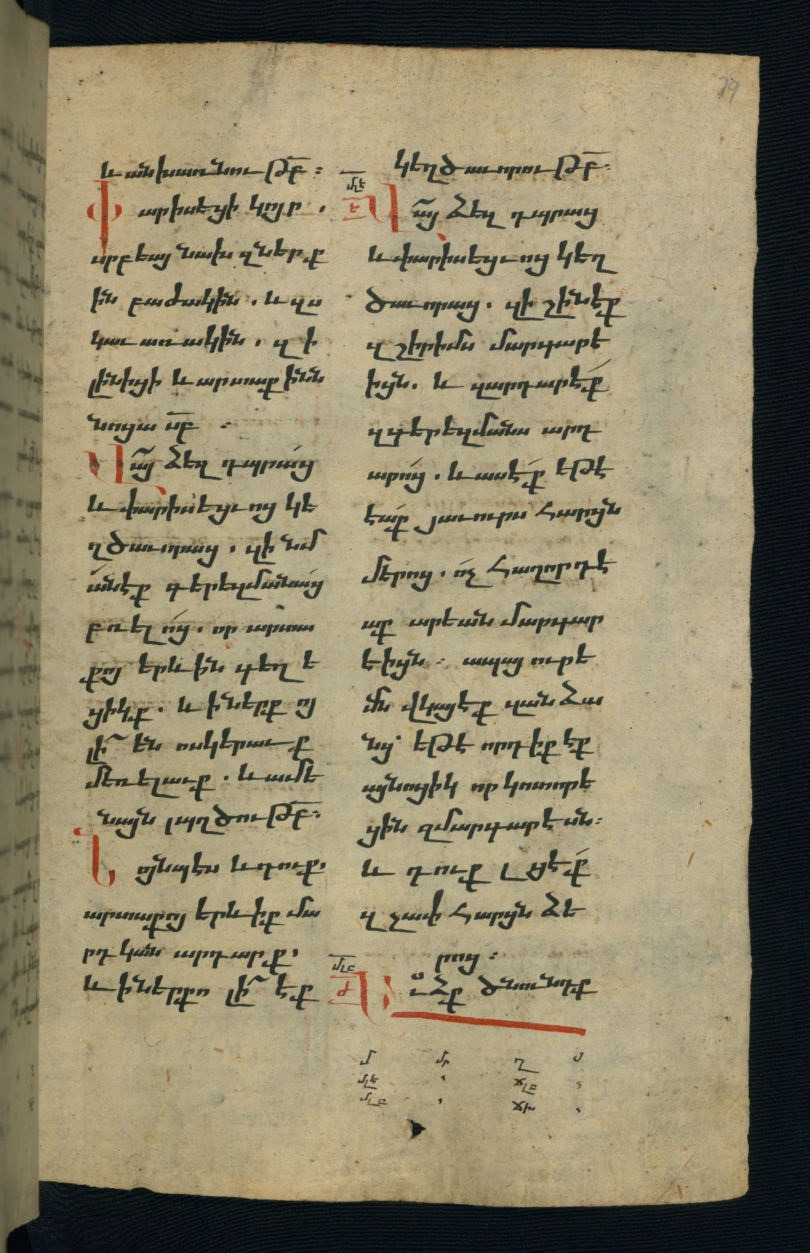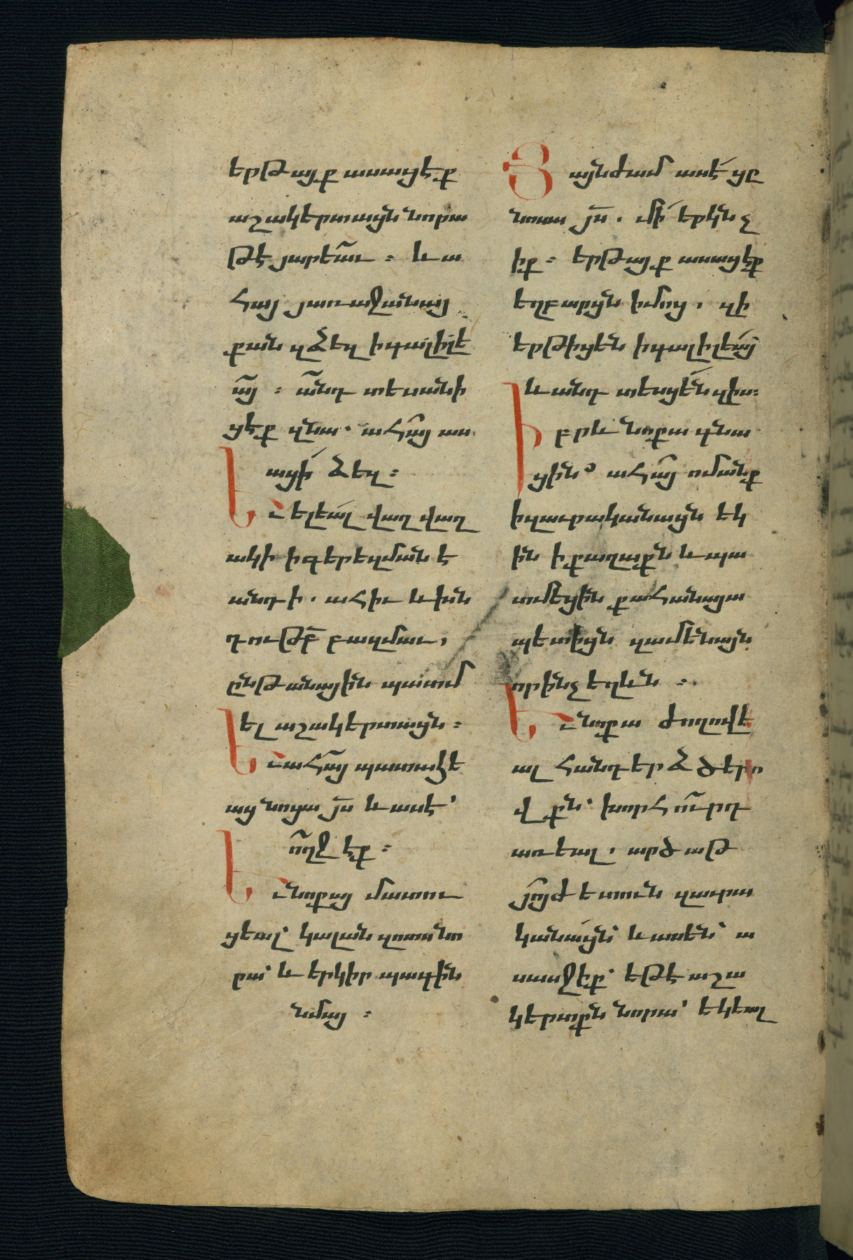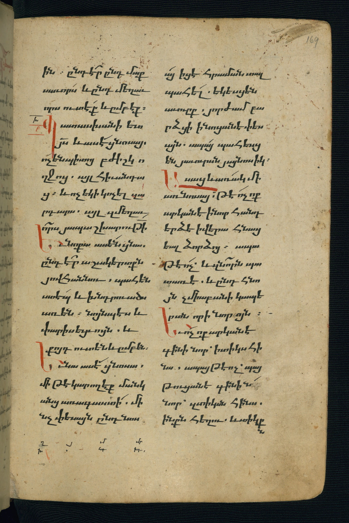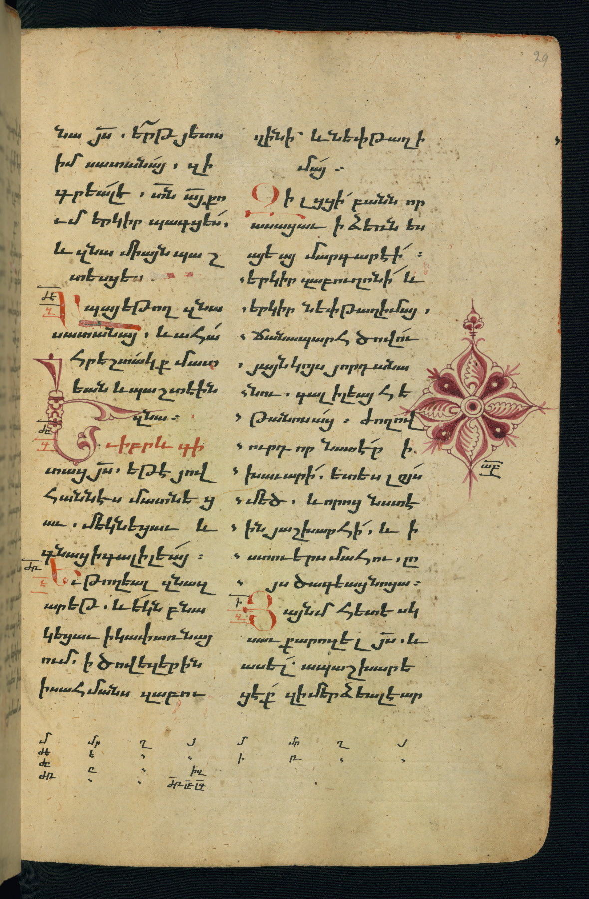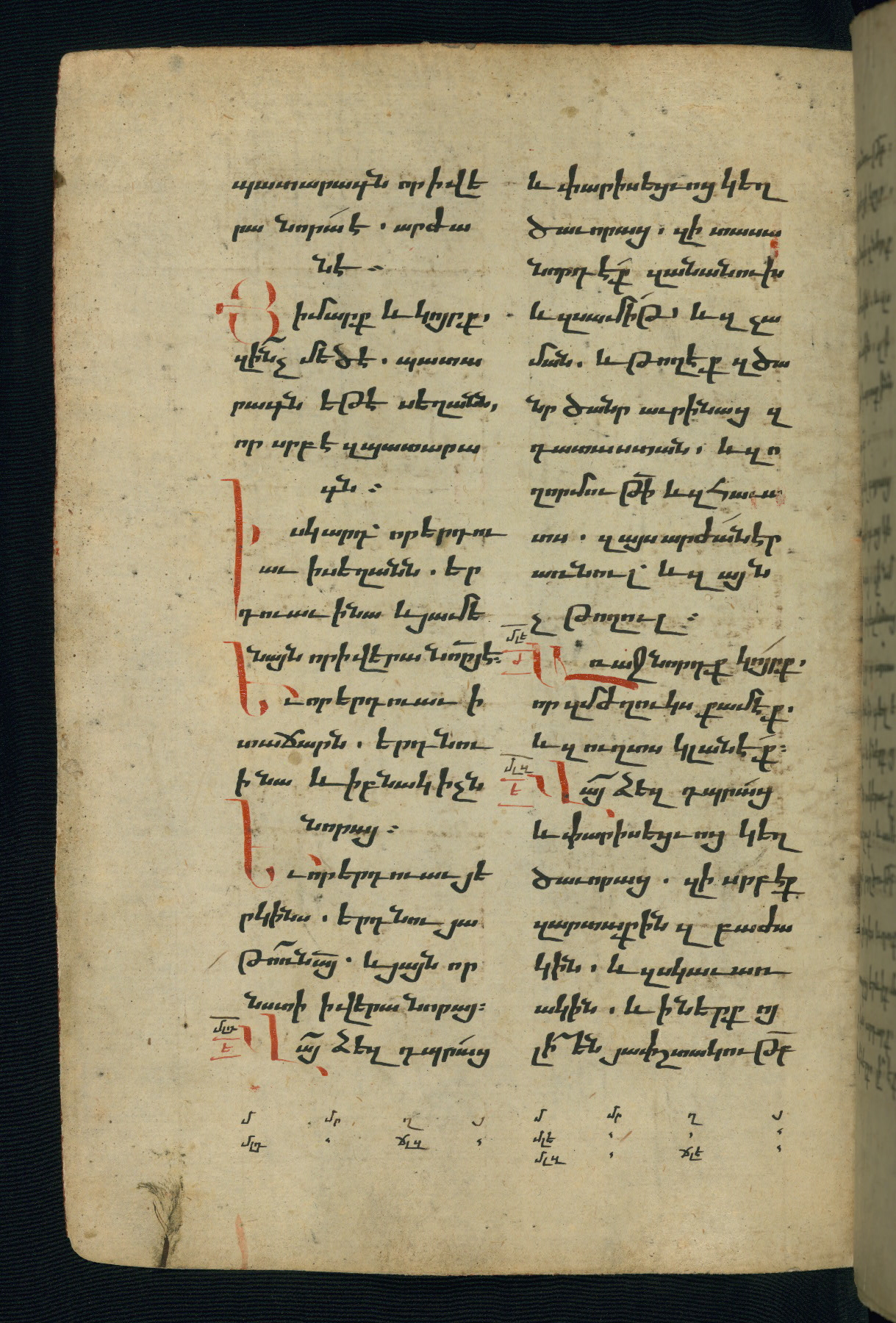 This Armenian Gospel book was produced in 904 of the Armenian era (1455 CE) at the monastery of Gamałiēl in Xizan by the scribe Yohannēs Vardapet, son of Vardan and Dilšat, and was illuminated by the priest Xačʿatur. The priest Pʿilipos commissioned the manuscript as a memorial to himself, his parents Łazar and Xutʿlumēlikʿ, and other relatives listed in the colophon on fols. 300r to 301v. Pʿilipos is depicted on fol. 14v alongside his brothers Yusēpʿ and Sultanša, as they kneel before the Virgin and Child enthroned (Theotokos). The book contains twenty-six full-page polychrome miniatures, including four Evangelist portraits; ornately designed canon tables; four decorated incipit pages; numerous marginal miniatures of floral and faunal motifs; and nineteen marginal miniatures of biblical characters or allusions to biblical narratives.