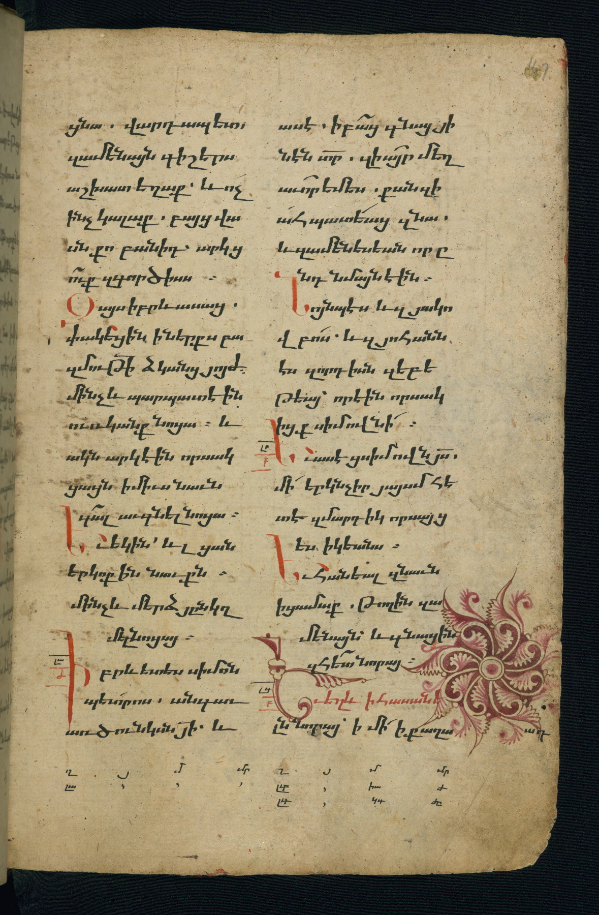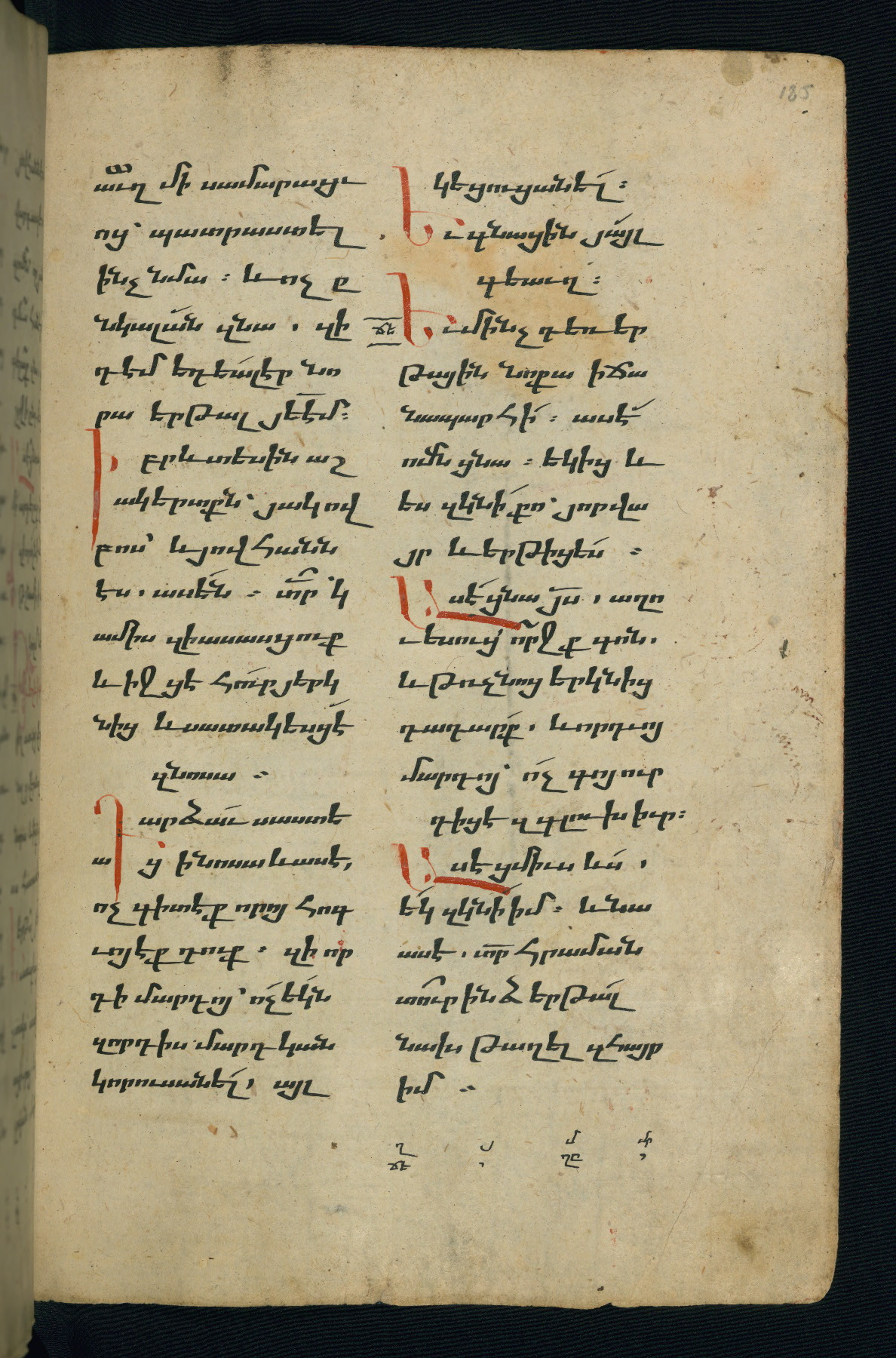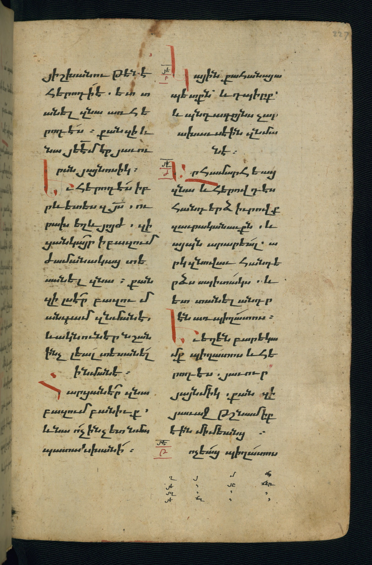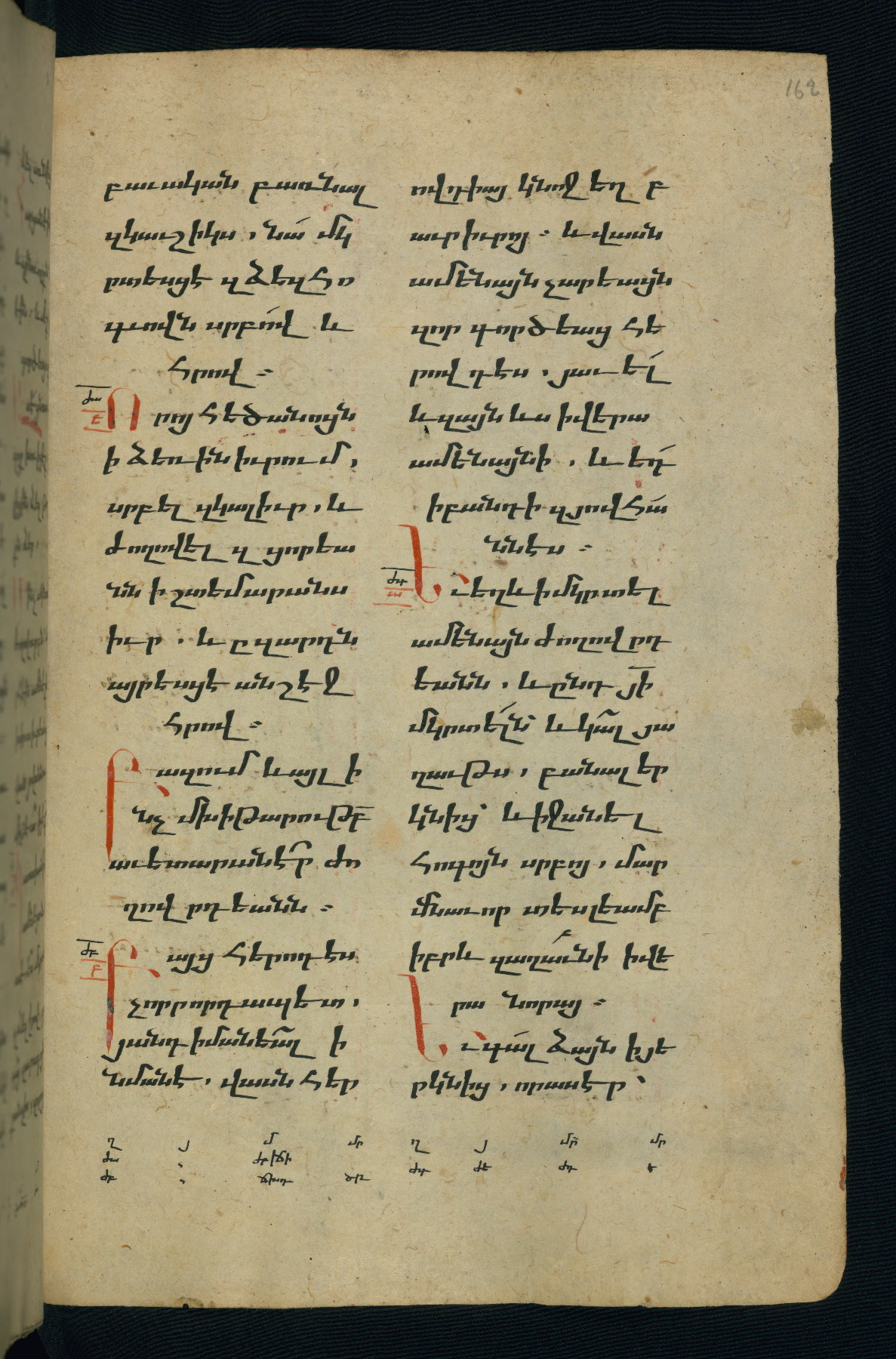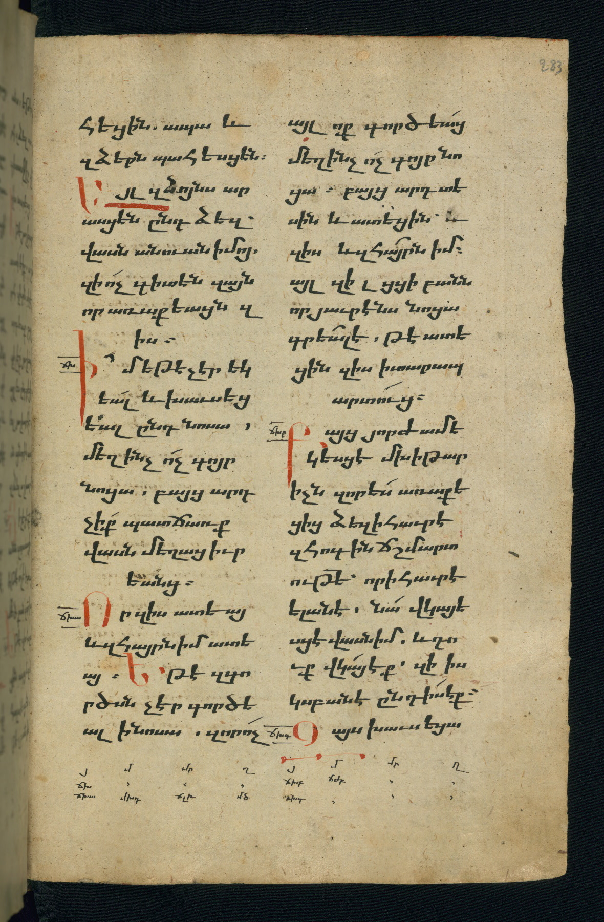 This Armenian Gospel book was produced in 904 of the Armenian era (1455 CE) at the monastery of Gamałiēl in Xizan by the scribe Yohannēs Vardapet, son of Vardan and Dilšat, and was illuminated by the priest Xačʿatur. The priest Pʿilipos commissioned the manuscript as a memorial to himself, his parents Łazar and Xutʿlumēlikʿ, and other relatives listed in the colophon on fols. 300r to 301v. Pʿilipos is depicted on fol. 14v alongside his brothers Yusēpʿ and Sultanša, as they kneel before the Virgin and Child enthroned (Theotokos). The book contains twenty-six full-page polychrome miniatures, including four Evangelist portraits; ornately designed canon tables; four decorated incipit pages; numerous marginal miniatures of floral and faunal motifs; and nineteen marginal miniatures of biblical characters or allusions to biblical narratives.