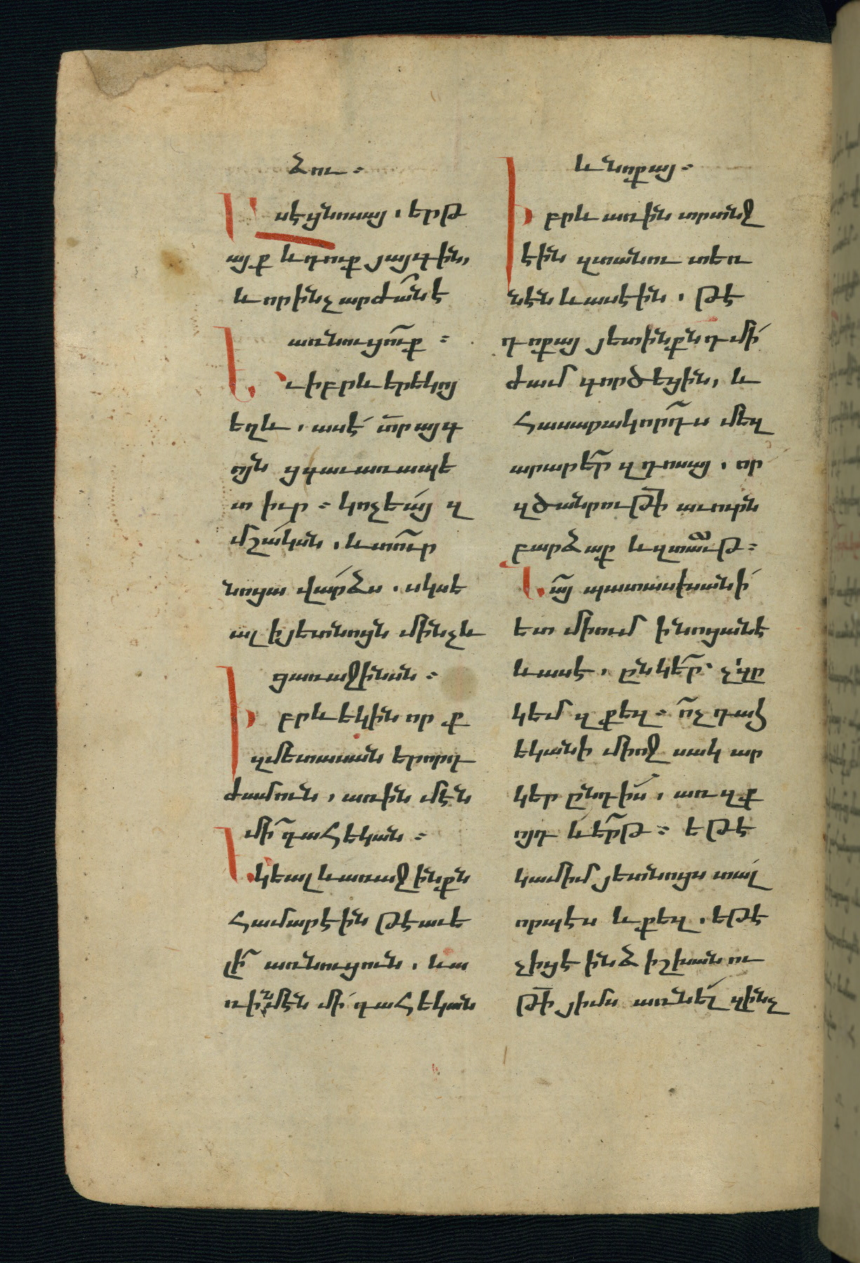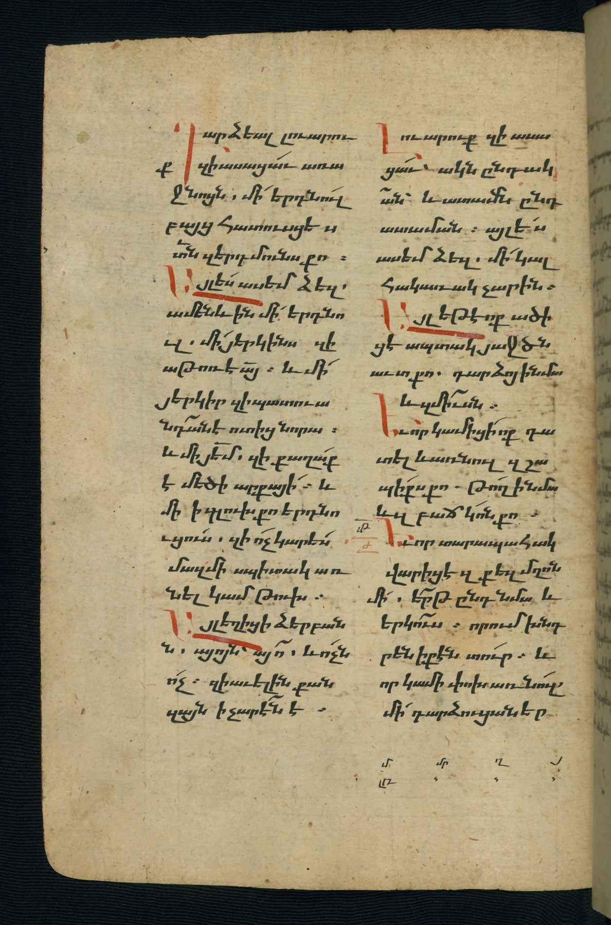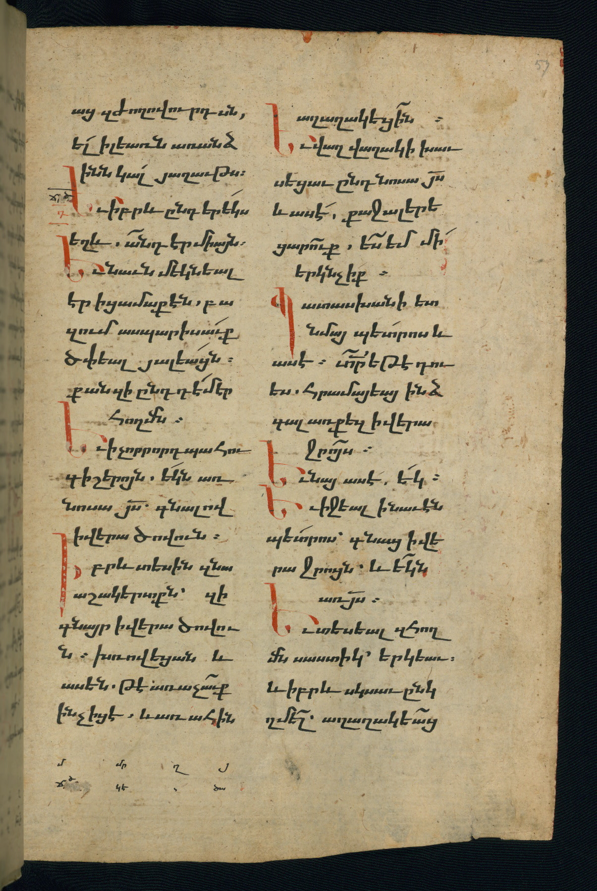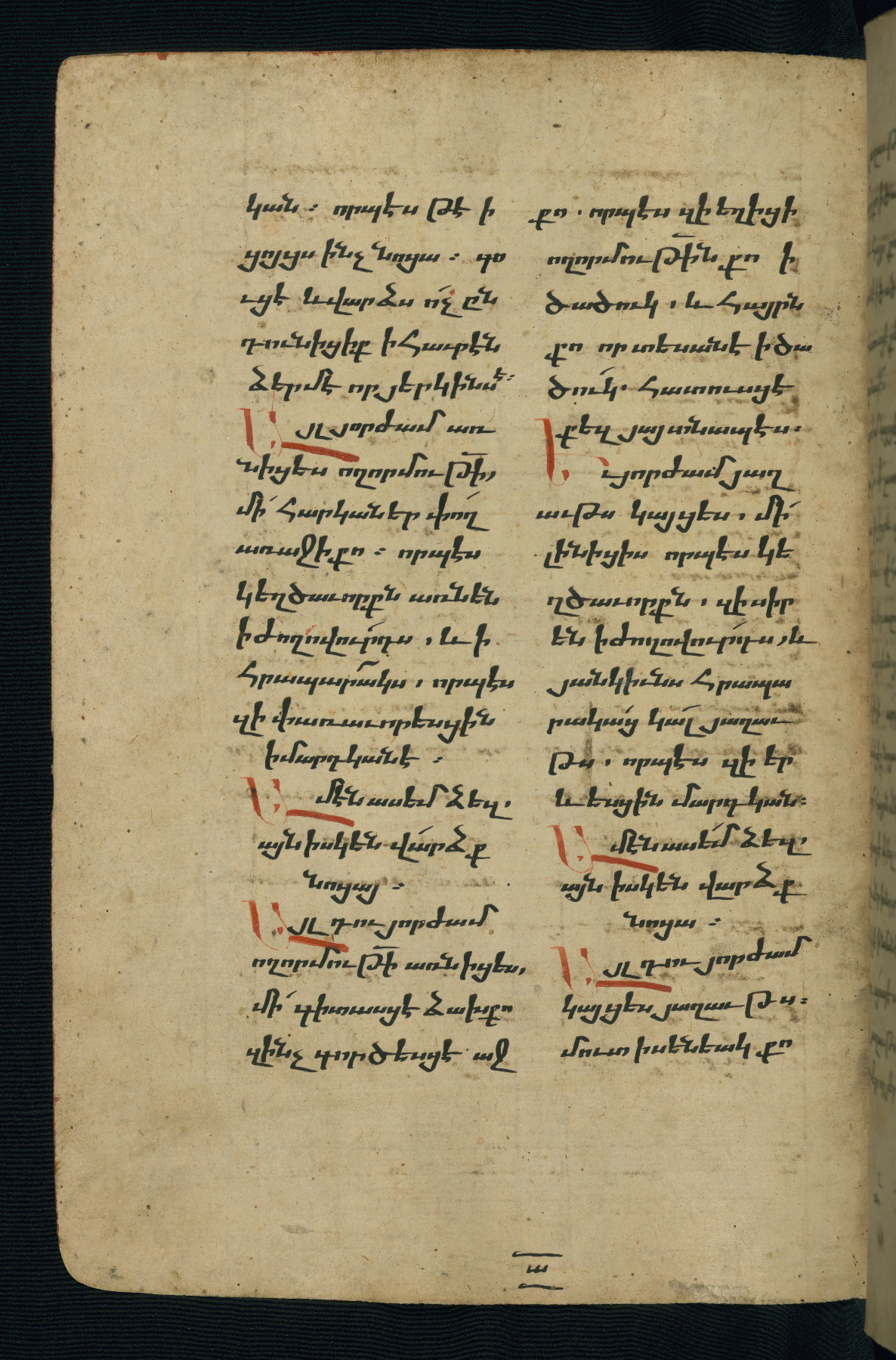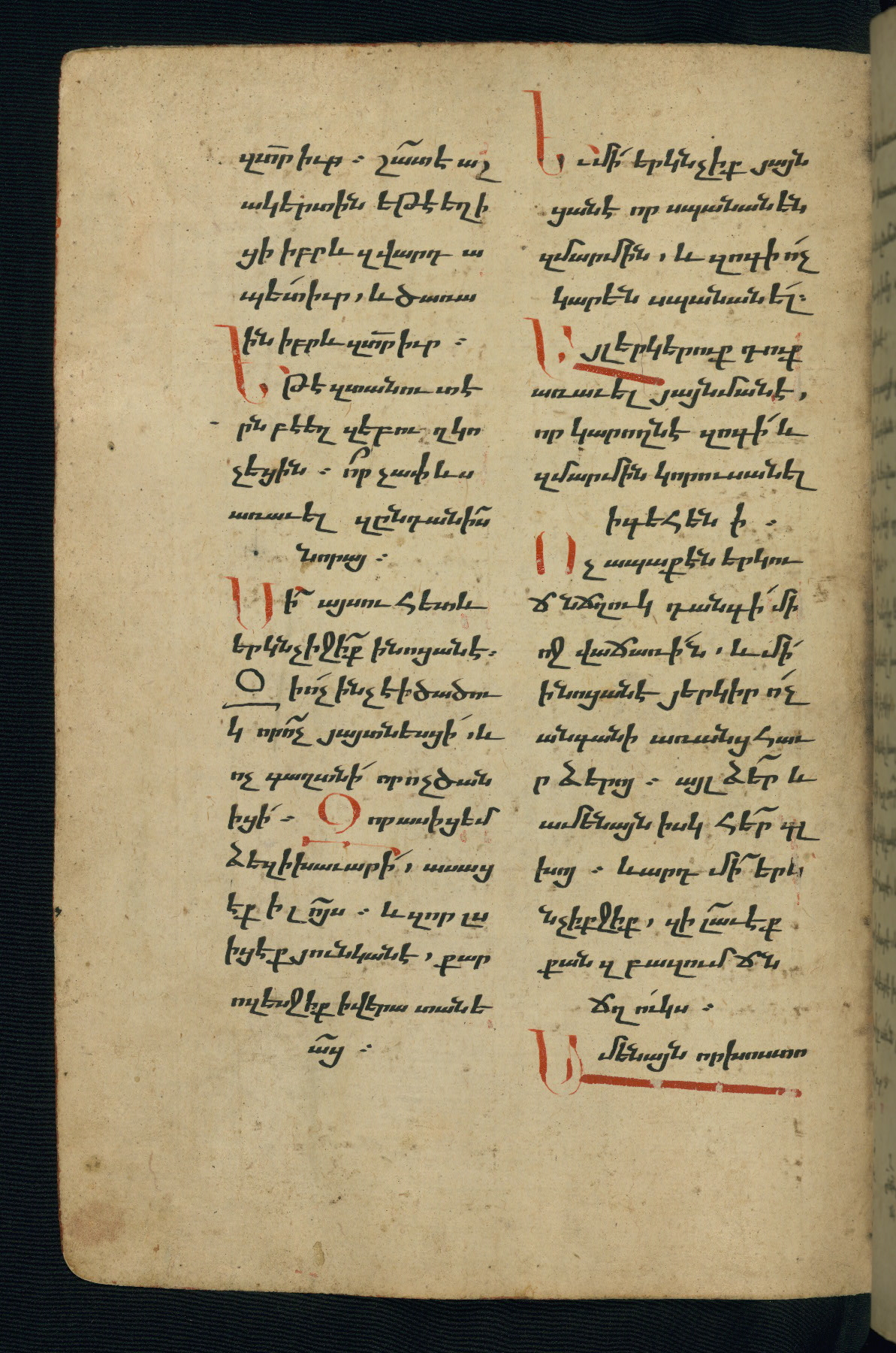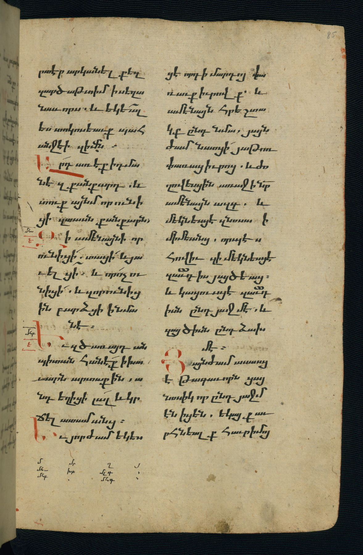 This Armenian Gospel book was produced in 904 of the Armenian era (1455 CE) at the monastery of Gamałiēl in Xizan by the scribe Yohannēs Vardapet, son of Vardan and Dilšat, and was illuminated by the priest Xačʿatur. The priest Pʿilipos commissioned the manuscript as a memorial to himself, his parents Łazar and Xutʿlumēlikʿ, and other relatives listed in the colophon on fols. 300r to 301v. Pʿilipos is depicted on fol. 14v alongside his brothers Yusēpʿ and Sultanša, as they kneel before the Virgin and Child enthroned (Theotokos). The book contains twenty-six full-page polychrome miniatures, including four Evangelist portraits; ornately designed canon tables; four decorated incipit pages; numerous marginal miniatures of floral and faunal motifs; and nineteen marginal miniatures of biblical characters or allusions to biblical narratives.