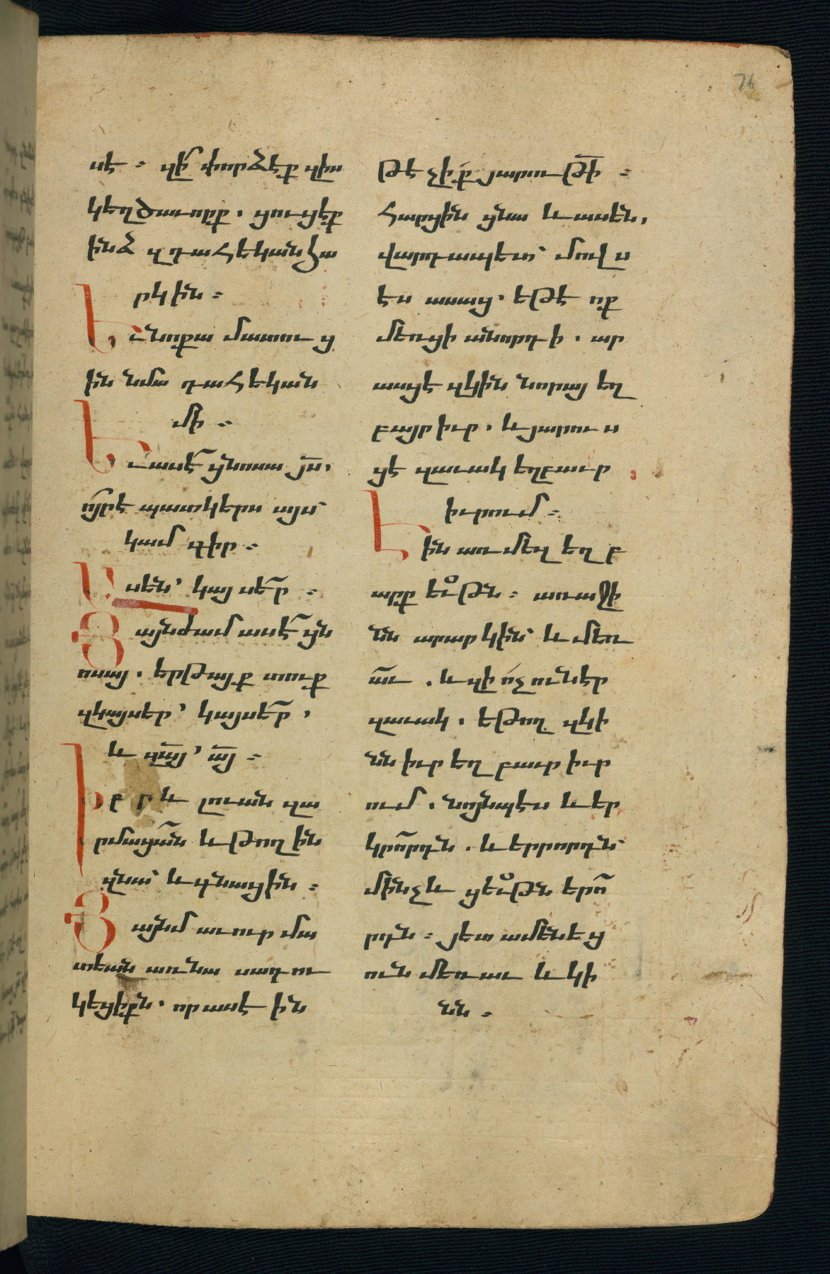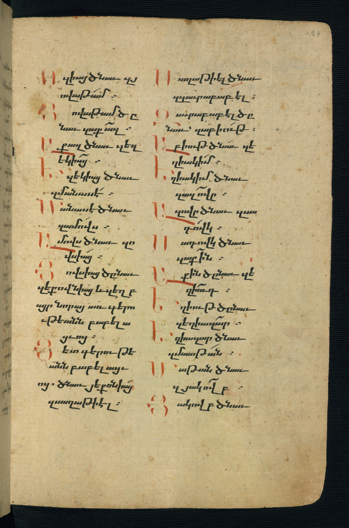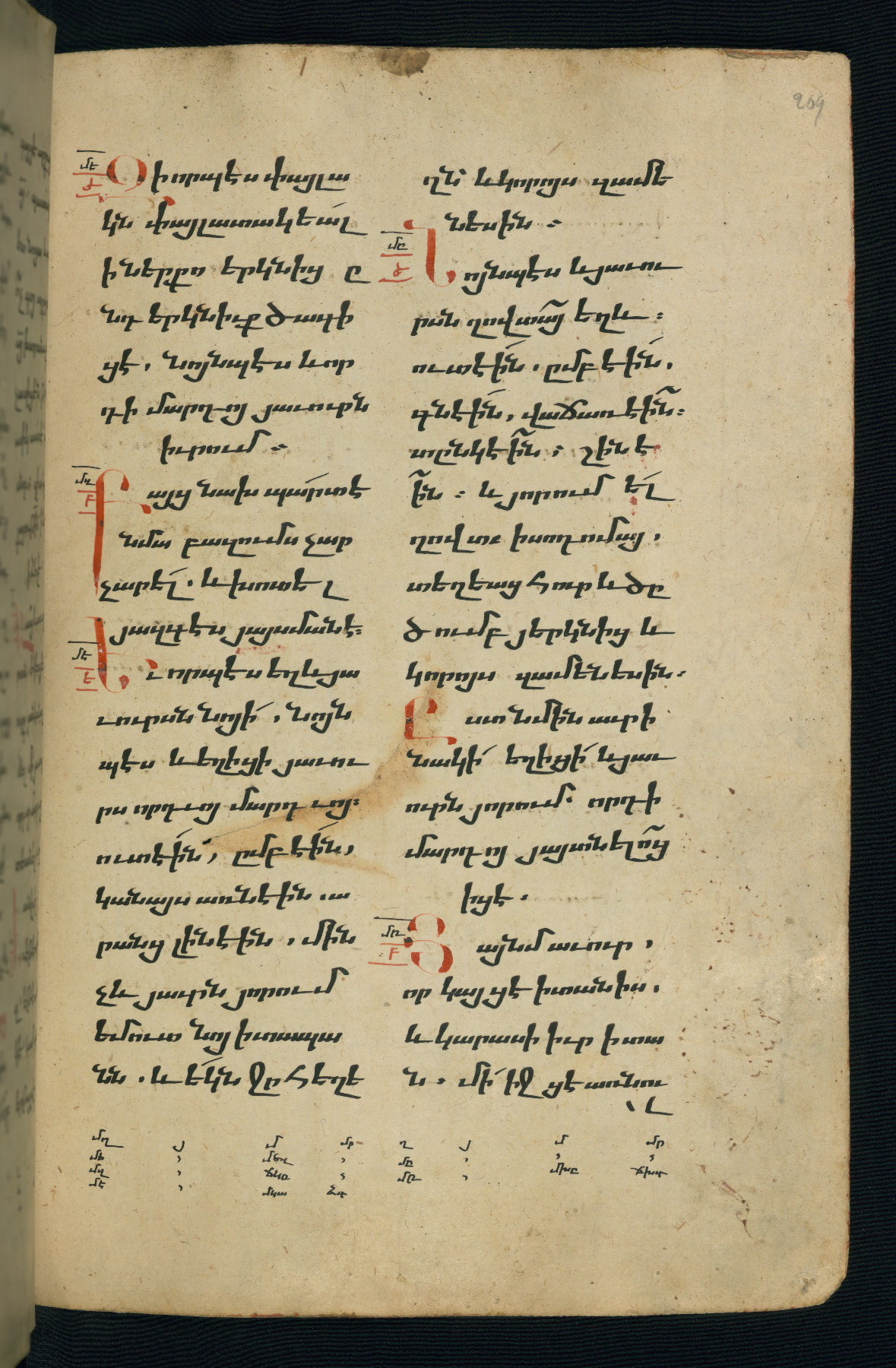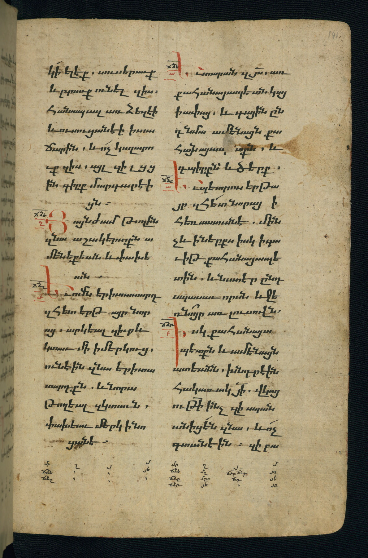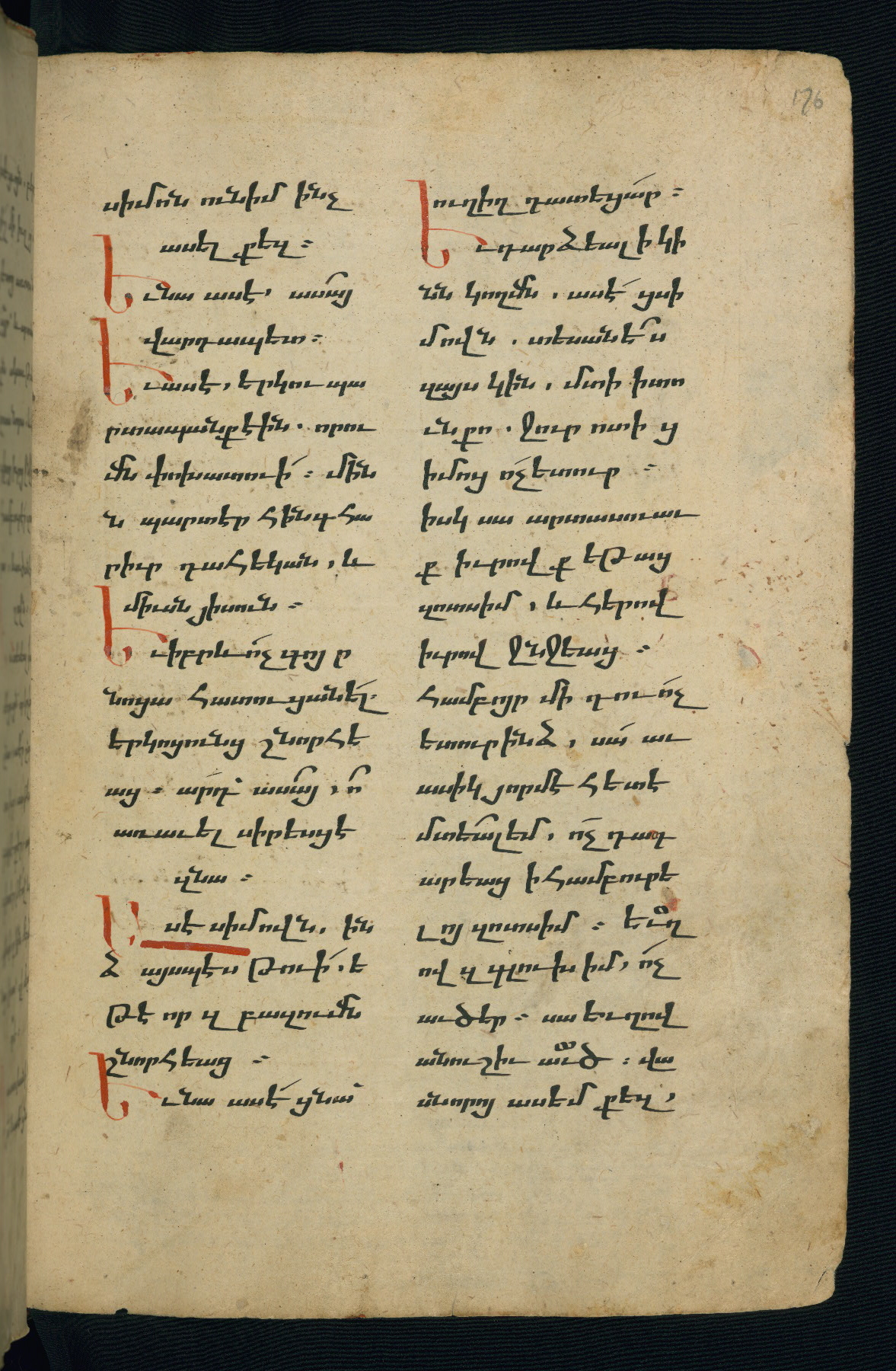 This Armenian Gospel book was produced in 904 of the Armenian era (1455 CE) at the monastery of Gamałiēl in Xizan by the scribe Yohannēs Vardapet, son of Vardan and Dilšat, and was illuminated by the priest Xačʿatur. The priest Pʿilipos commissioned the manuscript as a memorial to himself, his parents Łazar and Xutʿlumēlikʿ, and other relatives listed in the colophon on fols. 300r to 301v. Pʿilipos is depicted on fol. 14v alongside his brothers Yusēpʿ and Sultanša, as they kneel before the Virgin and Child enthroned (Theotokos). The book contains twenty-six full-page polychrome miniatures, including four Evangelist portraits; ornately designed canon tables; four decorated incipit pages; numerous marginal miniatures of floral and faunal motifs; and nineteen marginal miniatures of biblical characters or allusions to biblical narratives.