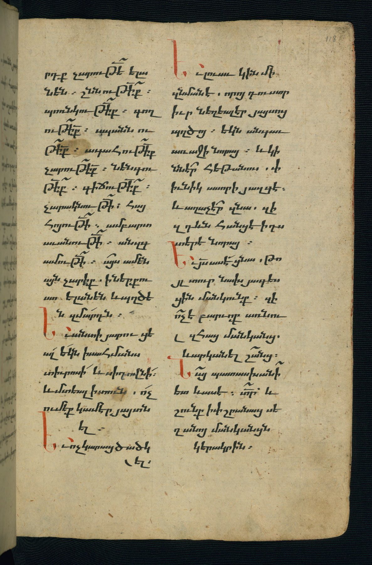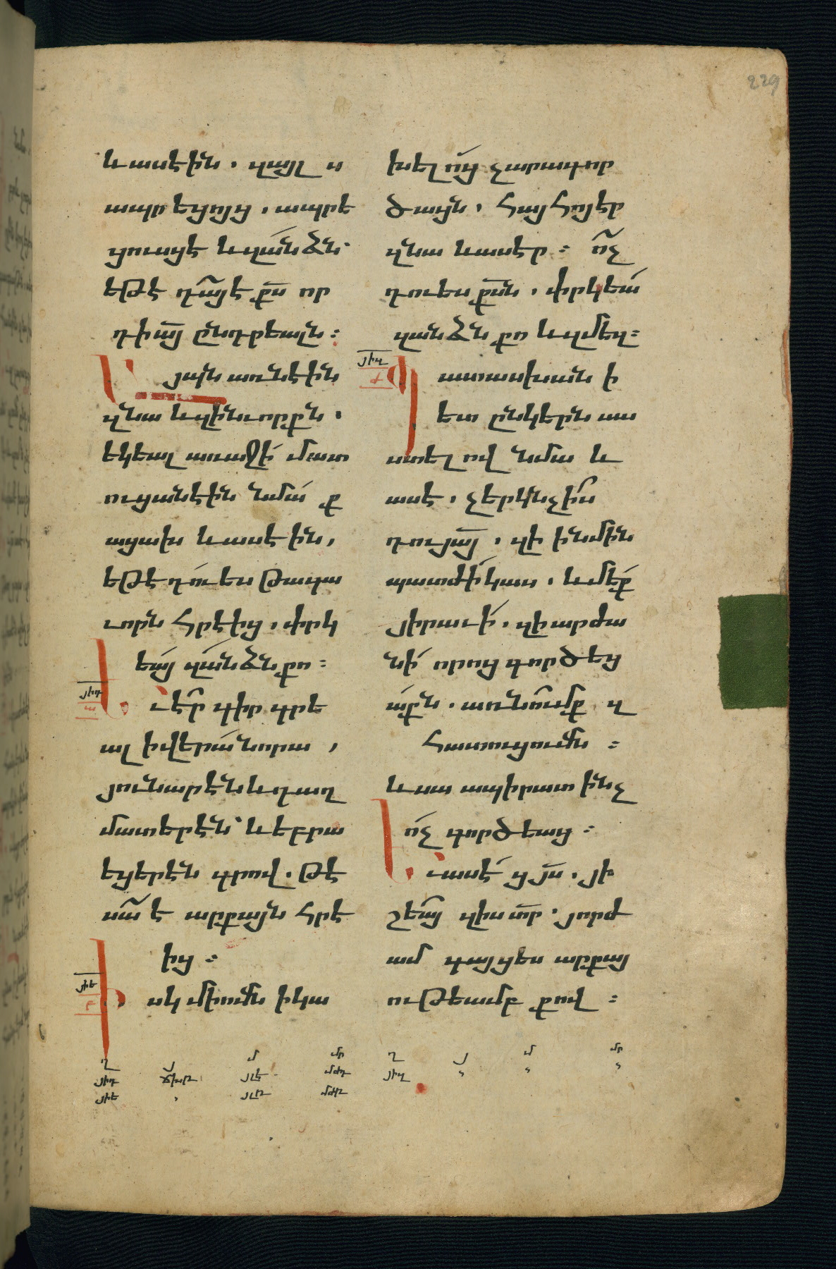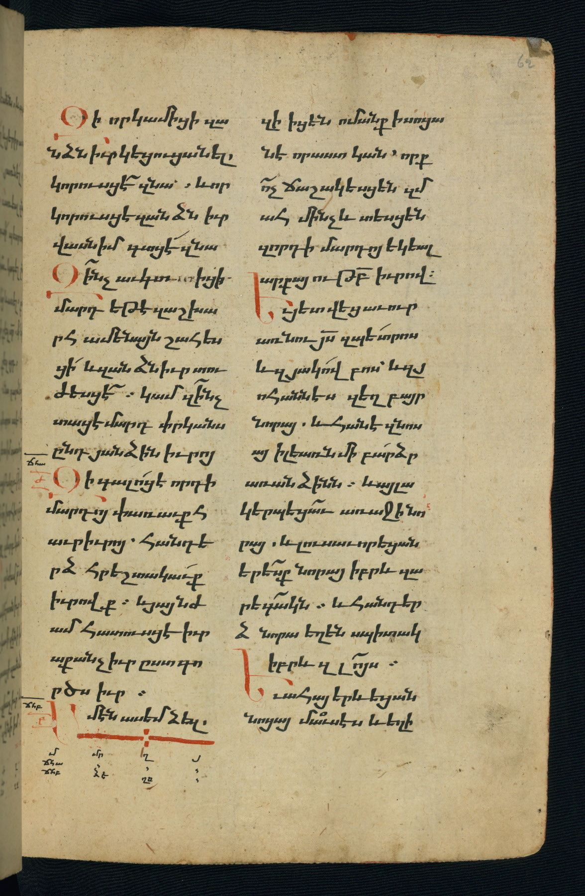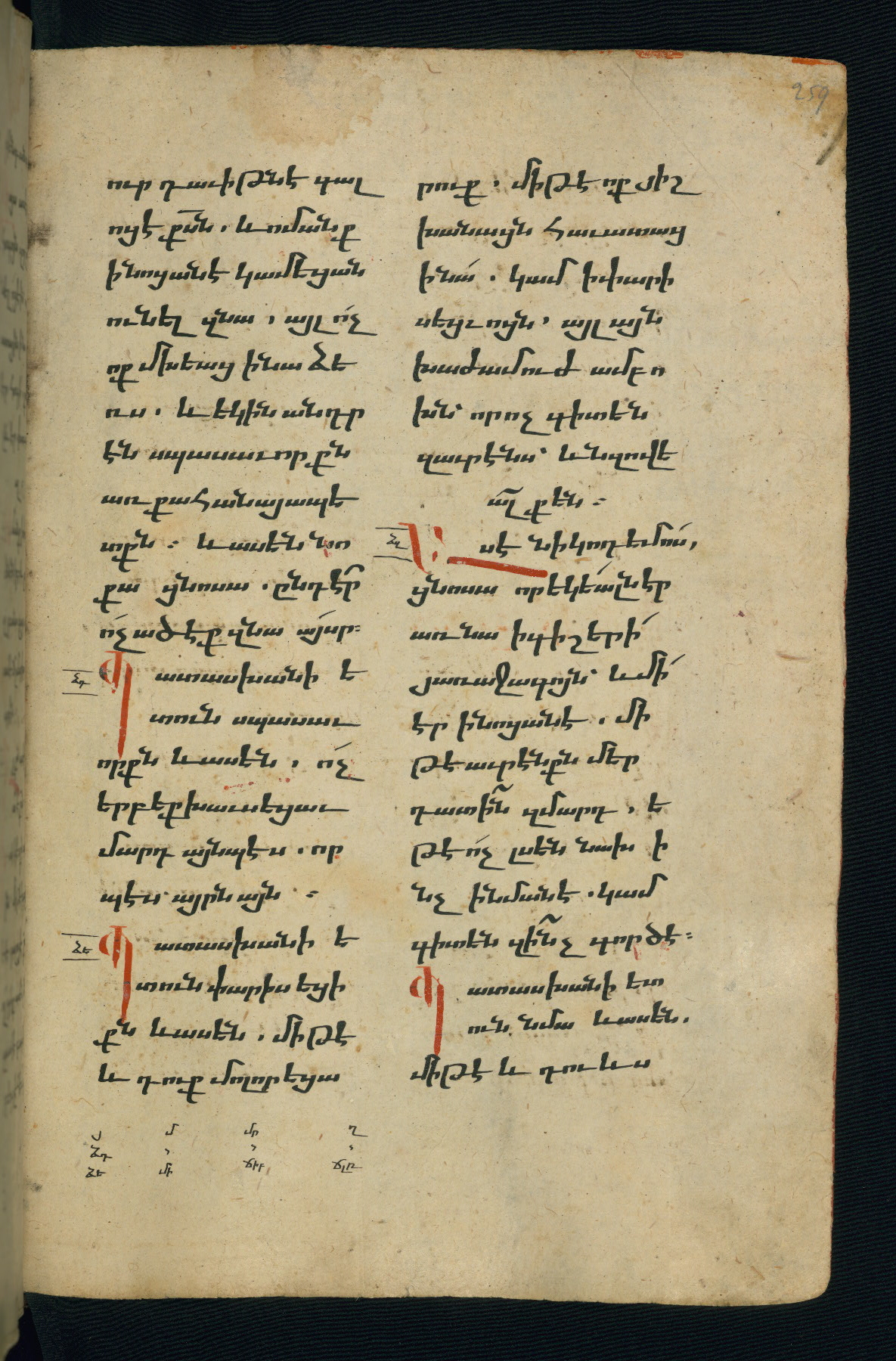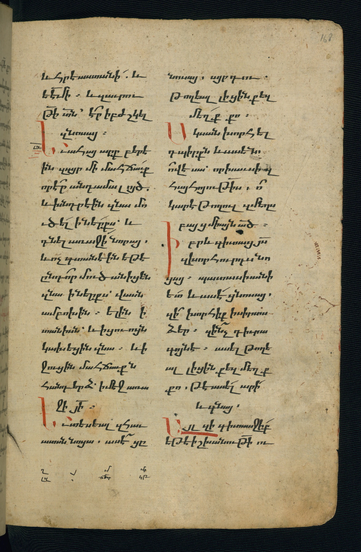 This Armenian Gospel book was produced in 904 of the Armenian era (1455 CE) at the monastery of Gamałiēl in Xizan by the scribe Yohannēs Vardapet, son of Vardan and Dilšat, and was illuminated by the priest Xačʿatur. The priest Pʿilipos commissioned the manuscript as a memorial to himself, his parents Łazar and Xutʿlumēlikʿ, and other relatives listed in the colophon on fols. 300r to 301v. Pʿilipos is depicted on fol. 14v alongside his brothers Yusēpʿ and Sultanša, as they kneel before the Virgin and Child enthroned (Theotokos). The book contains twenty-six full-page polychrome miniatures, including four Evangelist portraits; ornately designed canon tables; four decorated incipit pages; numerous marginal miniatures of floral and faunal motifs; and nineteen marginal miniatures of biblical characters or allusions to biblical narratives.