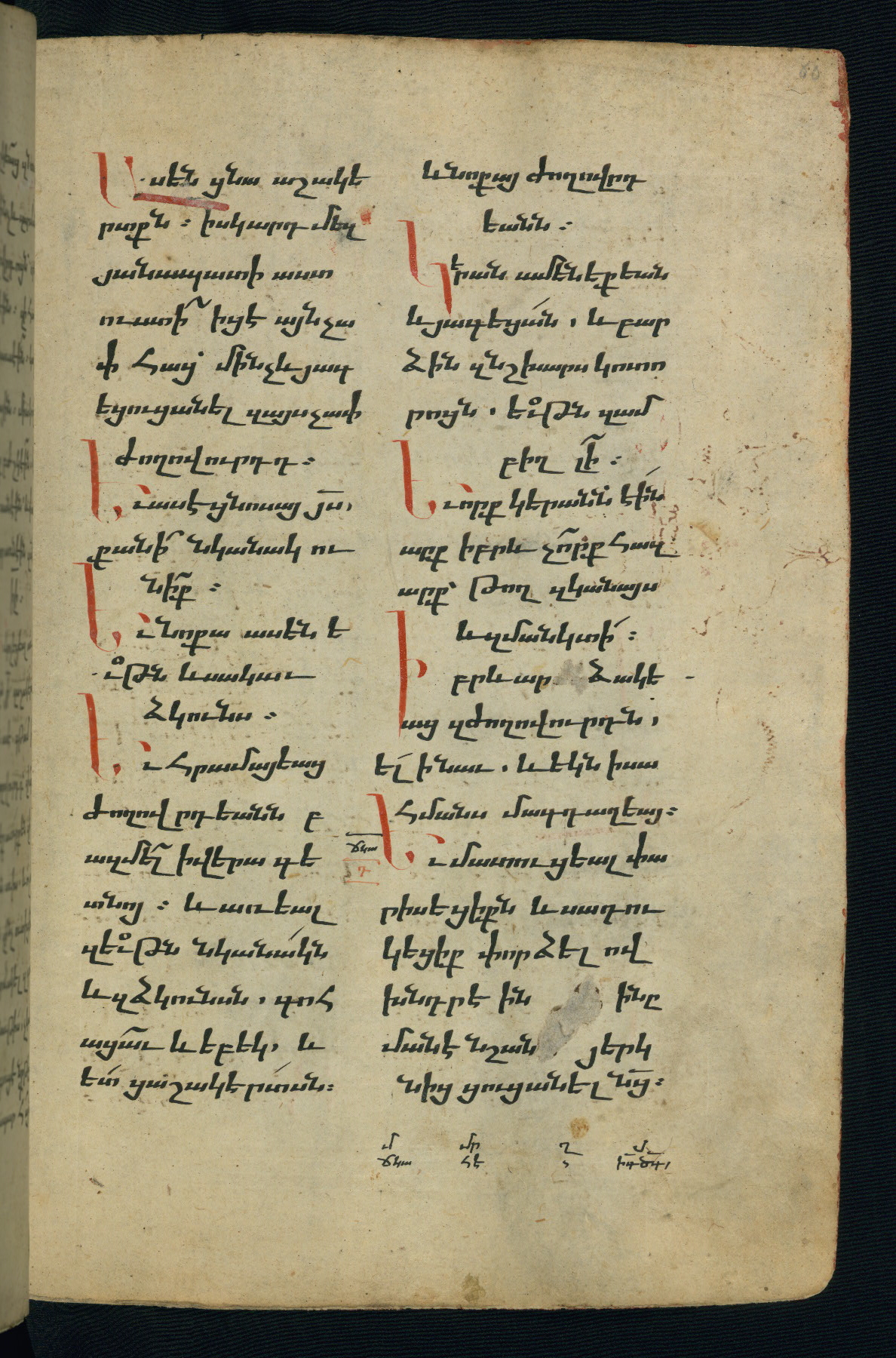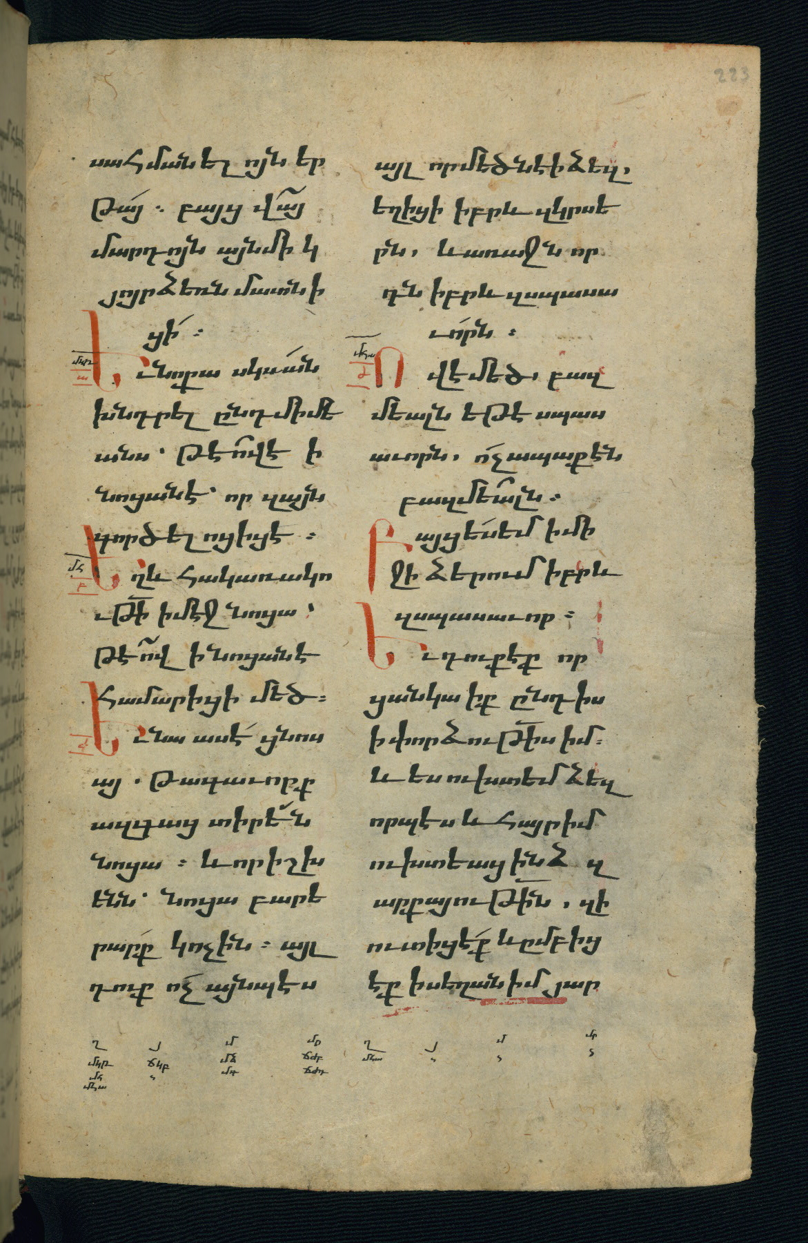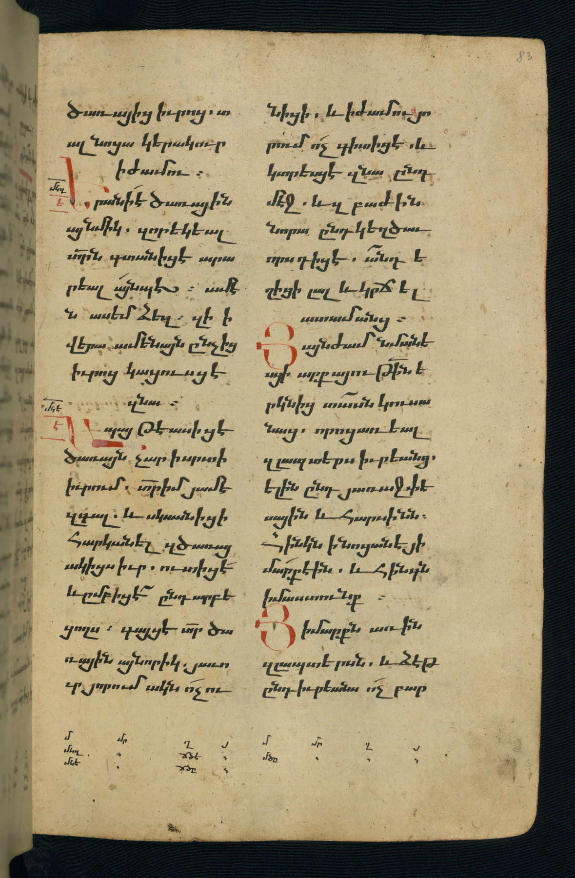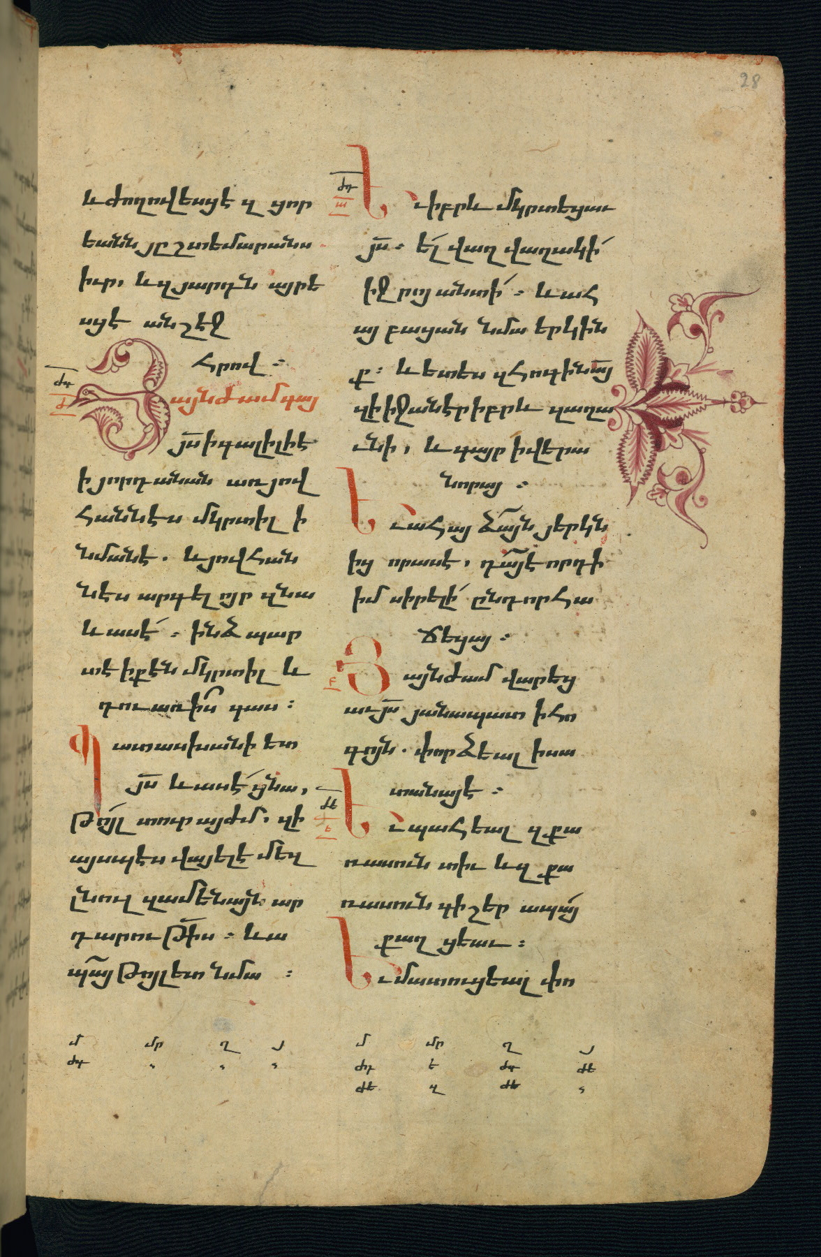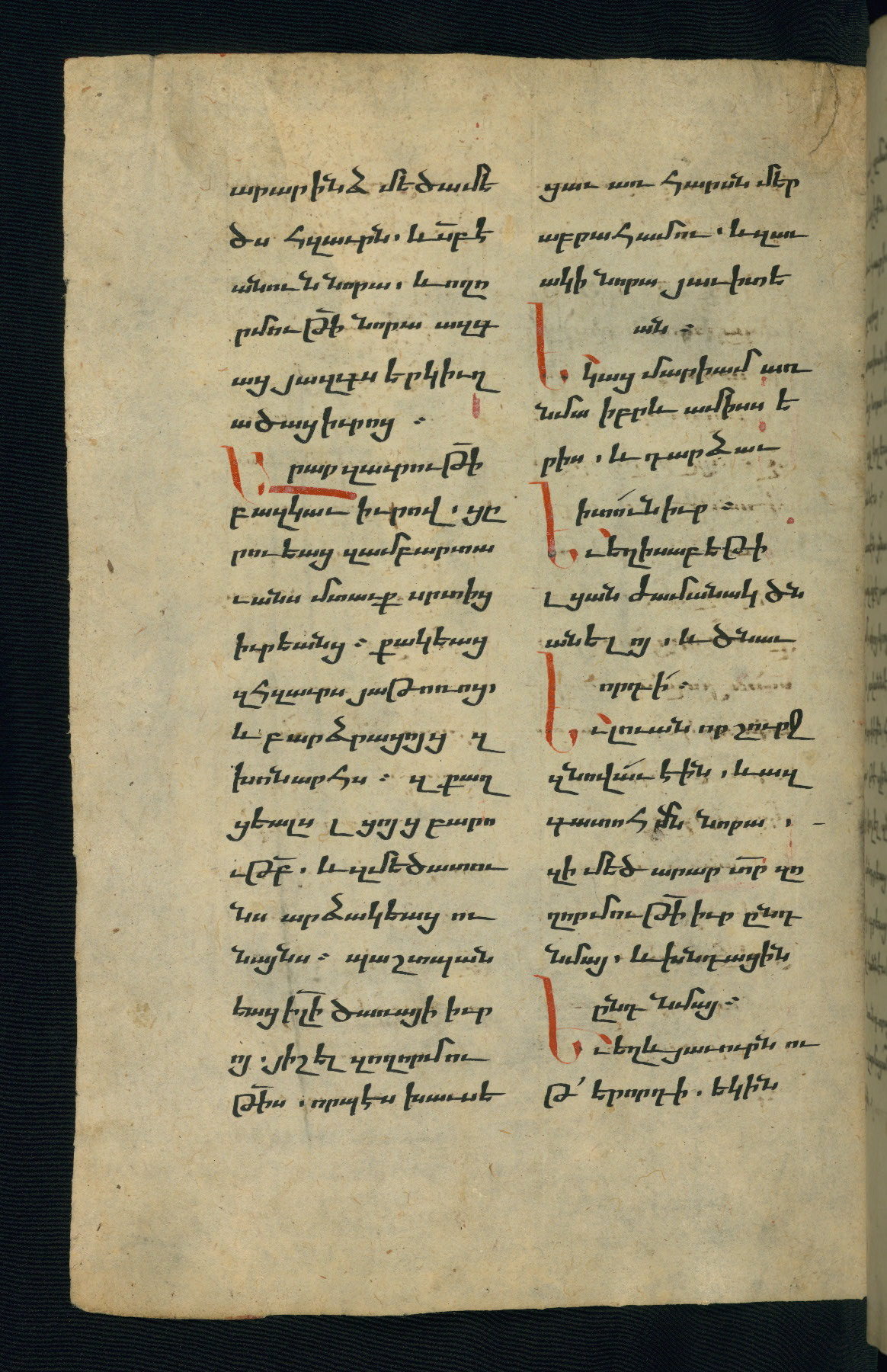 This Armenian Gospel book was produced in 904 of the Armenian era (1455 CE) at the monastery of Gamałiēl in Xizan by the scribe Yohannēs Vardapet, son of Vardan and Dilšat, and was illuminated by the priest Xačʿatur. The priest Pʿilipos commissioned the manuscript as a memorial to himself, his parents Łazar and Xutʿlumēlikʿ, and other relatives listed in the colophon on fols. 300r to 301v. Pʿilipos is depicted on fol. 14v alongside his brothers Yusēpʿ and Sultanša, as they kneel before the Virgin and Child enthroned (Theotokos). The book contains twenty-six full-page polychrome miniatures, including four Evangelist portraits; ornately designed canon tables; four decorated incipit pages; numerous marginal miniatures of floral and faunal motifs; and nineteen marginal miniatures of biblical characters or allusions to biblical narratives.