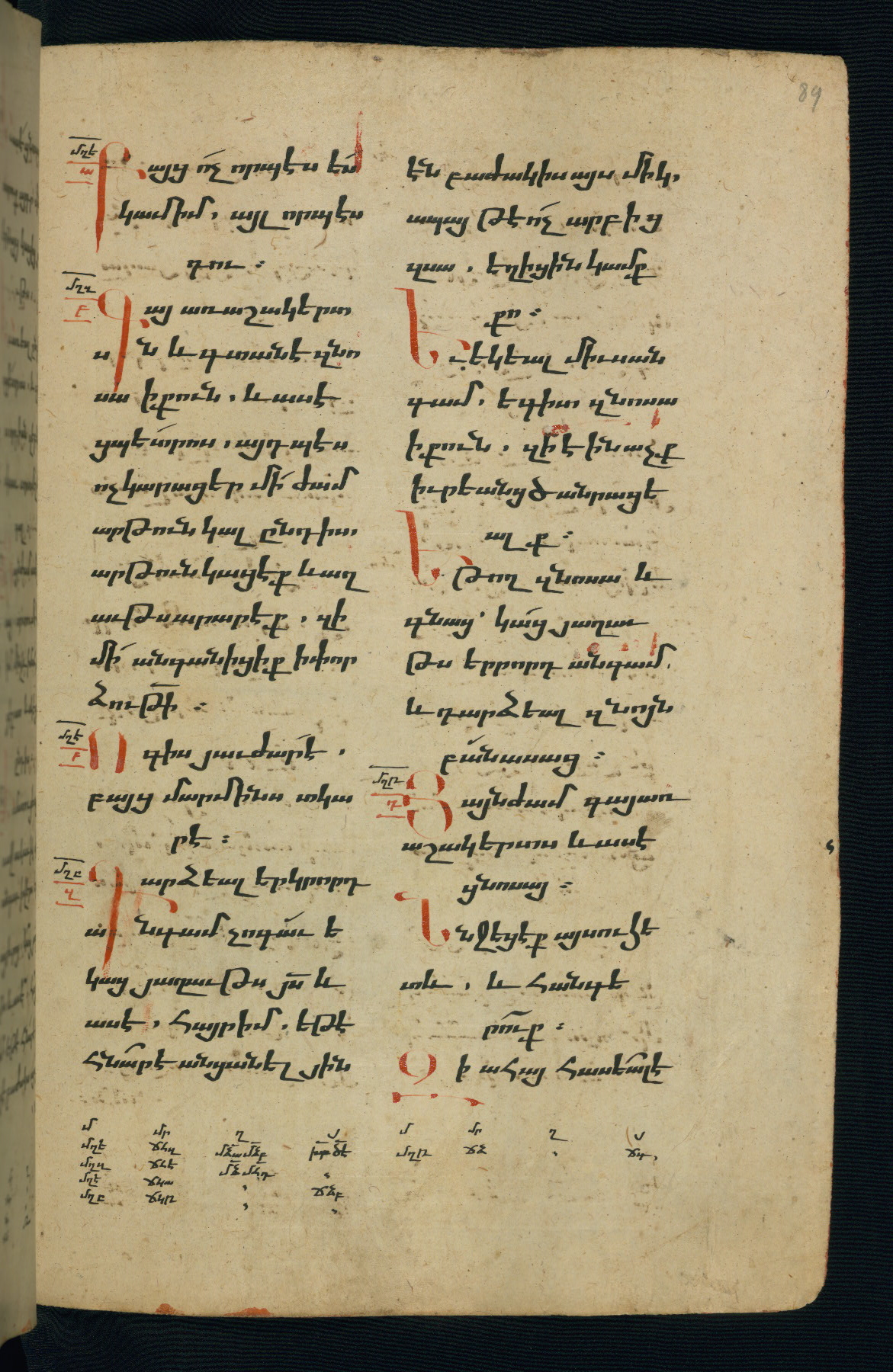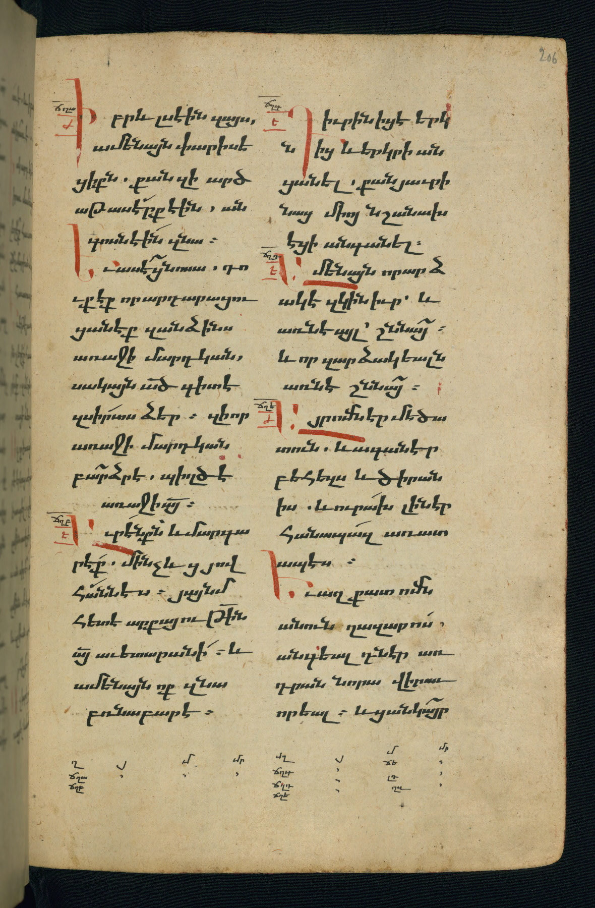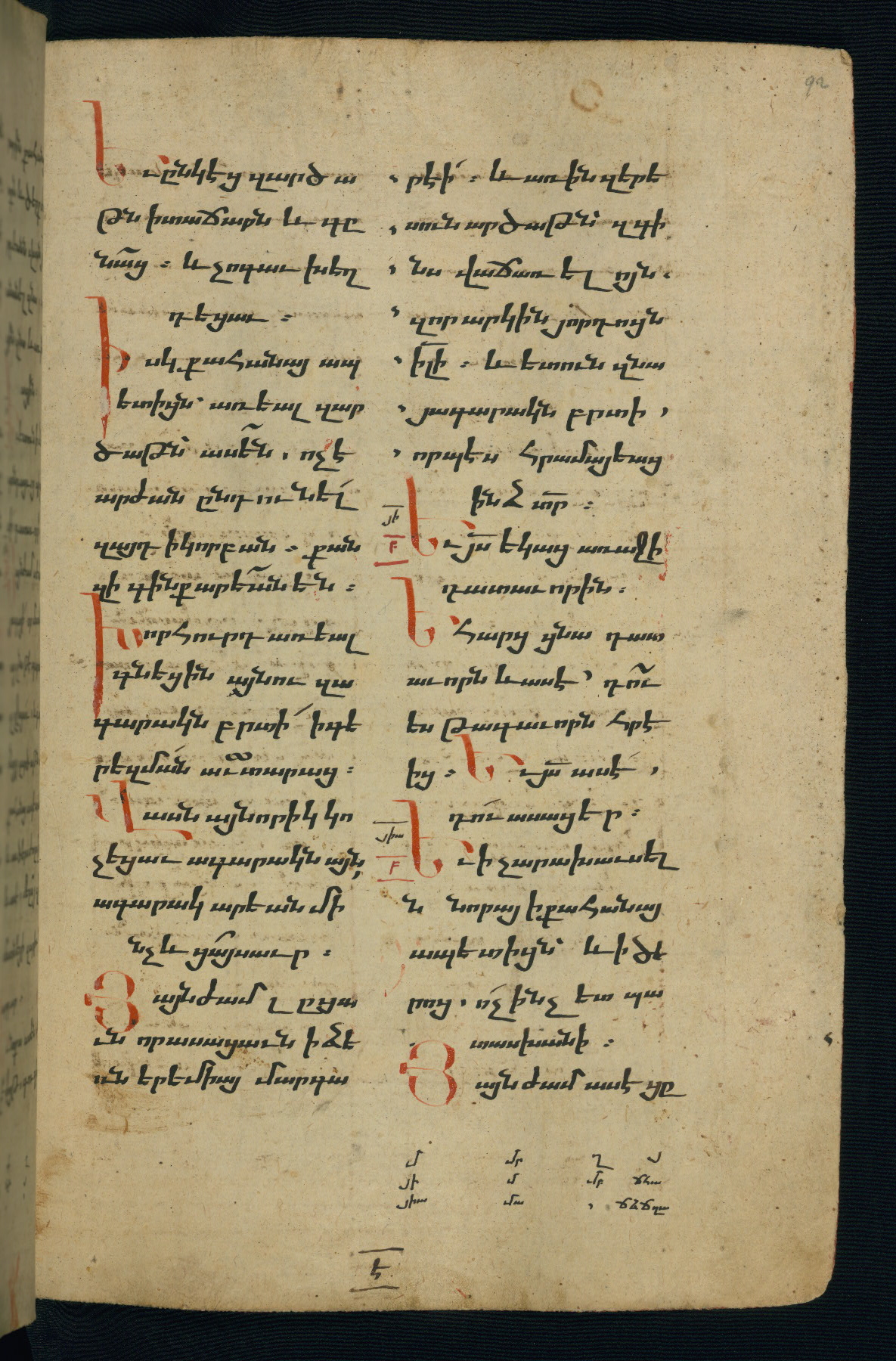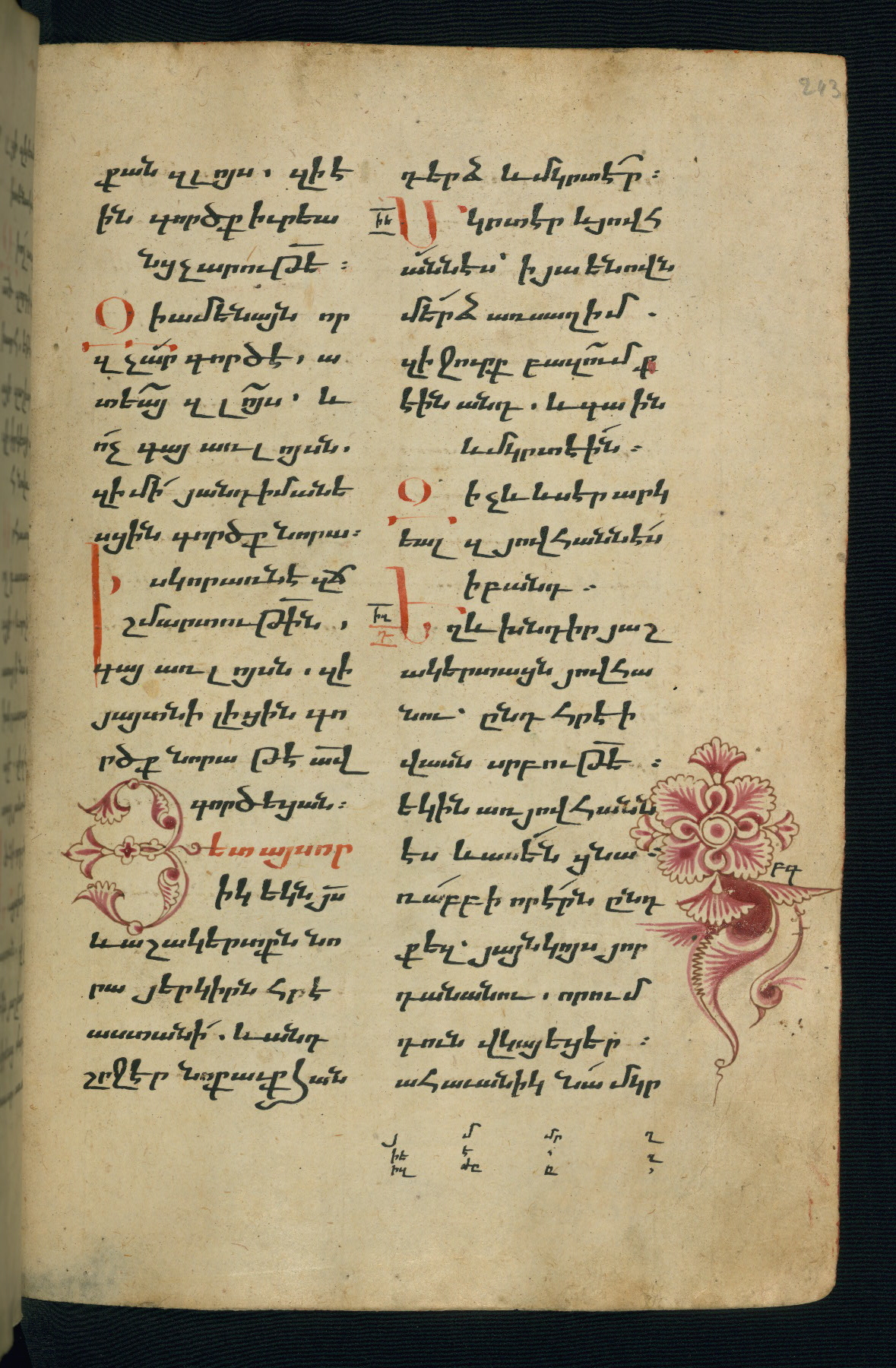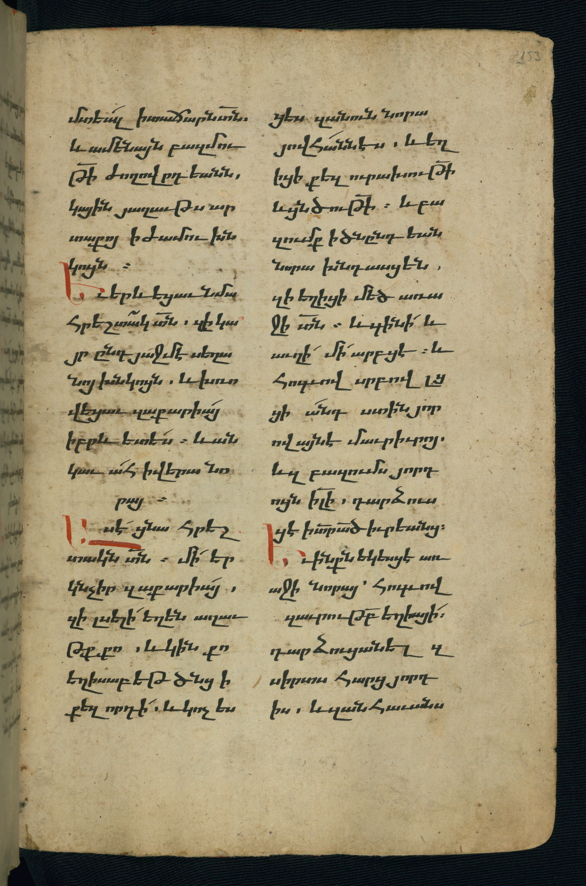 This Armenian Gospel book was produced in 904 of the Armenian era (1455 CE) at the monastery of Gamałiēl in Xizan by the scribe Yohannēs Vardapet, son of Vardan and Dilšat, and was illuminated by the priest Xačʿatur. The priest Pʿilipos commissioned the manuscript as a memorial to himself, his parents Łazar and Xutʿlumēlikʿ, and other relatives listed in the colophon on fols. 300r to 301v. Pʿilipos is depicted on fol. 14v alongside his brothers Yusēpʿ and Sultanša, as they kneel before the Virgin and Child enthroned (Theotokos). The book contains twenty-six full-page polychrome miniatures, including four Evangelist portraits; ornately designed canon tables; four decorated incipit pages; numerous marginal miniatures of floral and faunal motifs; and nineteen marginal miniatures of biblical characters or allusions to biblical narratives.