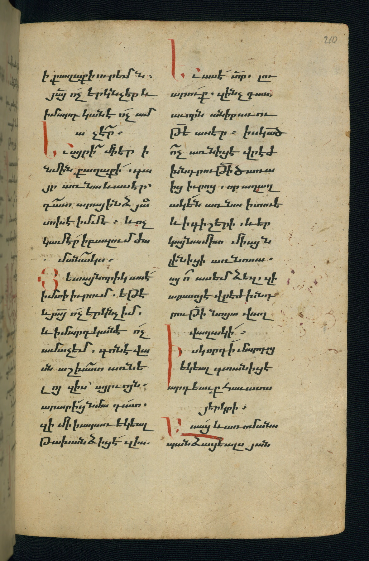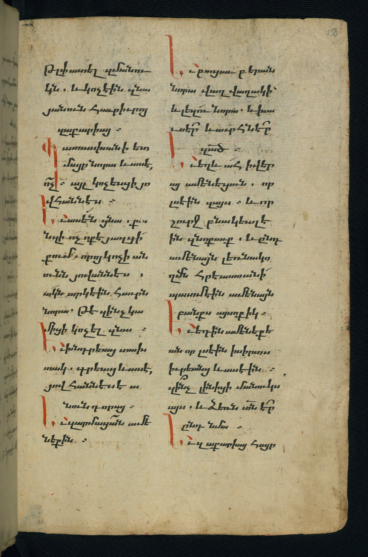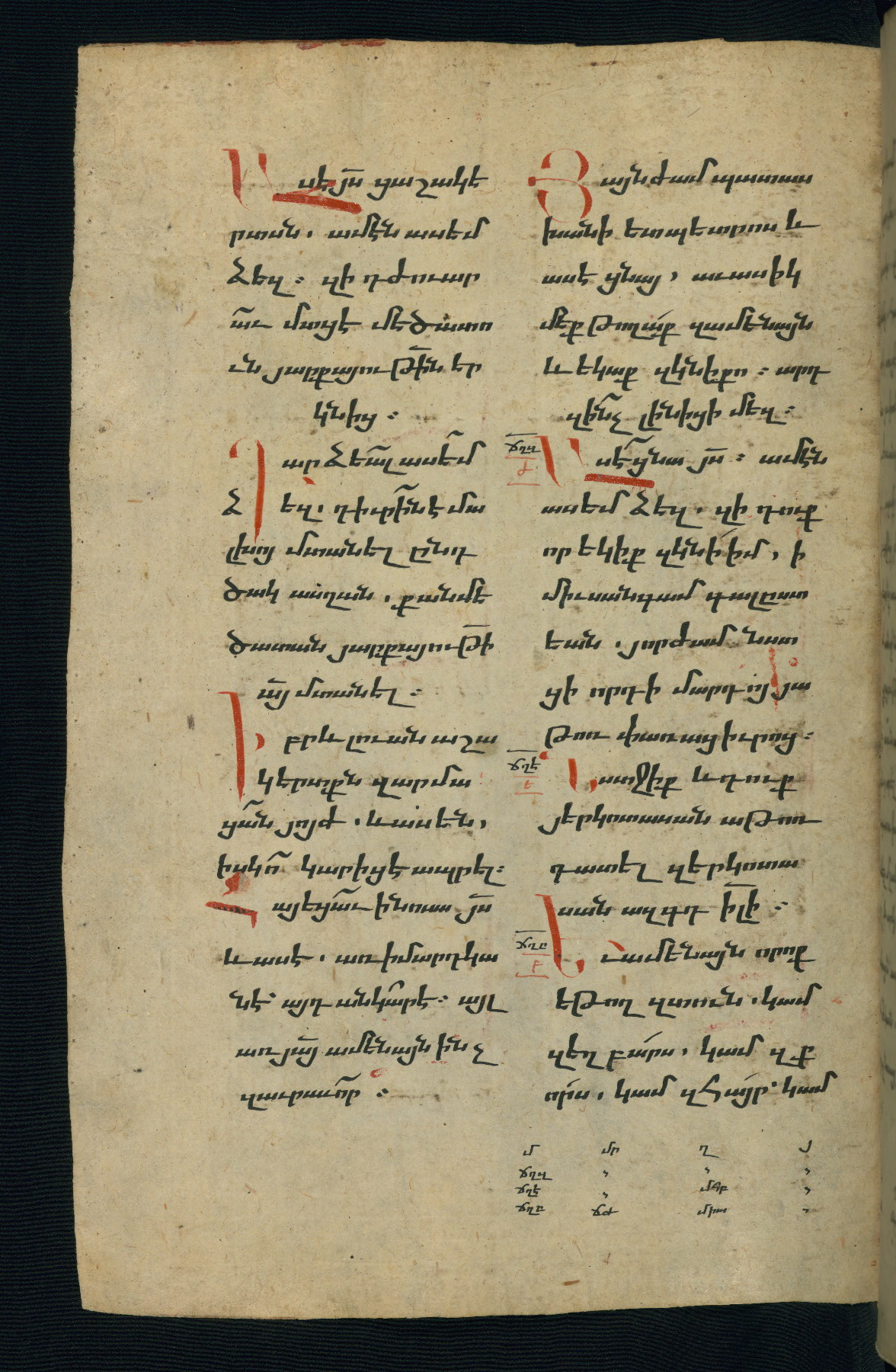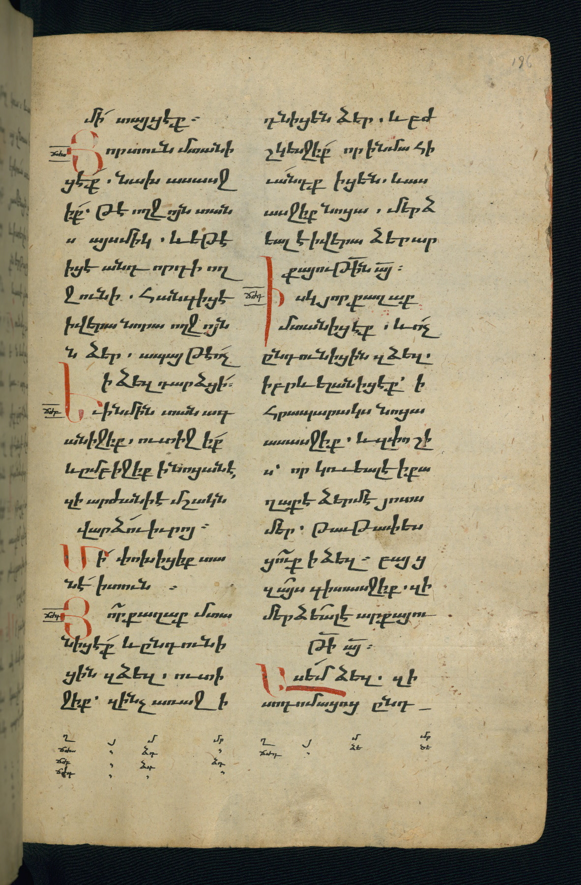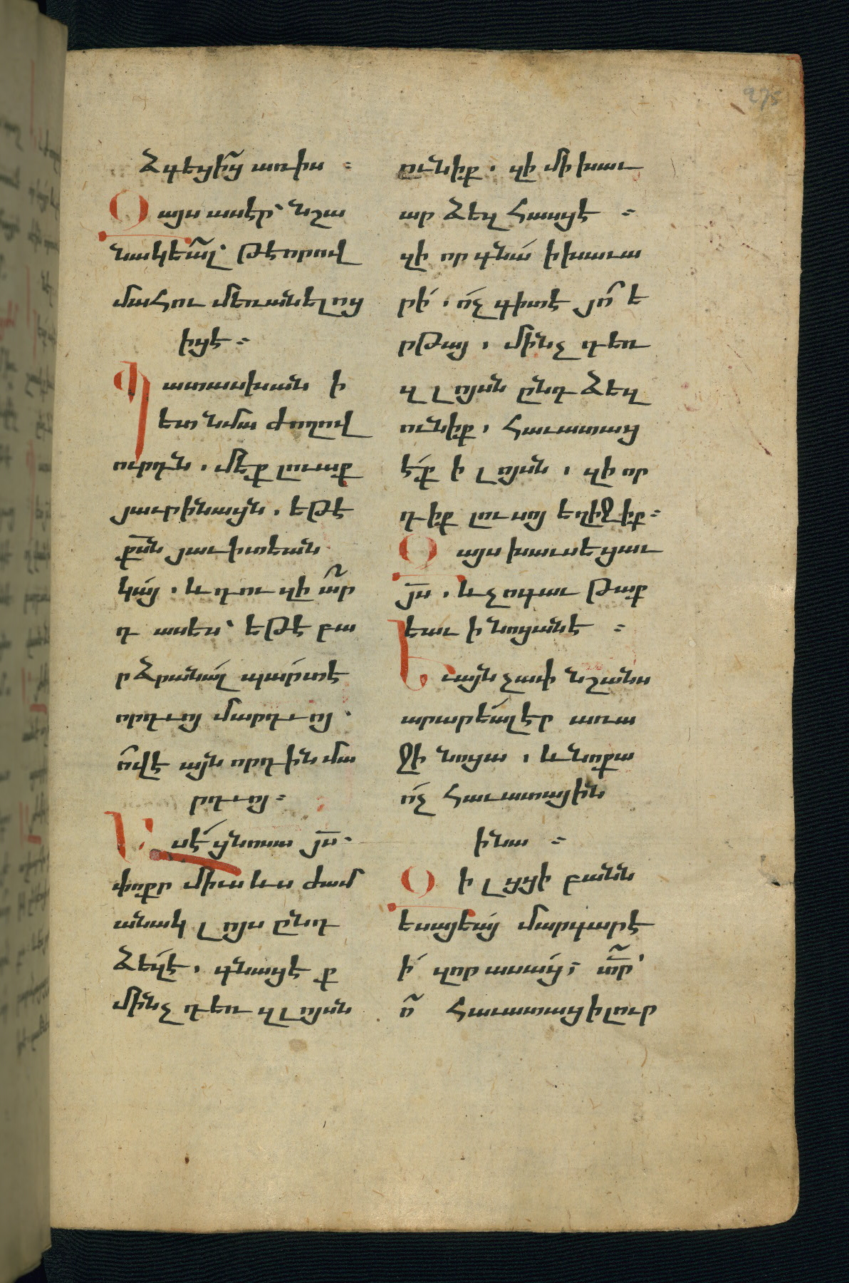 This Armenian Gospel book was produced in 904 of the Armenian era (1455 CE) at the monastery of Gamałiēl in Xizan by the scribe Yohannēs Vardapet, son of Vardan and Dilšat, and was illuminated by the priest Xačʿatur. The priest Pʿilipos commissioned the manuscript as a memorial to himself, his parents Łazar and Xutʿlumēlikʿ, and other relatives listed in the colophon on fols. 300r to 301v. Pʿilipos is depicted on fol. 14v alongside his brothers Yusēpʿ and Sultanša, as they kneel before the Virgin and Child enthroned (Theotokos). The book contains twenty-six full-page polychrome miniatures, including four Evangelist portraits; ornately designed canon tables; four decorated incipit pages; numerous marginal miniatures of floral and faunal motifs; and nineteen marginal miniatures of biblical characters or allusions to biblical narratives.