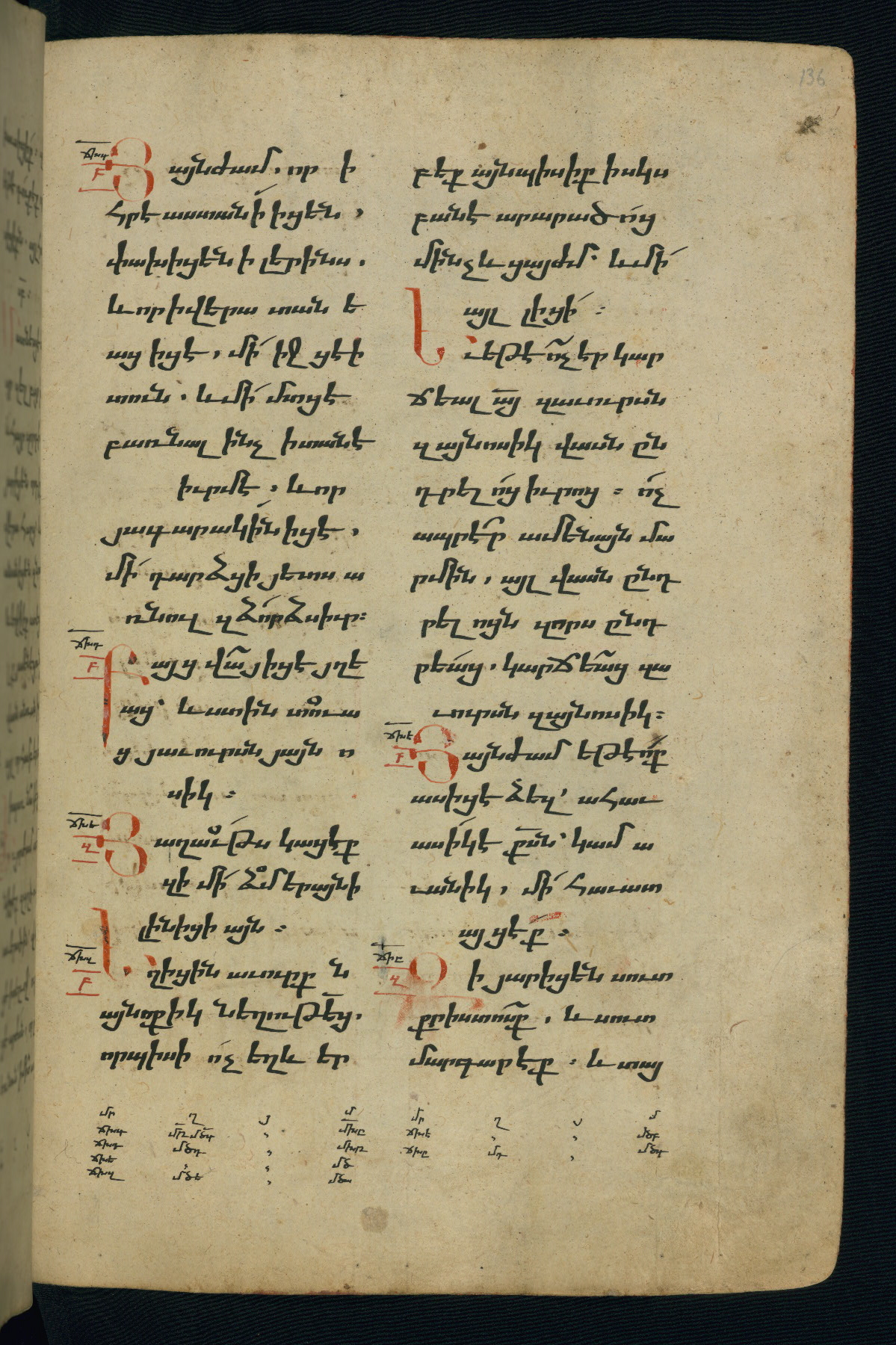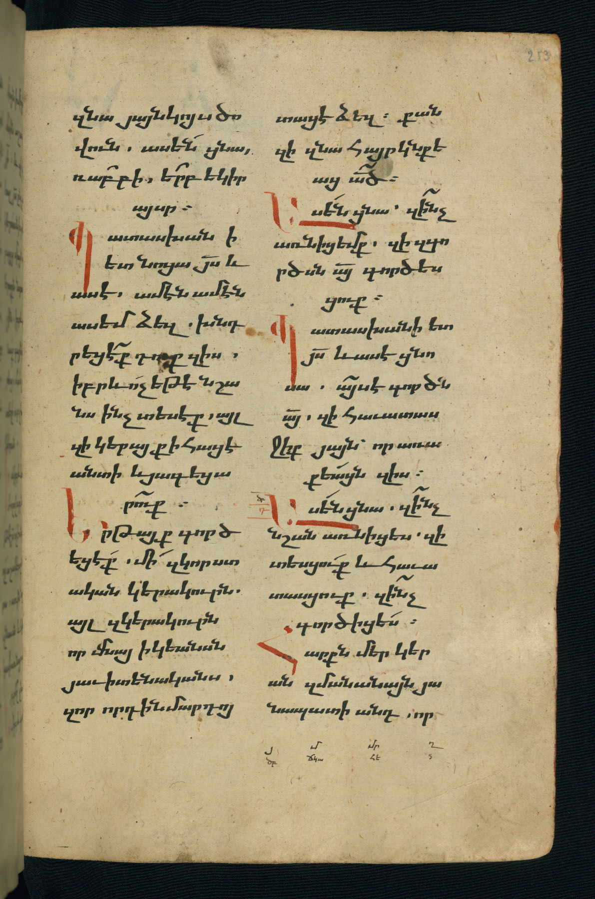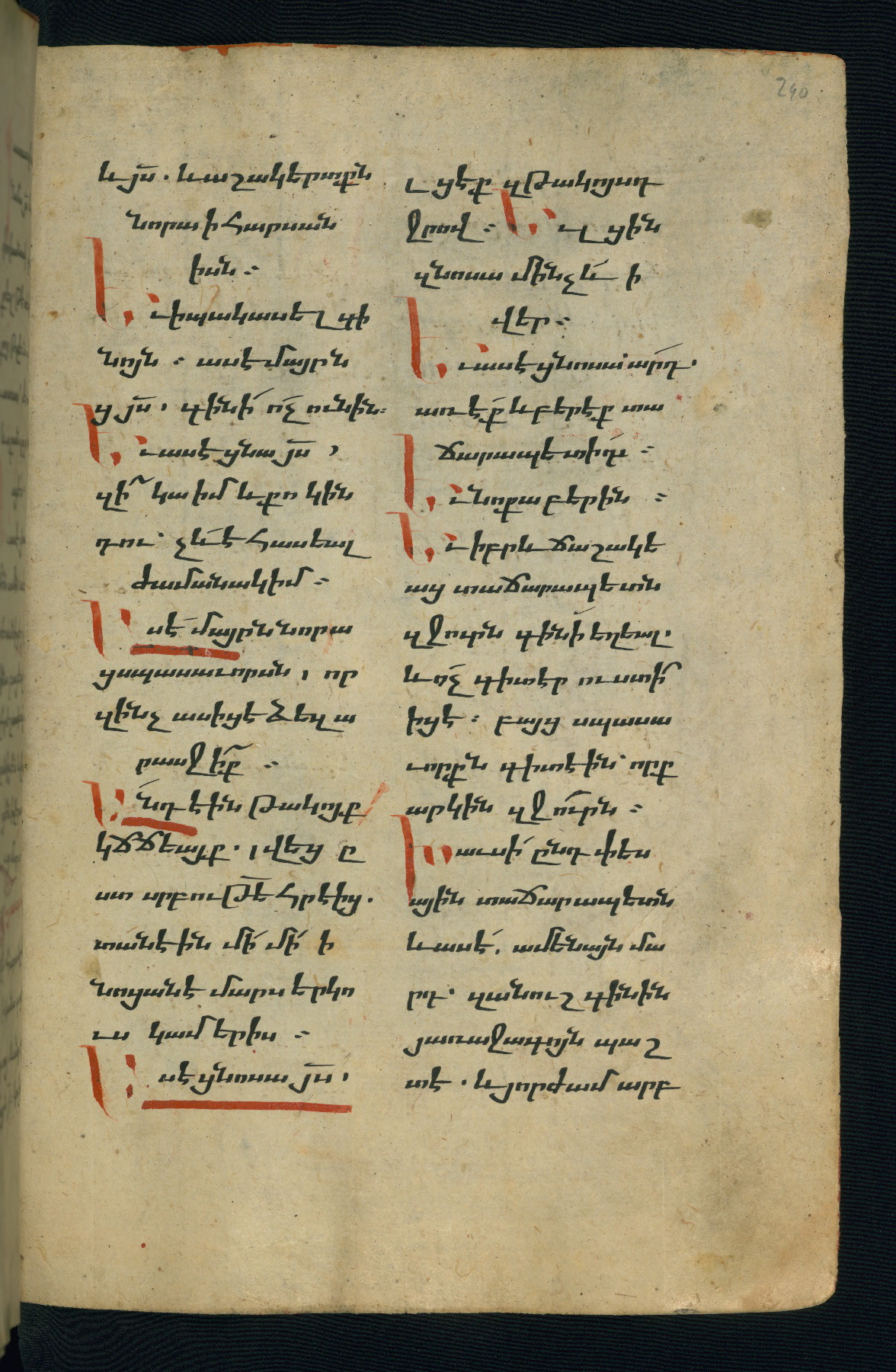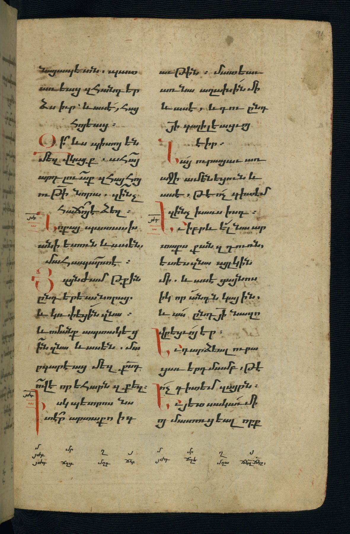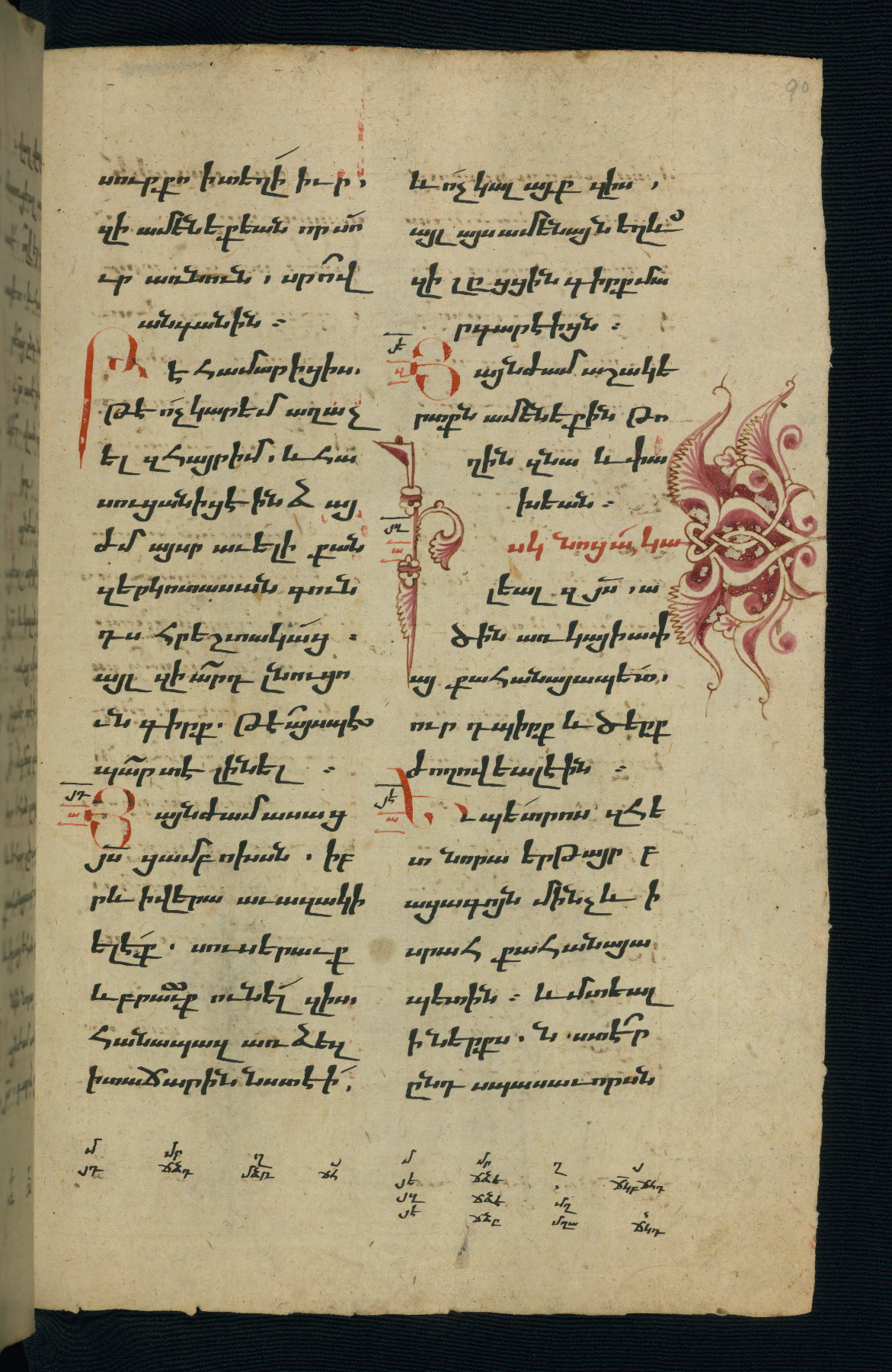 This Armenian Gospel book was produced in 904 of the Armenian era (1455 CE) at the monastery of Gamałiēl in Xizan by the scribe Yohannēs Vardapet, son of Vardan and Dilšat, and was illuminated by the priest Xačʿatur. The priest Pʿilipos commissioned the manuscript as a memorial to himself, his parents Łazar and Xutʿlumēlikʿ, and other relatives listed in the colophon on fols. 300r to 301v. Pʿilipos is depicted on fol. 14v alongside his brothers Yusēpʿ and Sultanša, as they kneel before the Virgin and Child enthroned (Theotokos). The book contains twenty-six full-page polychrome miniatures, including four Evangelist portraits; ornately designed canon tables; four decorated incipit pages; numerous marginal miniatures of floral and faunal motifs; and nineteen marginal miniatures of biblical characters or allusions to biblical narratives.