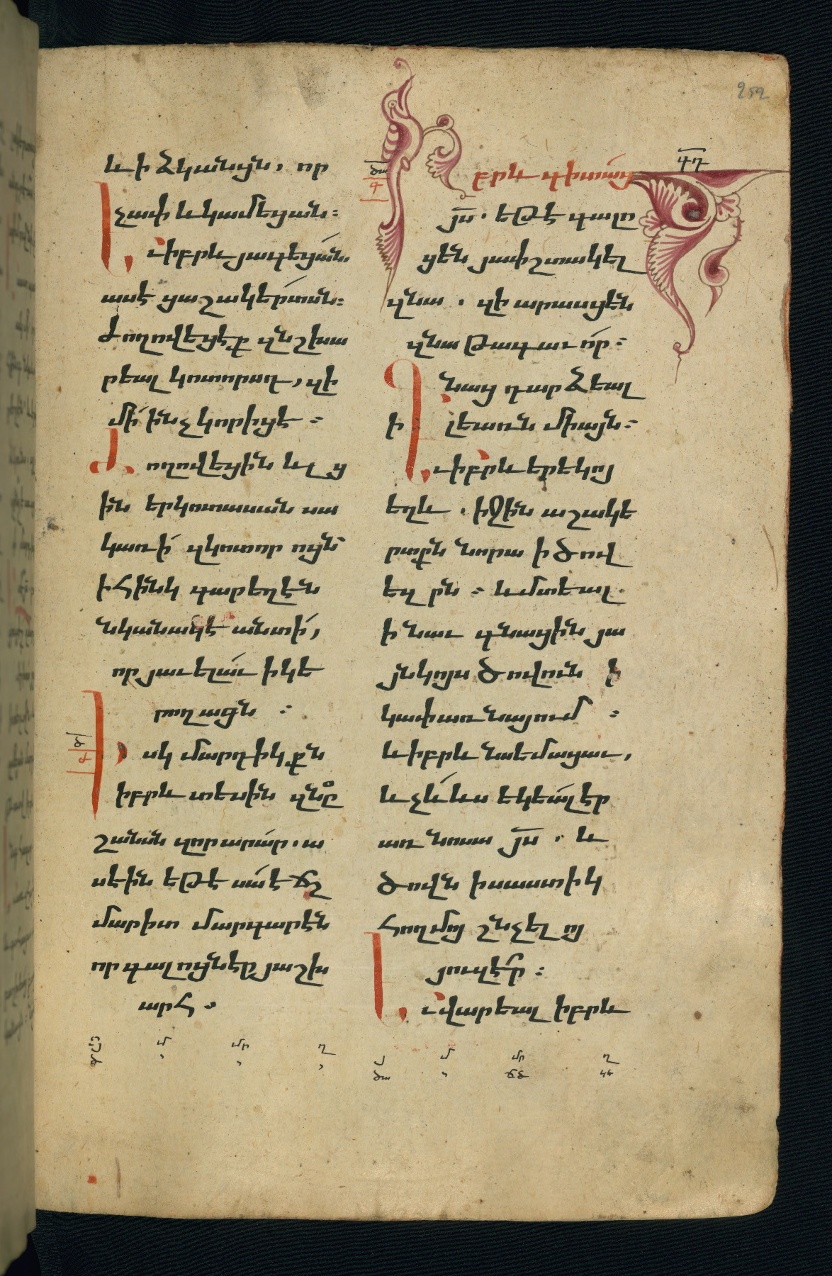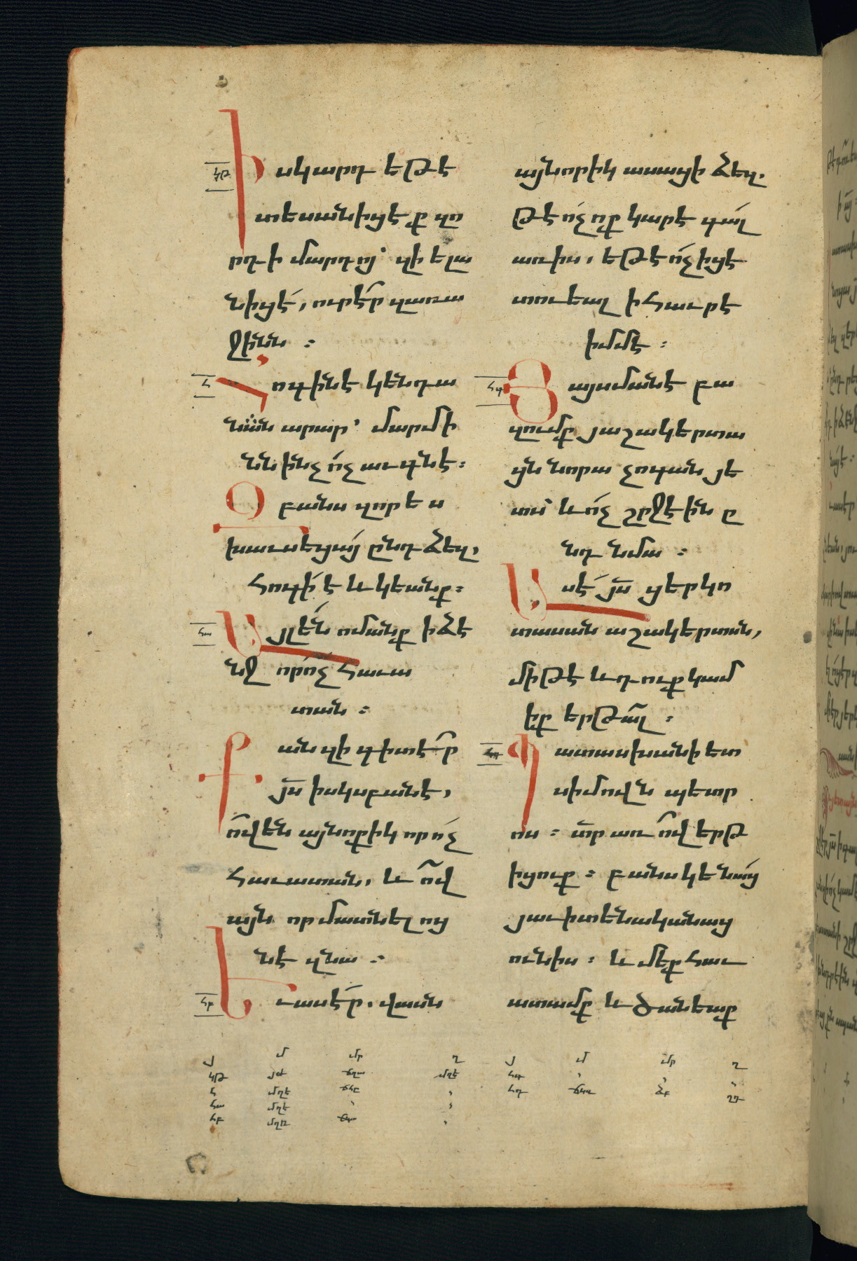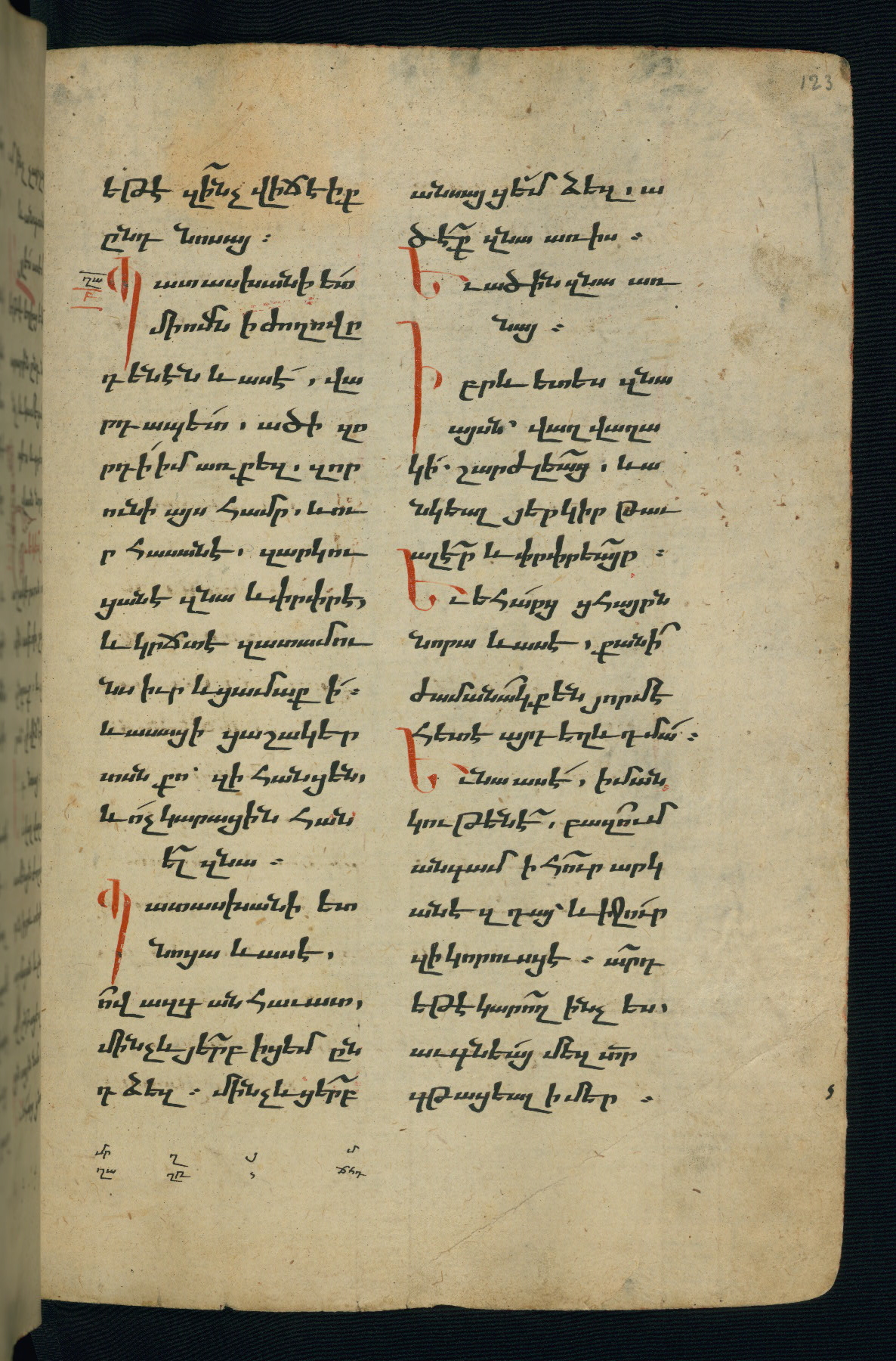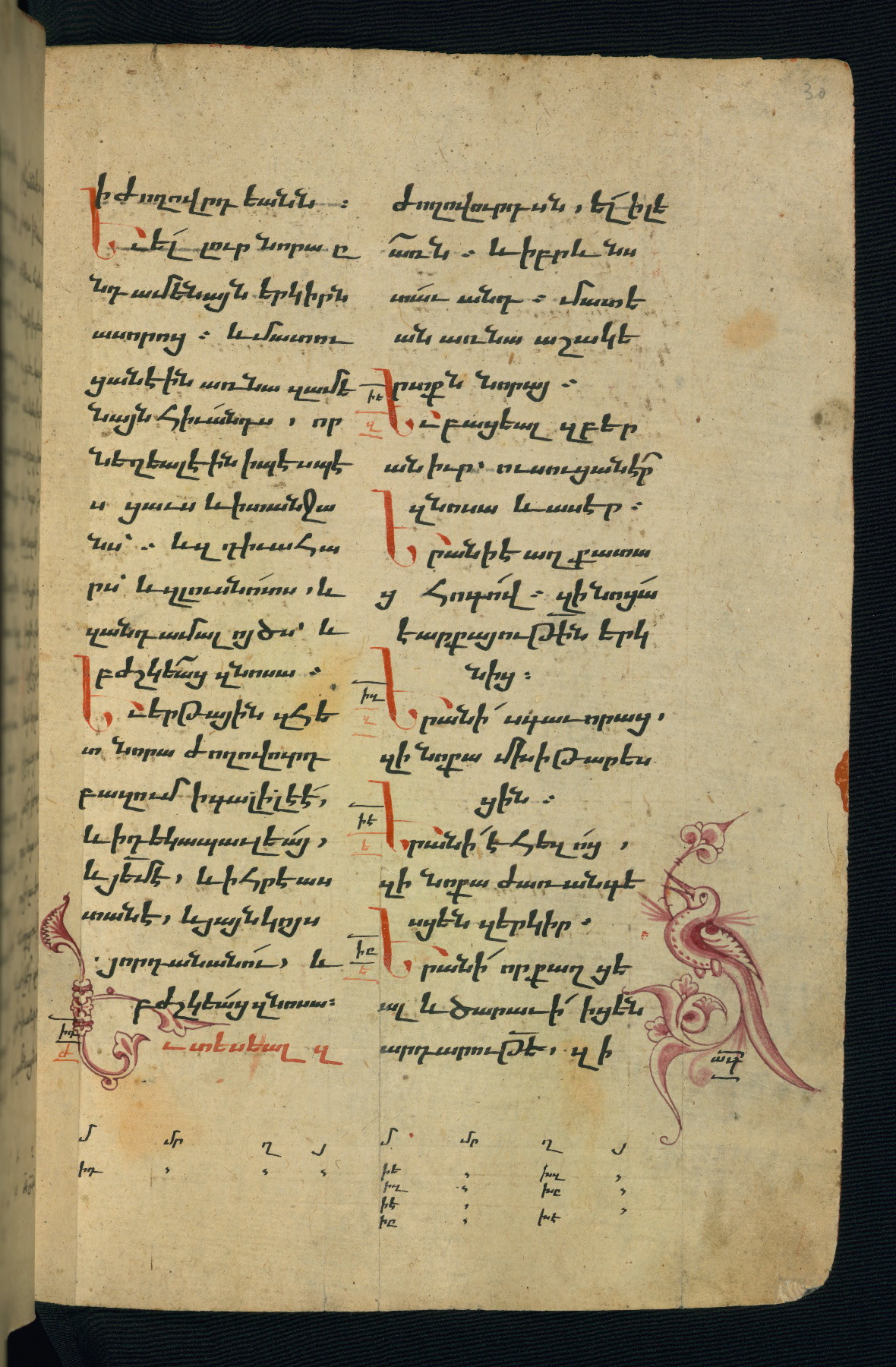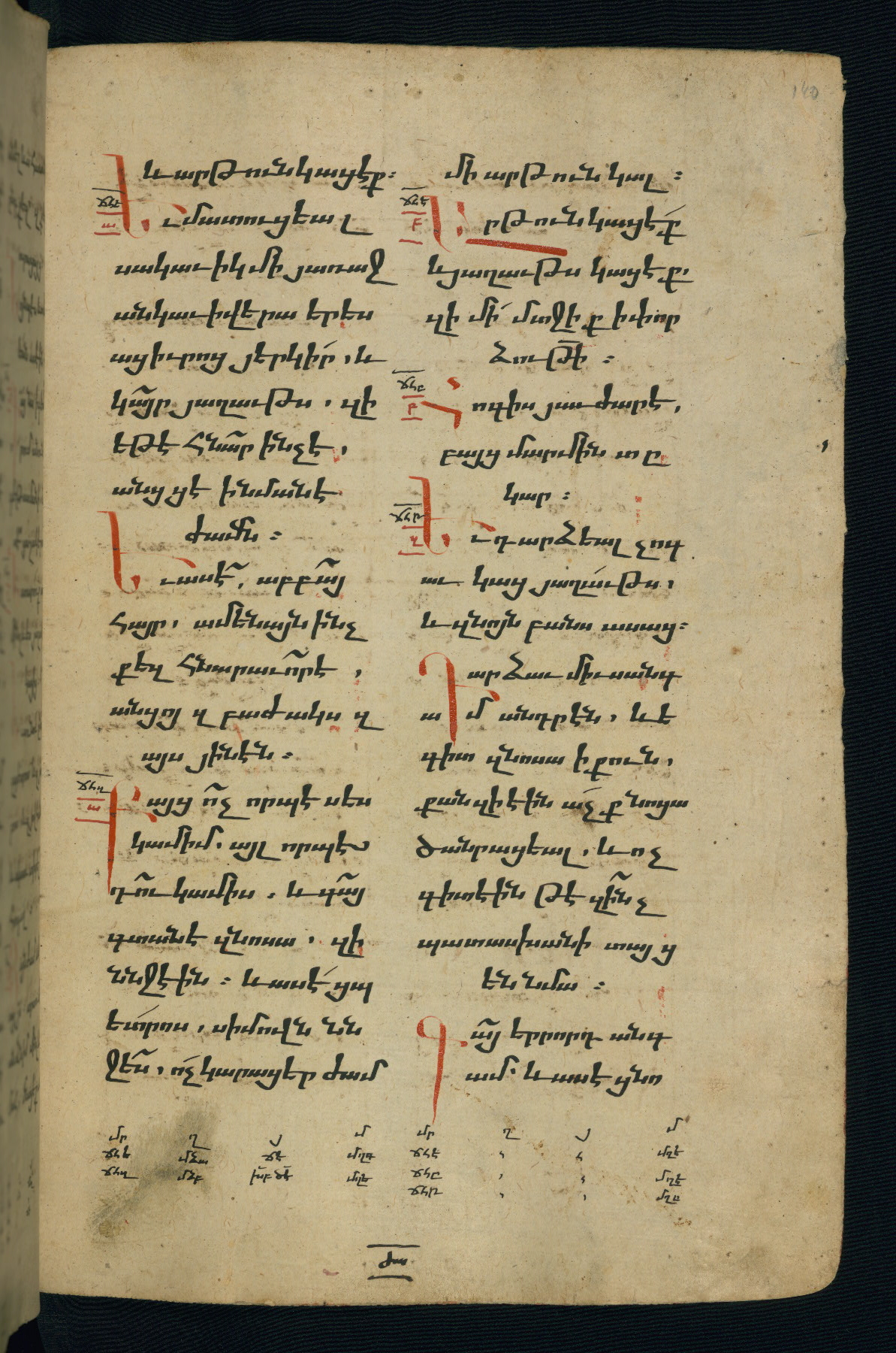 This Armenian Gospel book was produced in 904 of the Armenian era (1455 CE) at the monastery of Gamałiēl in Xizan by the scribe Yohannēs Vardapet, son of Vardan and Dilšat, and was illuminated by the priest Xačʿatur. The priest Pʿilipos commissioned the manuscript as a memorial to himself, his parents Łazar and Xutʿlumēlikʿ, and other relatives listed in the colophon on fols. 300r to 301v. Pʿilipos is depicted on fol. 14v alongside his brothers Yusēpʿ and Sultanša, as they kneel before the Virgin and Child enthroned (Theotokos). The book contains twenty-six full-page polychrome miniatures, including four Evangelist portraits; ornately designed canon tables; four decorated incipit pages; numerous marginal miniatures of floral and faunal motifs; and nineteen marginal miniatures of biblical characters or allusions to biblical narratives.
