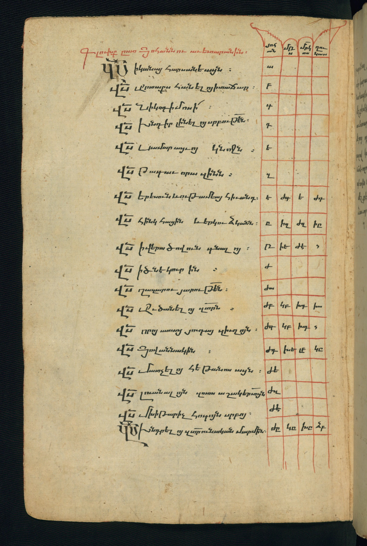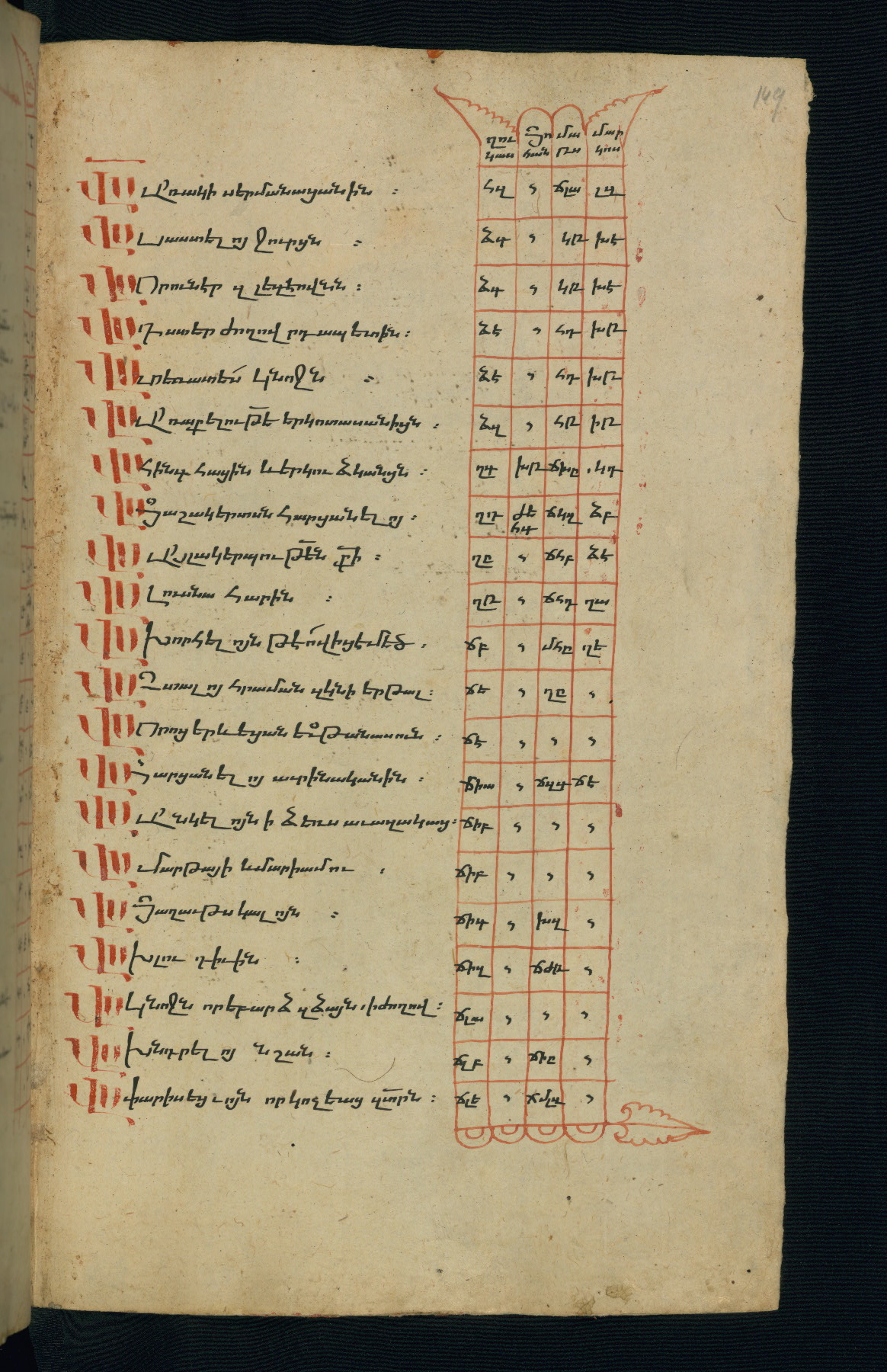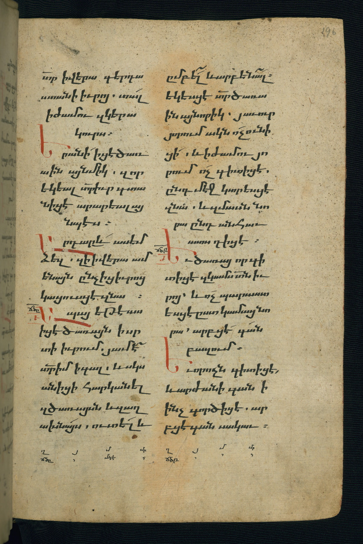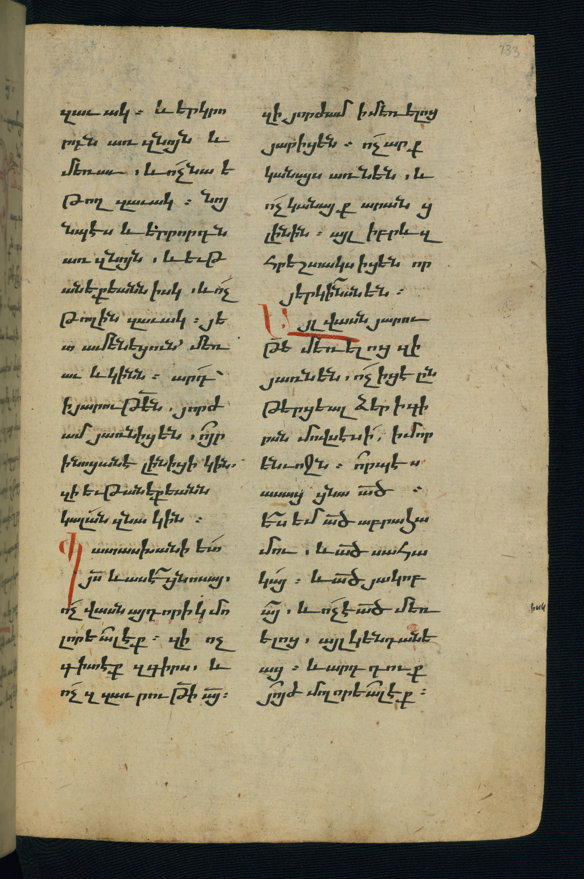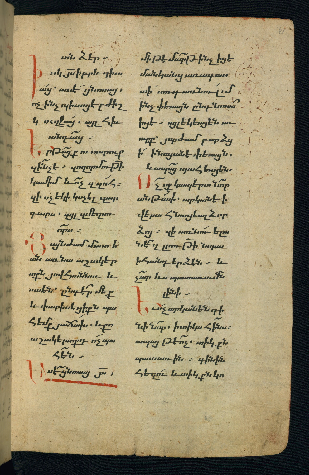 This Armenian Gospel book was produced in 904 of the Armenian era (1455 CE) at the monastery of Gamałiēl in Xizan by the scribe Yohannēs Vardapet, son of Vardan and Dilšat, and was illuminated by the priest Xačʿatur. The priest Pʿilipos commissioned the manuscript as a memorial to himself, his parents Łazar and Xutʿlumēlikʿ, and other relatives listed in the colophon on fols. 300r to 301v. Pʿilipos is depicted on fol. 14v alongside his brothers Yusēpʿ and Sultanša, as they kneel before the Virgin and Child enthroned (Theotokos). The book contains twenty-six full-page polychrome miniatures, including four Evangelist portraits; ornately designed canon tables; four decorated incipit pages; numerous marginal miniatures of floral and faunal motifs; and nineteen marginal miniatures of biblical characters or allusions to biblical narratives.