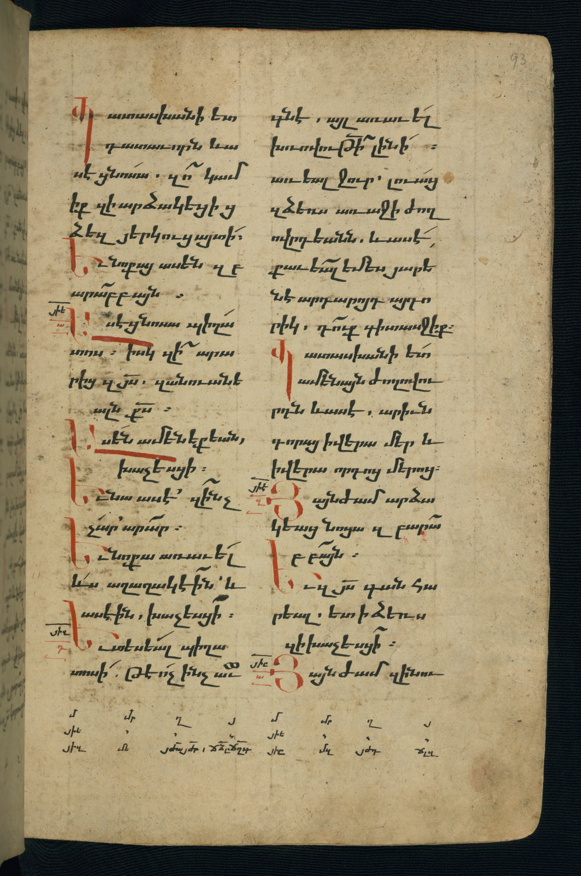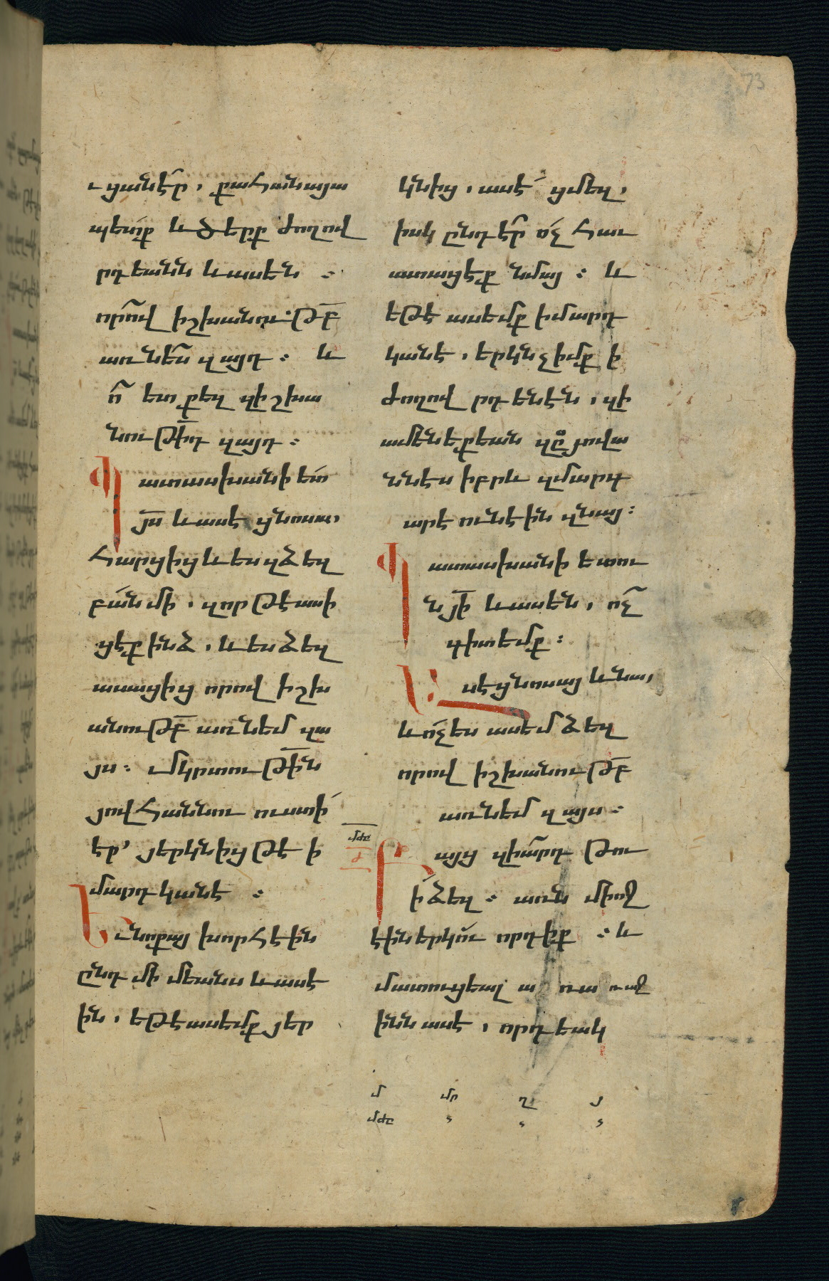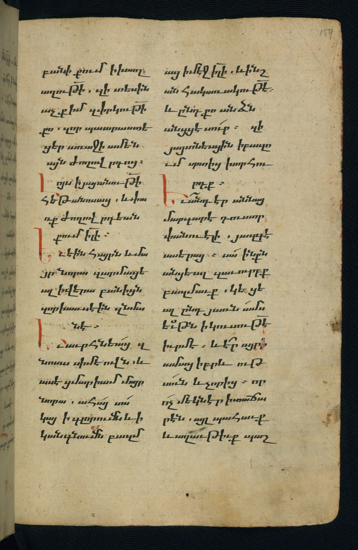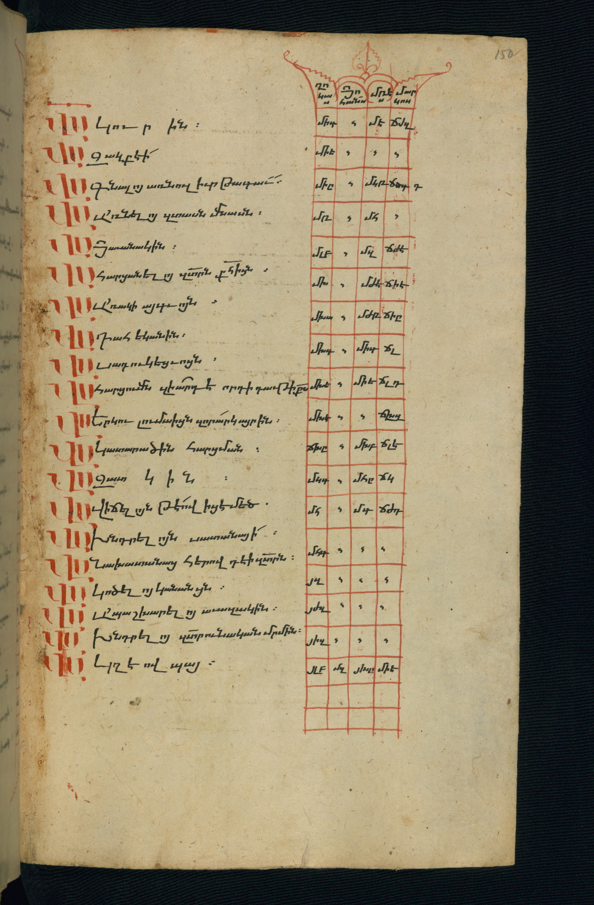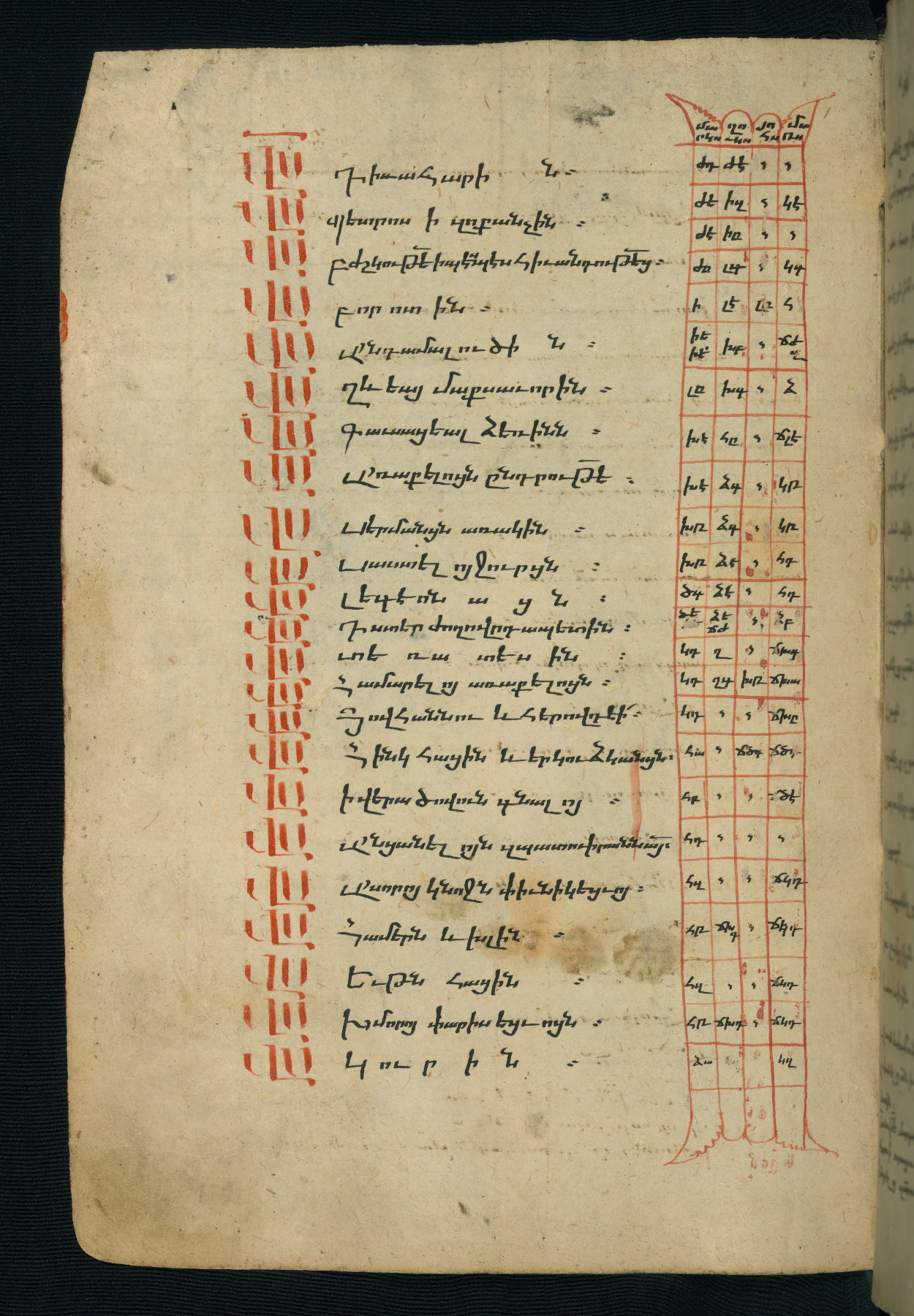 This Armenian Gospel book was produced in 904 of the Armenian era (1455 CE) at the monastery of Gamałiēl in Xizan by the scribe Yohannēs Vardapet, son of Vardan and Dilšat, and was illuminated by the priest Xačʿatur. The priest Pʿilipos commissioned the manuscript as a memorial to himself, his parents Łazar and Xutʿlumēlikʿ, and other relatives listed in the colophon on fols. 300r to 301v. Pʿilipos is depicted on fol. 14v alongside his brothers Yusēpʿ and Sultanša, as they kneel before the Virgin and Child enthroned (Theotokos). The book contains twenty-six full-page polychrome miniatures, including four Evangelist portraits; ornately designed canon tables; four decorated incipit pages; numerous marginal miniatures of floral and faunal motifs; and nineteen marginal miniatures of biblical characters or allusions to biblical narratives.