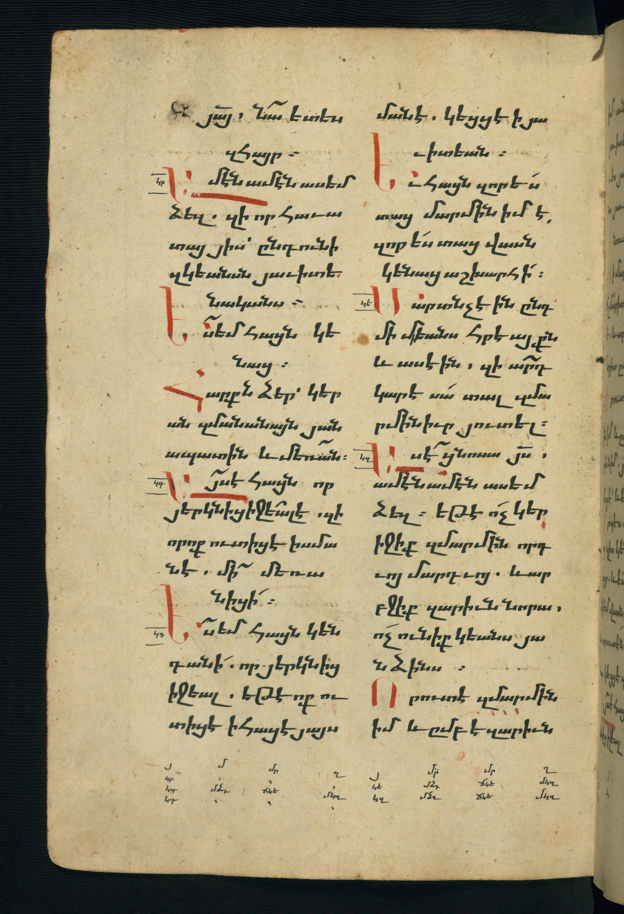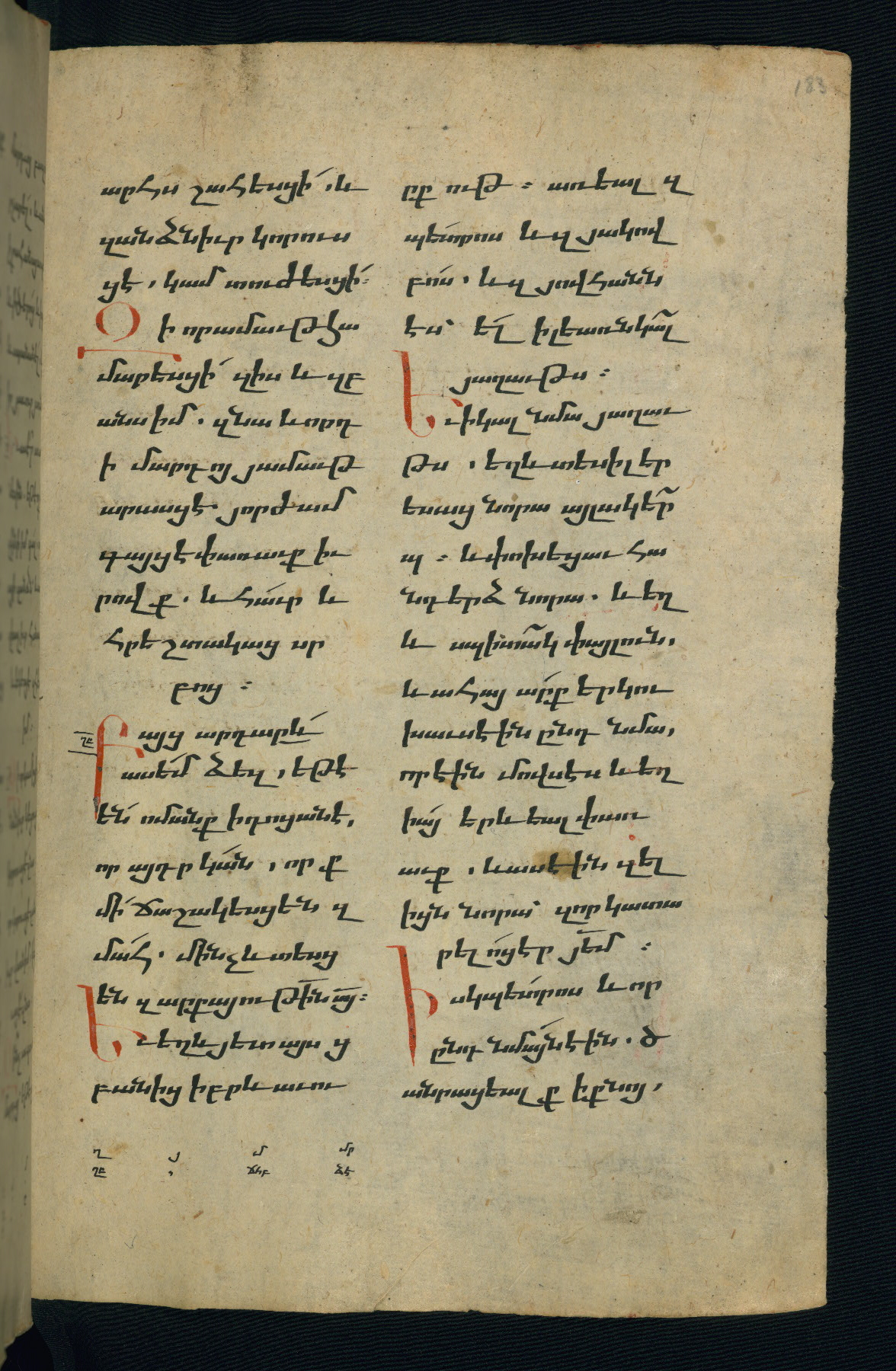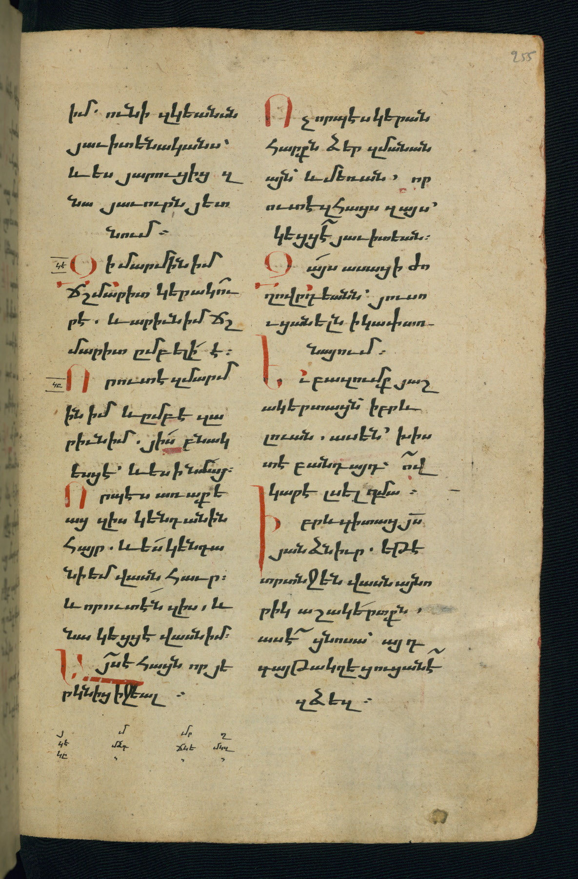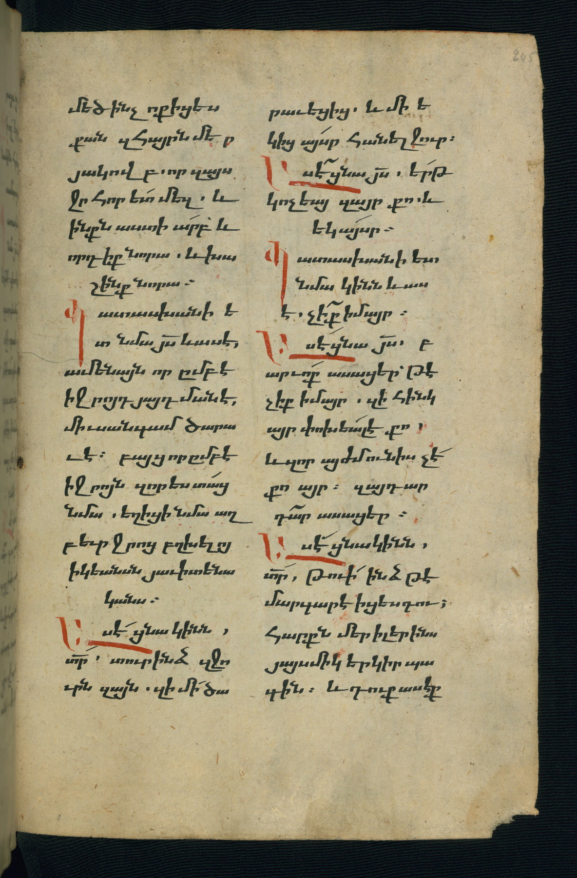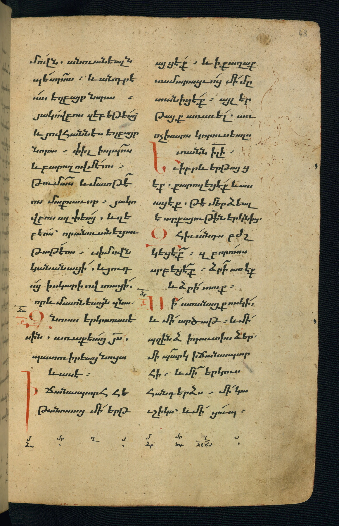This Armenian Gospel book was produced in 904 of the Armenian era (1455 CE) at the monastery of Gamałiēl in Xizan by the scribe Yohannēs Vardapet, son of Vardan and Dilšat, and was illuminated by the priest Xačʿatur. The priest Pʿilipos commissioned the manuscript as a memorial to himself, his parents Łazar and Xutʿlumēlikʿ, and other relatives listed in the colophon on fols. 300r to 301v. Pʿilipos is depicted on fol. 14v alongside his brothers Yusēpʿ and Sultanša, as they kneel before the Virgin and Child enthroned (Theotokos). The book contains twenty-six full-page polychrome miniatures, including four Evangelist portraits; ornately designed canon tables; four decorated incipit pages; numerous marginal miniatures of floral and faunal motifs; and nineteen marginal miniatures of biblical characters or allusions to biblical narratives.