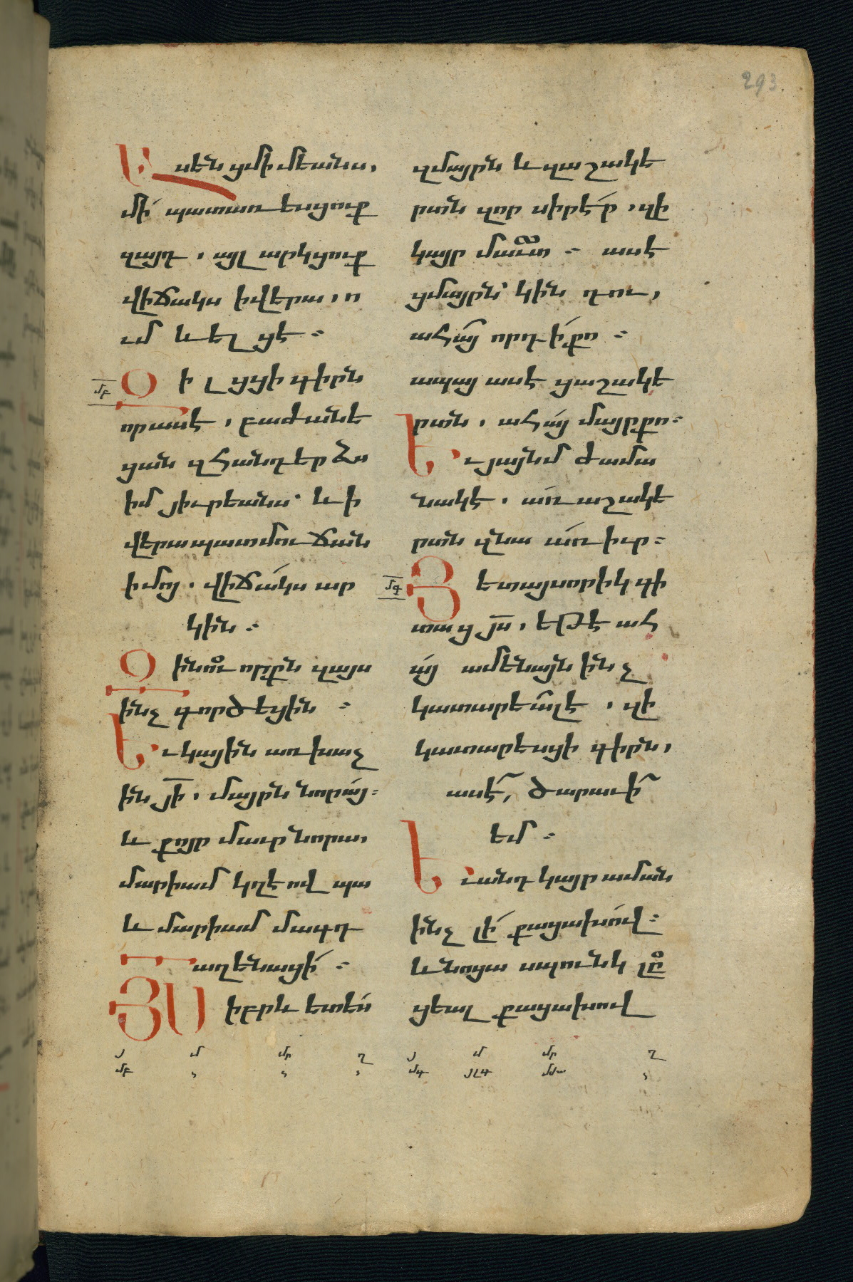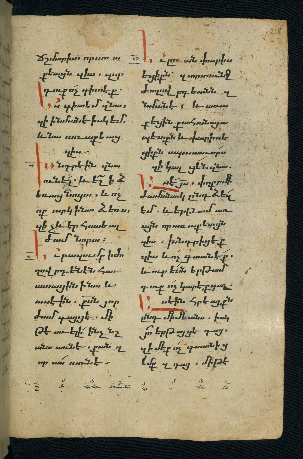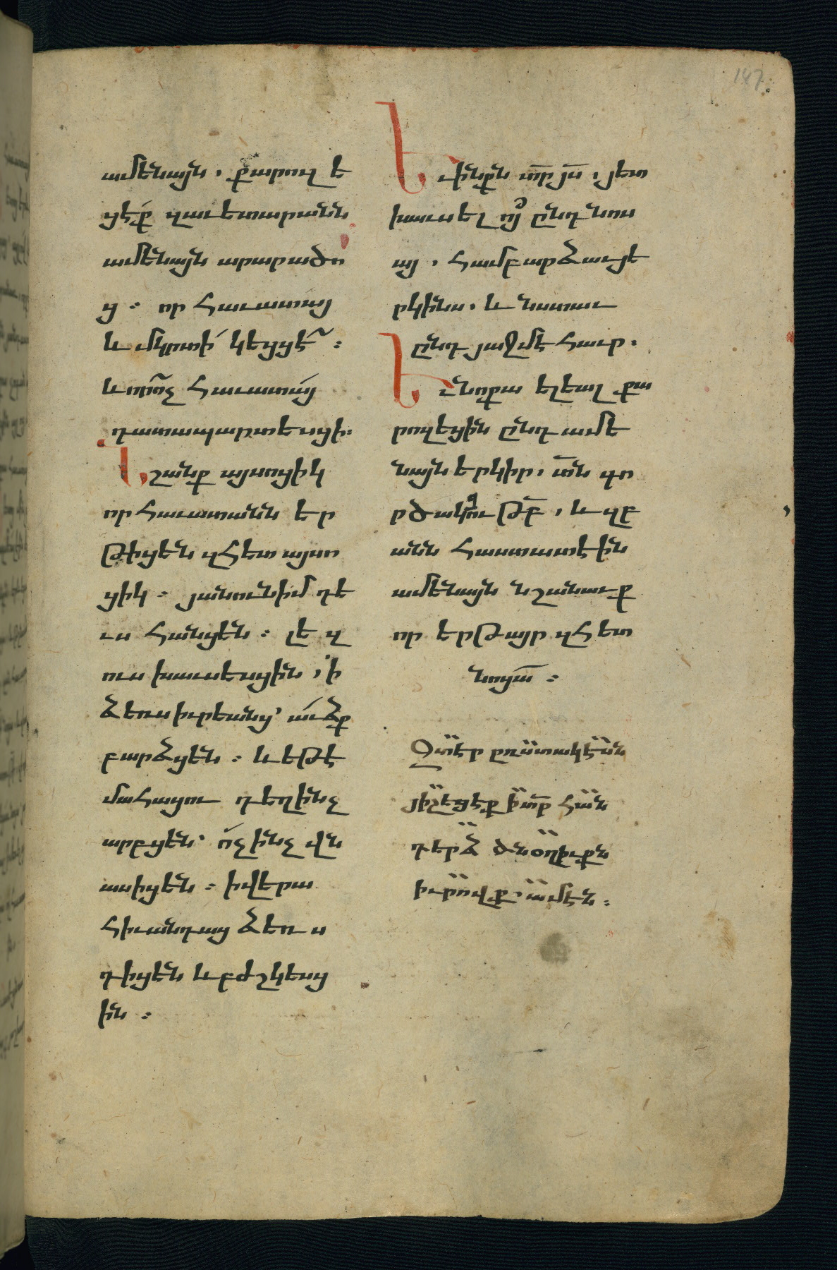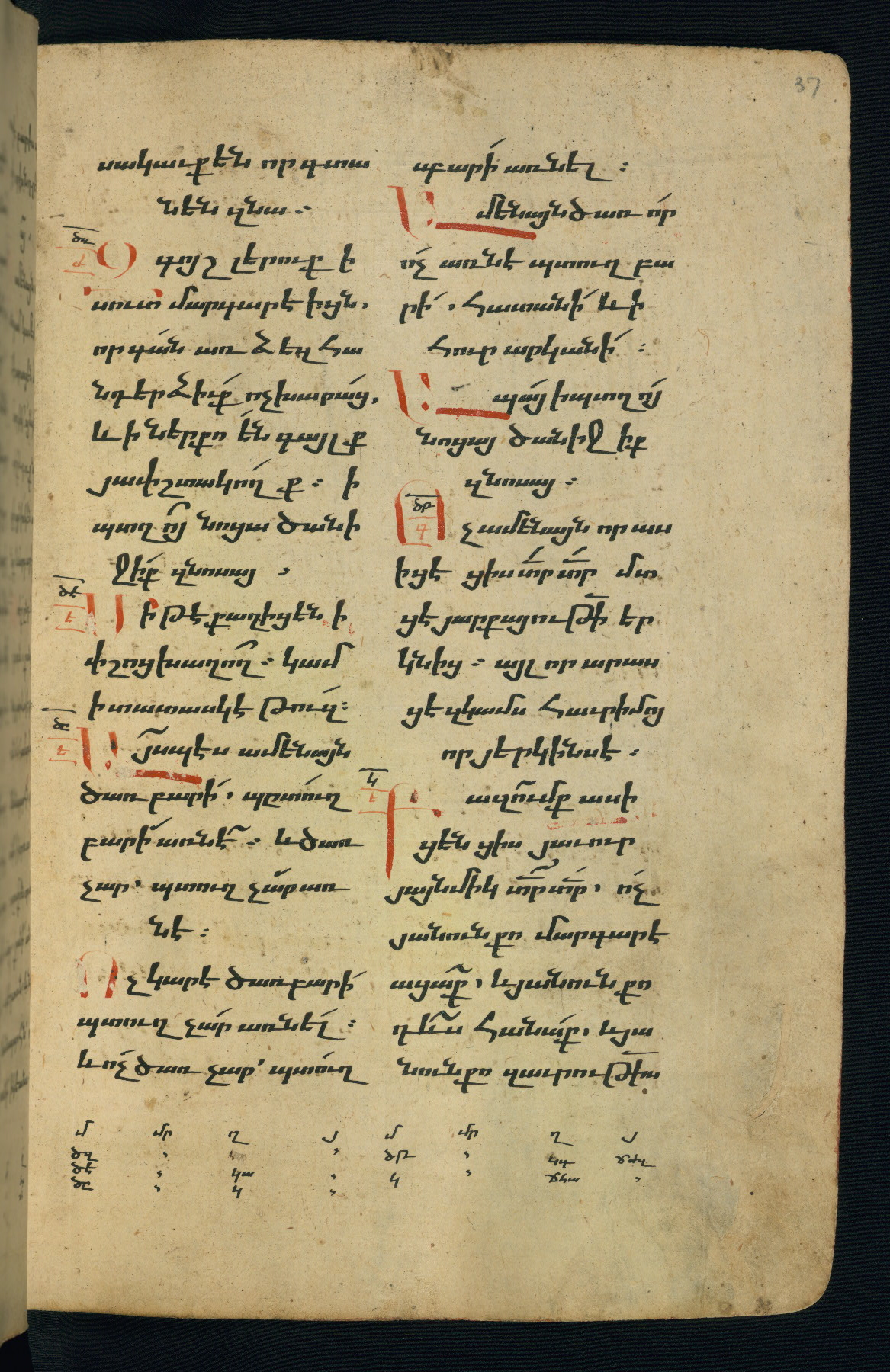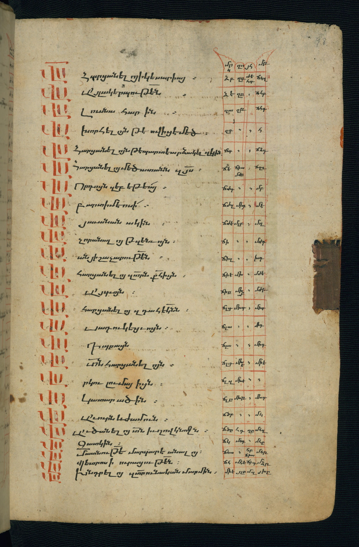 This Armenian Gospel book was produced in 904 of the Armenian era (1455 CE) at the monastery of Gamałiēl in Xizan by the scribe Yohannēs Vardapet, son of Vardan and Dilšat, and was illuminated by the priest Xačʿatur. The priest Pʿilipos commissioned the manuscript as a memorial to himself, his parents Łazar and Xutʿlumēlikʿ, and other relatives listed in the colophon on fols. 300r to 301v. Pʿilipos is depicted on fol. 14v alongside his brothers Yusēpʿ and Sultanša, as they kneel before the Virgin and Child enthroned (Theotokos). The book contains twenty-six full-page polychrome miniatures, including four Evangelist portraits; ornately designed canon tables; four decorated incipit pages; numerous marginal miniatures of floral and faunal motifs; and nineteen marginal miniatures of biblical characters or allusions to biblical narratives.