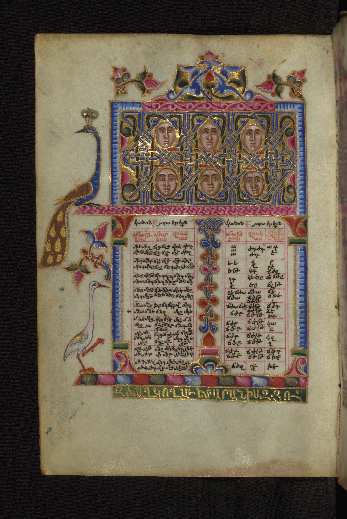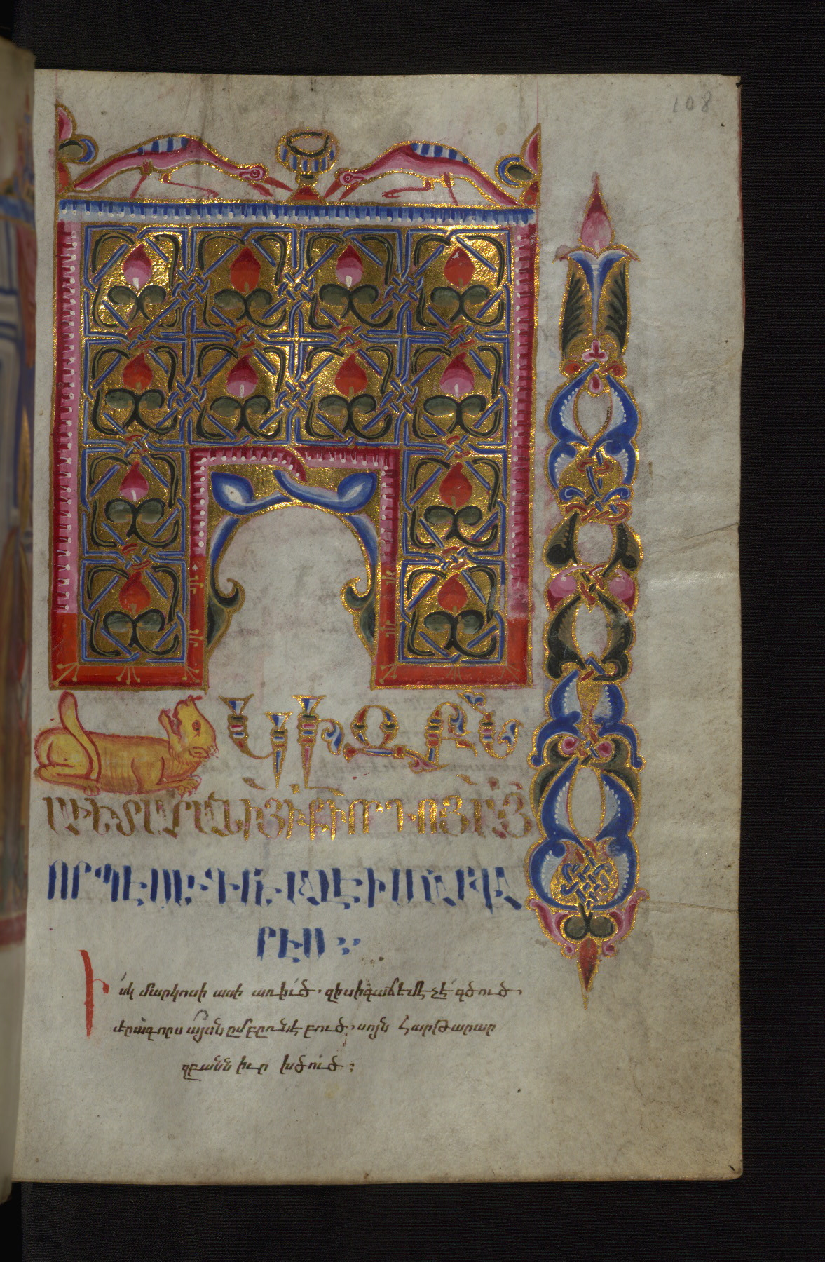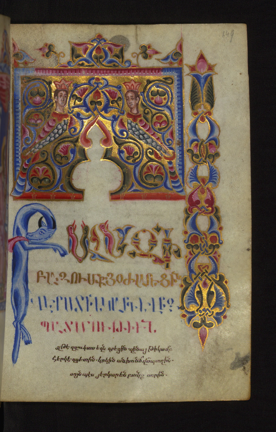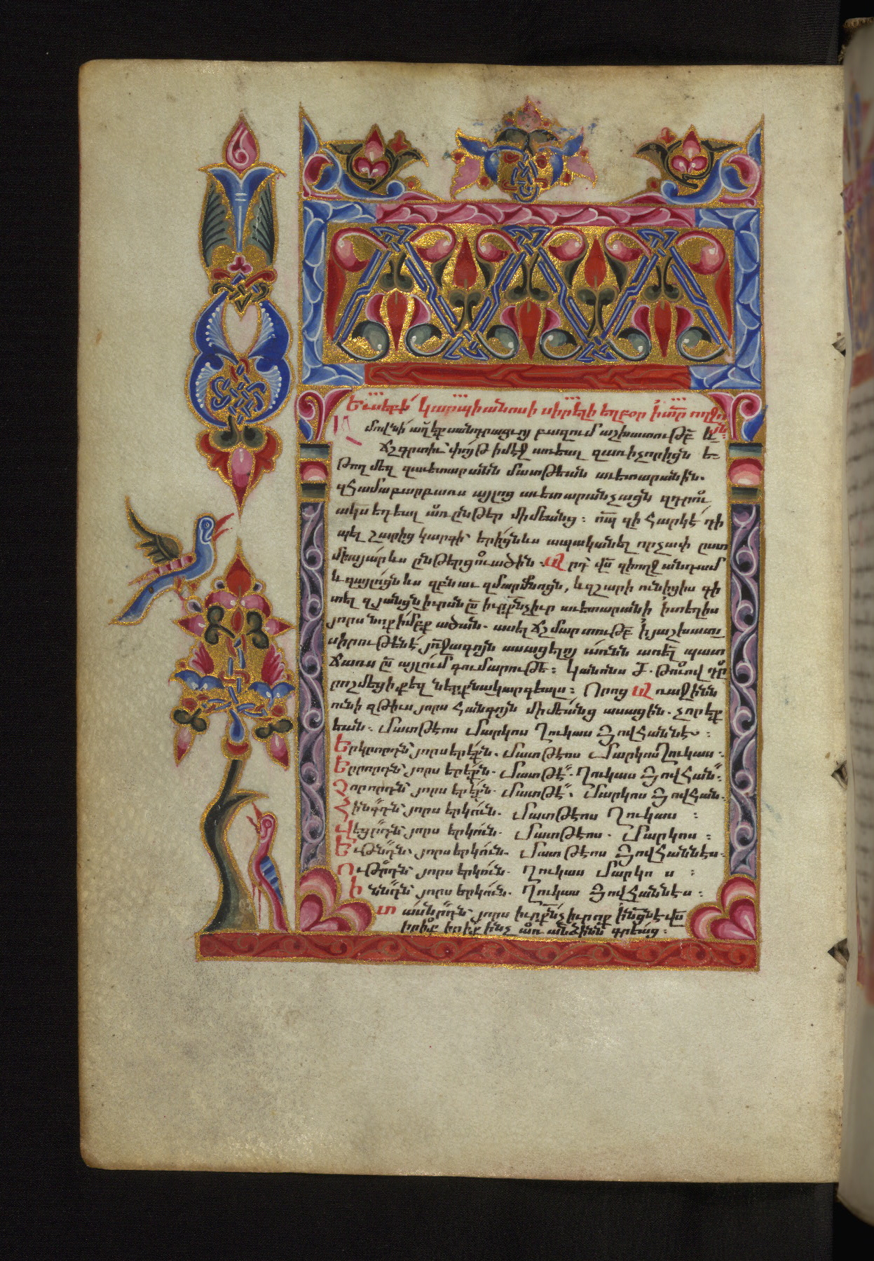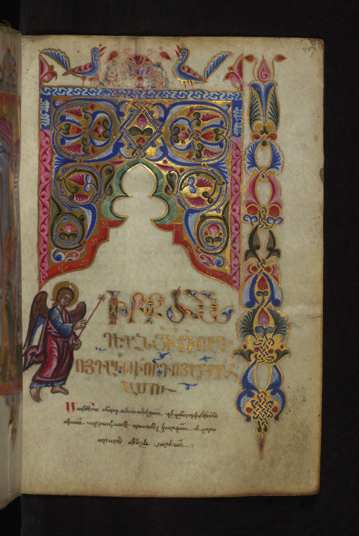 - Decoration note: Evangelist portraits fols. 36v, 107v, 148v, 218v; the opening page of each Gospel has a large headpiece with floral ornaments, birds, and sirens, accompanied by an arabesque; the initial of each opening line represents the symbol of the Evangelist: an angel for Matthew, a lion for Mark, an ox for Luke, and an eagle for John; the first line of Matthew is written in bird letters and ornate capitals, followed by three lines in gold erkat'agir; the first line of Mark is in ornate capitals; the second in gold, and the third and fourth in blue erkat'agir; the first line of Luke is formed by birds and ornate capitals; the remaining three lines are written in erkat'agir in gold, blue, and red ink respectively; the opening line of John is in ornate capitals; the following three lines in erkat'agir in gold, blue, and red colors; the last line in red bolorgir