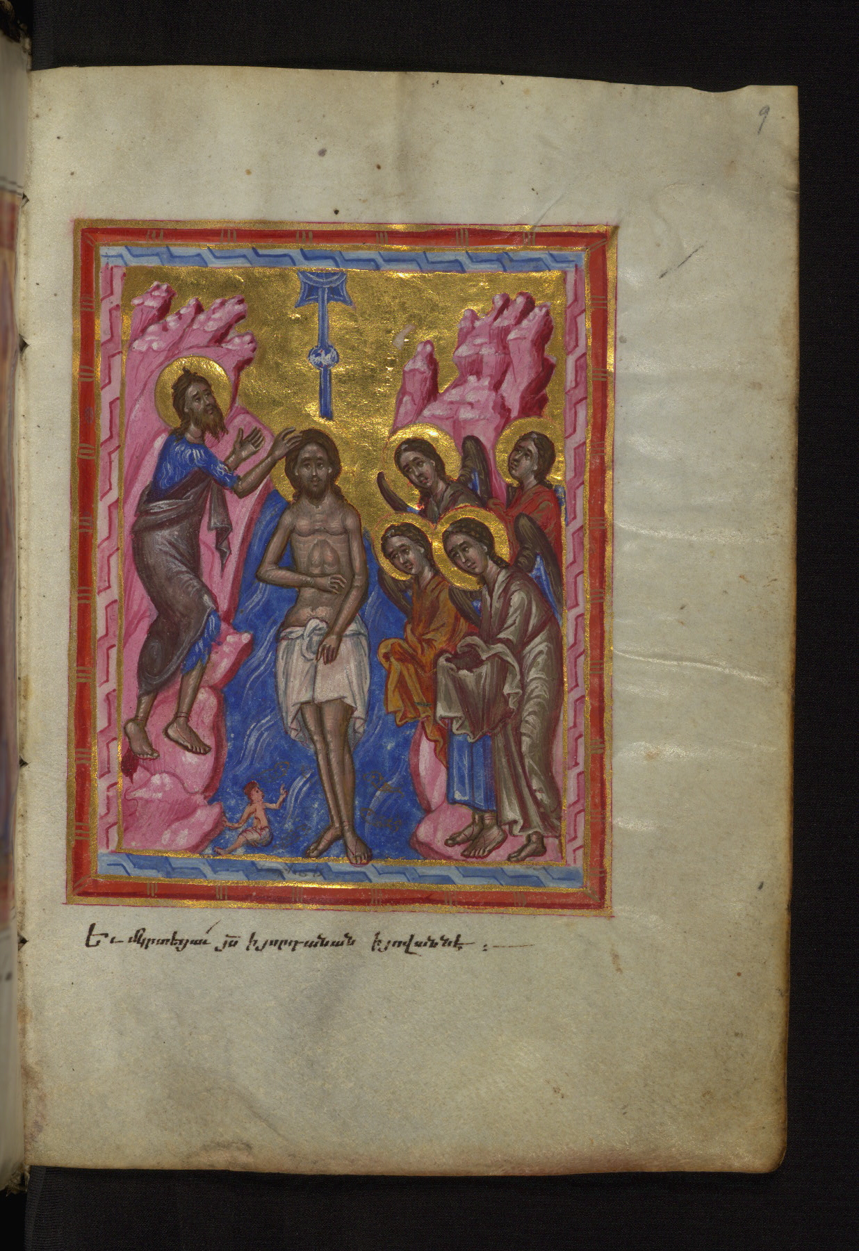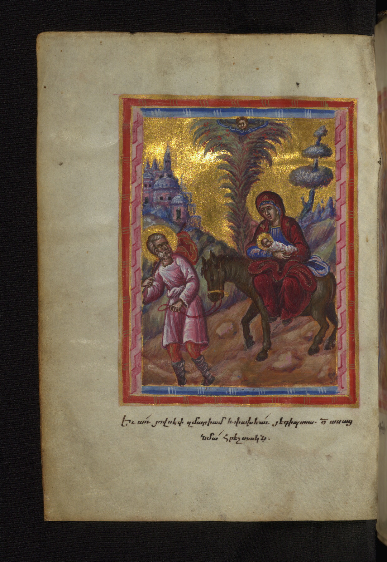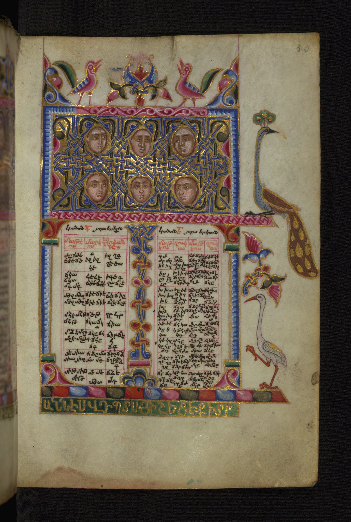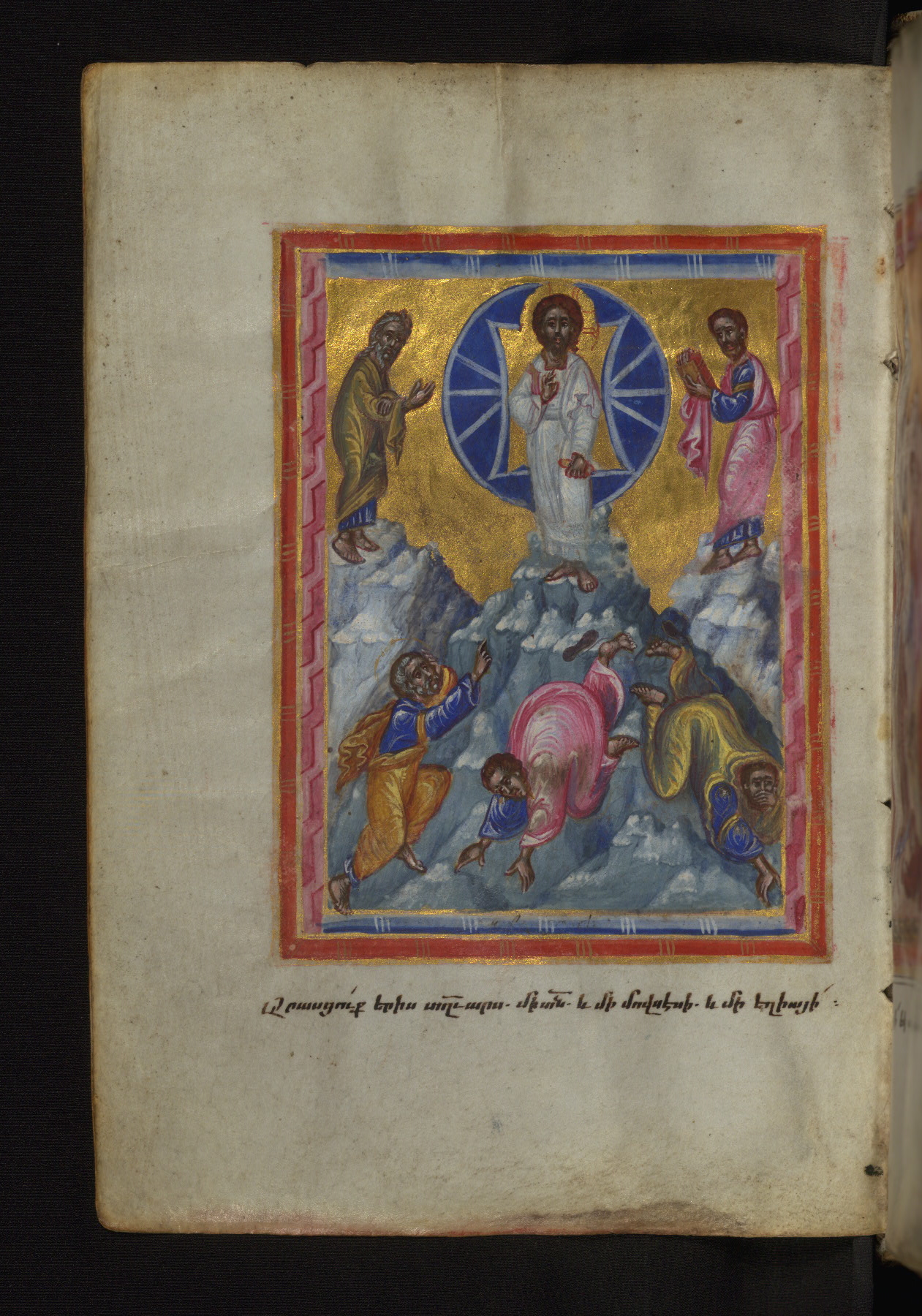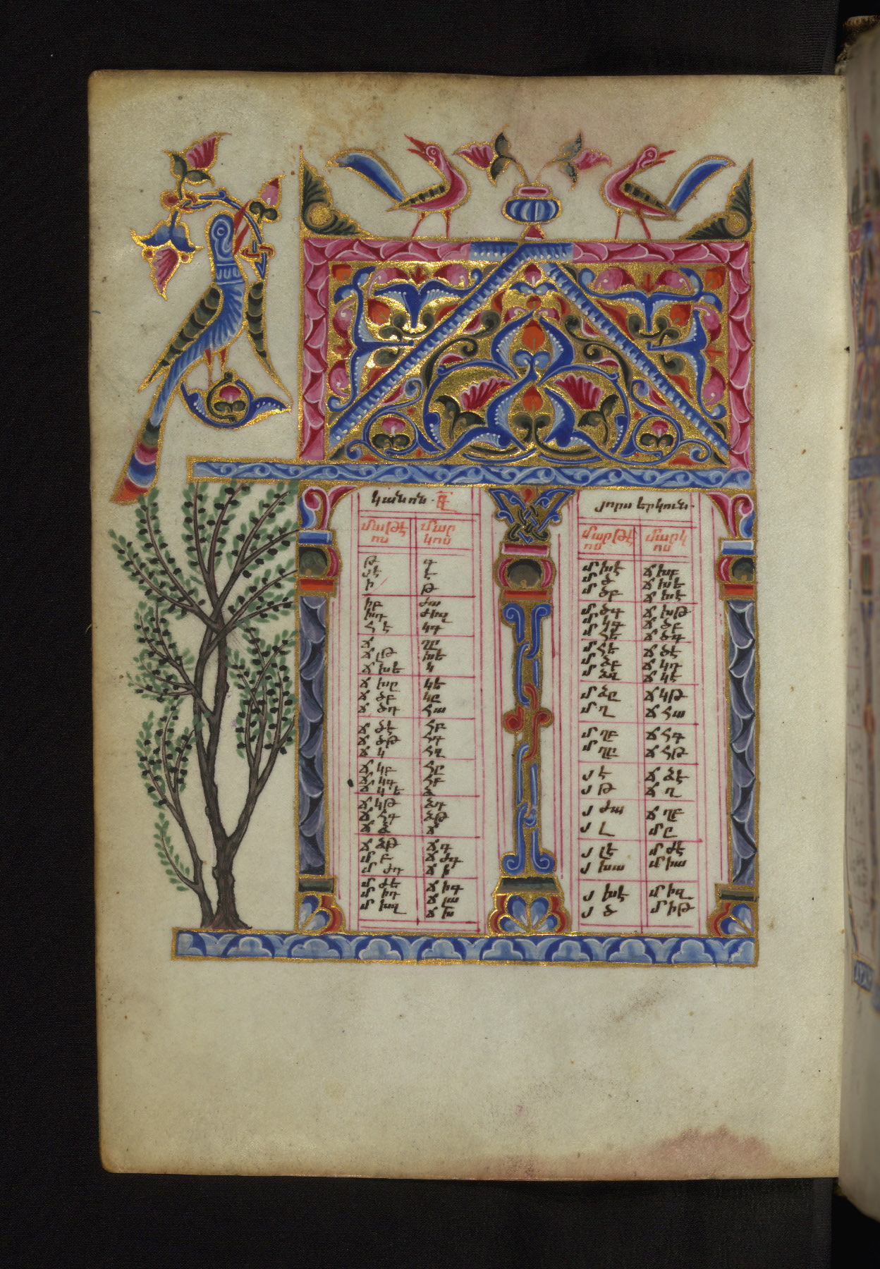 - Decoration note: Evangelist portraits fols. 36v, 107v, 148v, 218v; the opening page of each Gospel has a large headpiece with floral ornaments, birds, and sirens, accompanied by an arabesque; the initial of each opening line represents the symbol of the Evangelist: an angel for Matthew, a lion for Mark, an ox for Luke, and an eagle for John; the first line of Matthew is written in bird letters and ornate capitals, followed by three lines in gold erkat'agir; the first line of Mark is in ornate capitals; the second in gold, and the third and fourth in blue erkat'agir; the first line of Luke is formed by birds and ornate capitals; the remaining three lines are written in erkat'agir in gold, blue, and red ink respectively; the opening line of John is in ornate capitals; the following three lines in erkat'agir in gold, blue, and red colors; the last line in red bolorgir