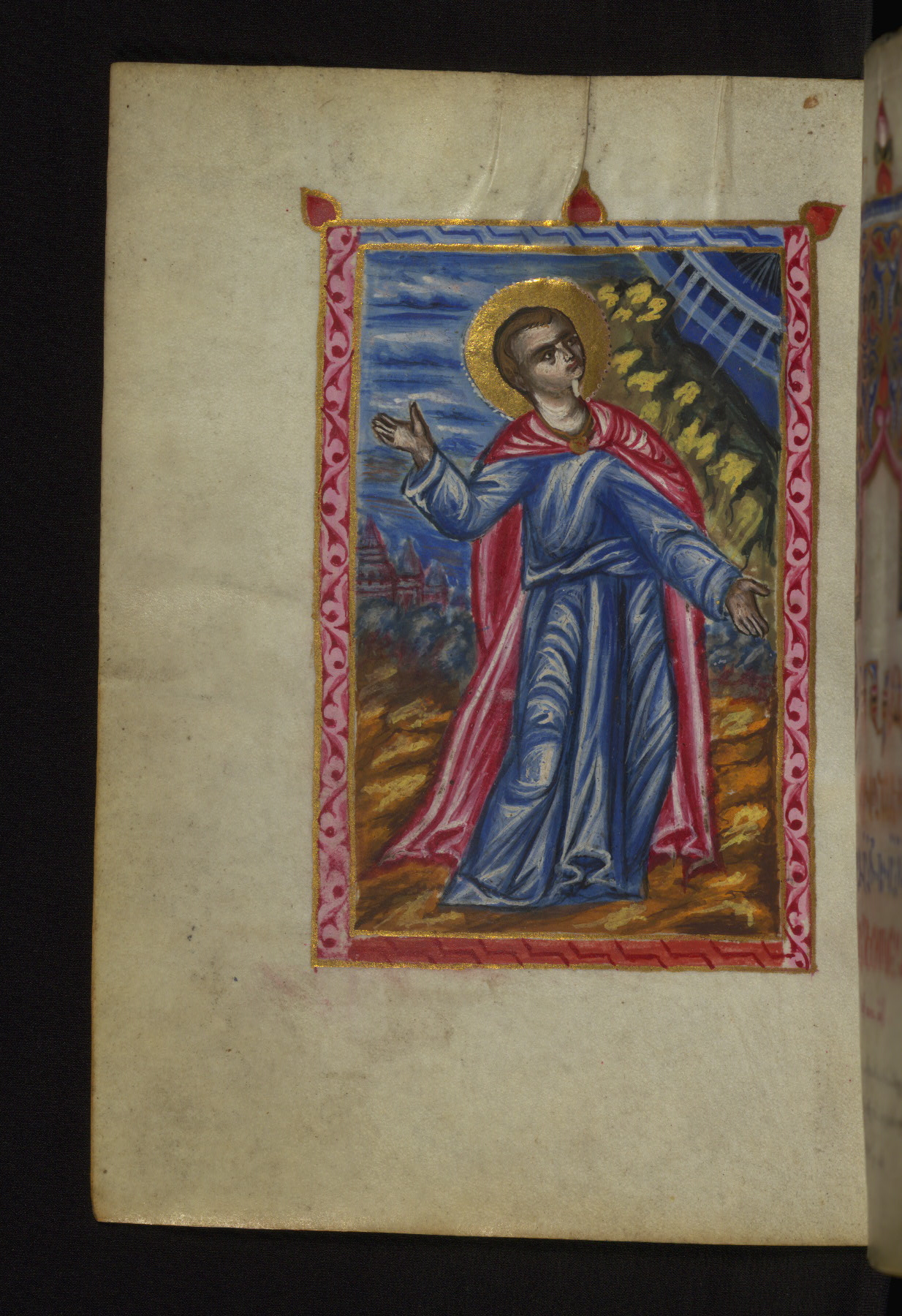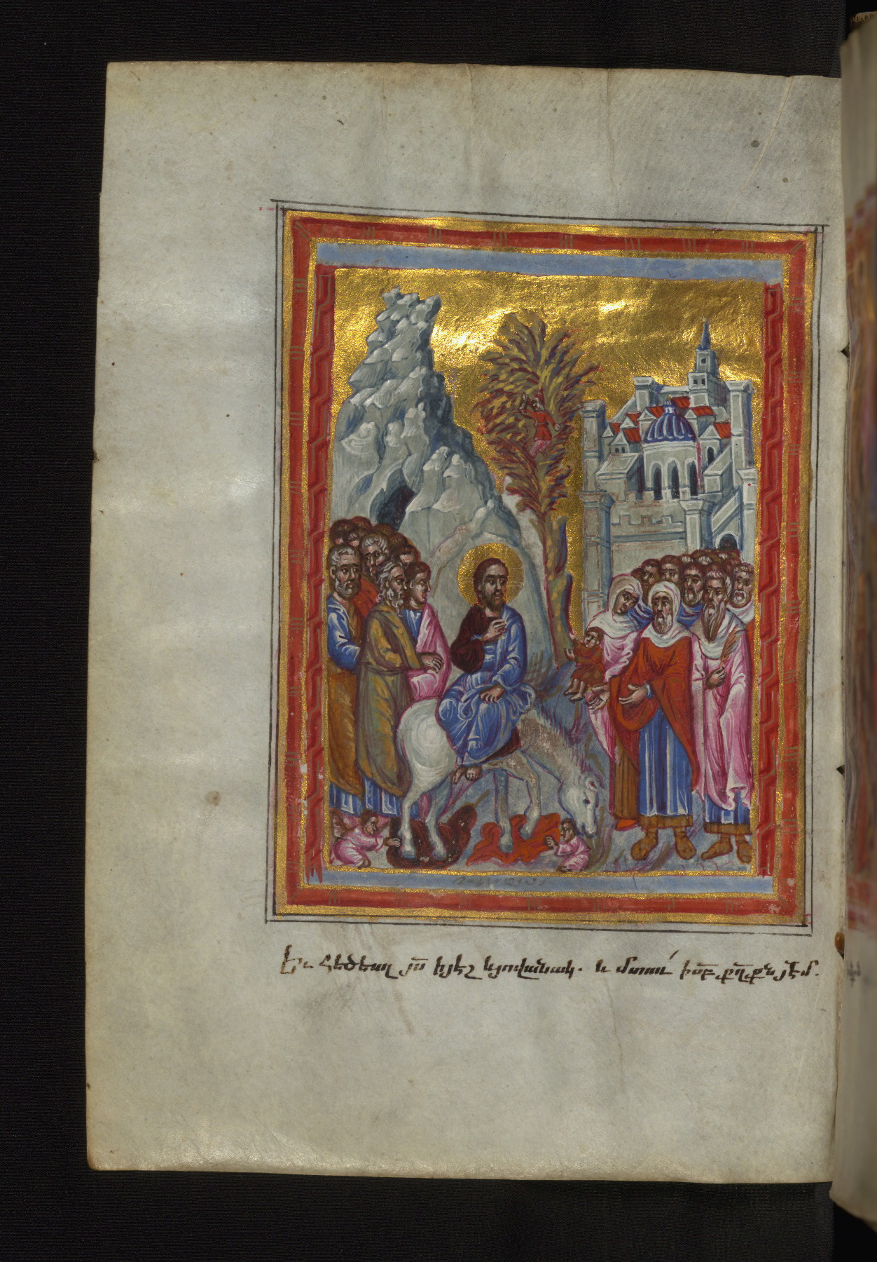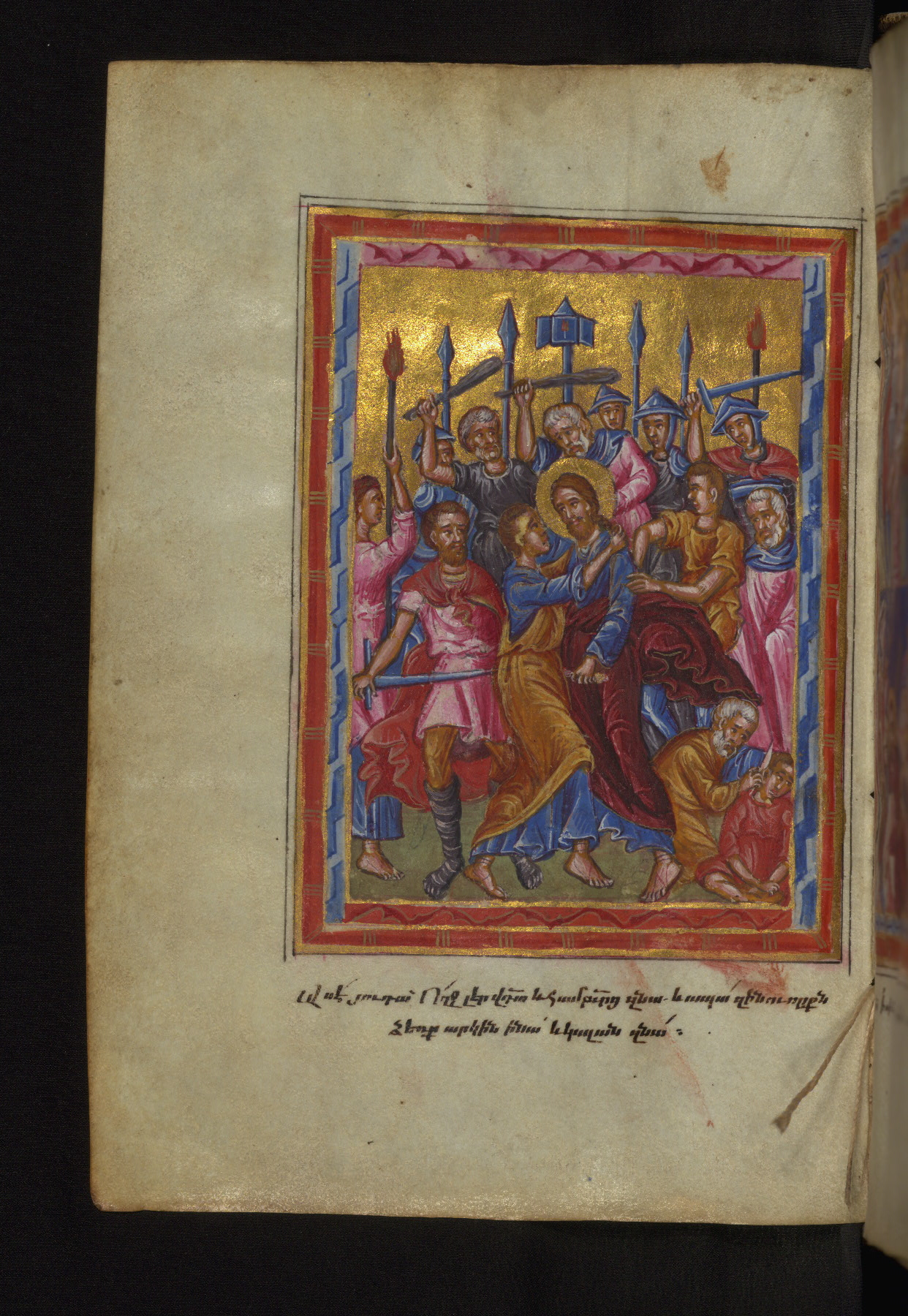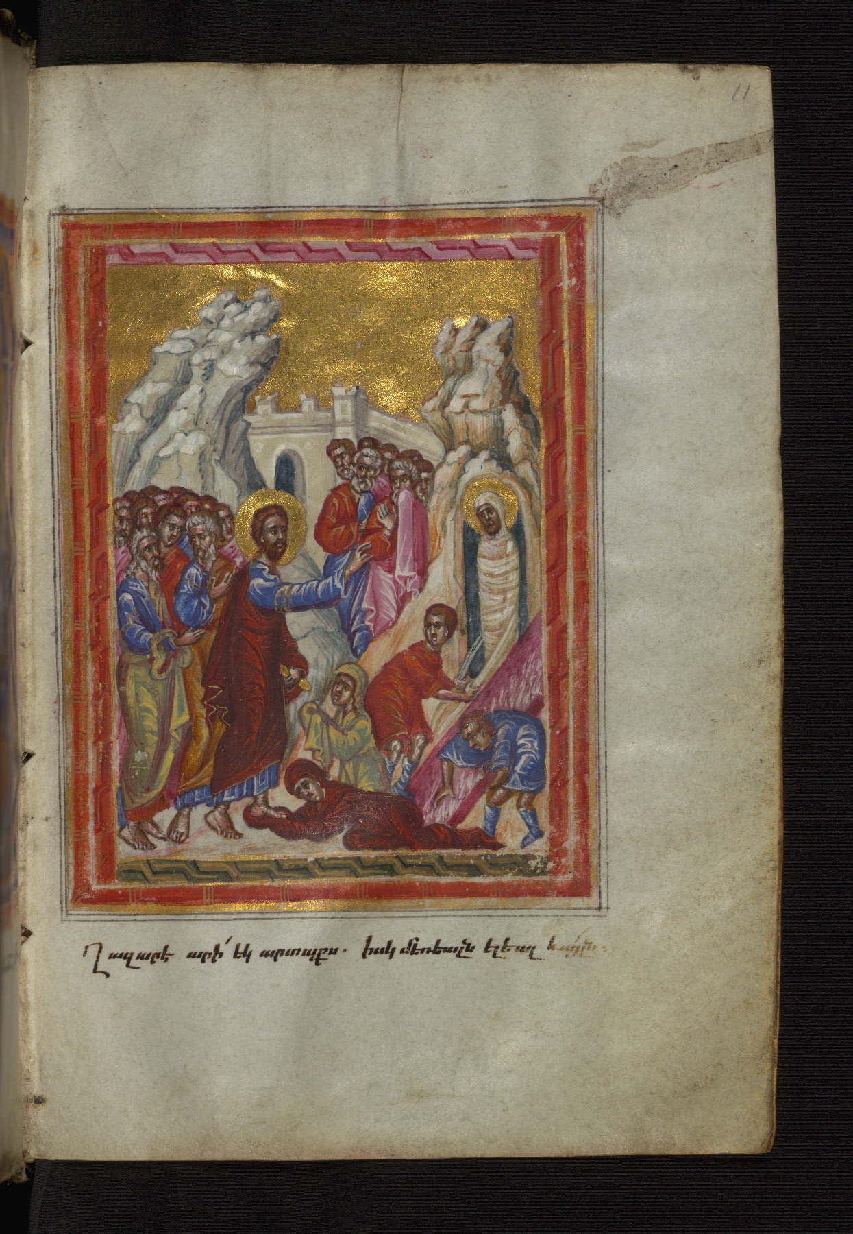 This manuscript was created in the seventeenth century, perhaps in Constantinople, based on the style of its illumination. The Gospel cycle that precedes the text contains slightly more miniatures than is traditional; especially notable are the two—representing the feeding of the five thousand and the cleansing of the Temple—which come out of sequence at the end of the cycle. The miniatures in this manuscript, like many at this time, reflect the mingling of traditional Cilician and Western influences. Though the manuscript does not include a colophon, the signature of the painter, Hohannes, is visible on the bottom of the canon tables on fols. 29v-30r. This manuscript appears to have been well traveled: at some point, very small inscriptions in Greek were added to most of the miniatures; in 1883, it belonged to Georg Alexief of Moscow, according to a note in Russian on fol. 1r.