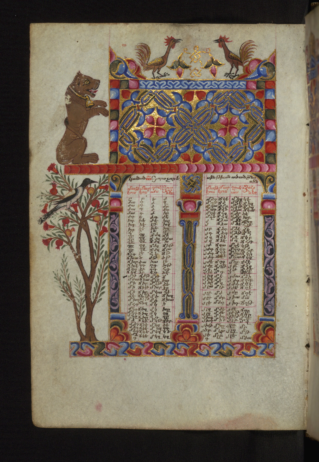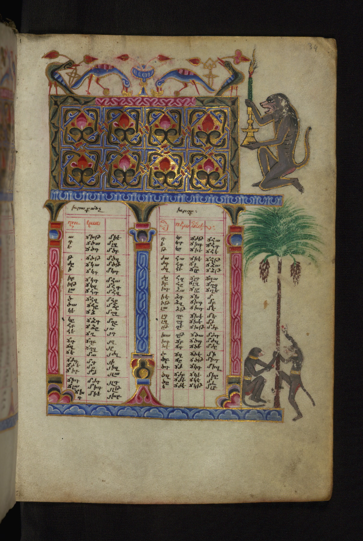- Decoration note: Frames illuminated with ornaments and interlace, flanked by trees, birds, animals, and monkey drolleries