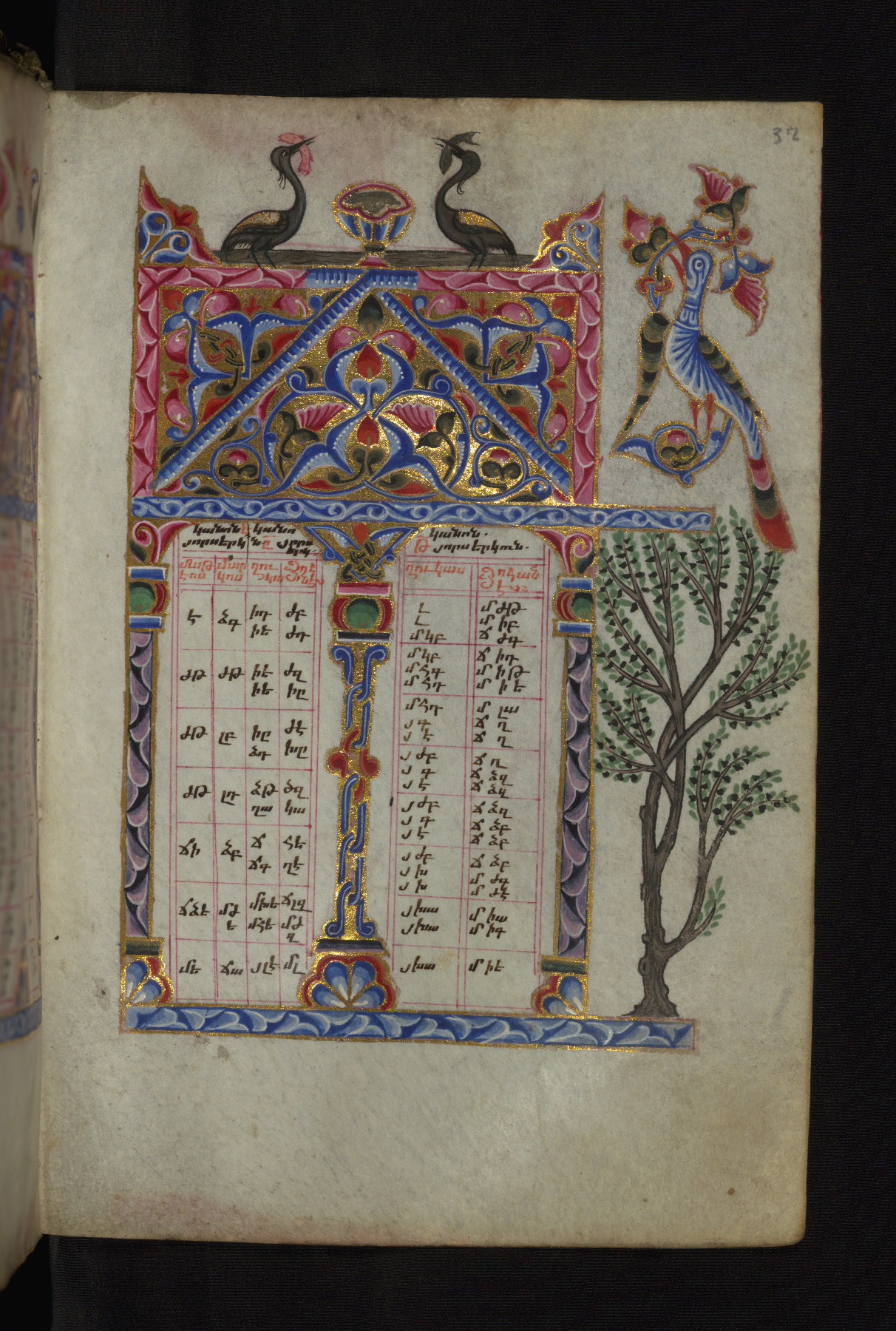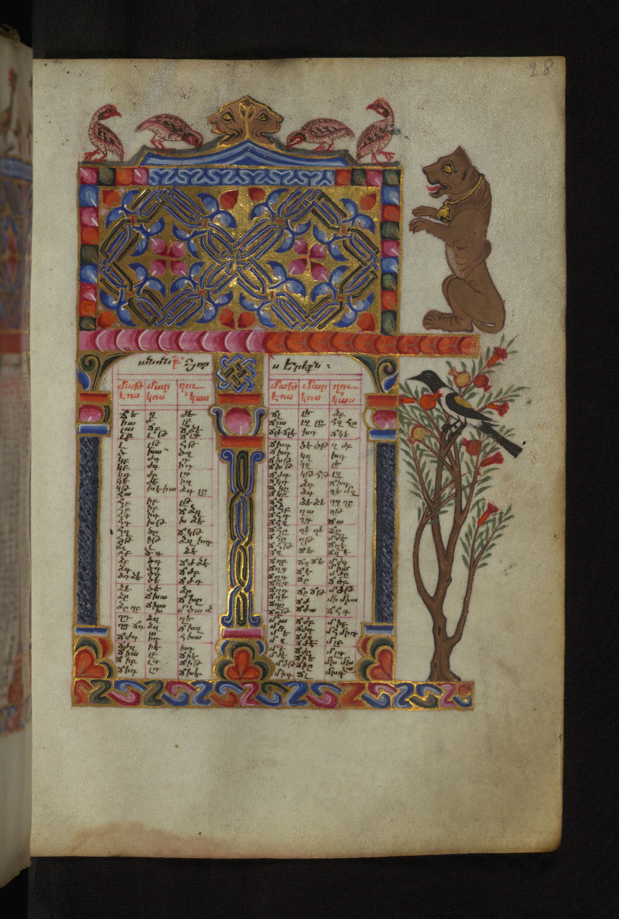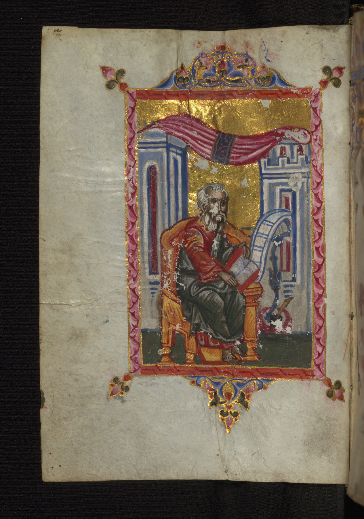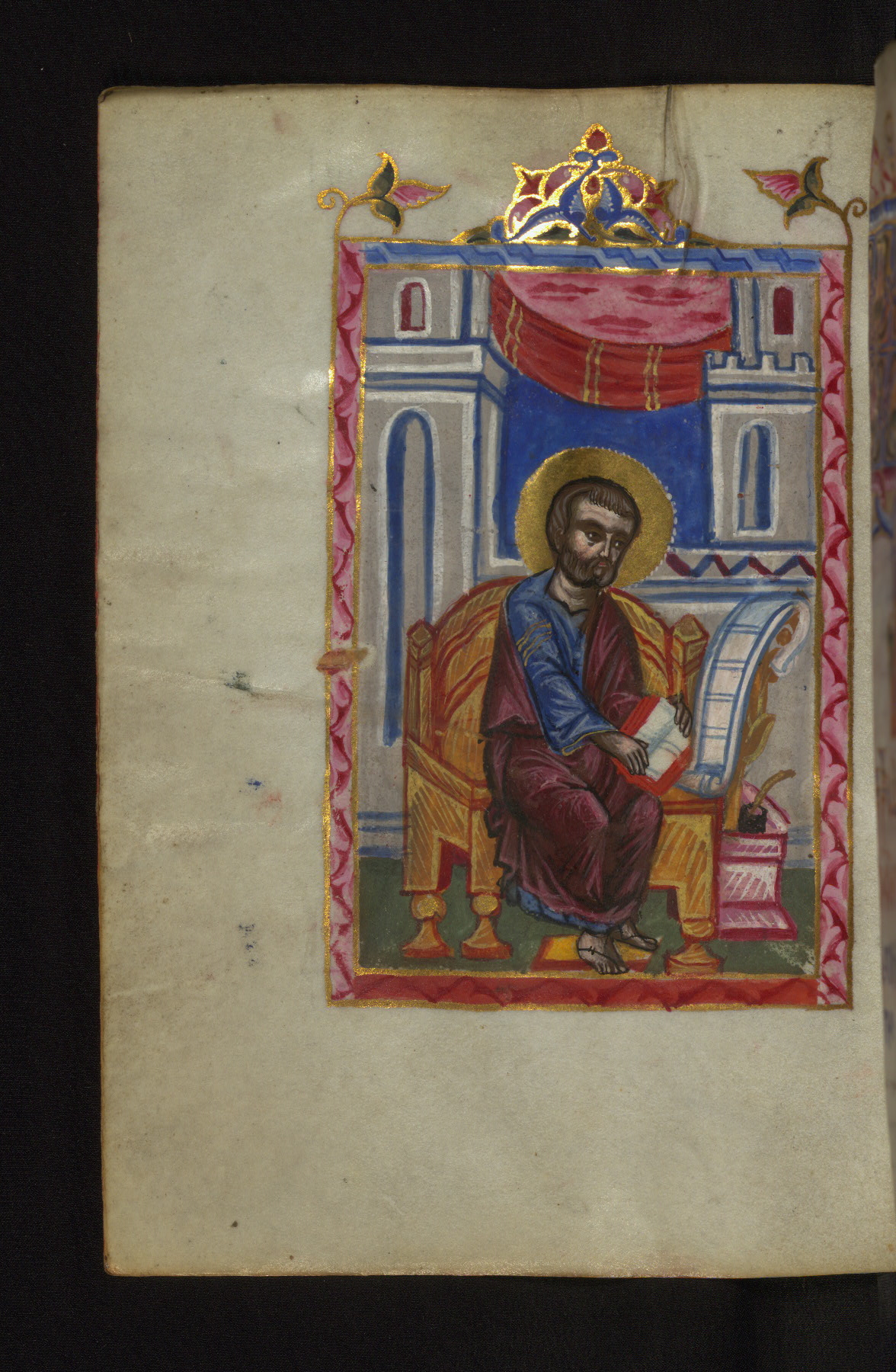 - Decoration note: Twenty full-page illuminations at the beginning of the manuscript, fols. 4v-23r, preceding the Letter of Eusebius and the canon tables; full-page Evangelist portraits facing headpieces with Evangelist symbol opening the text; Letter of Eusebius and Canon Tables are framed by architectural decoration in gold, red, pink, blue, and green pigment with floral and zoomorphic motifs; marginal ornaments throughout the manuscripts consist of floral designs, palmettes, medallions, birds, trees, temples, and crosses; they usually indicate the beginning of the Gospel lessons; there are two Canon Tables on fols. 1v and 2r drawn in outline only, without the concordance numbers filled in, which probably did not belong to the original manuscript