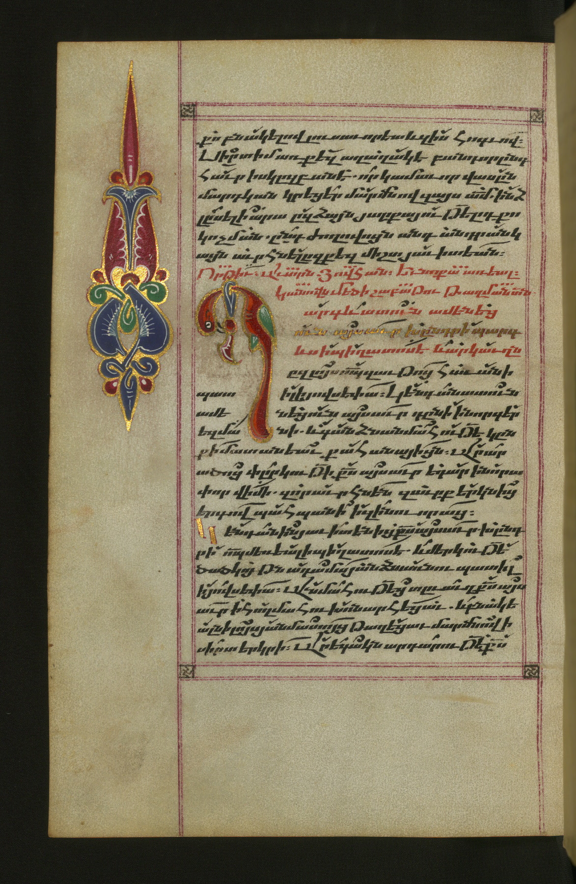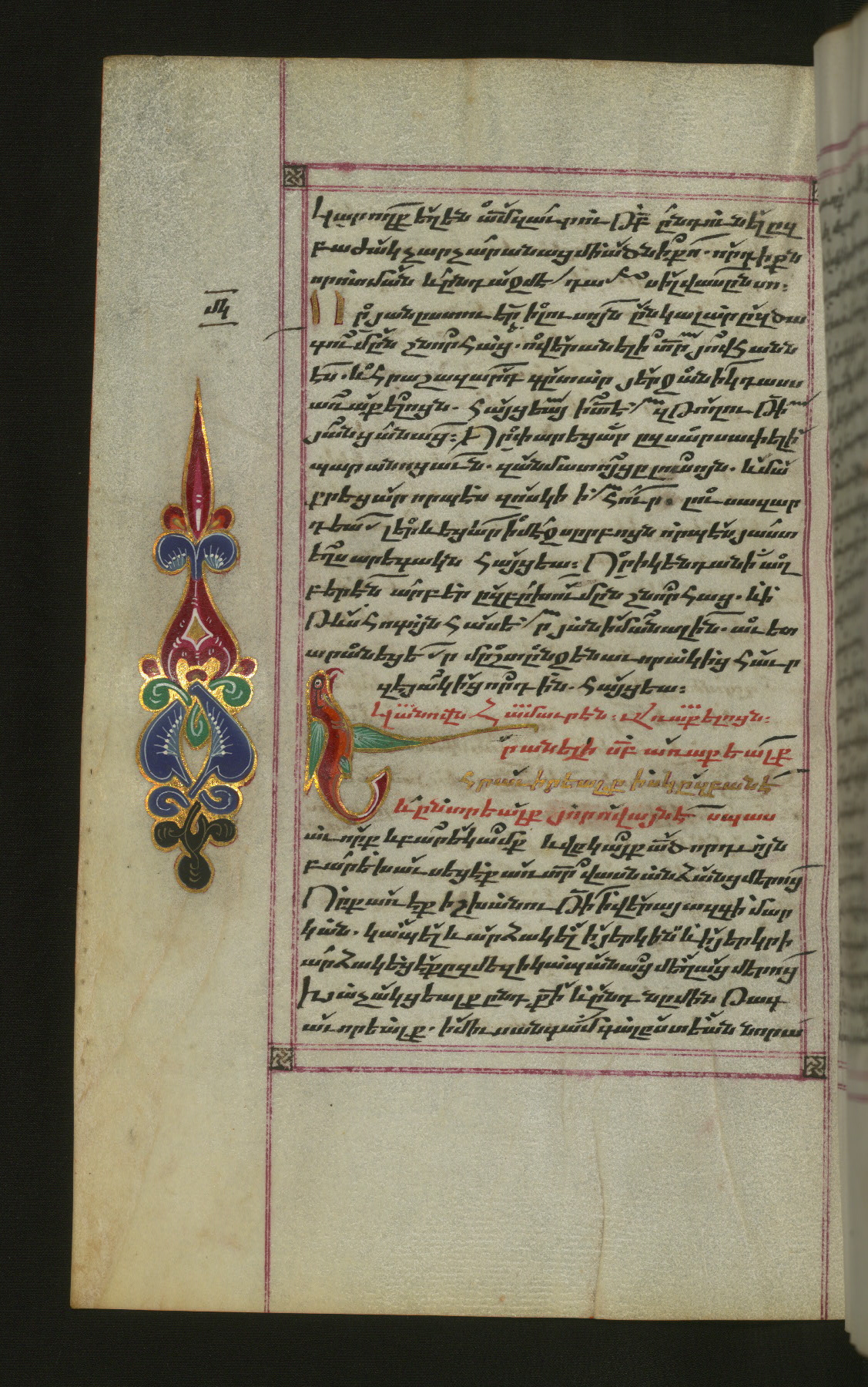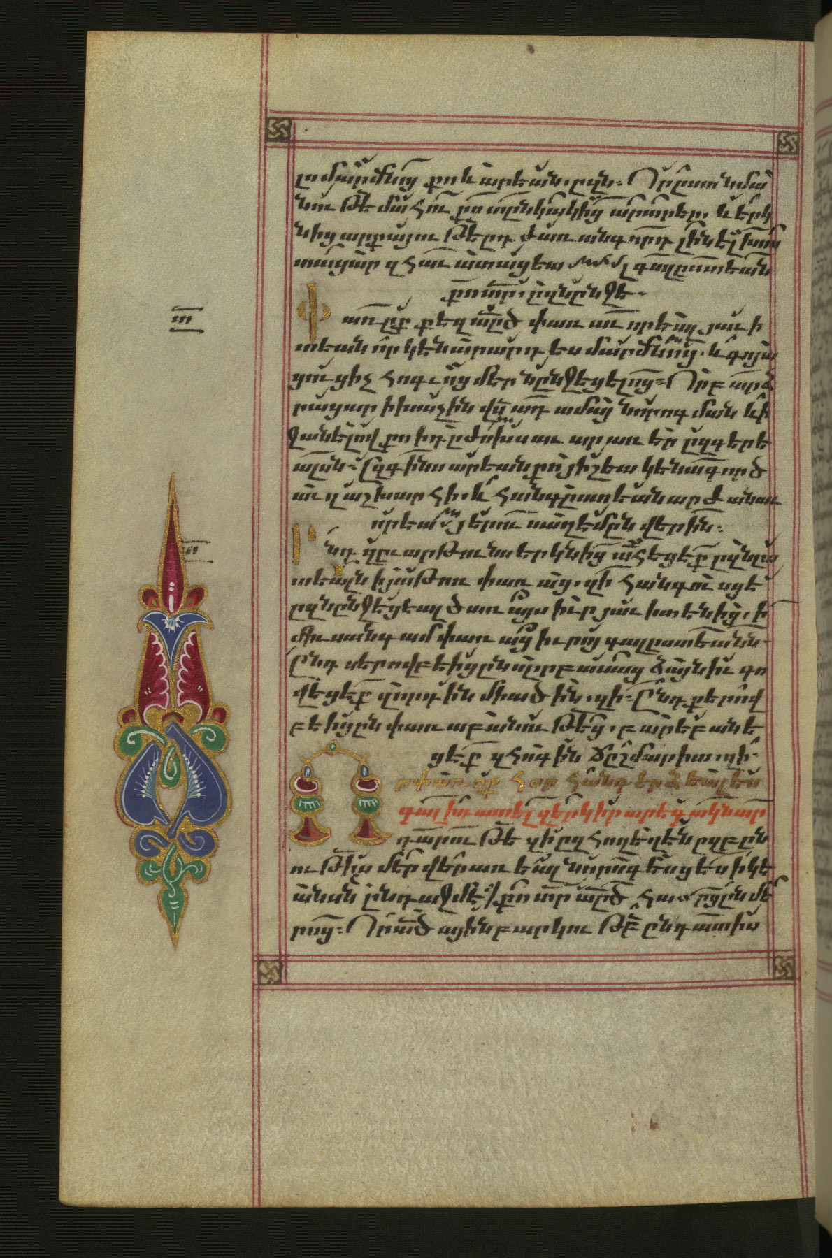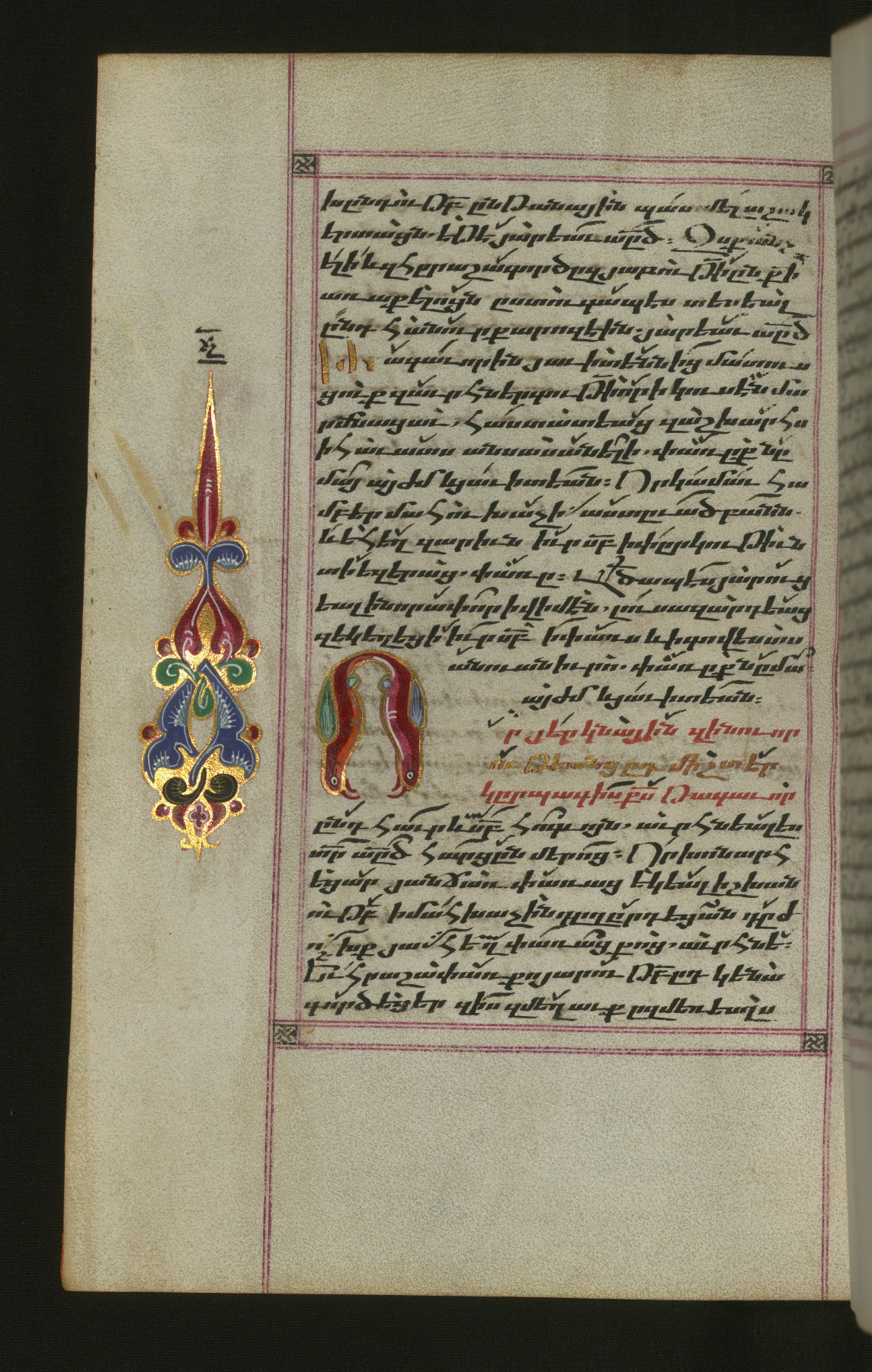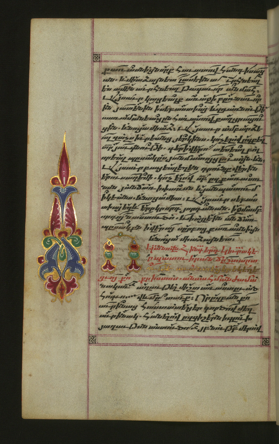 This hymnal was completed in Constantinople on August 15, 1678 [AE 1127], by the priest Yakob Pēligratc‘i, having been commissioned by Člav, son of Nawasard, as a dedication to his sons, Astuacatur and Sahak. The structure of the hymns adheres approximately to the standard Armenian hymnal (Շաբակնոց), with minor variations in order and a few substitutions (see Sanjian in the bibliography). The book is illuminated extensively, with thirty-eight full- and half-page polychrome miniatures against gold backgrounds, eight decorated head-pieces marking the principal divisions of the hymnal, and numerous marginal miniatures marking individual hymns, including biblical figures, saints, bishops, and vignettes. The style of the miniatures is largely in imitation of western European models, though more traditional Armenian and Byzantine influences stand out, such as the vibrant color palette, an iconic frontality for depictions of saints and bishops, and the highly abstracted floral motifs and zoomorphic incipits marking hymn divisions.