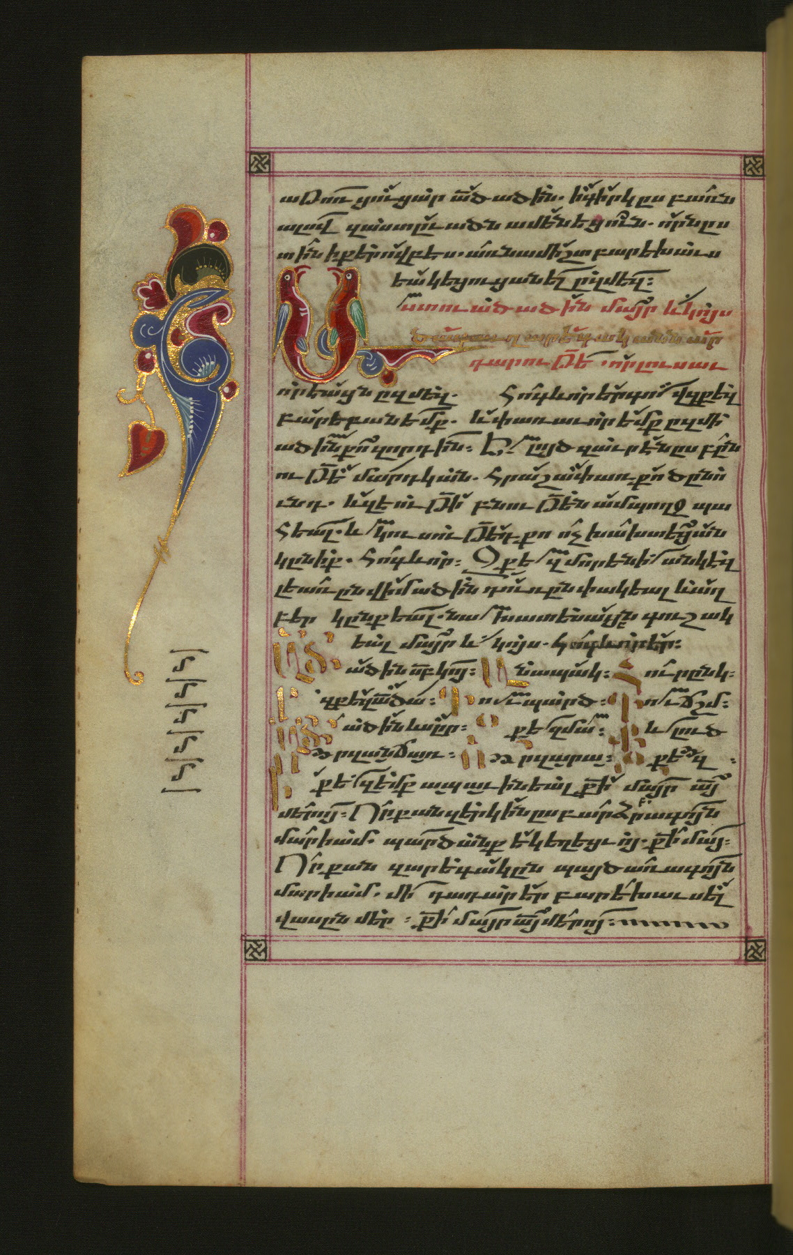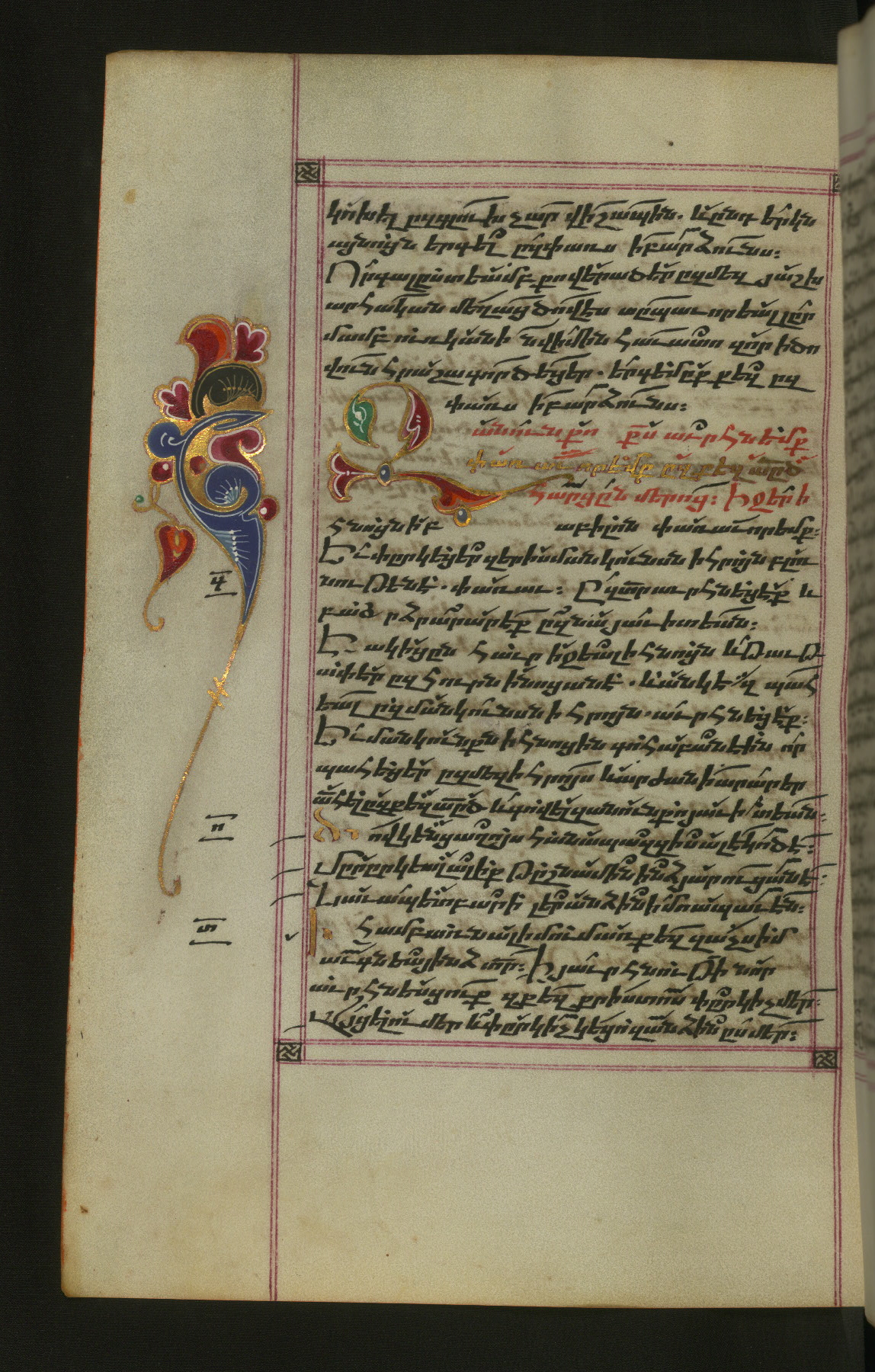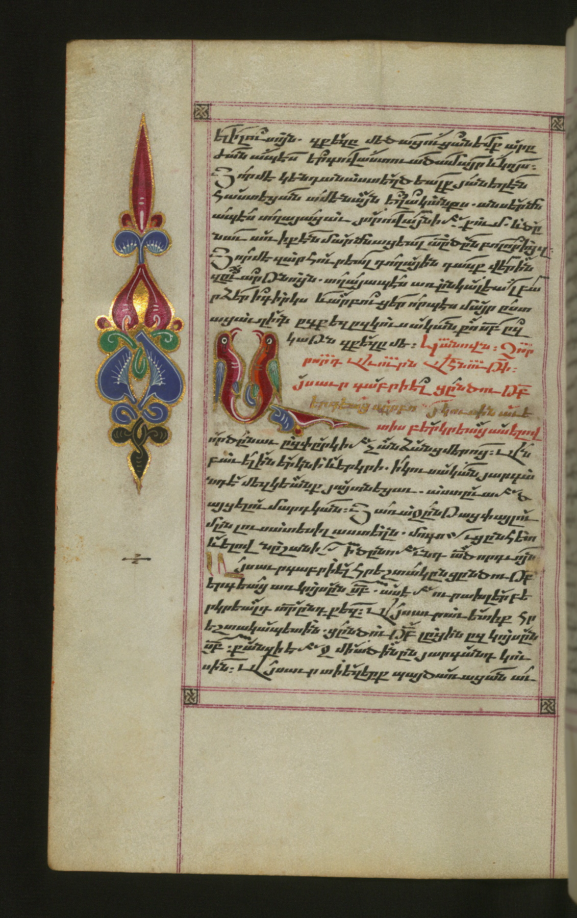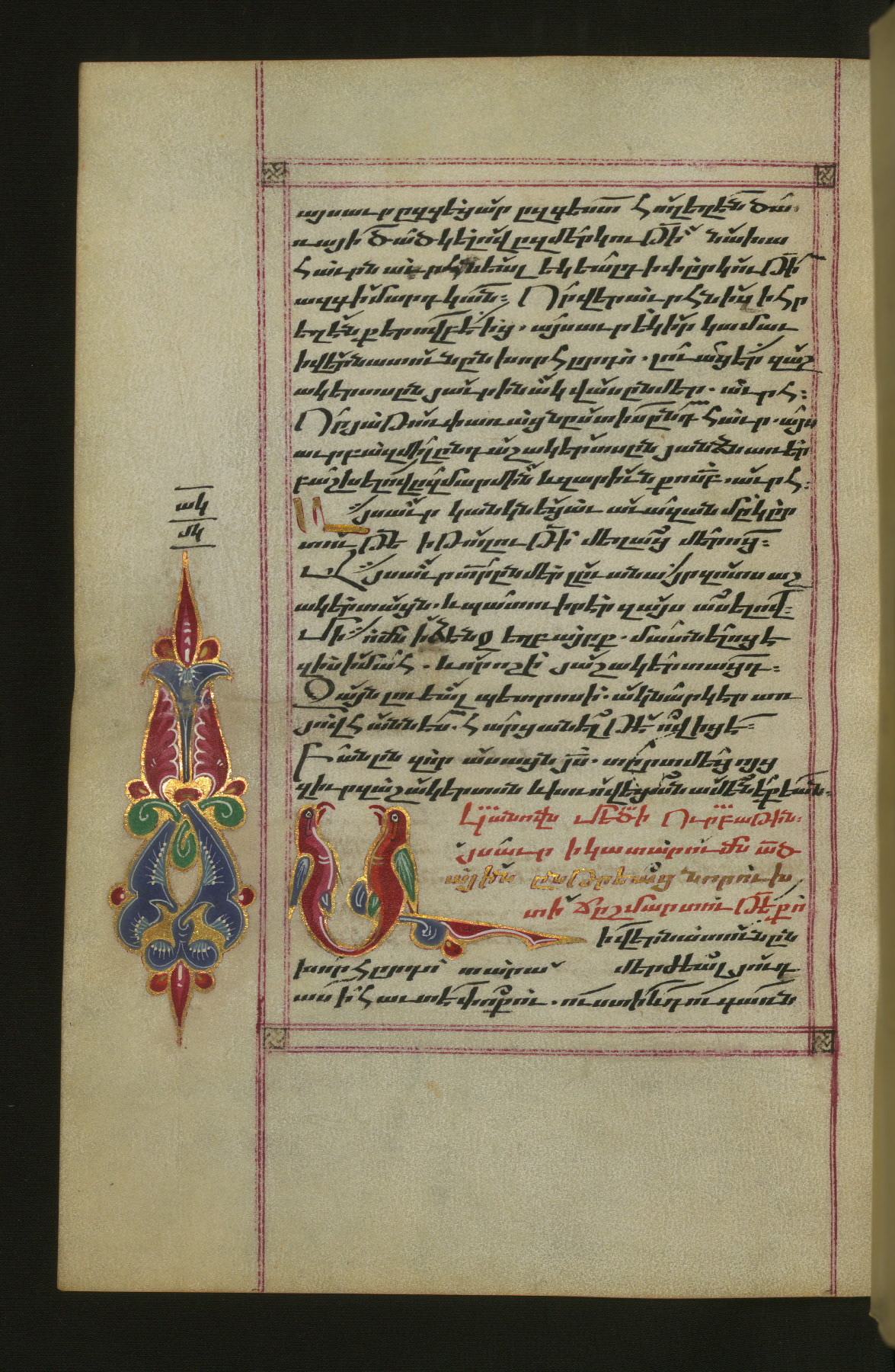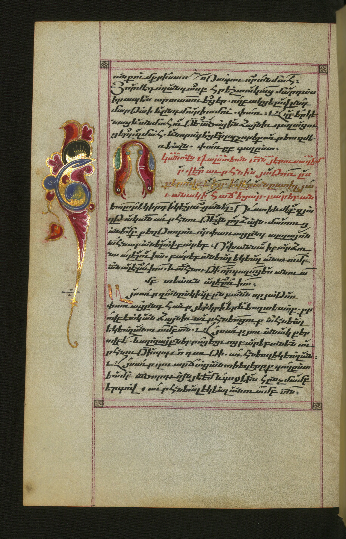 This hymnal was completed in Constantinople on August 15, 1678 [AE 1127], by the priest Yakob Pēligratc‘i, having been commissioned by Člav, son of Nawasard, as a dedication to his sons, Astuacatur and Sahak. The structure of the hymns adheres approximately to the standard Armenian hymnal (Շաբակնոց), with minor variations in order and a few substitutions (see Sanjian in the bibliography). The book is illuminated extensively, with thirty-eight full- and half-page polychrome miniatures against gold backgrounds, eight decorated head-pieces marking the principal divisions of the hymnal, and numerous marginal miniatures marking individual hymns, including biblical figures, saints, bishops, and vignettes. The style of the miniatures is largely in imitation of western European models, though more traditional Armenian and Byzantine influences stand out, such as the vibrant color palette, an iconic frontality for depictions of saints and bishops, and the highly abstracted floral motifs and zoomorphic incipits marking hymn divisions.