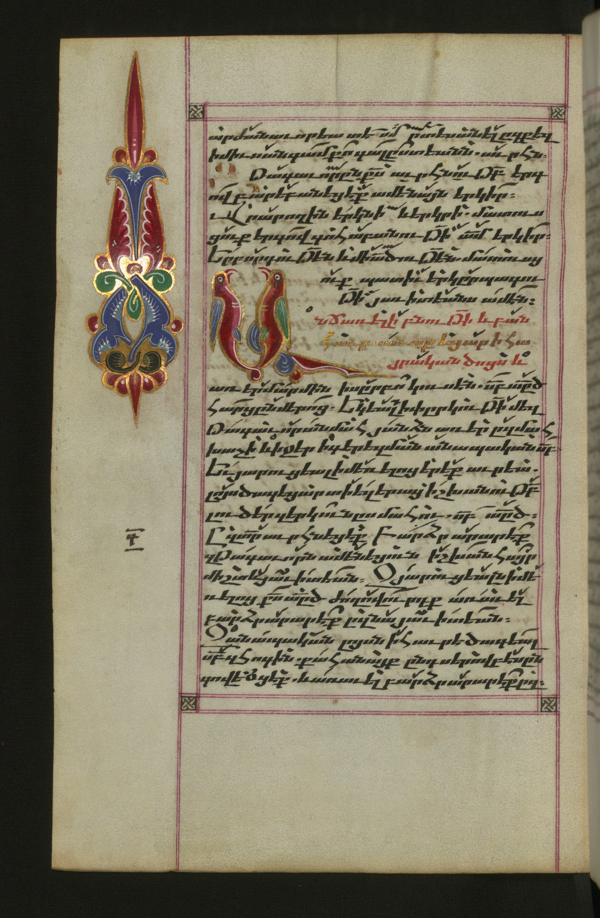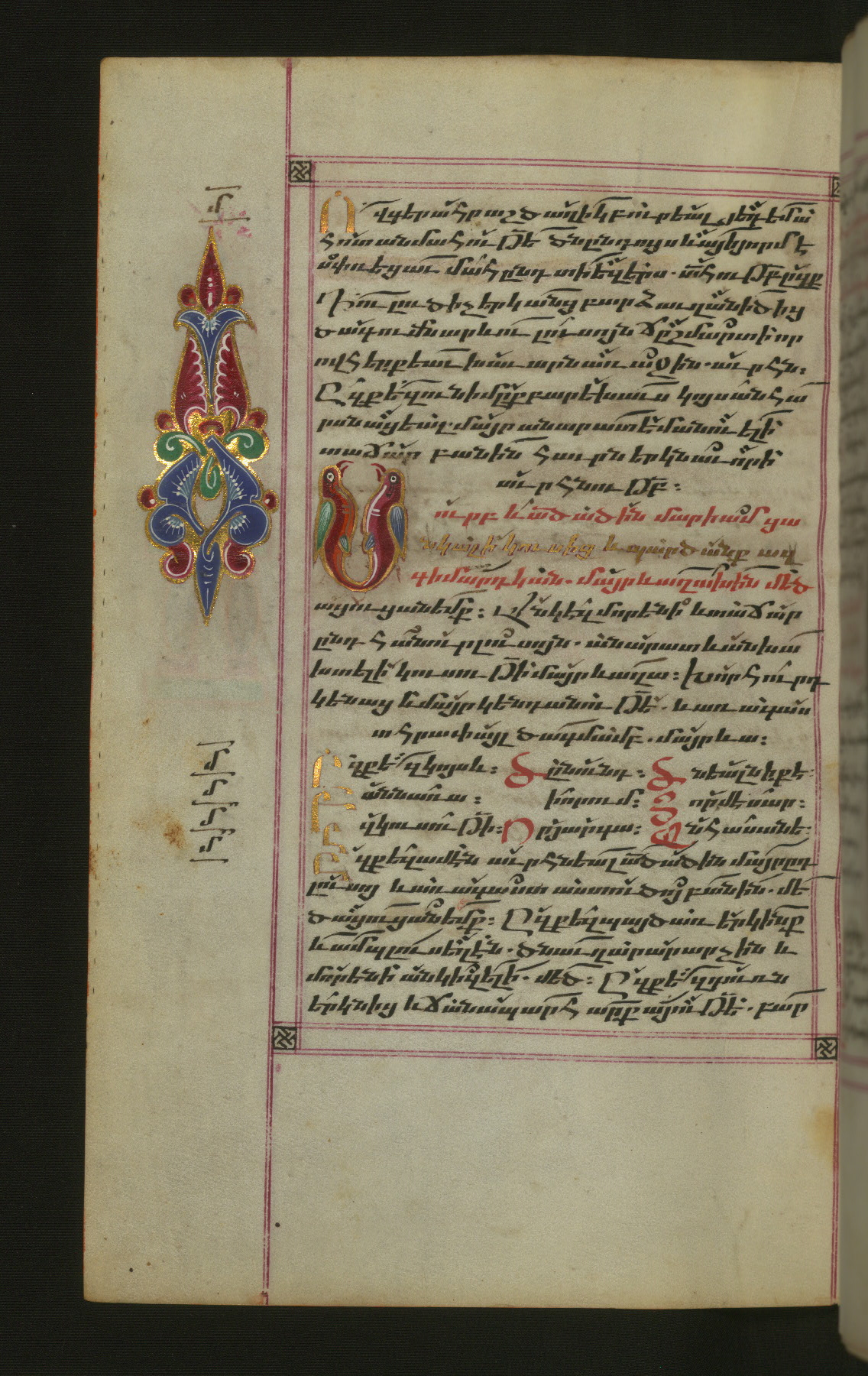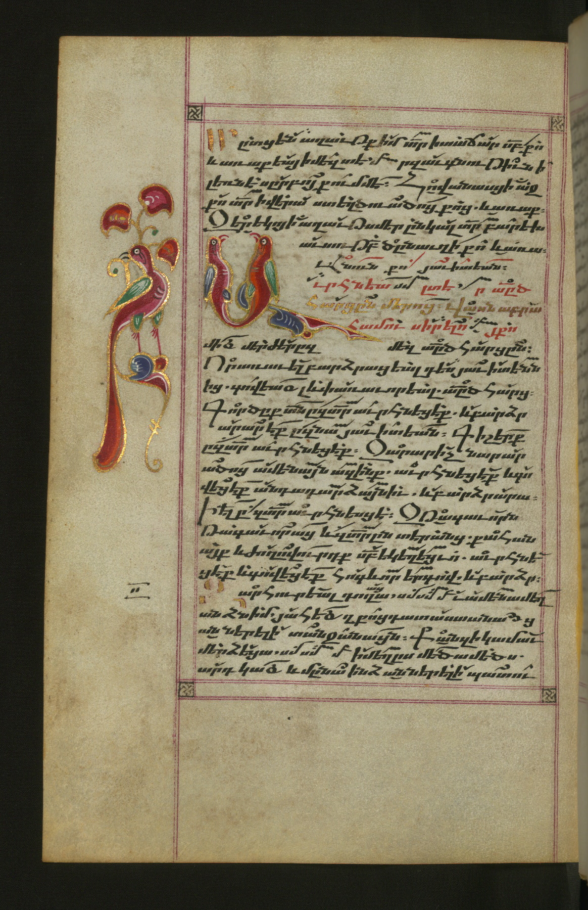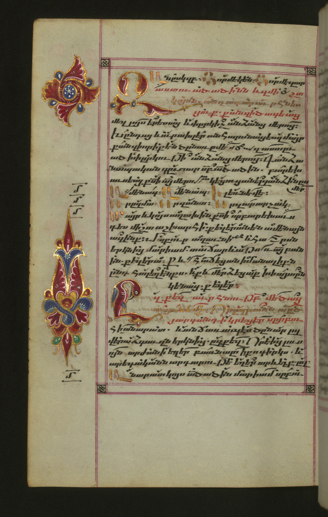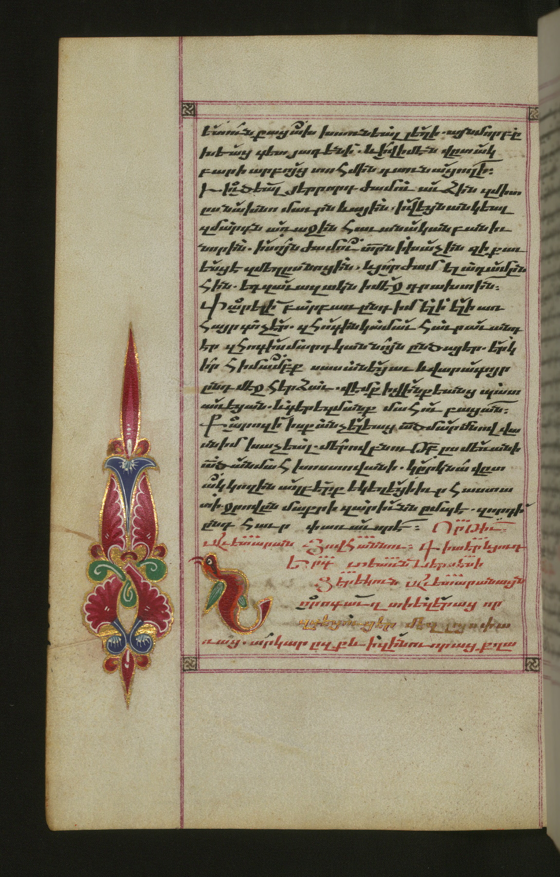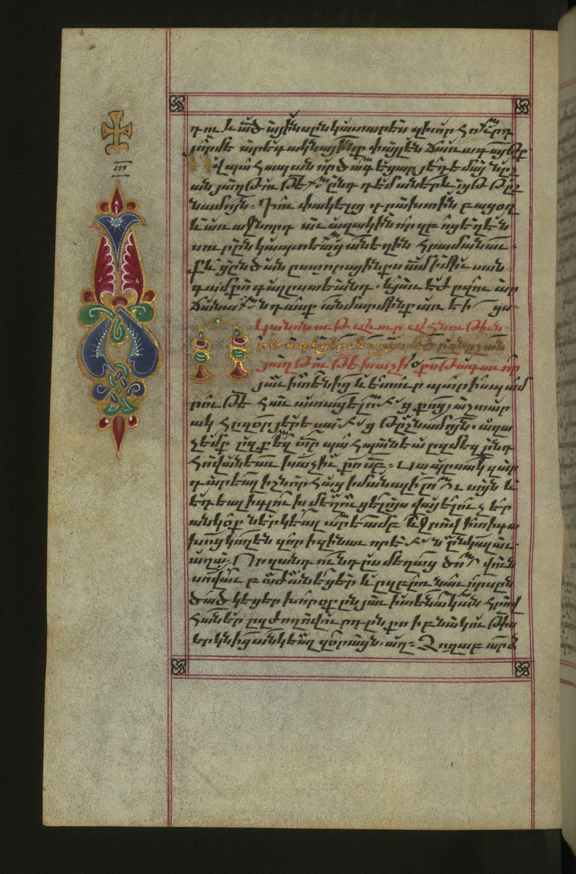 This hymnal was completed in Constantinople on August 15, 1678 [AE 1127], by the priest Yakob Pēligratc‘i, having been commissioned by Člav, son of Nawasard, as a dedication to his sons, Astuacatur and Sahak. The structure of the hymns adheres approximately to the standard Armenian hymnal (Շաբակնոց), with minor variations in order and a few substitutions (see Sanjian in the bibliography). The book is illuminated extensively, with thirty-eight full- and half-page polychrome miniatures against gold backgrounds, eight decorated head-pieces marking the principal divisions of the hymnal, and numerous marginal miniatures marking individual hymns, including biblical figures, saints, bishops, and vignettes. The style of the miniatures is largely in imitation of western European models, though more traditional Armenian and Byzantine influences stand out, such as the vibrant color palette, an iconic frontality for depictions of saints and bishops, and the highly abstracted floral motifs and zoomorphic incipits marking hymn divisions.