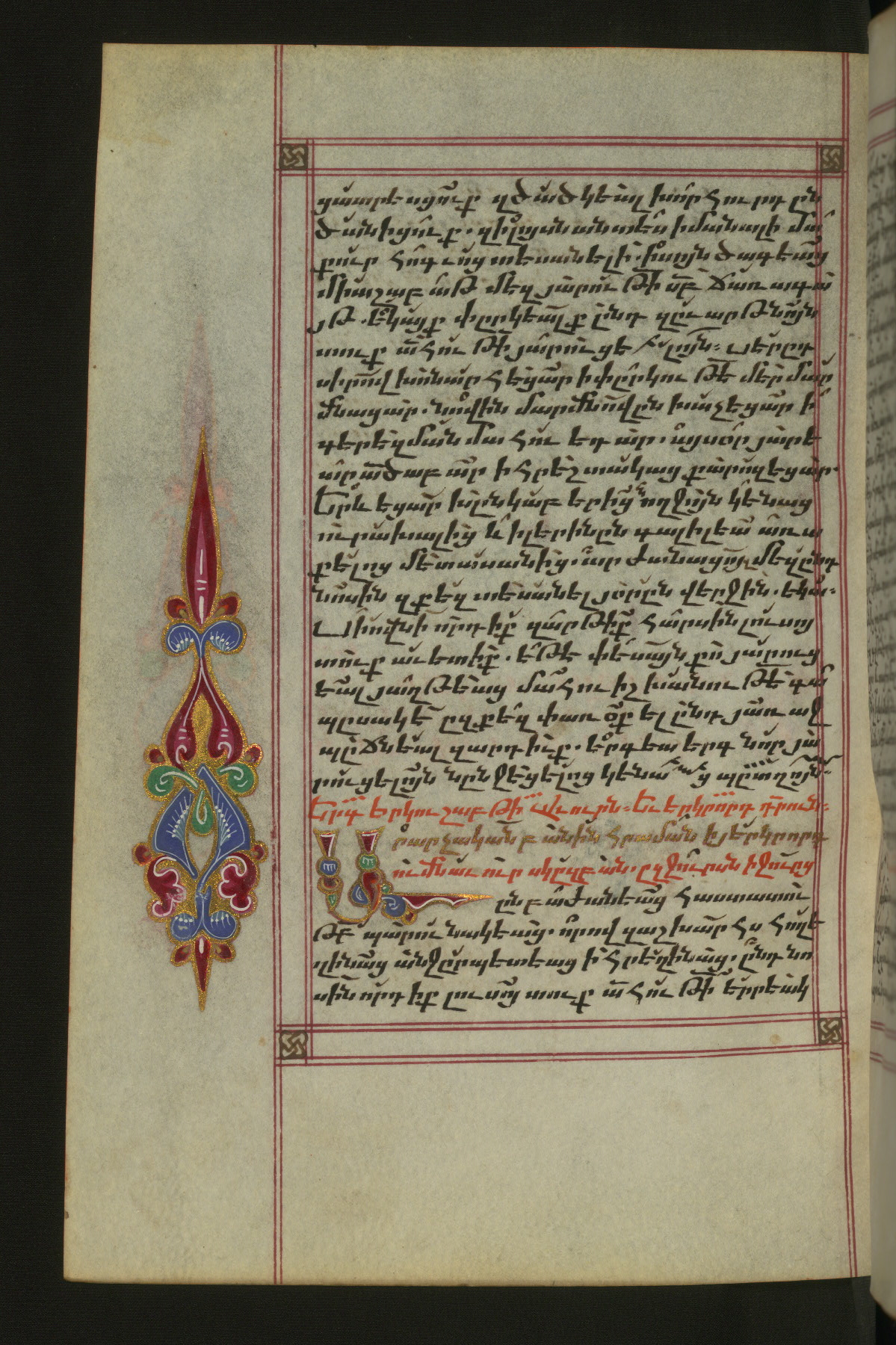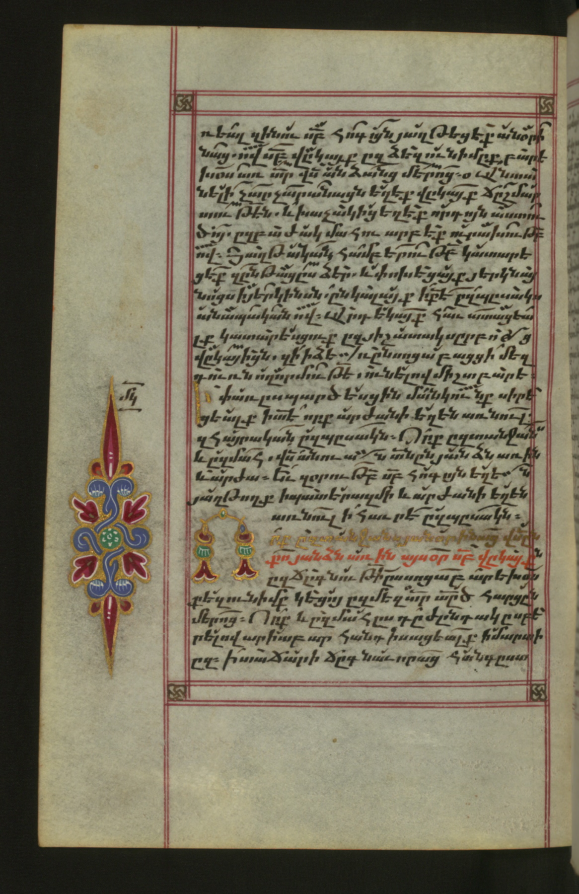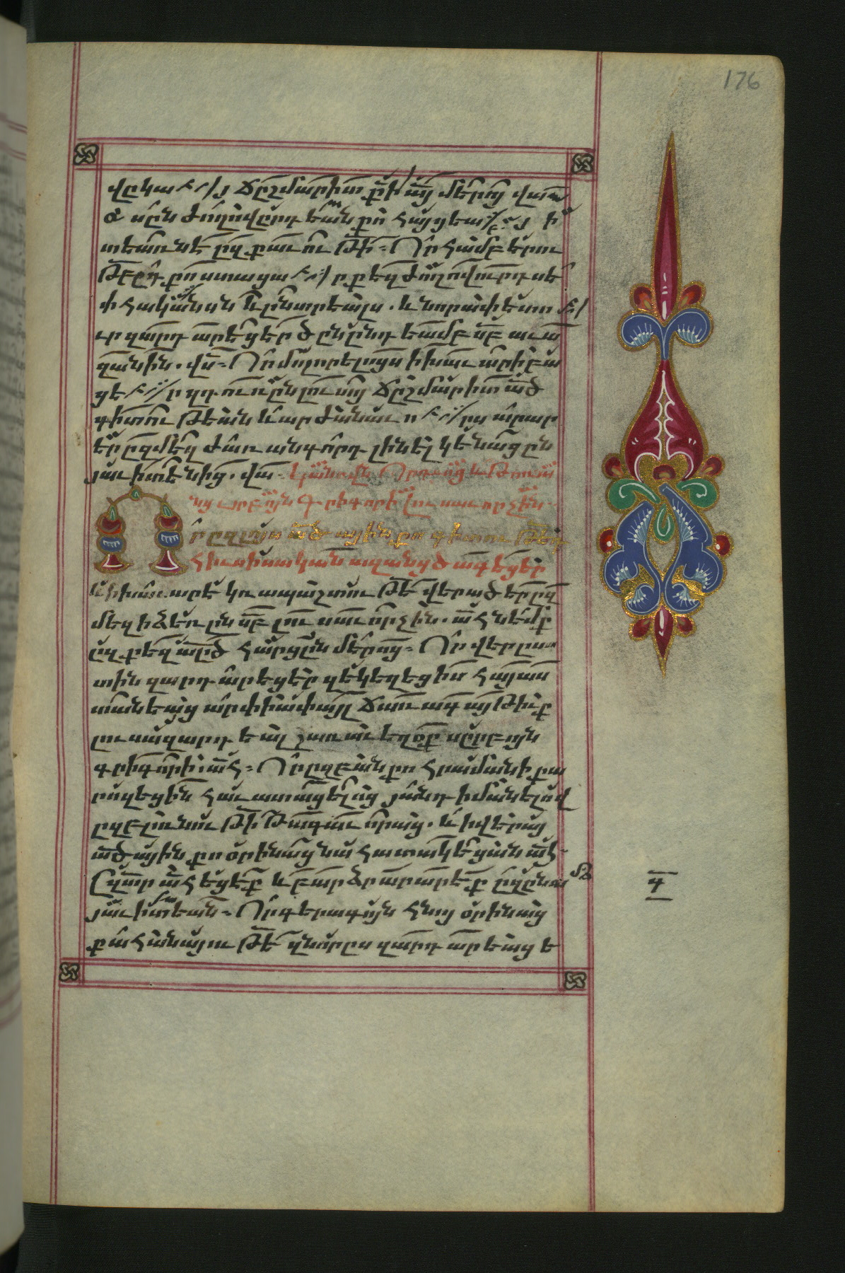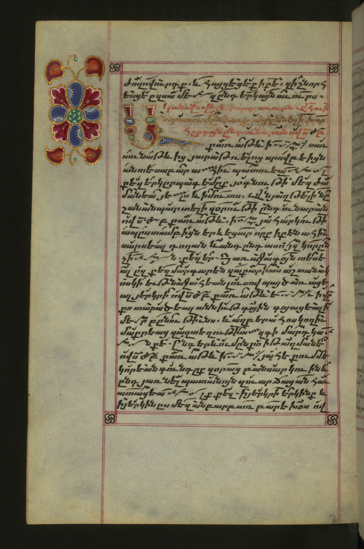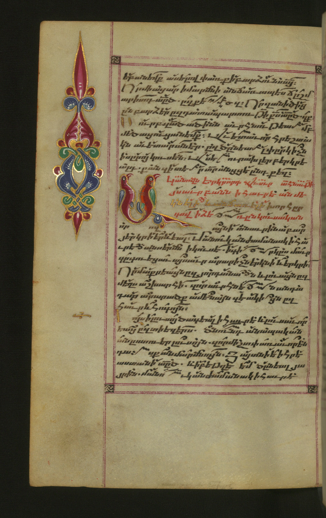 This hymnal was completed in Constantinople on August 15, 1678 [AE 1127], by the priest Yakob Pēligratc‘i, having been commissioned by Člav, son of Nawasard, as a dedication to his sons, Astuacatur and Sahak. The structure of the hymns adheres approximately to the standard Armenian hymnal (Շաբակնոց), with minor variations in order and a few substitutions (see Sanjian in the bibliography). The book is illuminated extensively, with thirty-eight full- and half-page polychrome miniatures against gold backgrounds, eight decorated head-pieces marking the principal divisions of the hymnal, and numerous marginal miniatures marking individual hymns, including biblical figures, saints, bishops, and vignettes. The style of the miniatures is largely in imitation of western European models, though more traditional Armenian and Byzantine influences stand out, such as the vibrant color palette, an iconic frontality for depictions of saints and bishops, and the highly abstracted floral motifs and zoomorphic incipits marking hymn divisions.