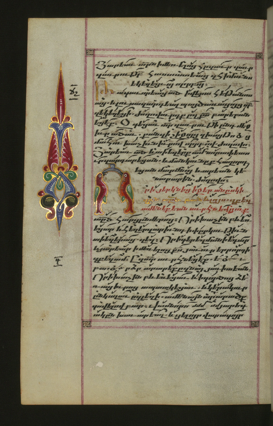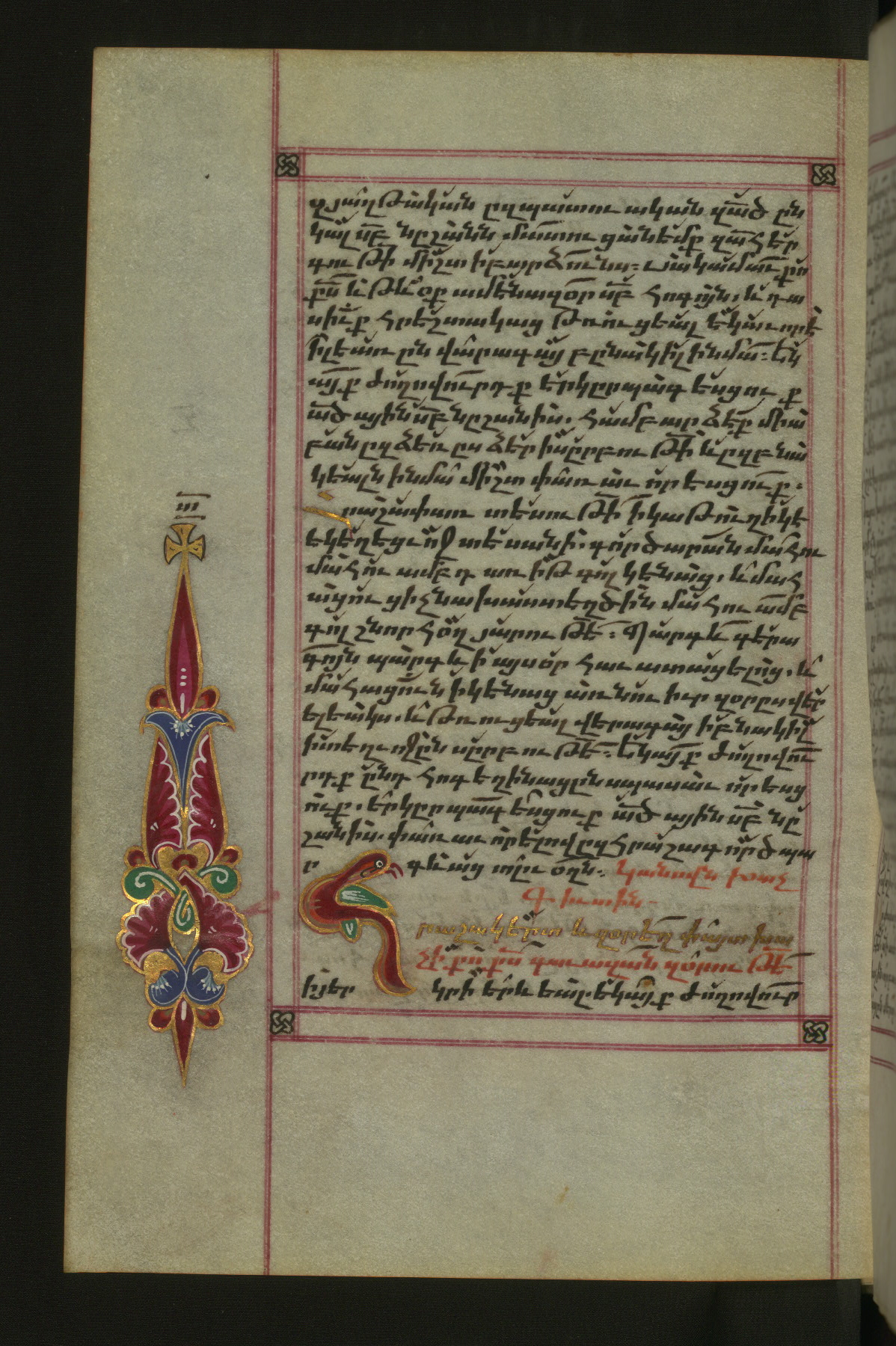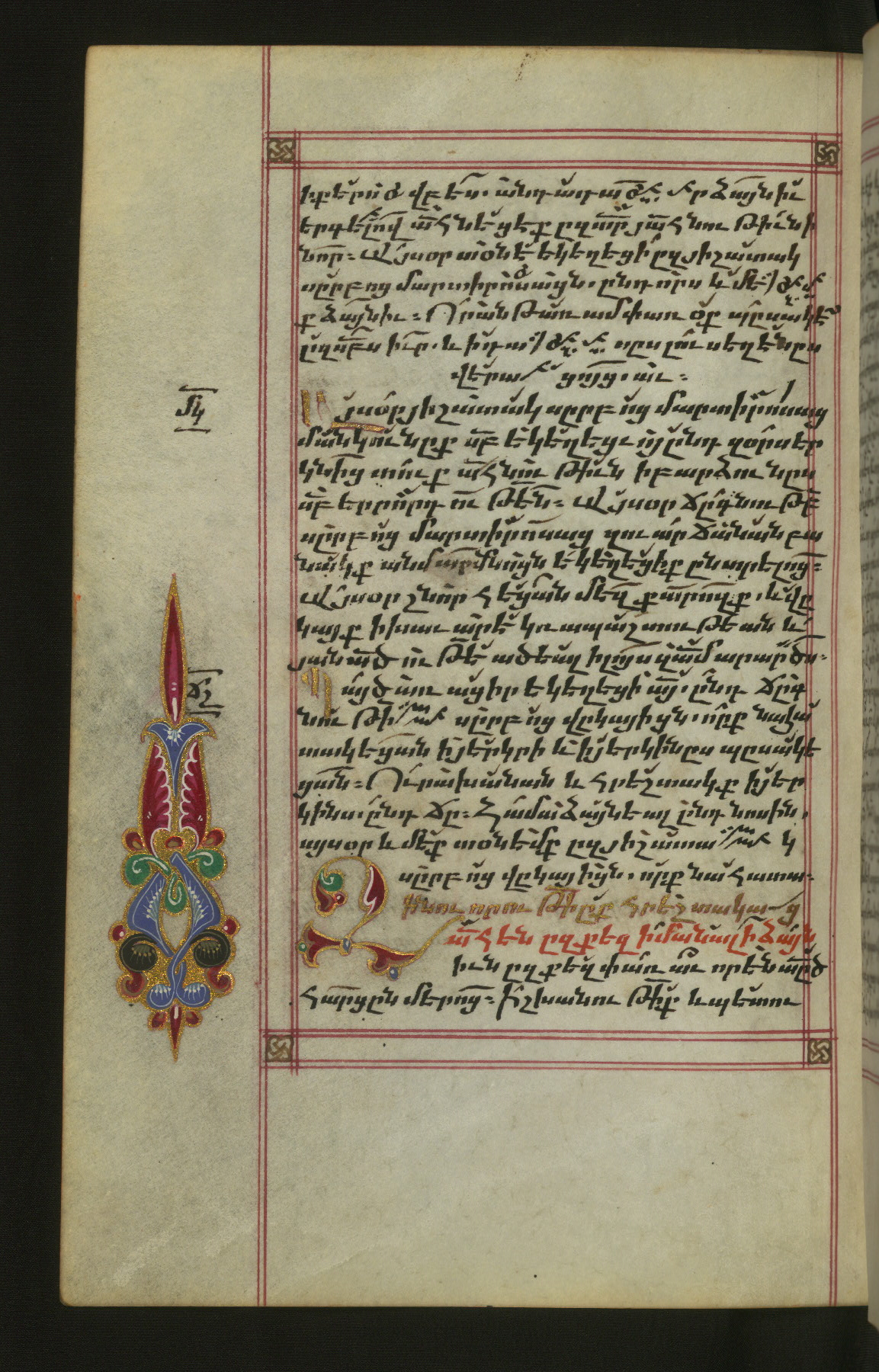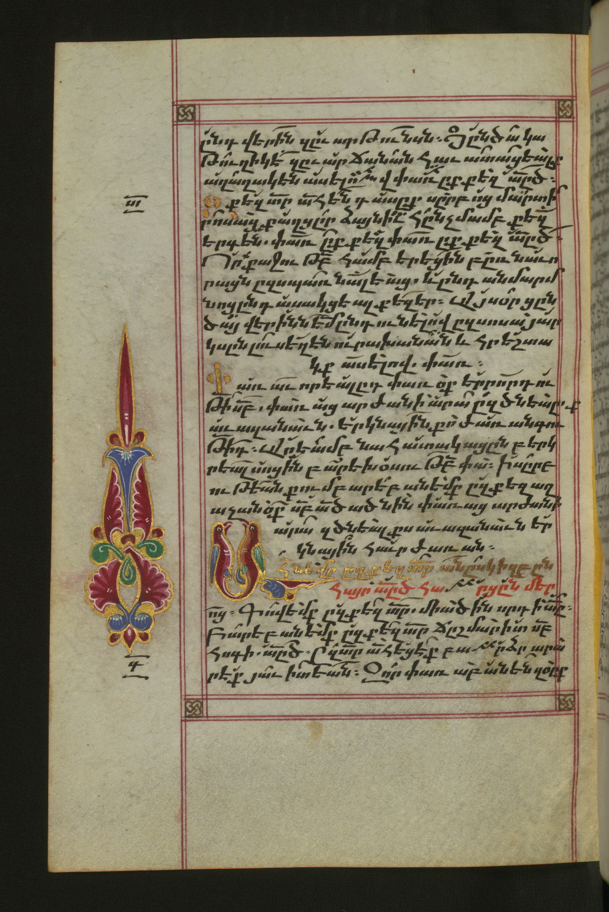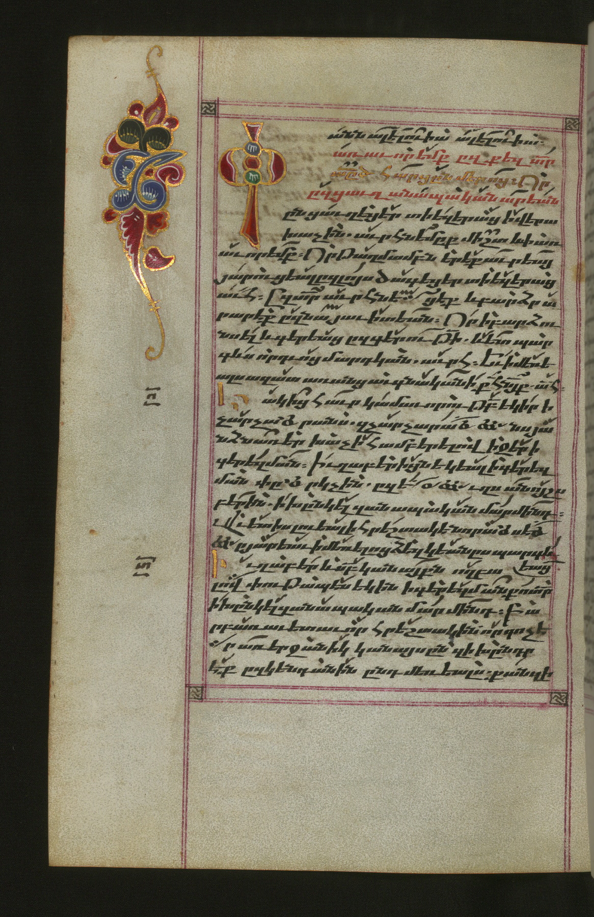This hymnal was completed in Constantinople on August 15, 1678 [AE 1127], by the priest Yakob Pēligratc‘i, having been commissioned by Člav, son of Nawasard, as a dedication to his sons, Astuacatur and Sahak. The structure of the hymns adheres approximately to the standard Armenian hymnal (Շաբակնոց), with minor variations in order and a few substitutions (see Sanjian in the bibliography). The book is illuminated extensively, with thirty-eight full- and half-page polychrome miniatures against gold backgrounds, eight decorated head-pieces marking the principal divisions of the hymnal, and numerous marginal miniatures marking individual hymns, including biblical figures, saints, bishops, and vignettes. The style of the miniatures is largely in imitation of western European models, though more traditional Armenian and Byzantine influences stand out, such as the vibrant color palette, an iconic frontality for depictions of saints and bishops, and the highly abstracted floral motifs and zoomorphic incipits marking hymn divisions.