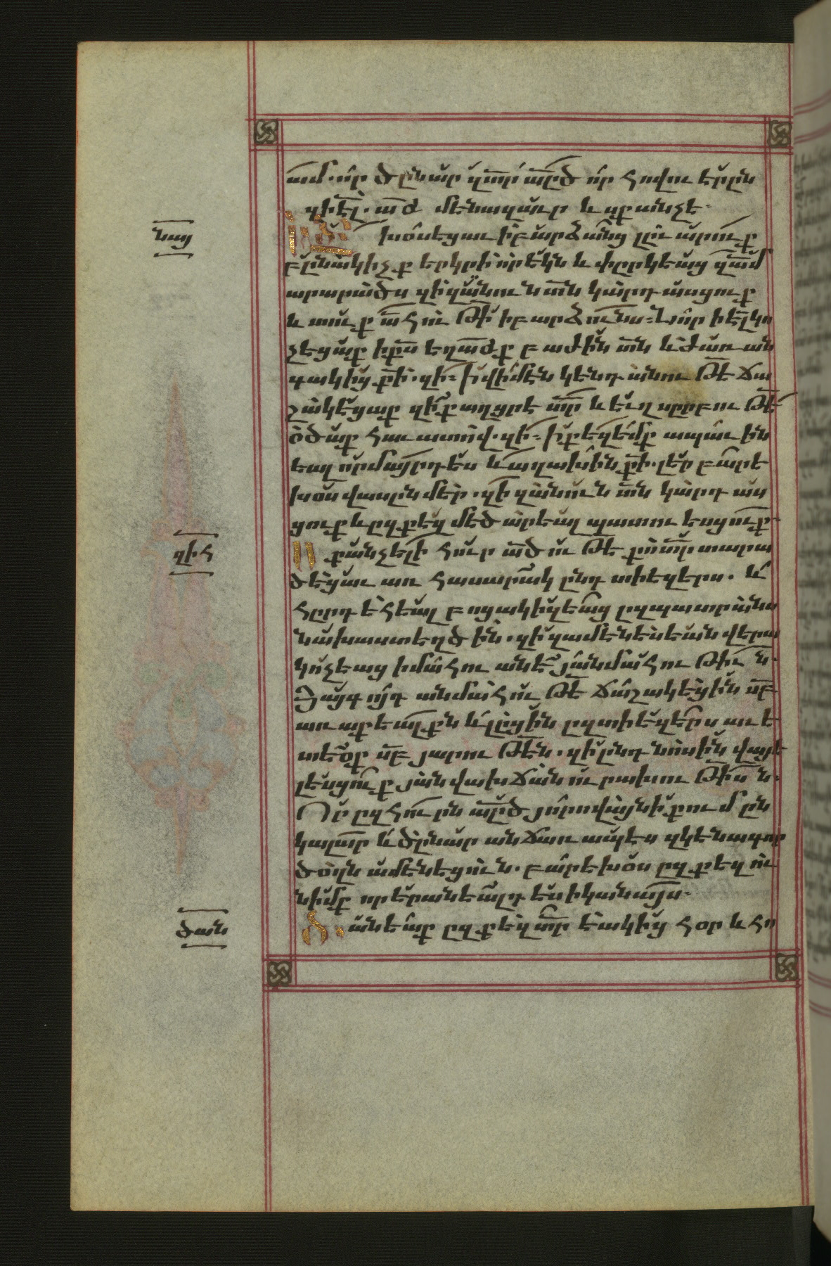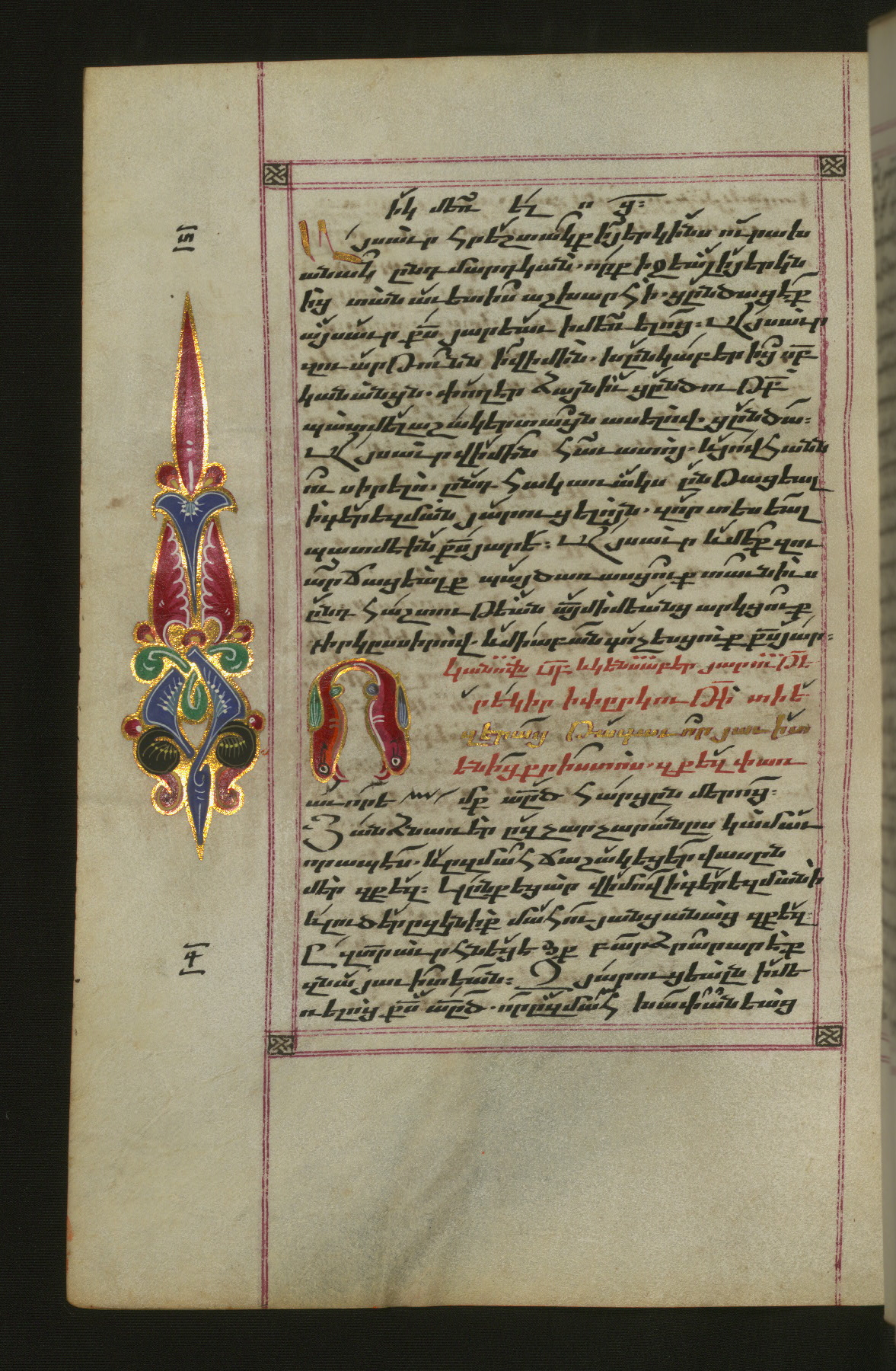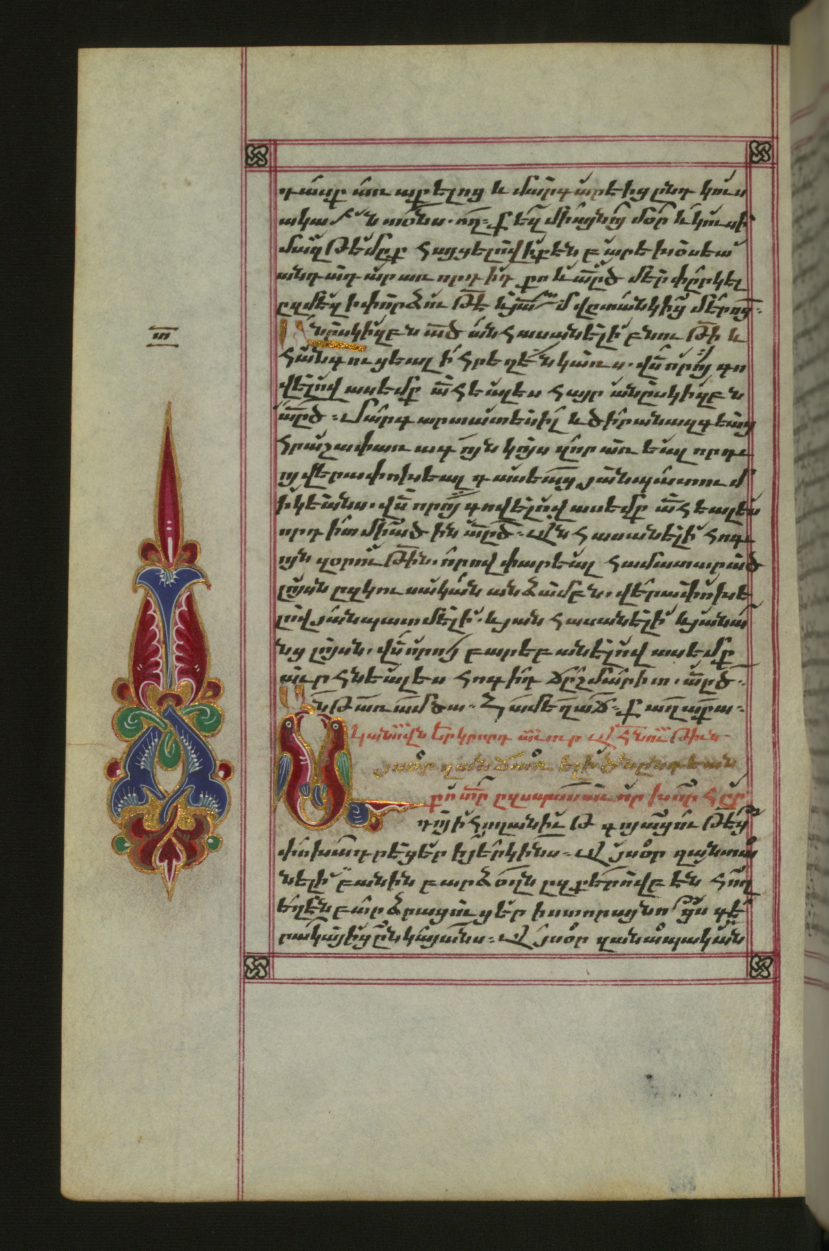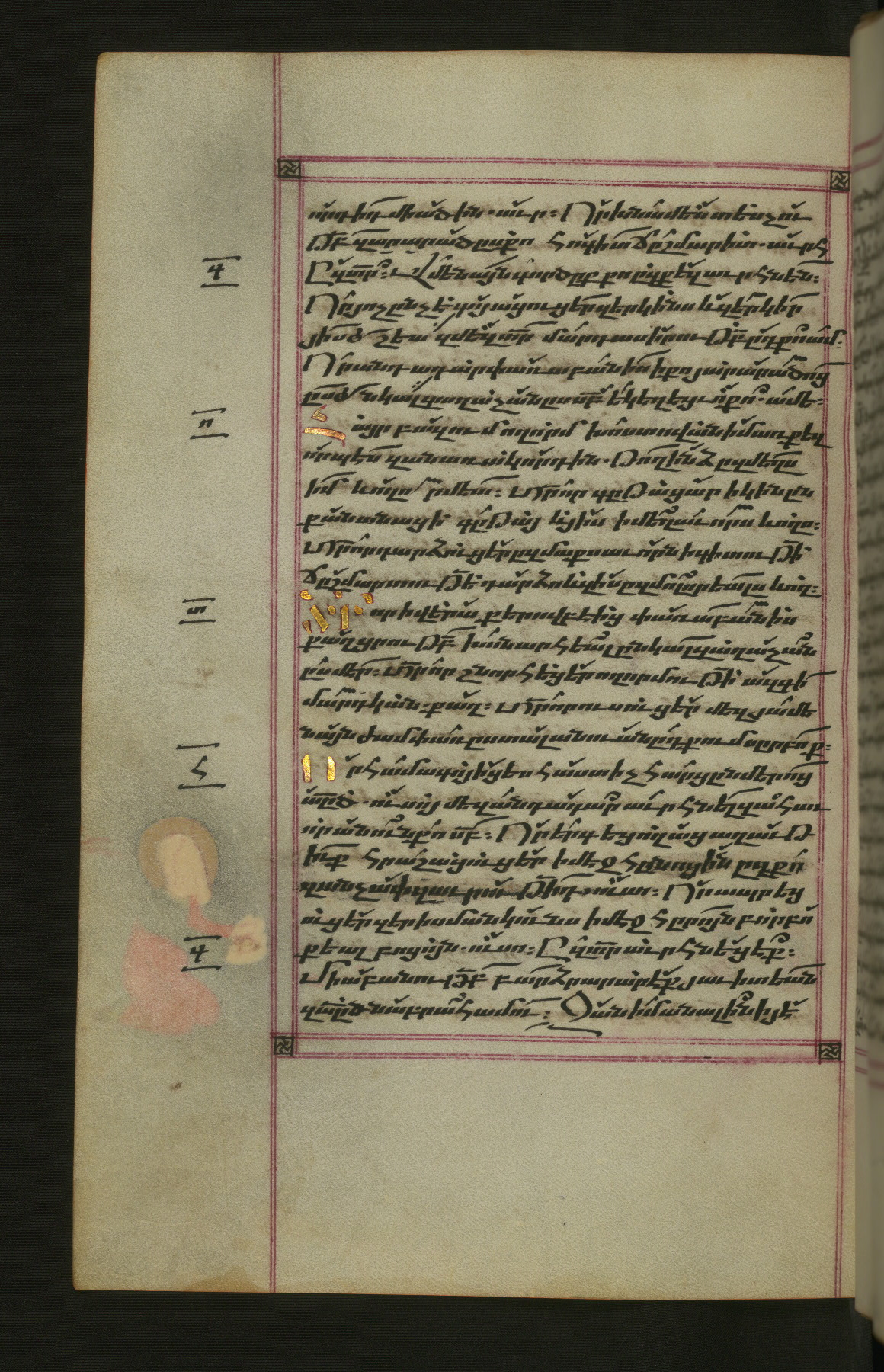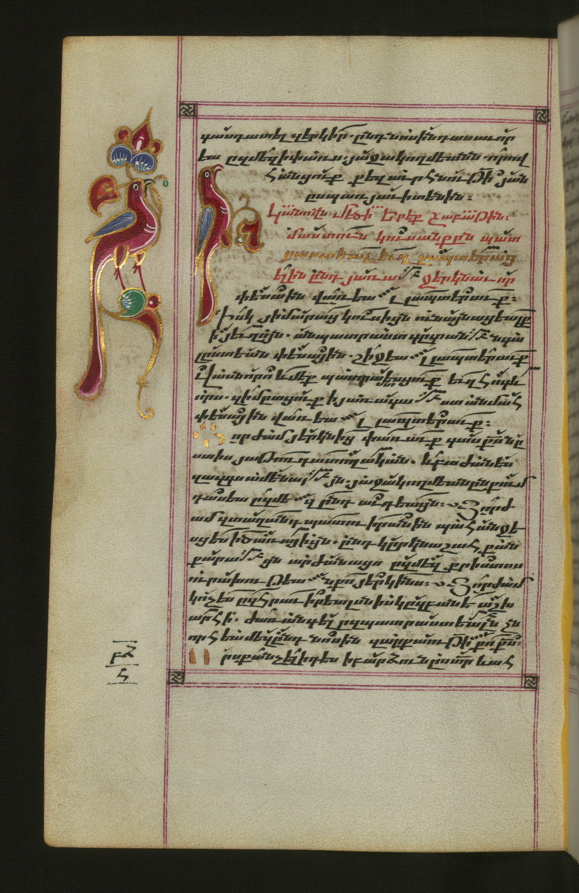 This hymnal was completed in Constantinople on August 15, 1678 [AE 1127], by the priest Yakob Pēligratc‘i, having been commissioned by Člav, son of Nawasard, as a dedication to his sons, Astuacatur and Sahak. The structure of the hymns adheres approximately to the standard Armenian hymnal (Շաբակնոց), with minor variations in order and a few substitutions (see Sanjian in the bibliography). The book is illuminated extensively, with thirty-eight full- and half-page polychrome miniatures against gold backgrounds, eight decorated head-pieces marking the principal divisions of the hymnal, and numerous marginal miniatures marking individual hymns, including biblical figures, saints, bishops, and vignettes. The style of the miniatures is largely in imitation of western European models, though more traditional Armenian and Byzantine influences stand out, such as the vibrant color palette, an iconic frontality for depictions of saints and bishops, and the highly abstracted floral motifs and zoomorphic incipits marking hymn divisions.
