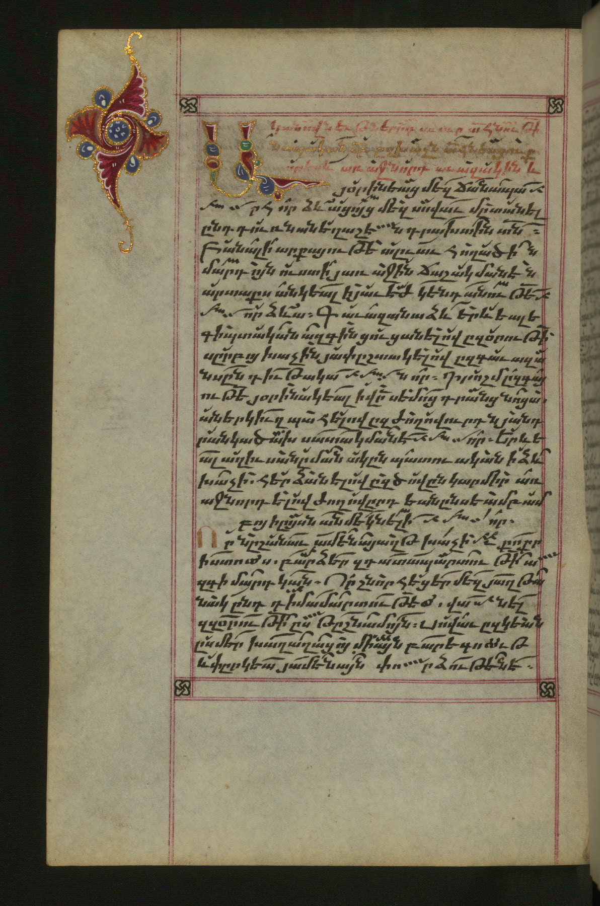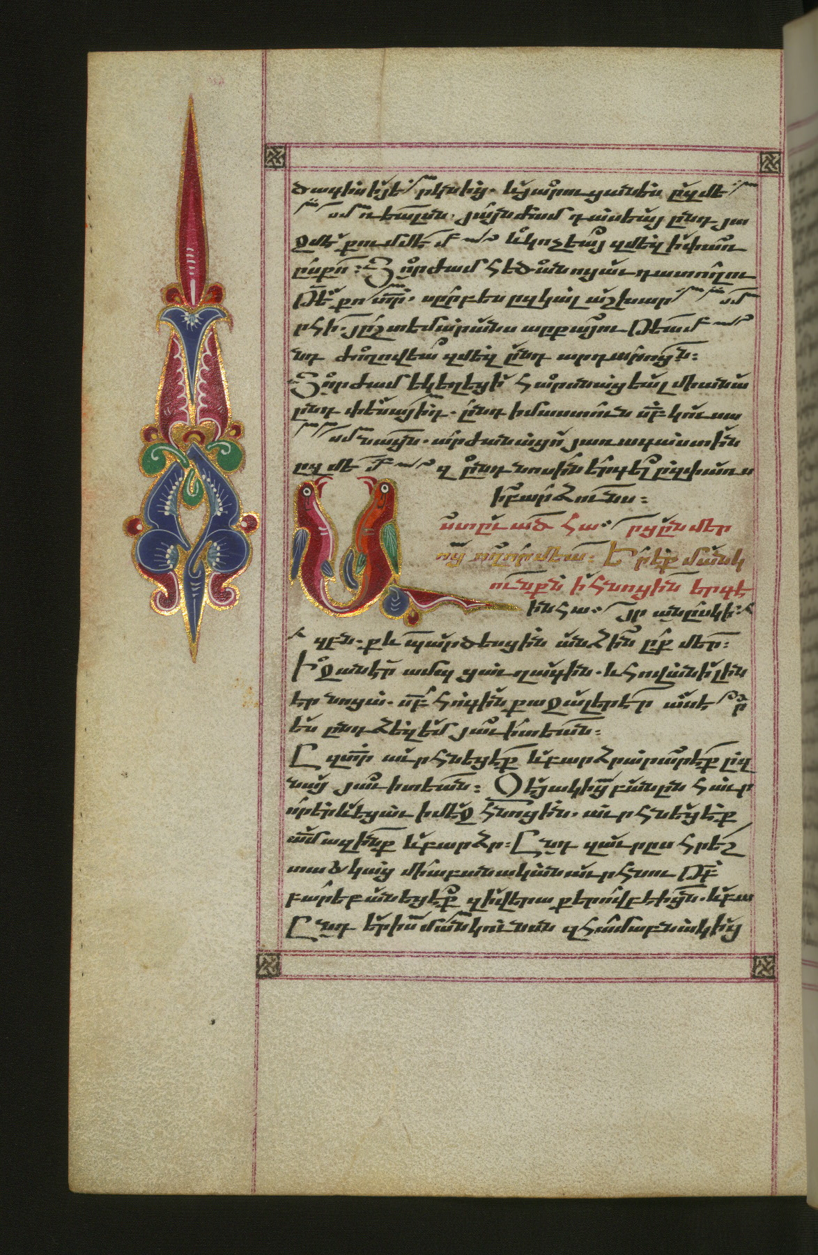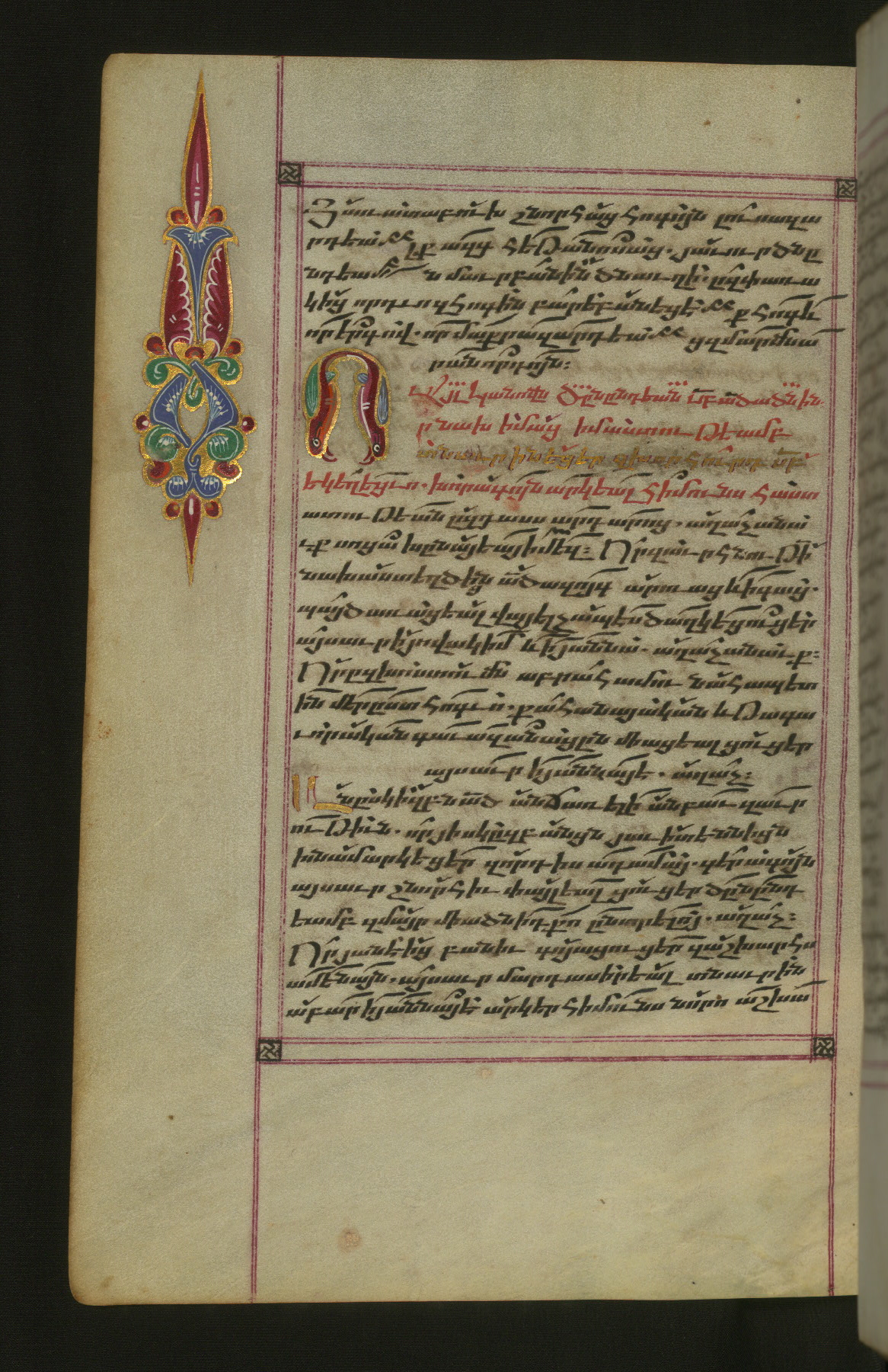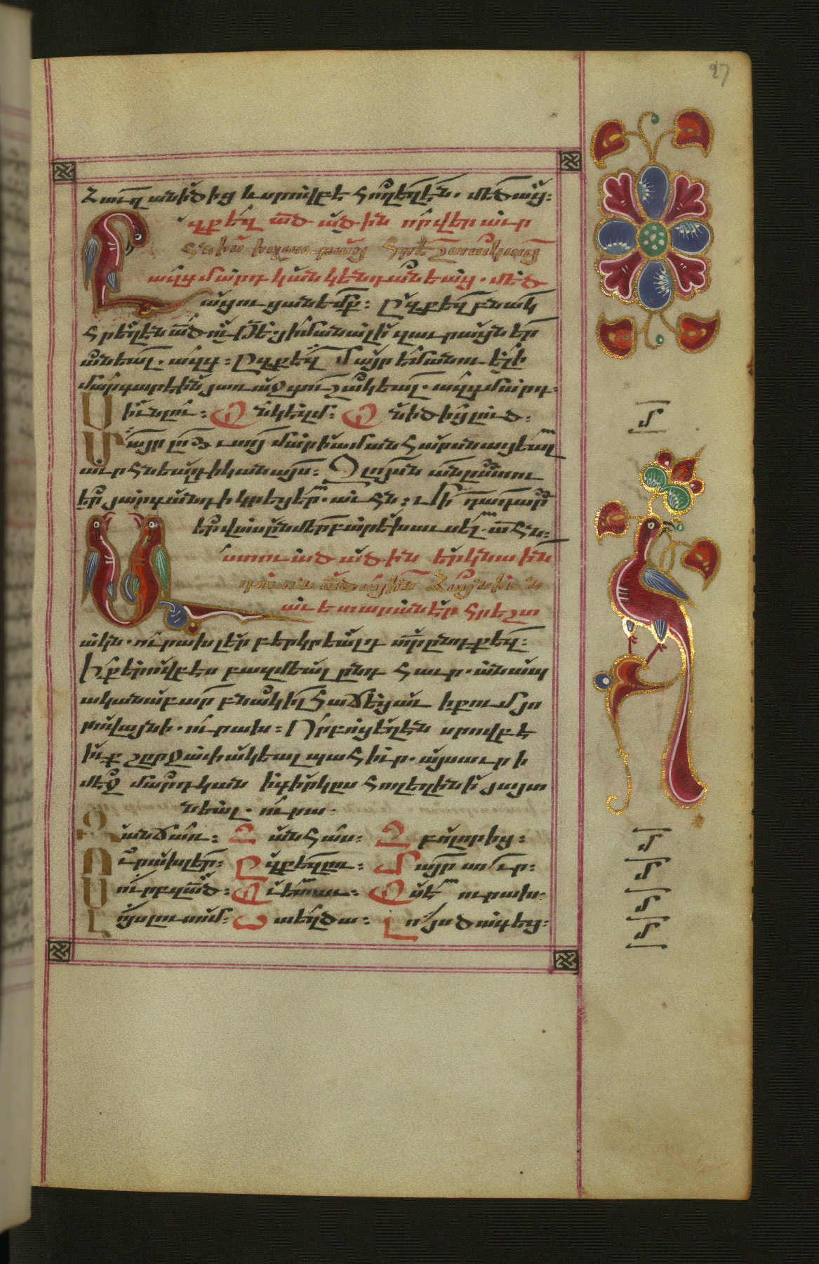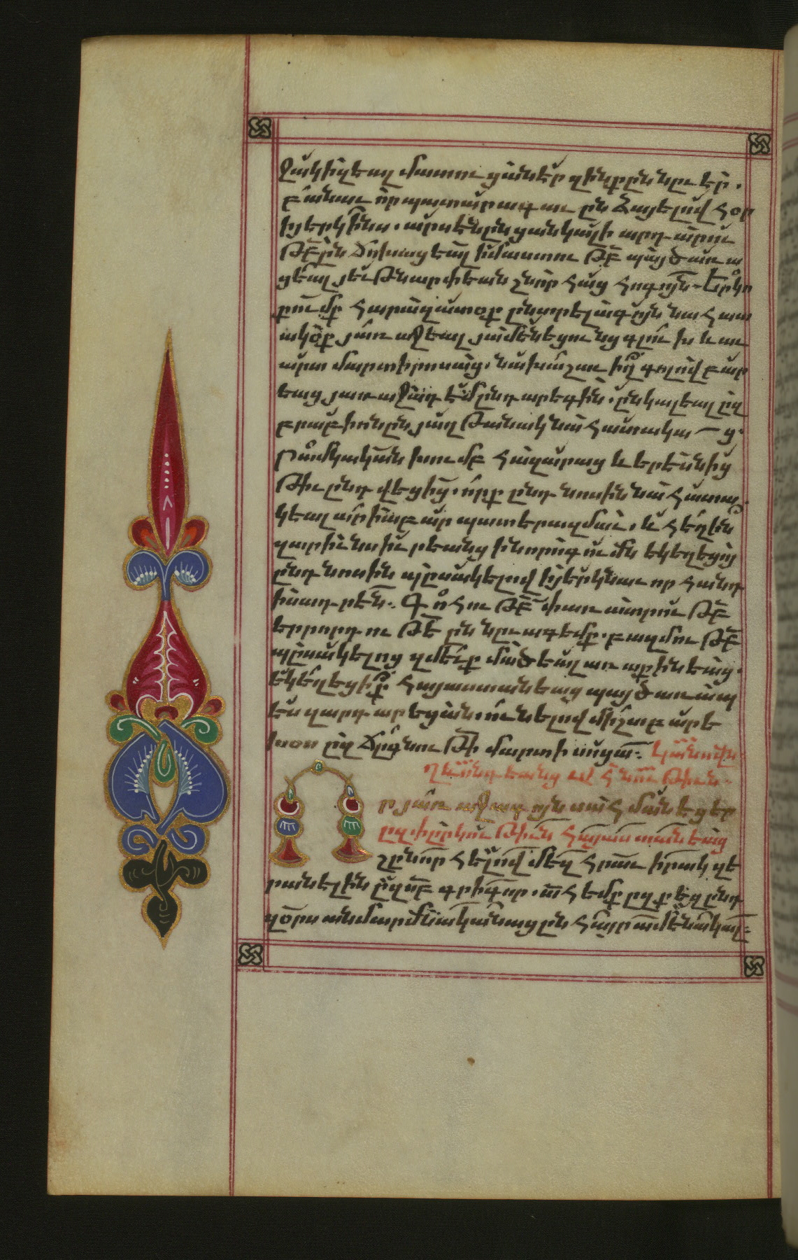 This hymnal was completed in Constantinople on August 15, 1678 [AE 1127], by the priest Yakob Pēligratc‘i, having been commissioned by Člav, son of Nawasard, as a dedication to his sons, Astuacatur and Sahak. The structure of the hymns adheres approximately to the standard Armenian hymnal (Շաբակնոց), with minor variations in order and a few substitutions (see Sanjian in the bibliography). The book is illuminated extensively, with thirty-eight full- and half-page polychrome miniatures against gold backgrounds, eight decorated head-pieces marking the principal divisions of the hymnal, and numerous marginal miniatures marking individual hymns, including biblical figures, saints, bishops, and vignettes. The style of the miniatures is largely in imitation of western European models, though more traditional Armenian and Byzantine influences stand out, such as the vibrant color palette, an iconic frontality for depictions of saints and bishops, and the highly abstracted floral motifs and zoomorphic incipits marking hymn divisions.