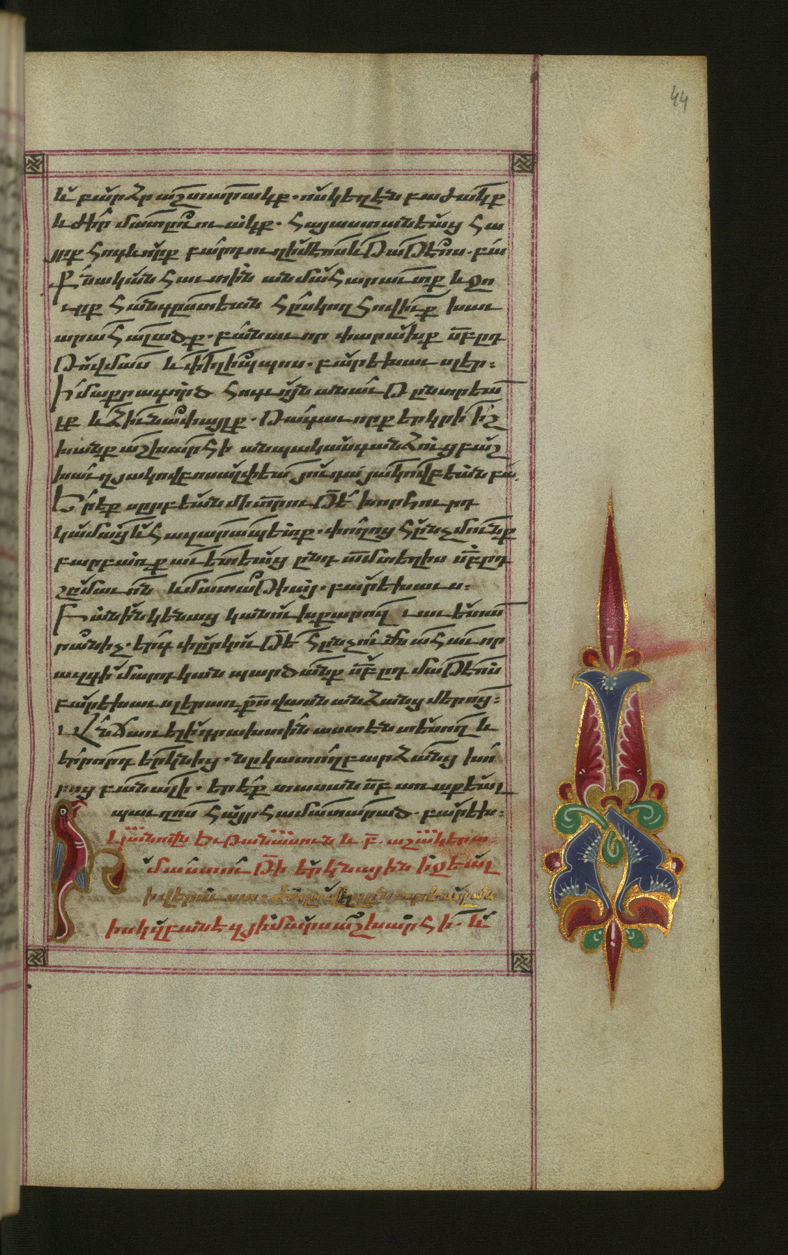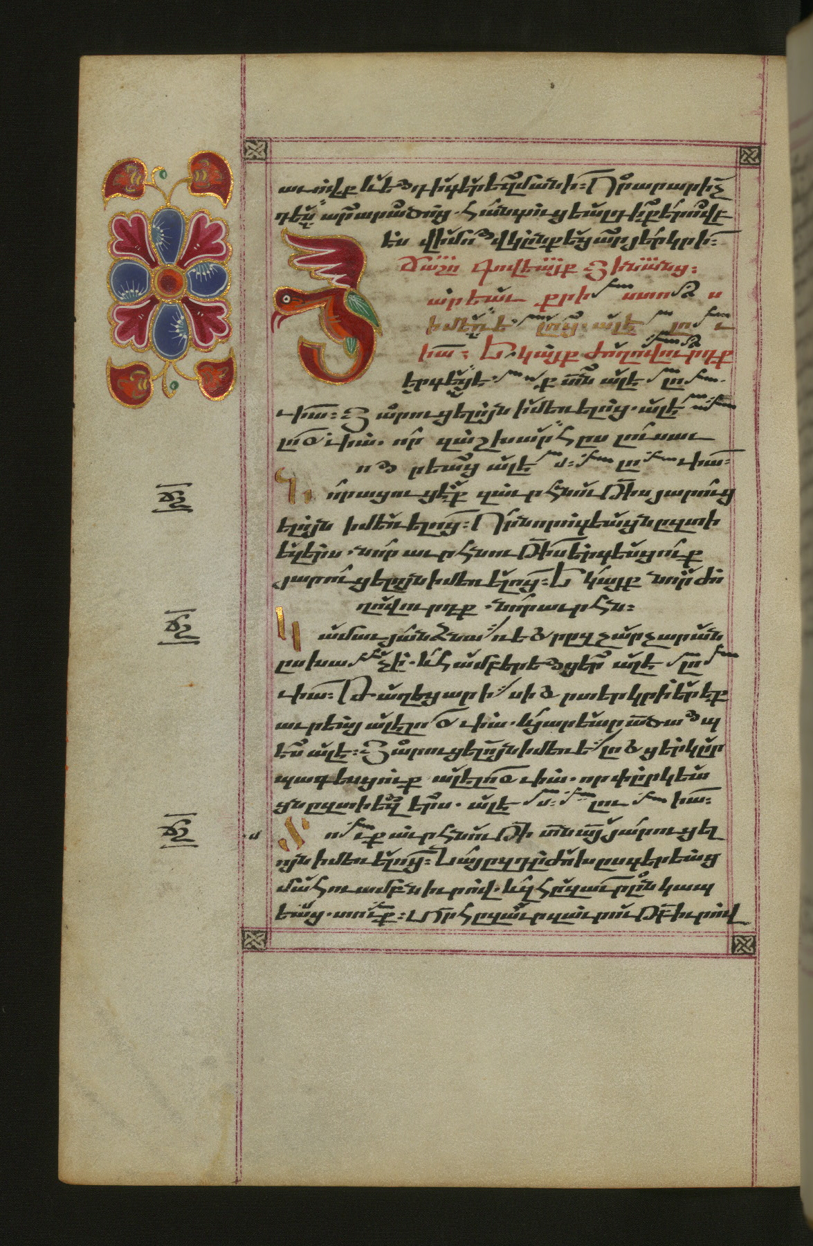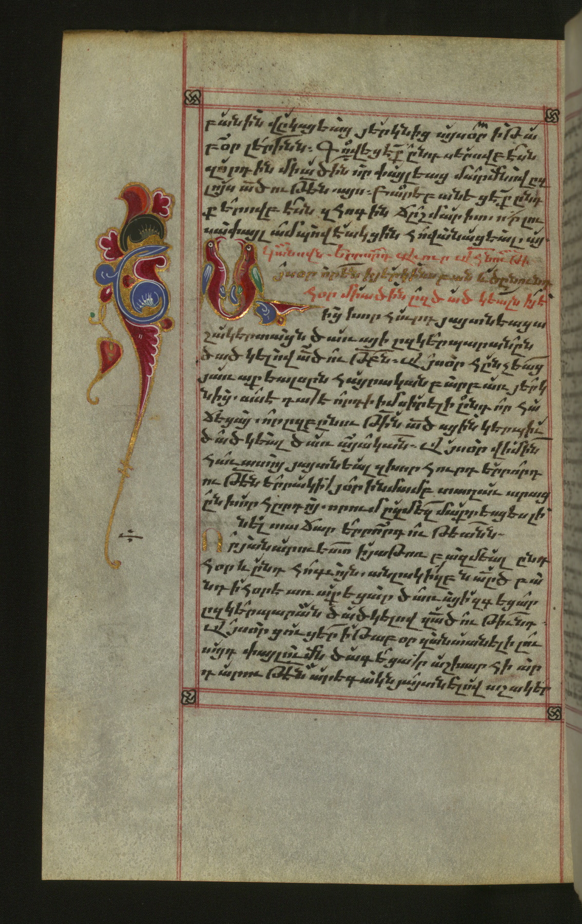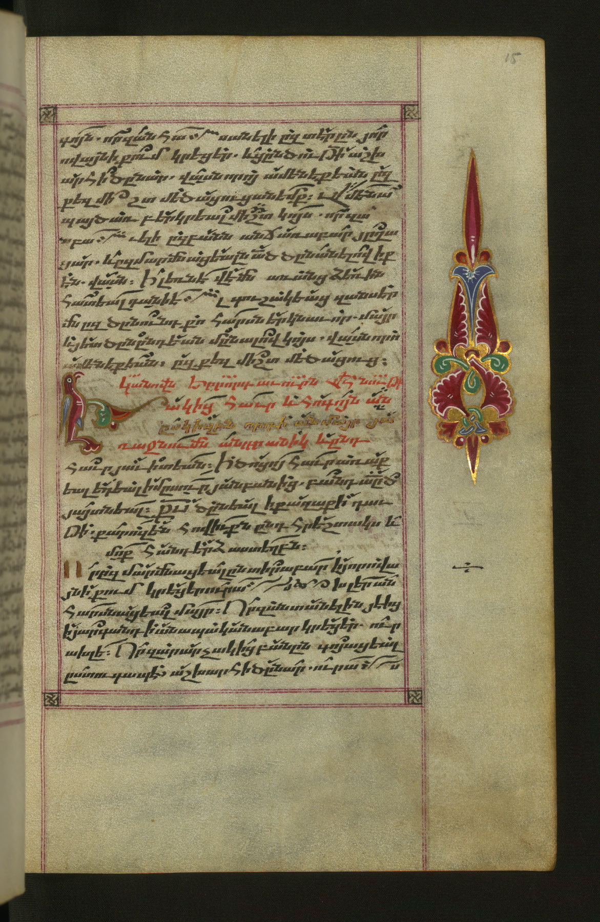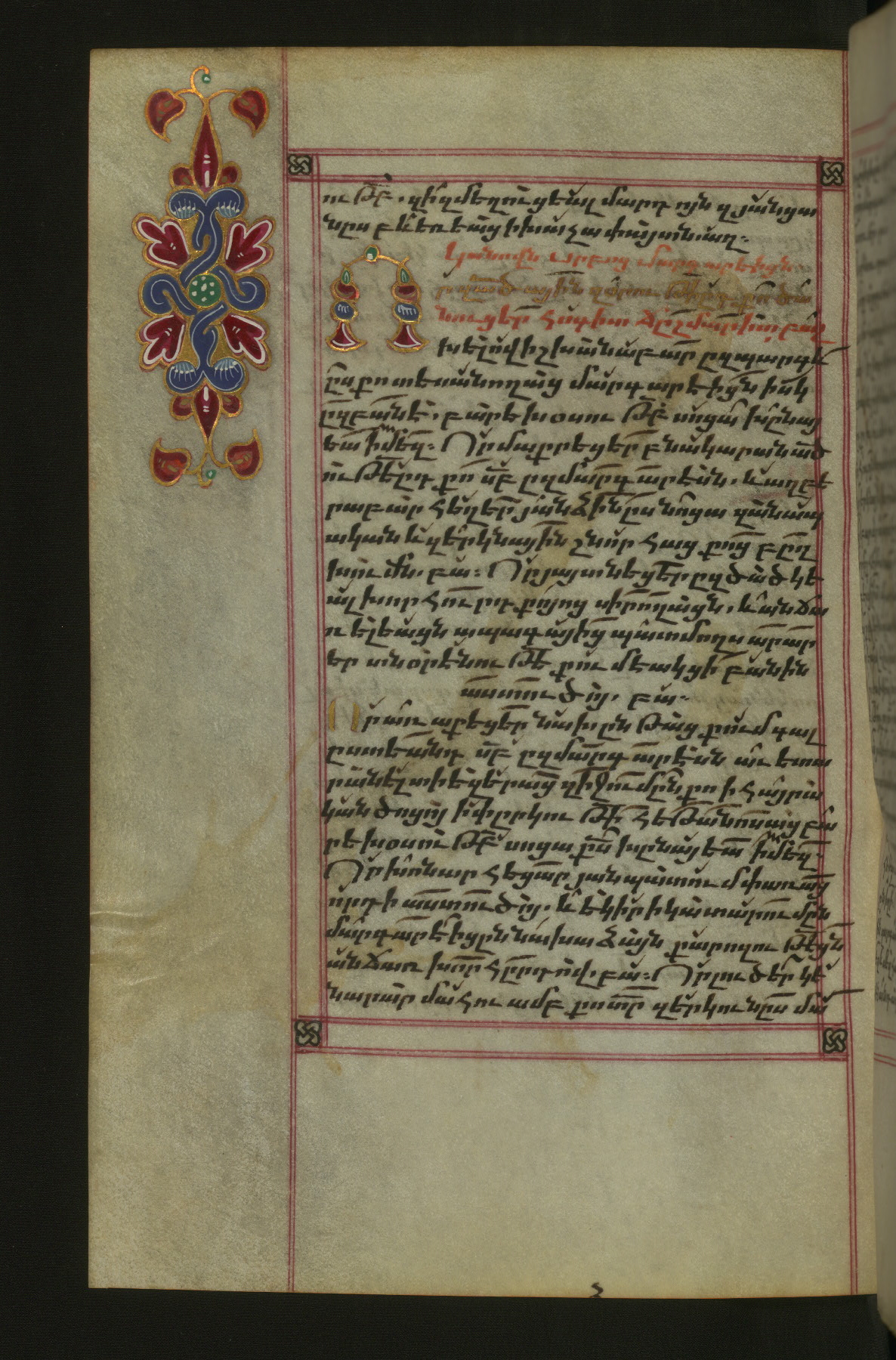 This hymnal was completed in Constantinople on August 15, 1678 [AE 1127], by the priest Yakob Pēligratc‘i, having been commissioned by Člav, son of Nawasard, as a dedication to his sons, Astuacatur and Sahak. The structure of the hymns adheres approximately to the standard Armenian hymnal (Շաբակնոց), with minor variations in order and a few substitutions (see Sanjian in the bibliography). The book is illuminated extensively, with thirty-eight full- and half-page polychrome miniatures against gold backgrounds, eight decorated head-pieces marking the principal divisions of the hymnal, and numerous marginal miniatures marking individual hymns, including biblical figures, saints, bishops, and vignettes. The style of the miniatures is largely in imitation of western European models, though more traditional Armenian and Byzantine influences stand out, such as the vibrant color palette, an iconic frontality for depictions of saints and bishops, and the highly abstracted floral motifs and zoomorphic incipits marking hymn divisions.