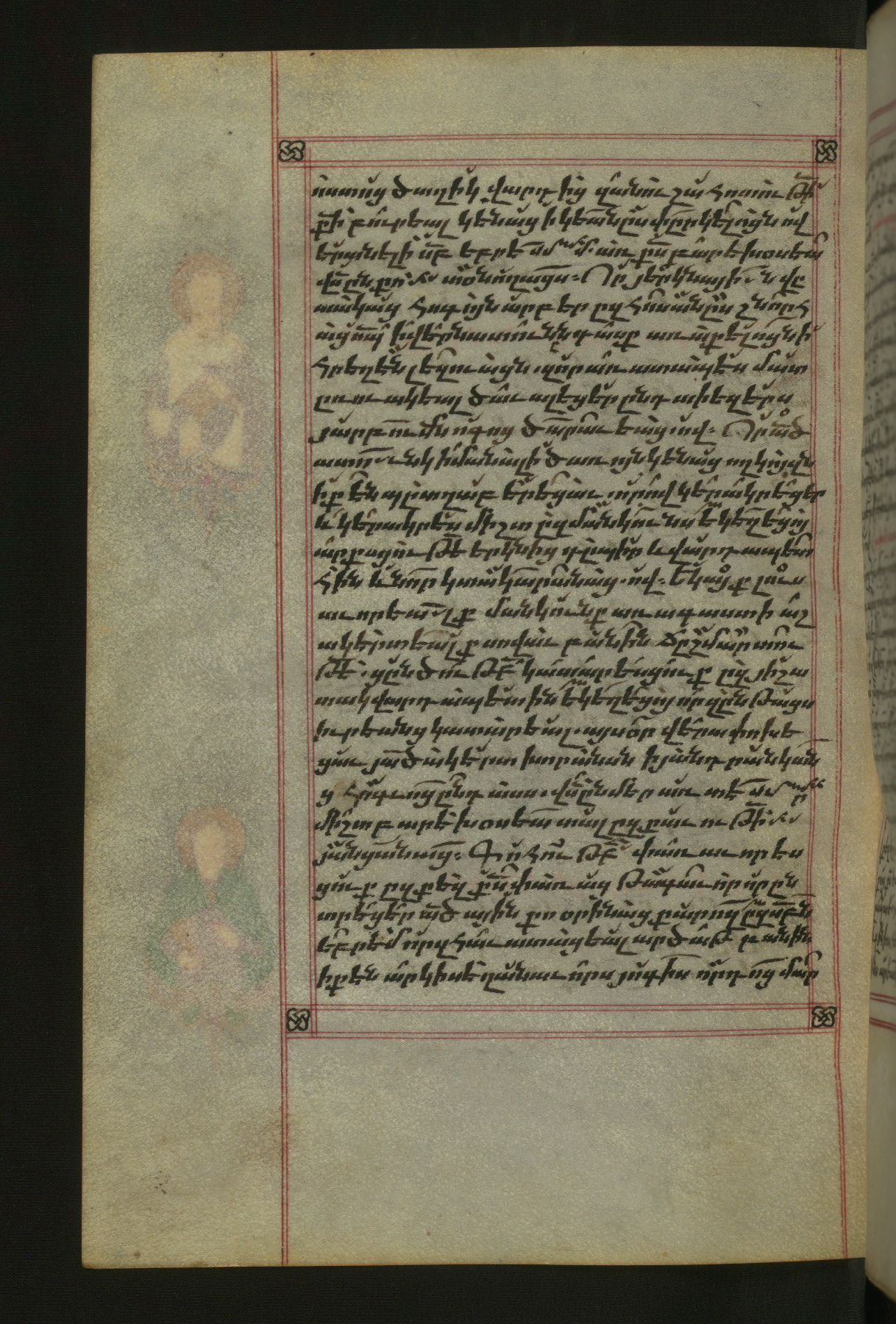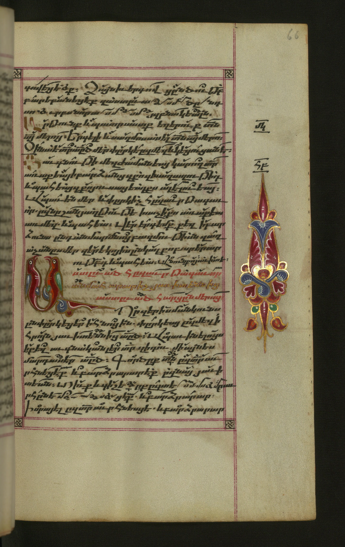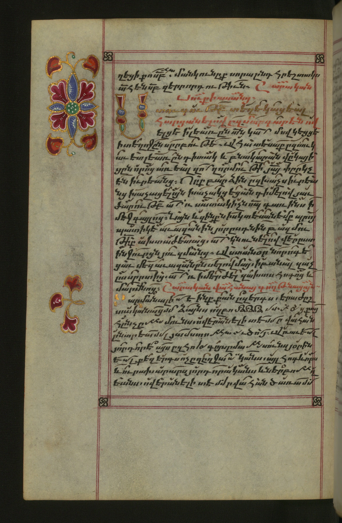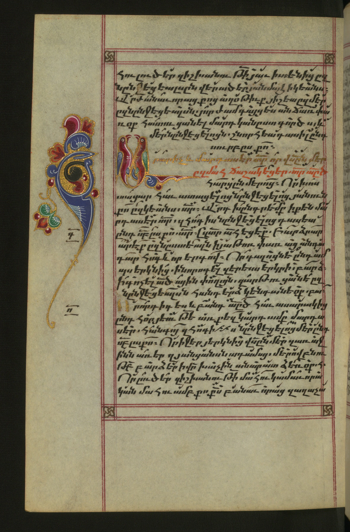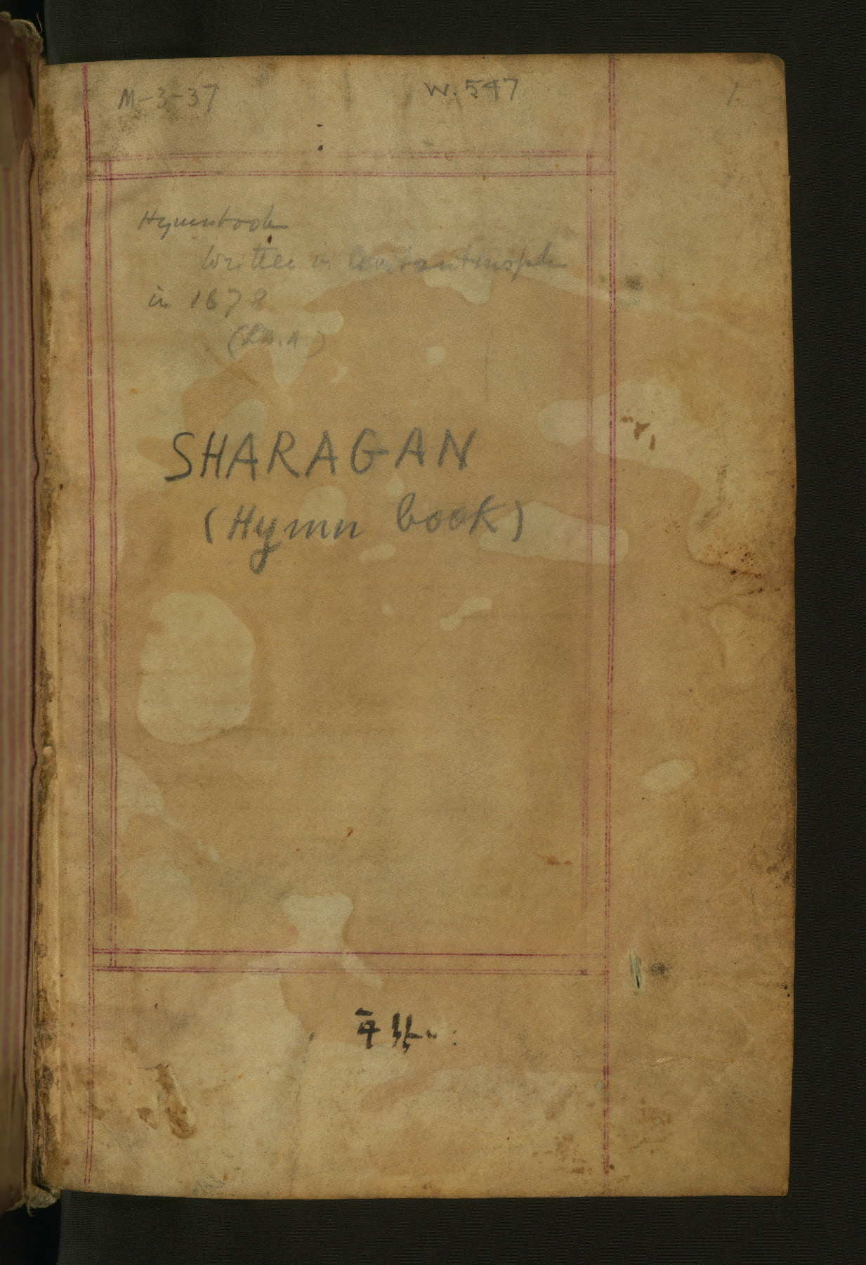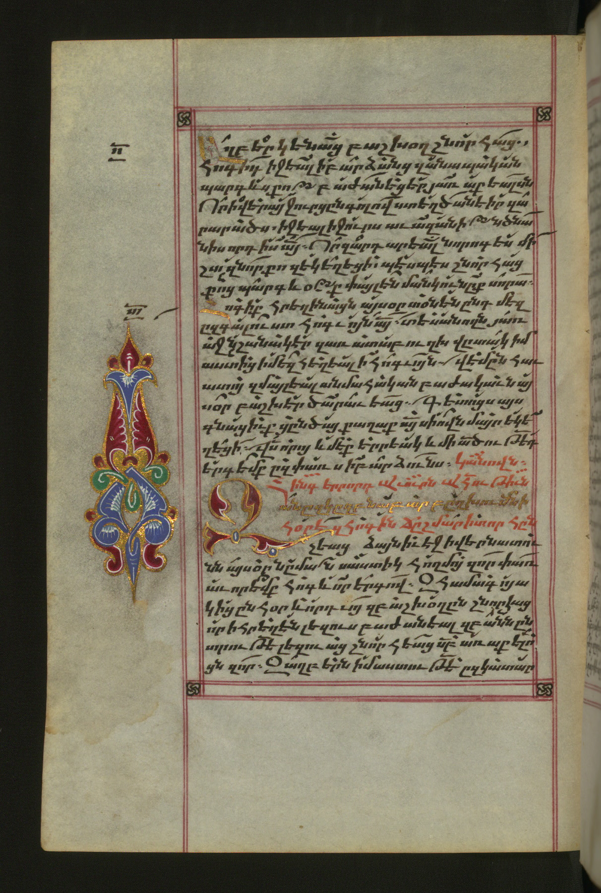 This hymnal was completed in Constantinople on August 15, 1678 [AE 1127], by the priest Yakob Pēligratc‘i, having been commissioned by Člav, son of Nawasard, as a dedication to his sons, Astuacatur and Sahak. The structure of the hymns adheres approximately to the standard Armenian hymnal (Շաբակնոց), with minor variations in order and a few substitutions (see Sanjian in the bibliography). The book is illuminated extensively, with thirty-eight full- and half-page polychrome miniatures against gold backgrounds, eight decorated head-pieces marking the principal divisions of the hymnal, and numerous marginal miniatures marking individual hymns, including biblical figures, saints, bishops, and vignettes. The style of the miniatures is largely in imitation of western European models, though more traditional Armenian and Byzantine influences stand out, such as the vibrant color palette, an iconic frontality for depictions of saints and bishops, and the highly abstracted floral motifs and zoomorphic incipits marking hymn divisions.