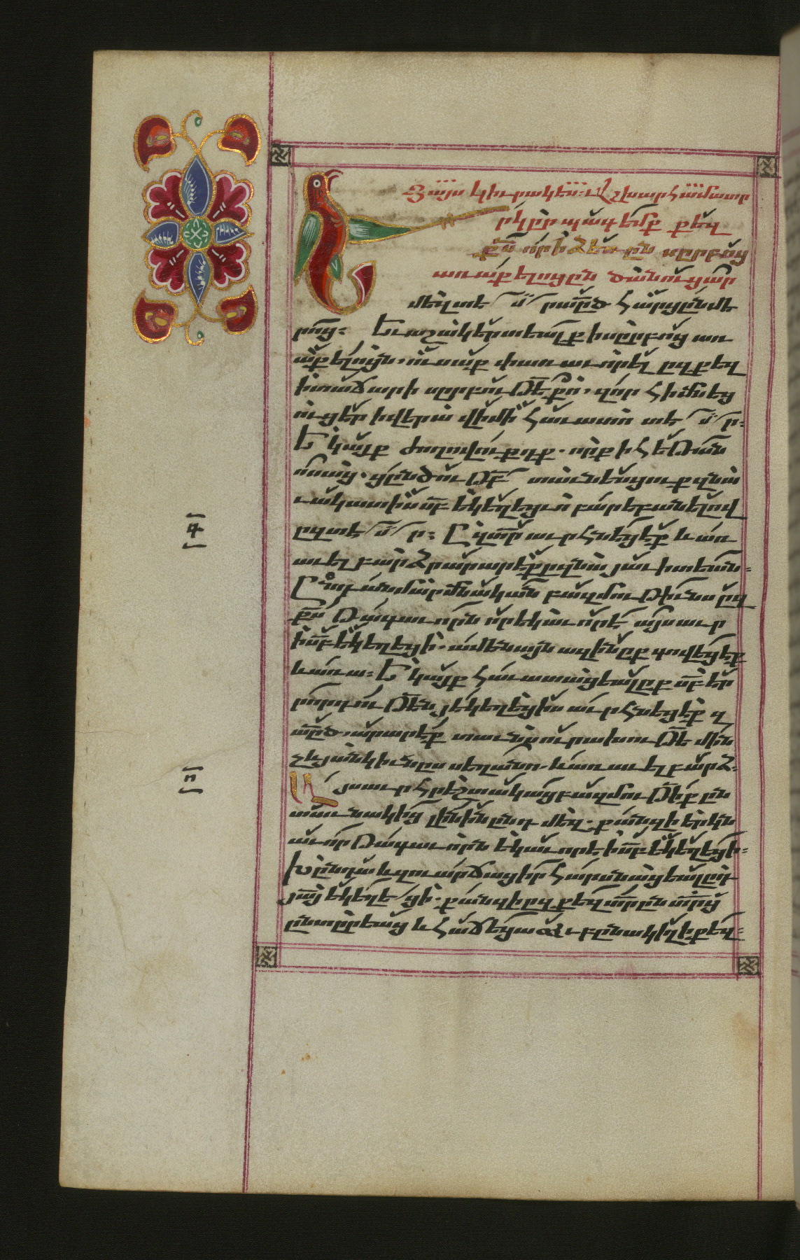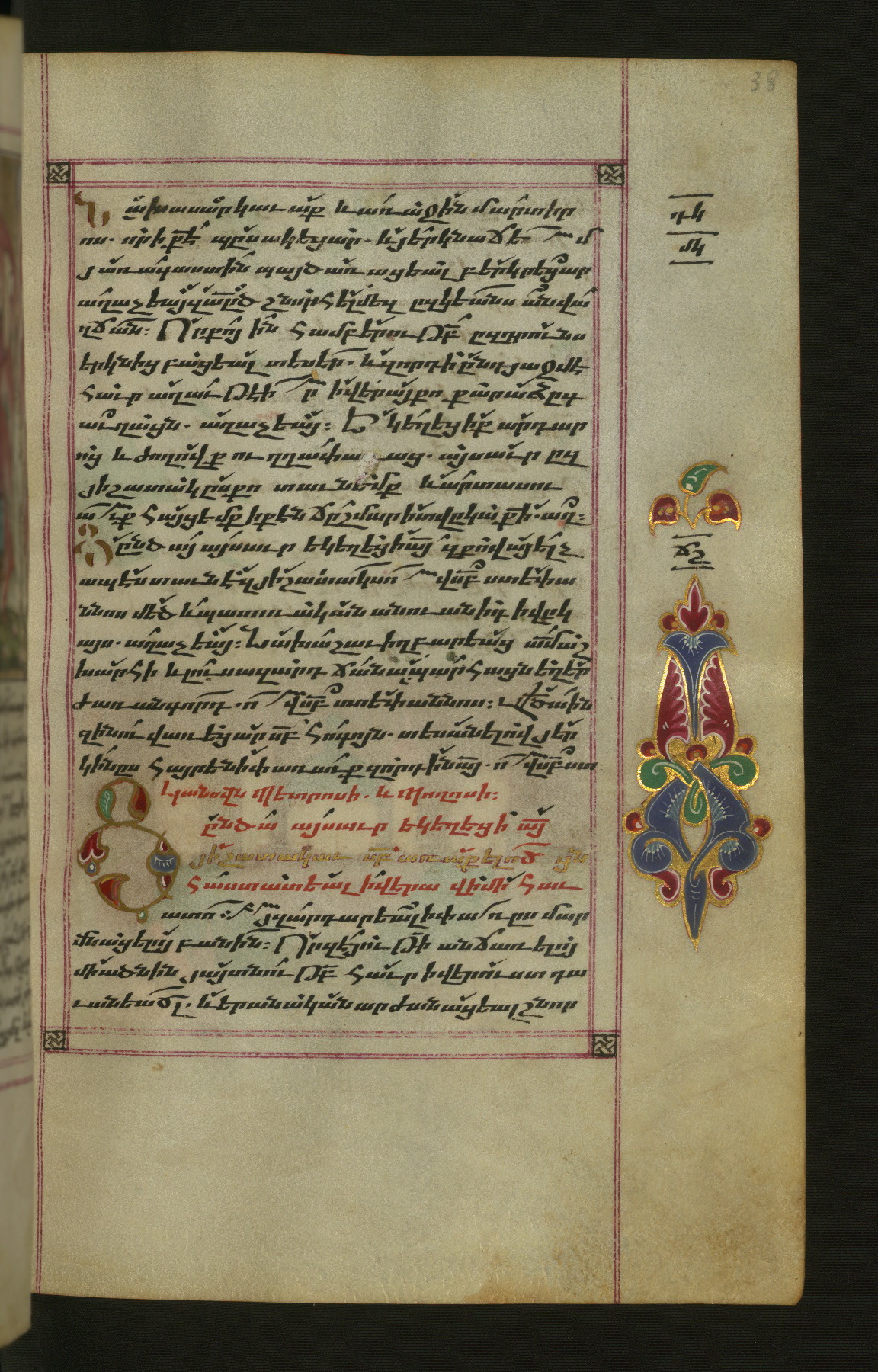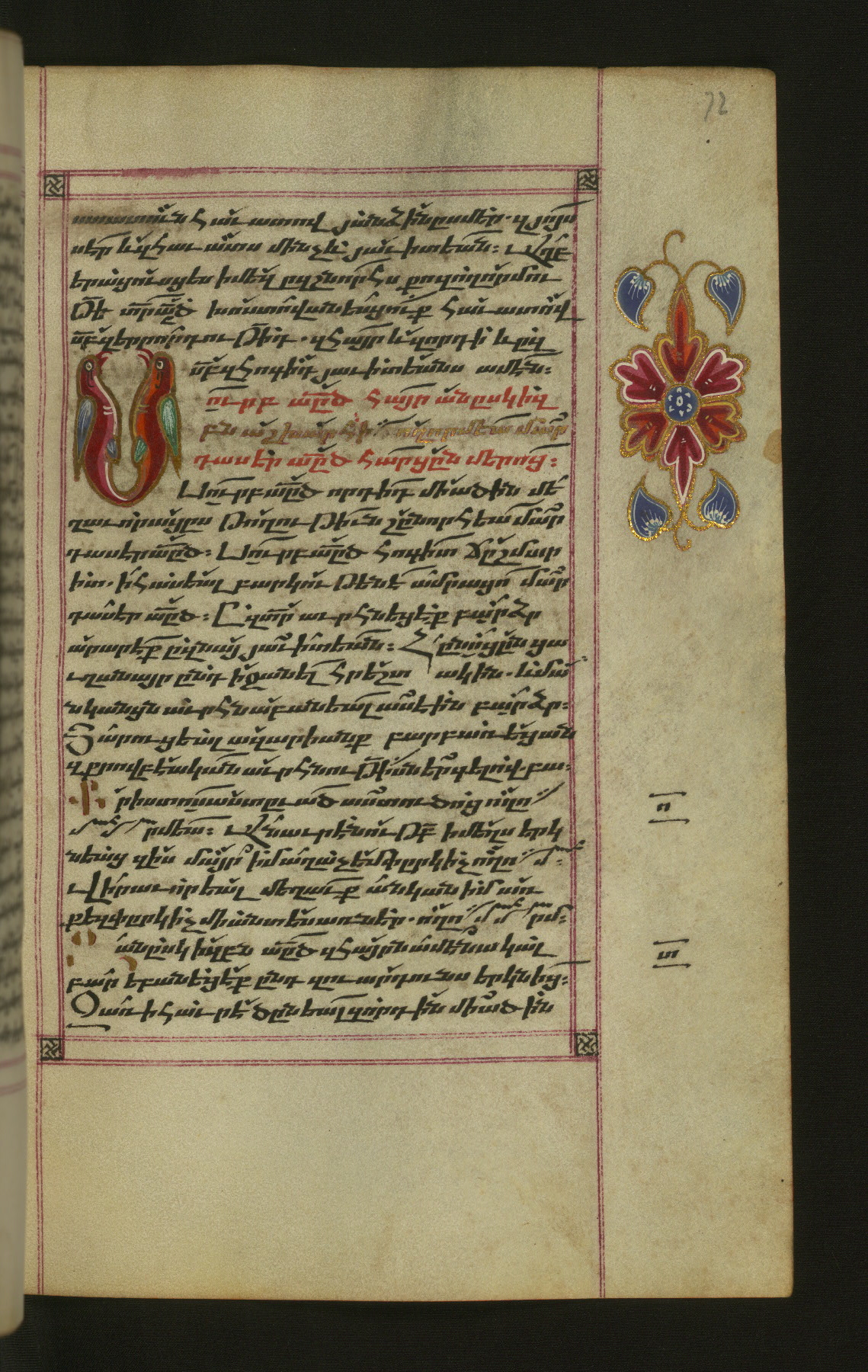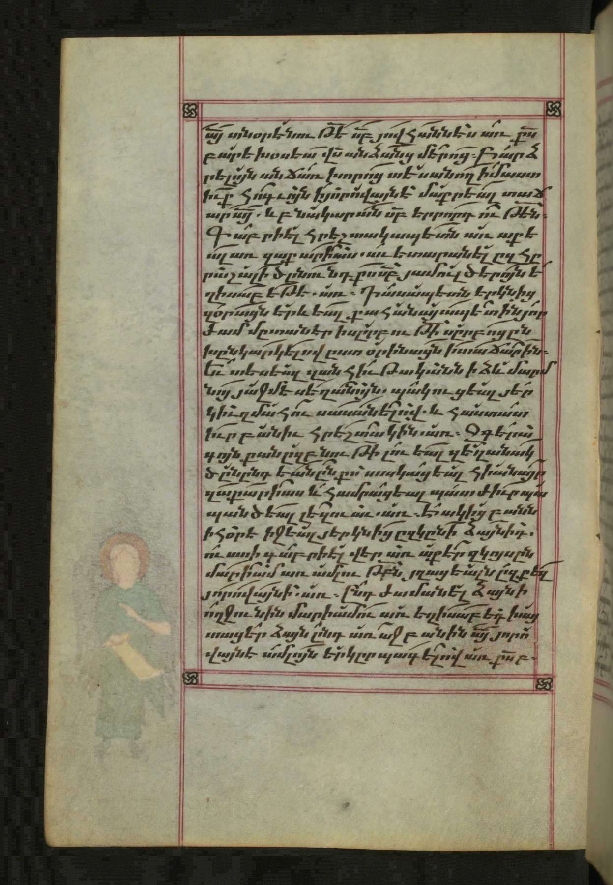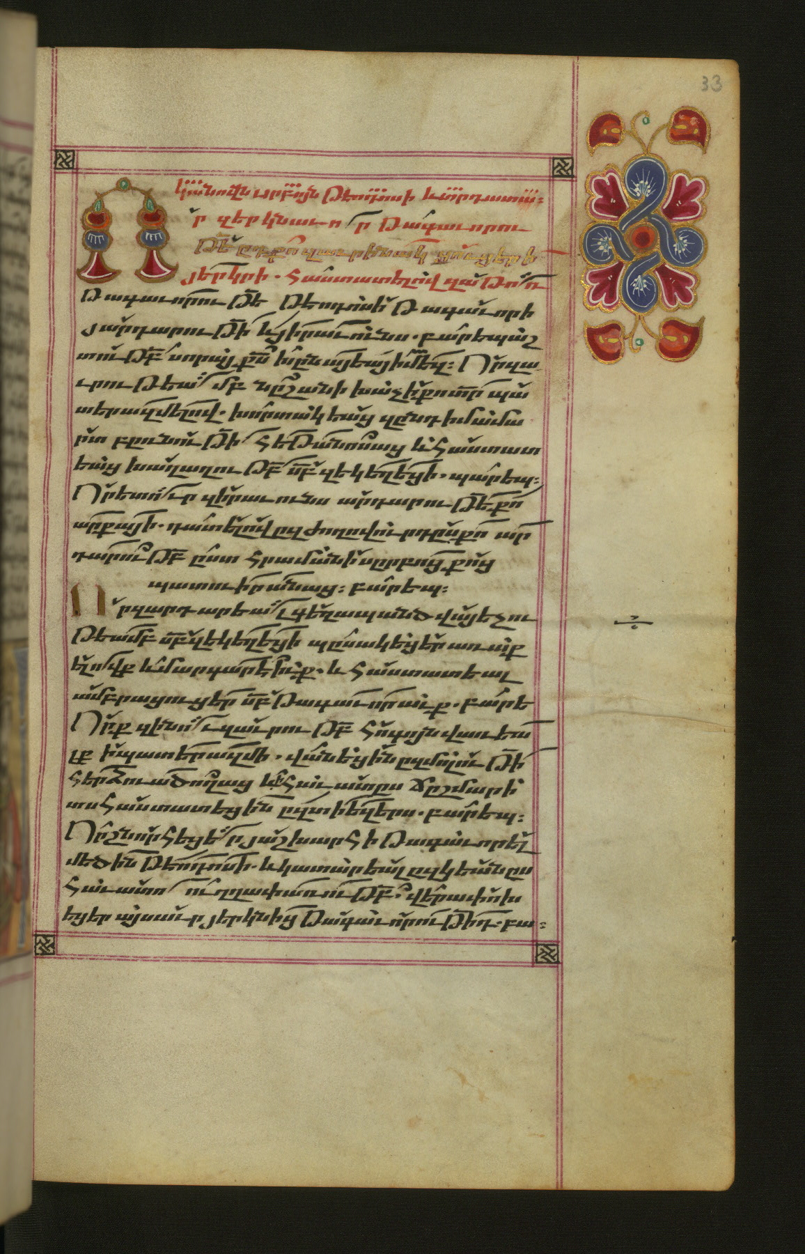 This hymnal was completed in Constantinople on August 15, 1678 [AE 1127], by the priest Yakob Pēligratc‘i, having been commissioned by Člav, son of Nawasard, as a dedication to his sons, Astuacatur and Sahak. The structure of the hymns adheres approximately to the standard Armenian hymnal (Շաբակնոց), with minor variations in order and a few substitutions (see Sanjian in the bibliography). The book is illuminated extensively, with thirty-eight full- and half-page polychrome miniatures against gold backgrounds, eight decorated head-pieces marking the principal divisions of the hymnal, and numerous marginal miniatures marking individual hymns, including biblical figures, saints, bishops, and vignettes. The style of the miniatures is largely in imitation of western European models, though more traditional Armenian and Byzantine influences stand out, such as the vibrant color palette, an iconic frontality for depictions of saints and bishops, and the highly abstracted floral motifs and zoomorphic incipits marking hymn divisions.
