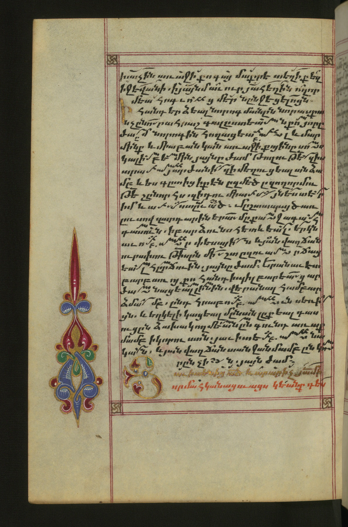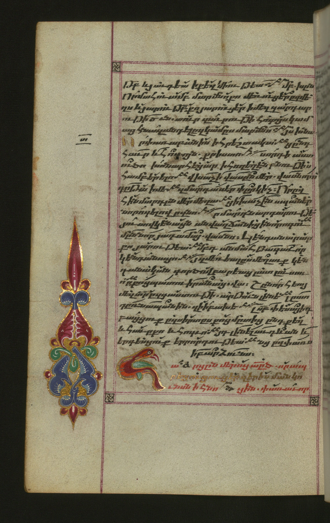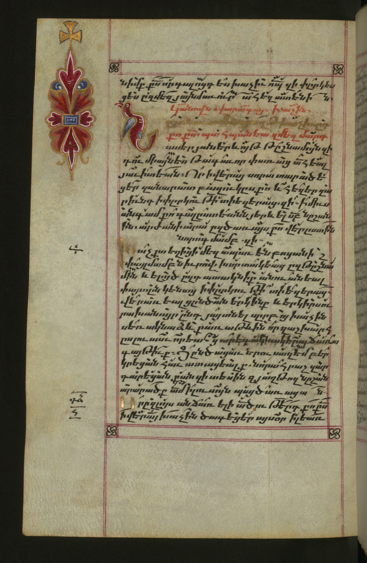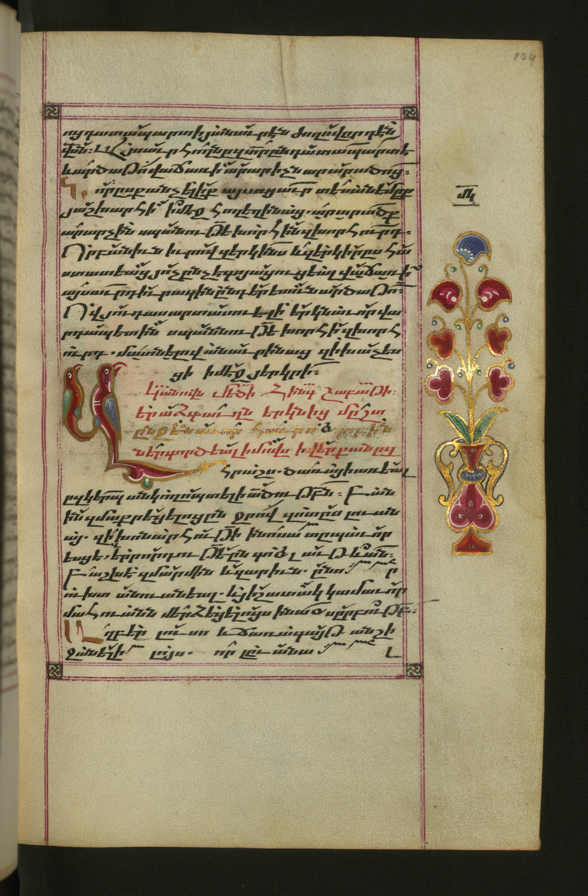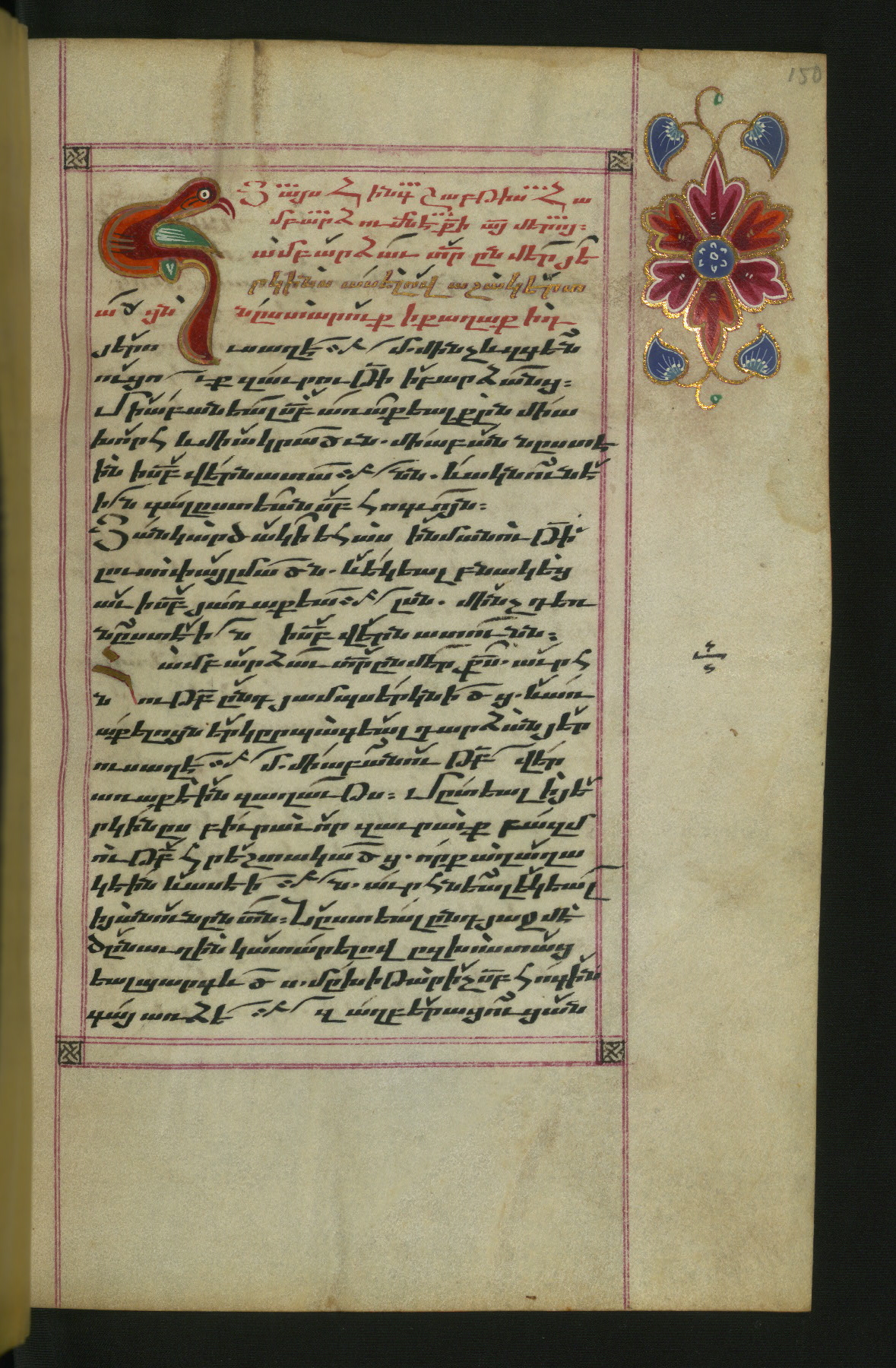 This hymnal was completed in Constantinople on August 15, 1678 [AE 1127], by the priest Yakob Pēligratc‘i, having been commissioned by Člav, son of Nawasard, as a dedication to his sons, Astuacatur and Sahak. The structure of the hymns adheres approximately to the standard Armenian hymnal (Շաբակնոց), with minor variations in order and a few substitutions (see Sanjian in the bibliography). The book is illuminated extensively, with thirty-eight full- and half-page polychrome miniatures against gold backgrounds, eight decorated head-pieces marking the principal divisions of the hymnal, and numerous marginal miniatures marking individual hymns, including biblical figures, saints, bishops, and vignettes. The style of the miniatures is largely in imitation of western European models, though more traditional Armenian and Byzantine influences stand out, such as the vibrant color palette, an iconic frontality for depictions of saints and bishops, and the highly abstracted floral motifs and zoomorphic incipits marking hymn divisions.