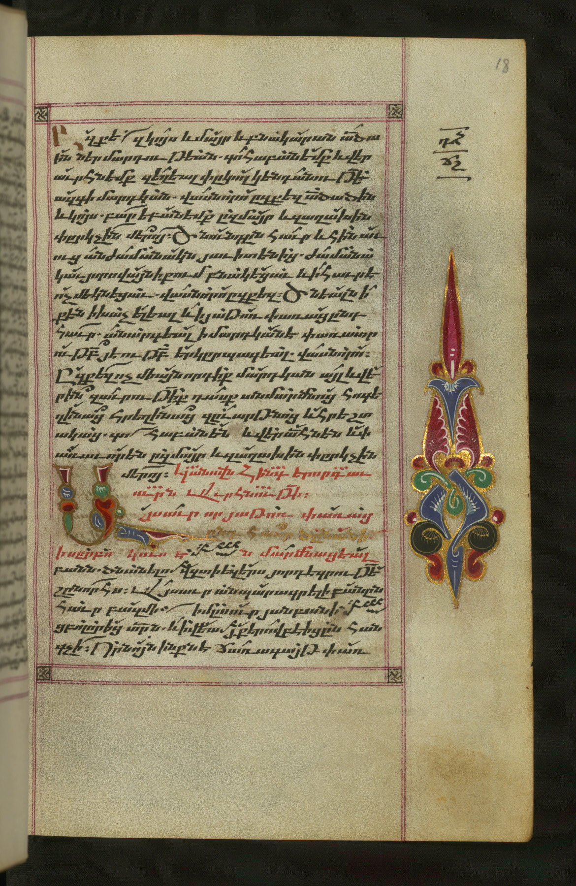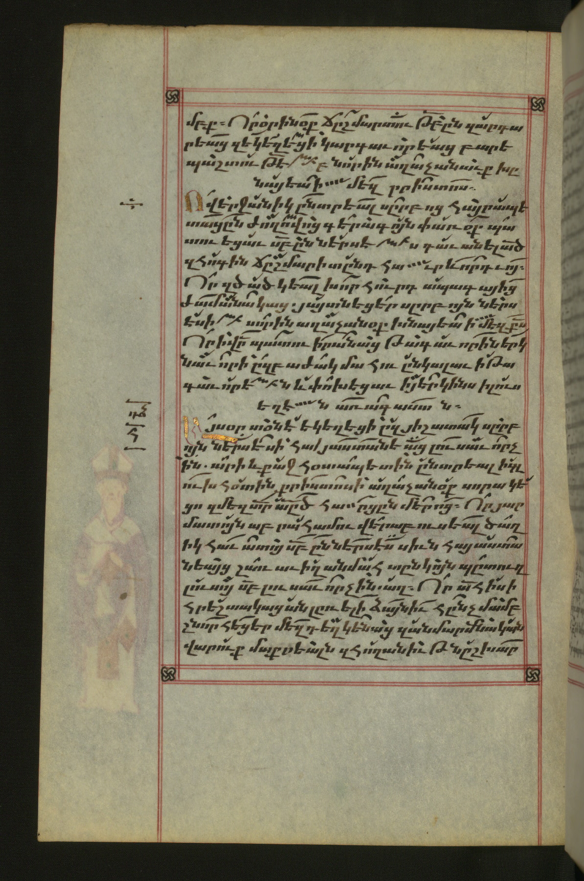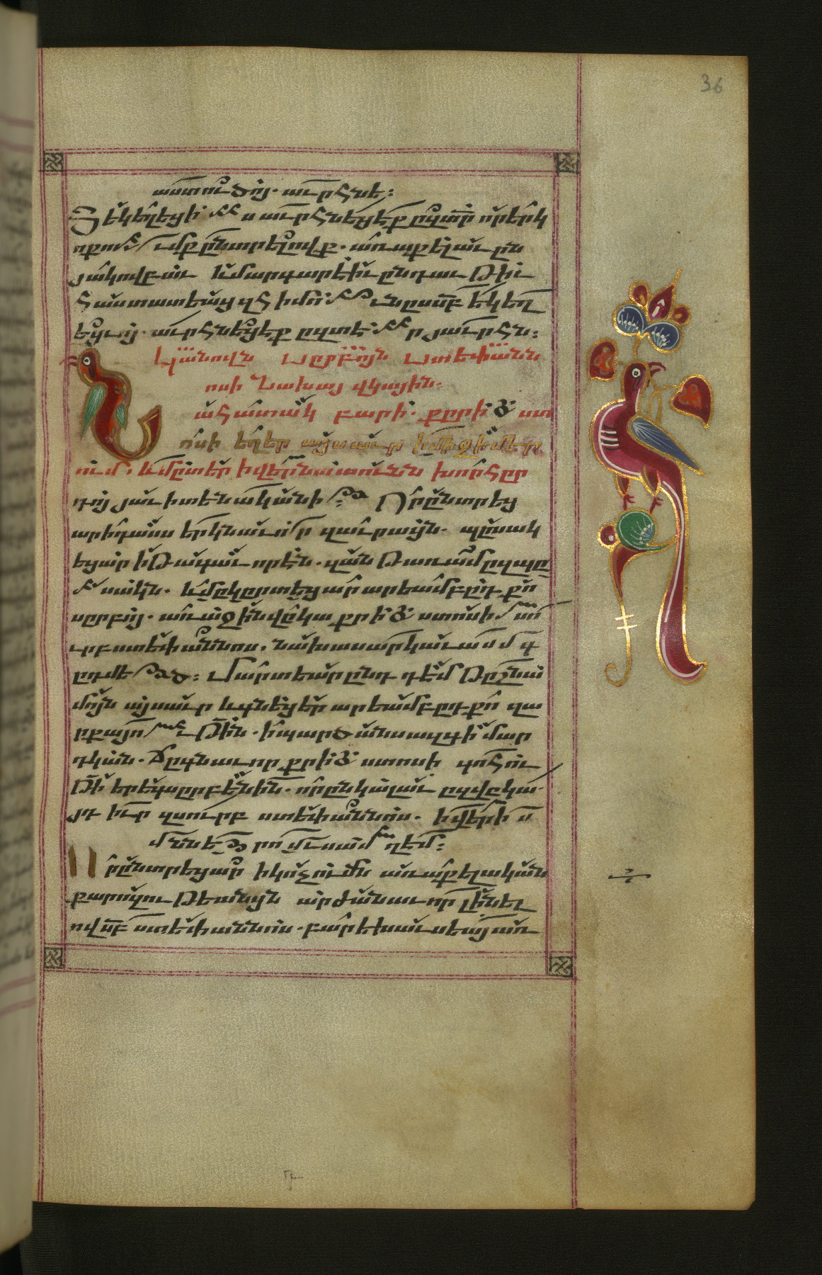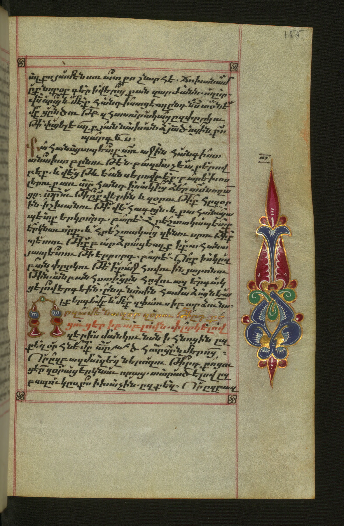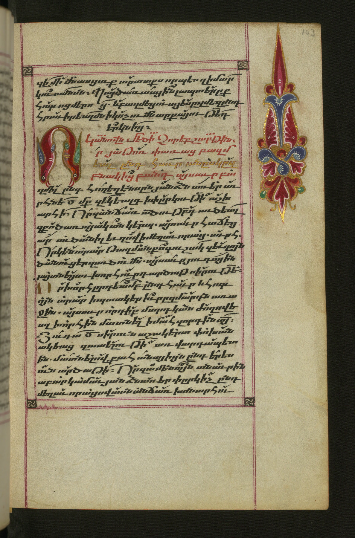 This hymnal was completed in Constantinople on August 15, 1678 [AE 1127], by the priest Yakob Pēligratc‘i, having been commissioned by Člav, son of Nawasard, as a dedication to his sons, Astuacatur and Sahak. The structure of the hymns adheres approximately to the standard Armenian hymnal (Շաբակնոց), with minor variations in order and a few substitutions (see Sanjian in the bibliography). The book is illuminated extensively, with thirty-eight full- and half-page polychrome miniatures against gold backgrounds, eight decorated head-pieces marking the principal divisions of the hymnal, and numerous marginal miniatures marking individual hymns, including biblical figures, saints, bishops, and vignettes. The style of the miniatures is largely in imitation of western European models, though more traditional Armenian and Byzantine influences stand out, such as the vibrant color palette, an iconic frontality for depictions of saints and bishops, and the highly abstracted floral motifs and zoomorphic incipits marking hymn divisions.