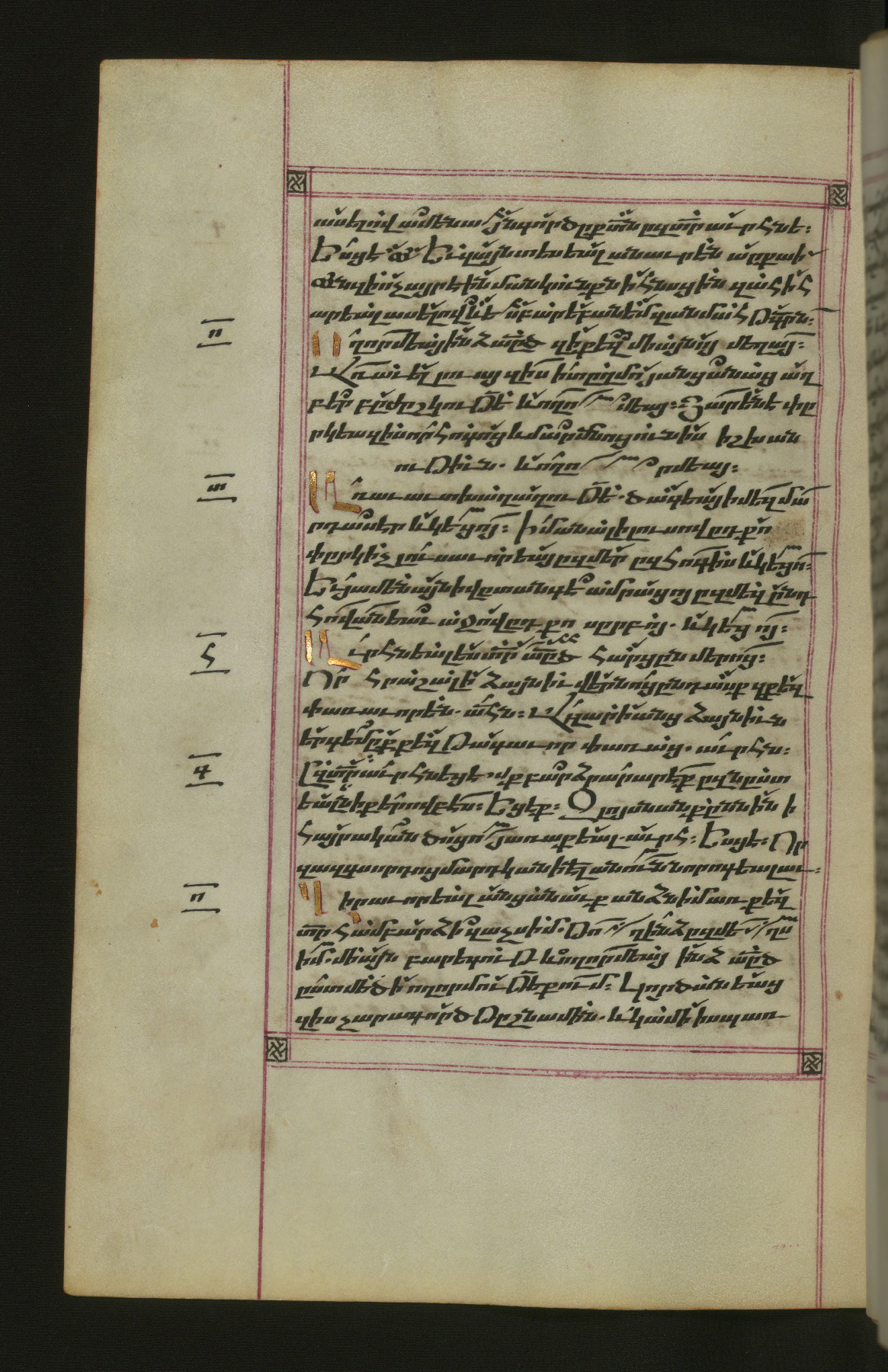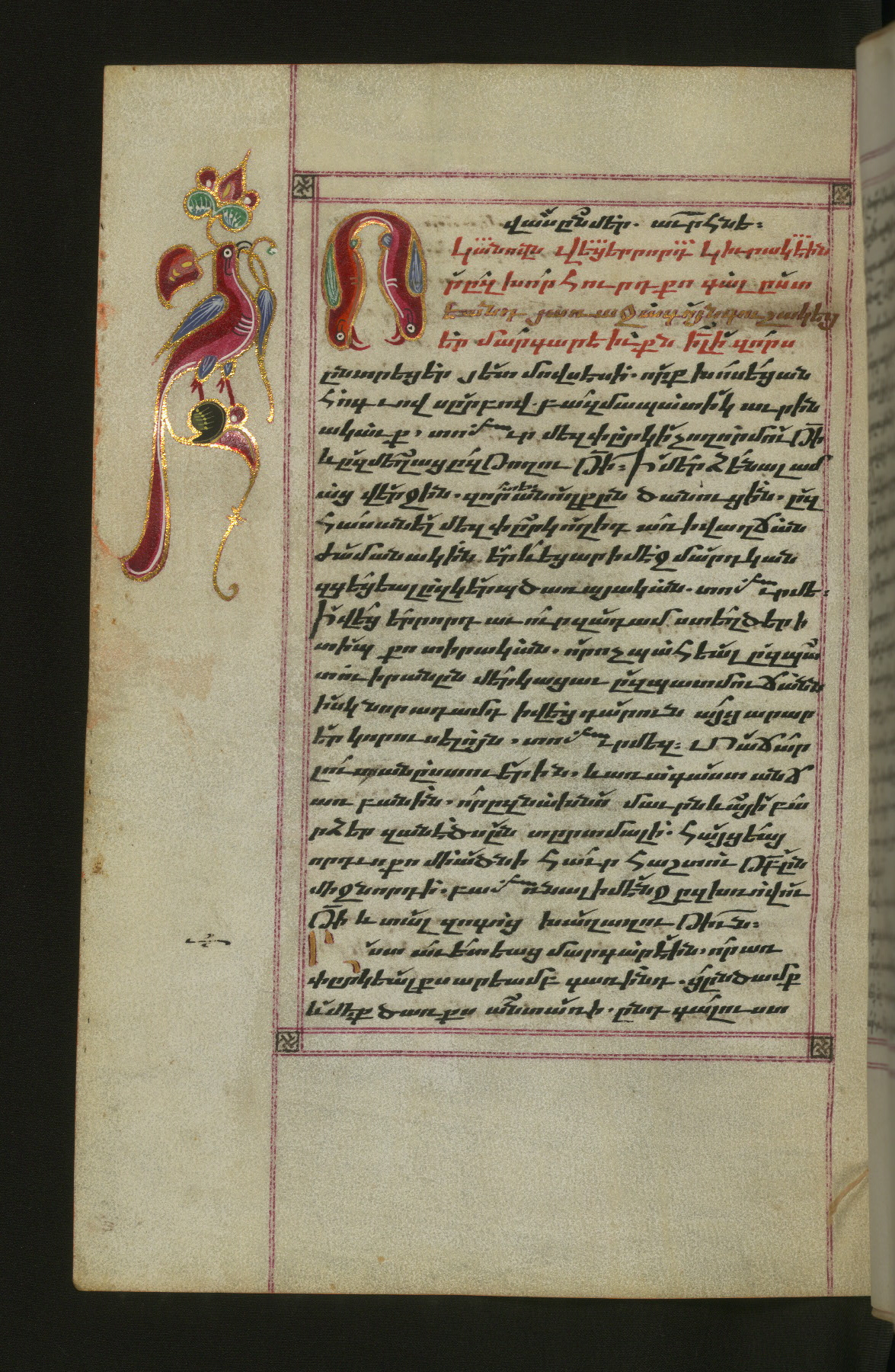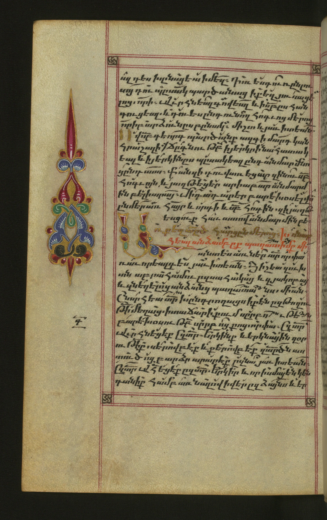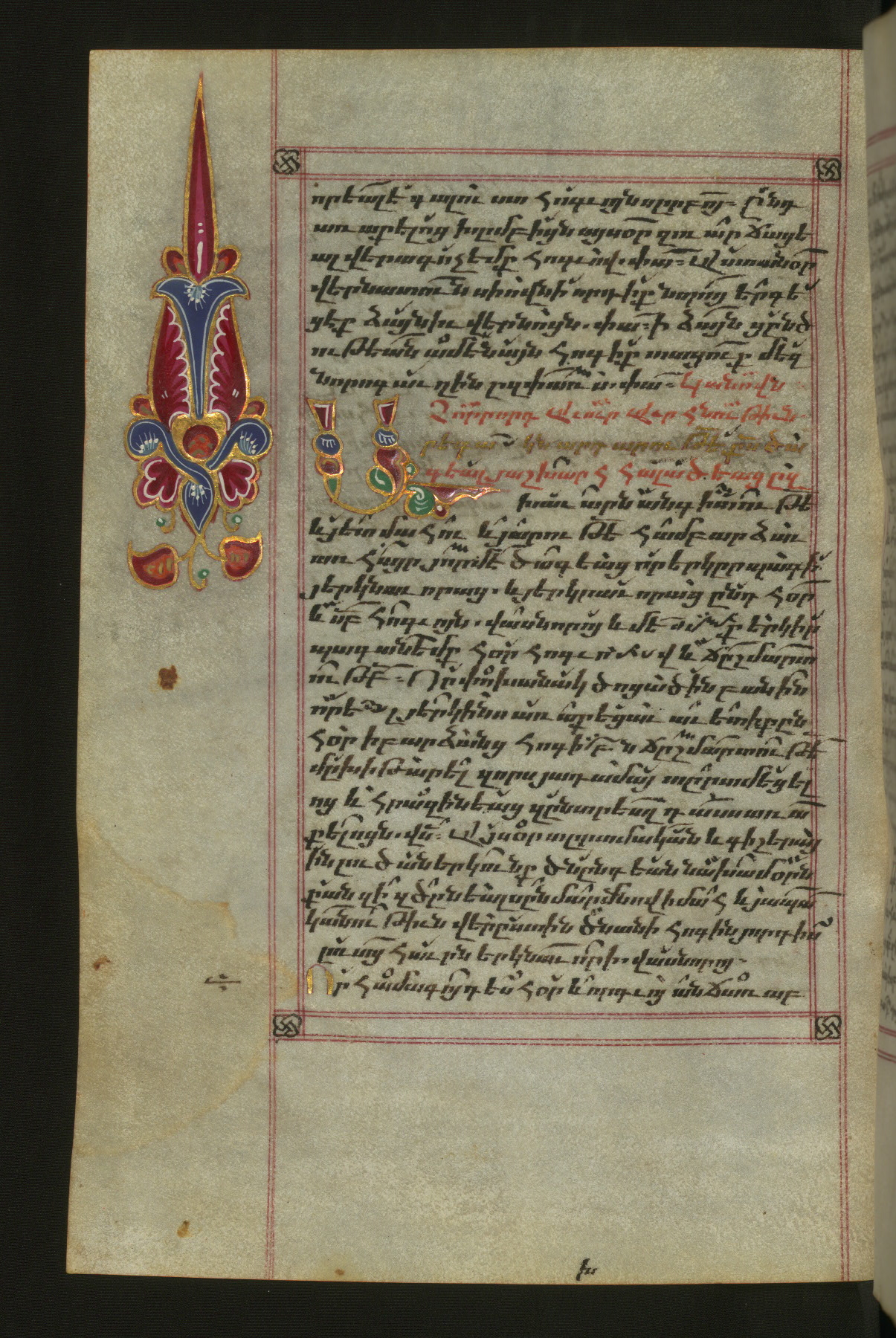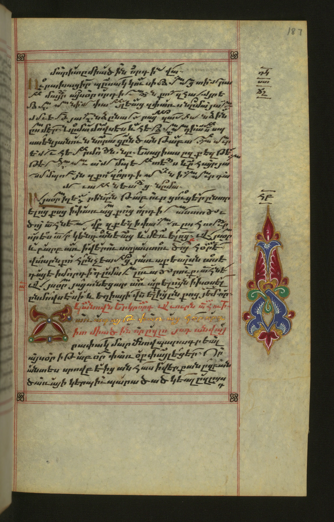 This hymnal was completed in Constantinople on August 15, 1678 [AE 1127], by the priest Yakob Pēligratc‘i, having been commissioned by Člav, son of Nawasard, as a dedication to his sons, Astuacatur and Sahak. The structure of the hymns adheres approximately to the standard Armenian hymnal (Շաբակնոց), with minor variations in order and a few substitutions (see Sanjian in the bibliography). The book is illuminated extensively, with thirty-eight full- and half-page polychrome miniatures against gold backgrounds, eight decorated head-pieces marking the principal divisions of the hymnal, and numerous marginal miniatures marking individual hymns, including biblical figures, saints, bishops, and vignettes. The style of the miniatures is largely in imitation of western European models, though more traditional Armenian and Byzantine influences stand out, such as the vibrant color palette, an iconic frontality for depictions of saints and bishops, and the highly abstracted floral motifs and zoomorphic incipits marking hymn divisions.