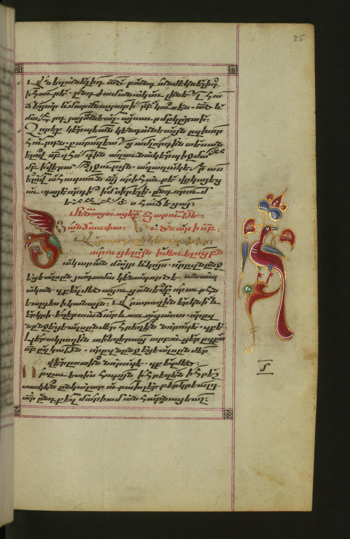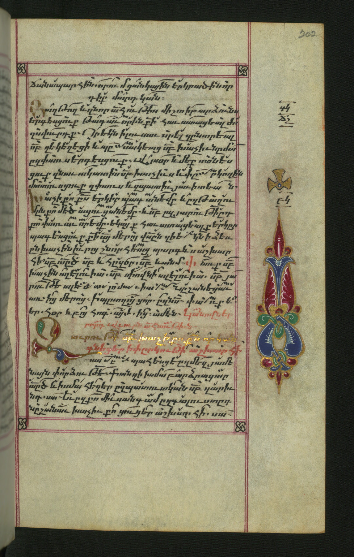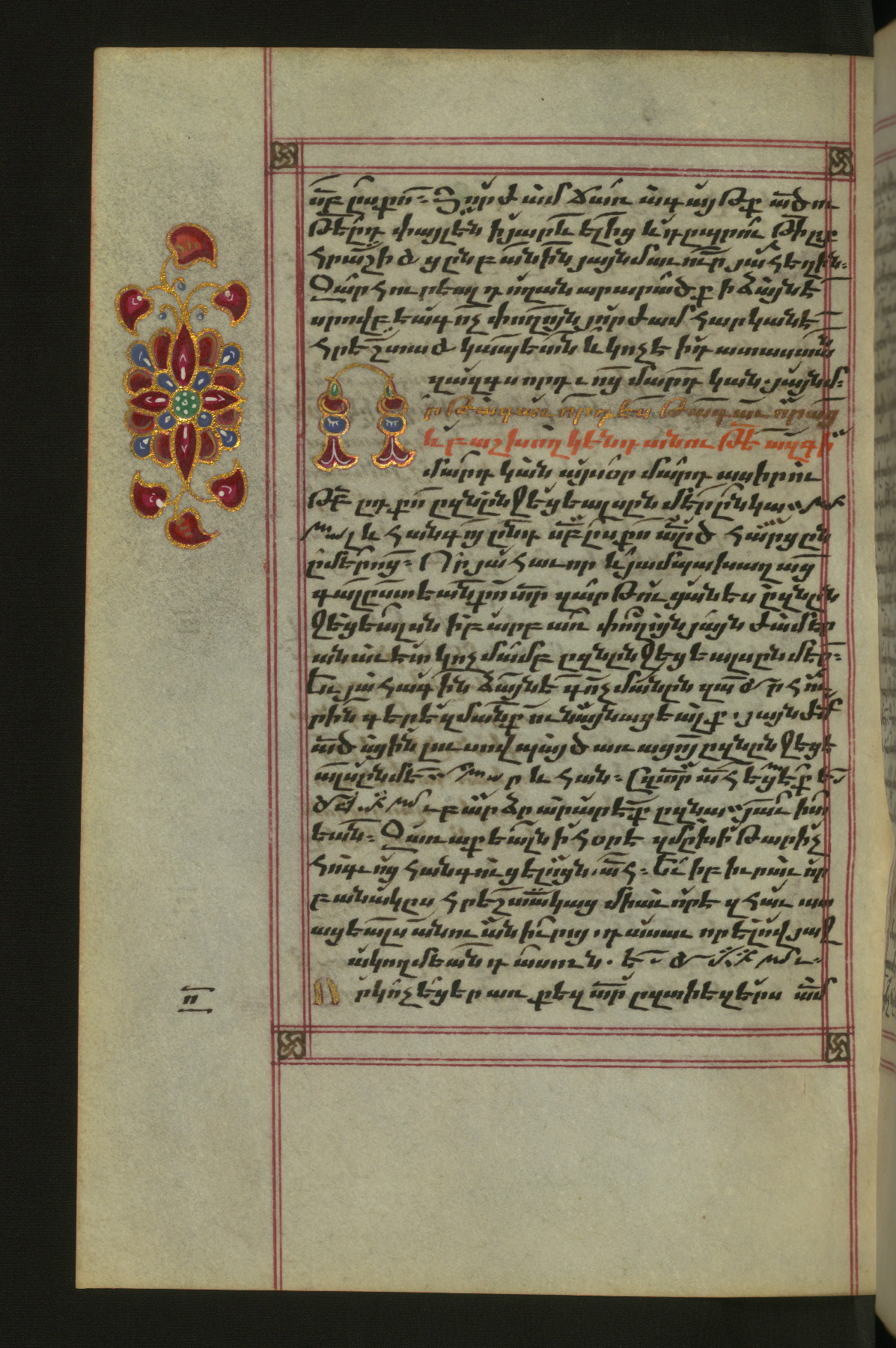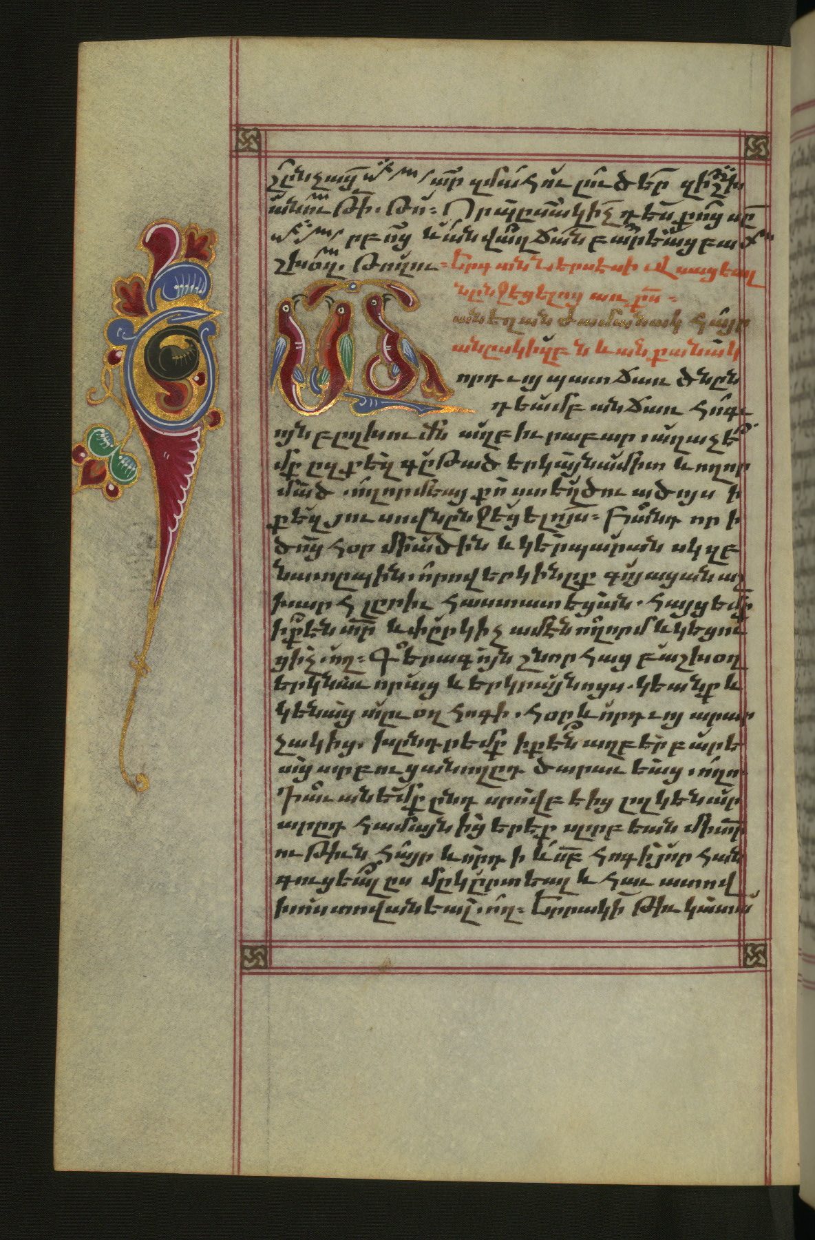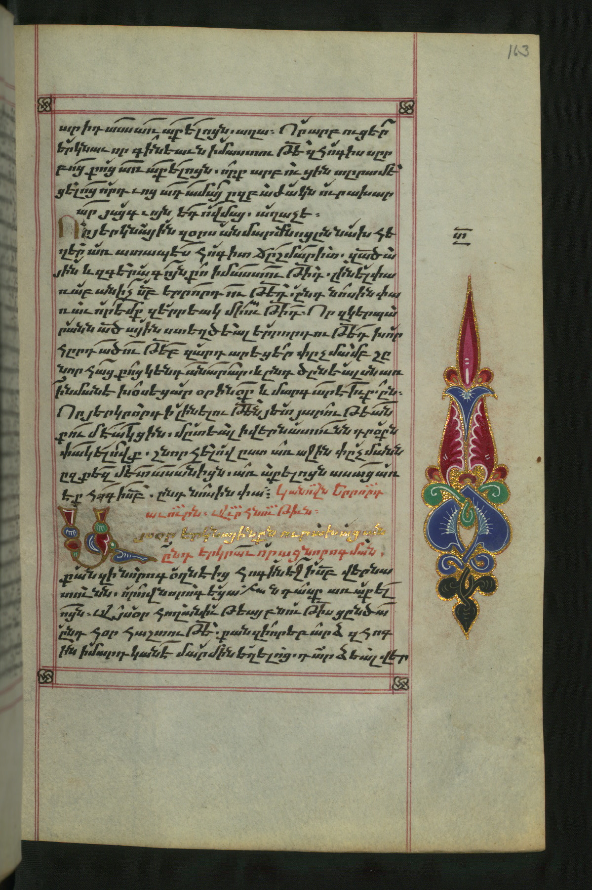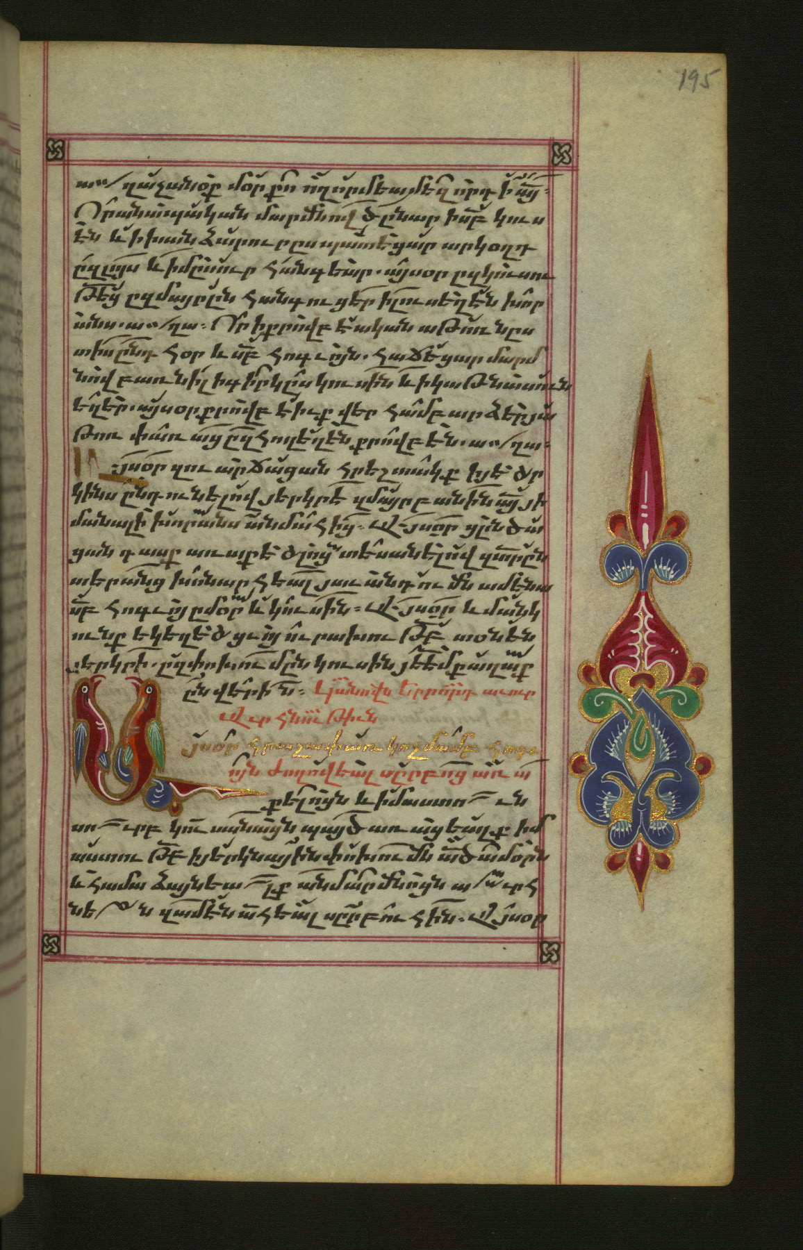 This hymnal was completed in Constantinople on August 15, 1678 [AE 1127], by the priest Yakob Pēligratc‘i, having been commissioned by Člav, son of Nawasard, as a dedication to his sons, Astuacatur and Sahak. The structure of the hymns adheres approximately to the standard Armenian hymnal (Շաբակնոց), with minor variations in order and a few substitutions (see Sanjian in the bibliography). The book is illuminated extensively, with thirty-eight full- and half-page polychrome miniatures against gold backgrounds, eight decorated head-pieces marking the principal divisions of the hymnal, and numerous marginal miniatures marking individual hymns, including biblical figures, saints, bishops, and vignettes. The style of the miniatures is largely in imitation of western European models, though more traditional Armenian and Byzantine influences stand out, such as the vibrant color palette, an iconic frontality for depictions of saints and bishops, and the highly abstracted floral motifs and zoomorphic incipits marking hymn divisions.