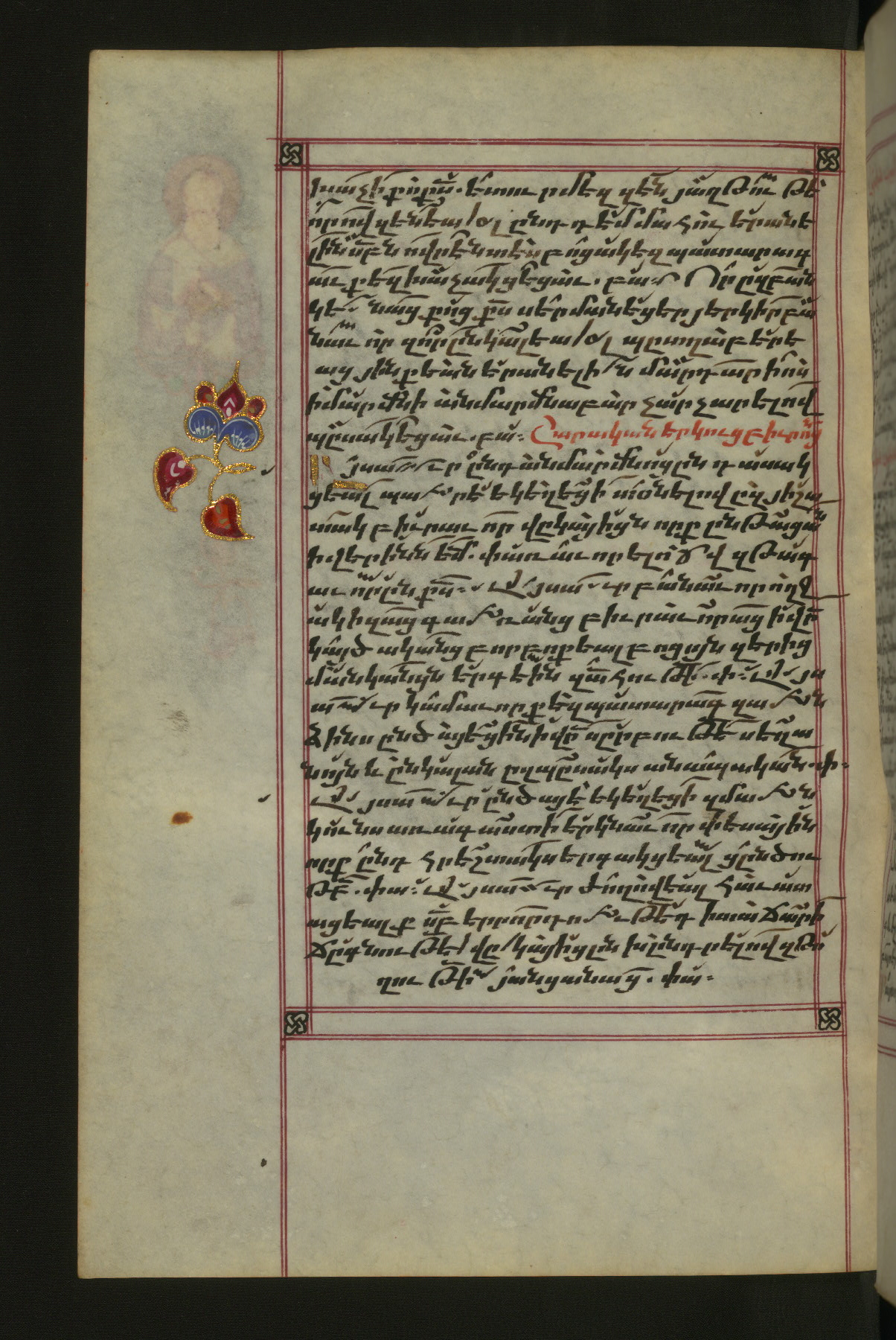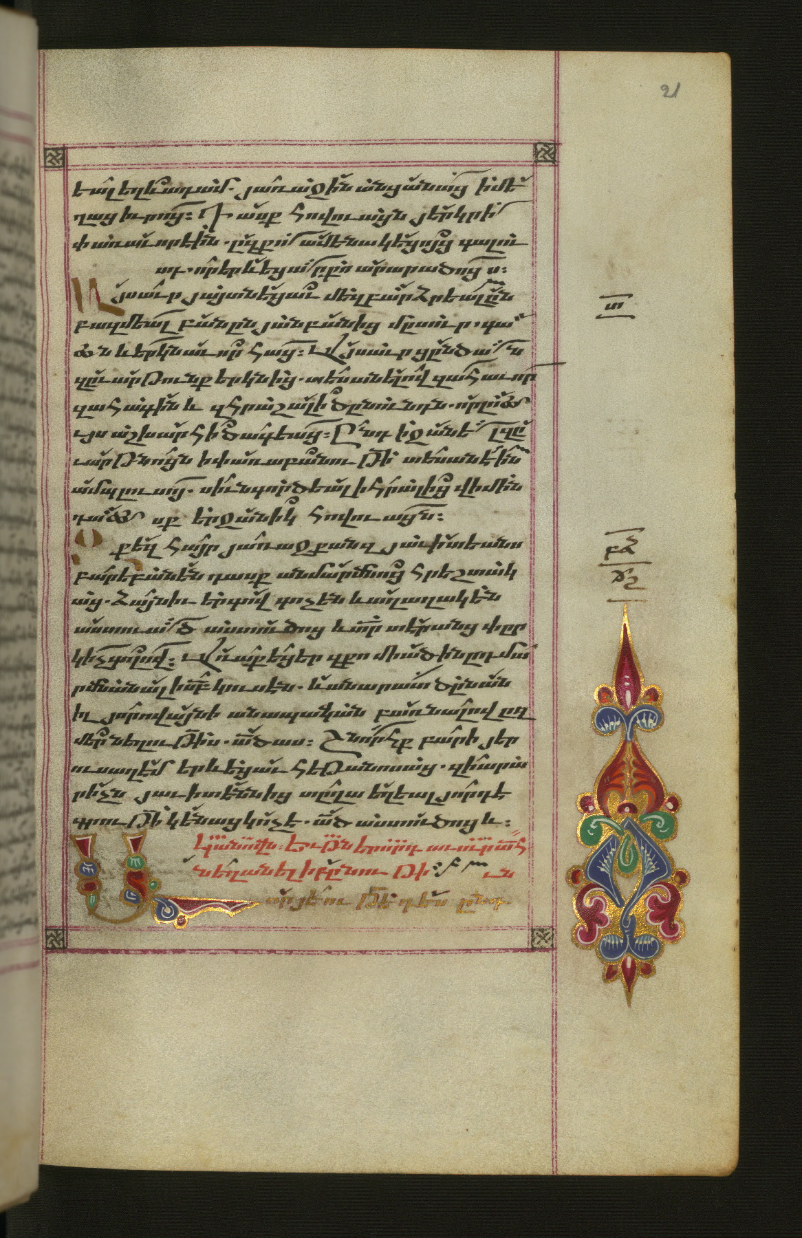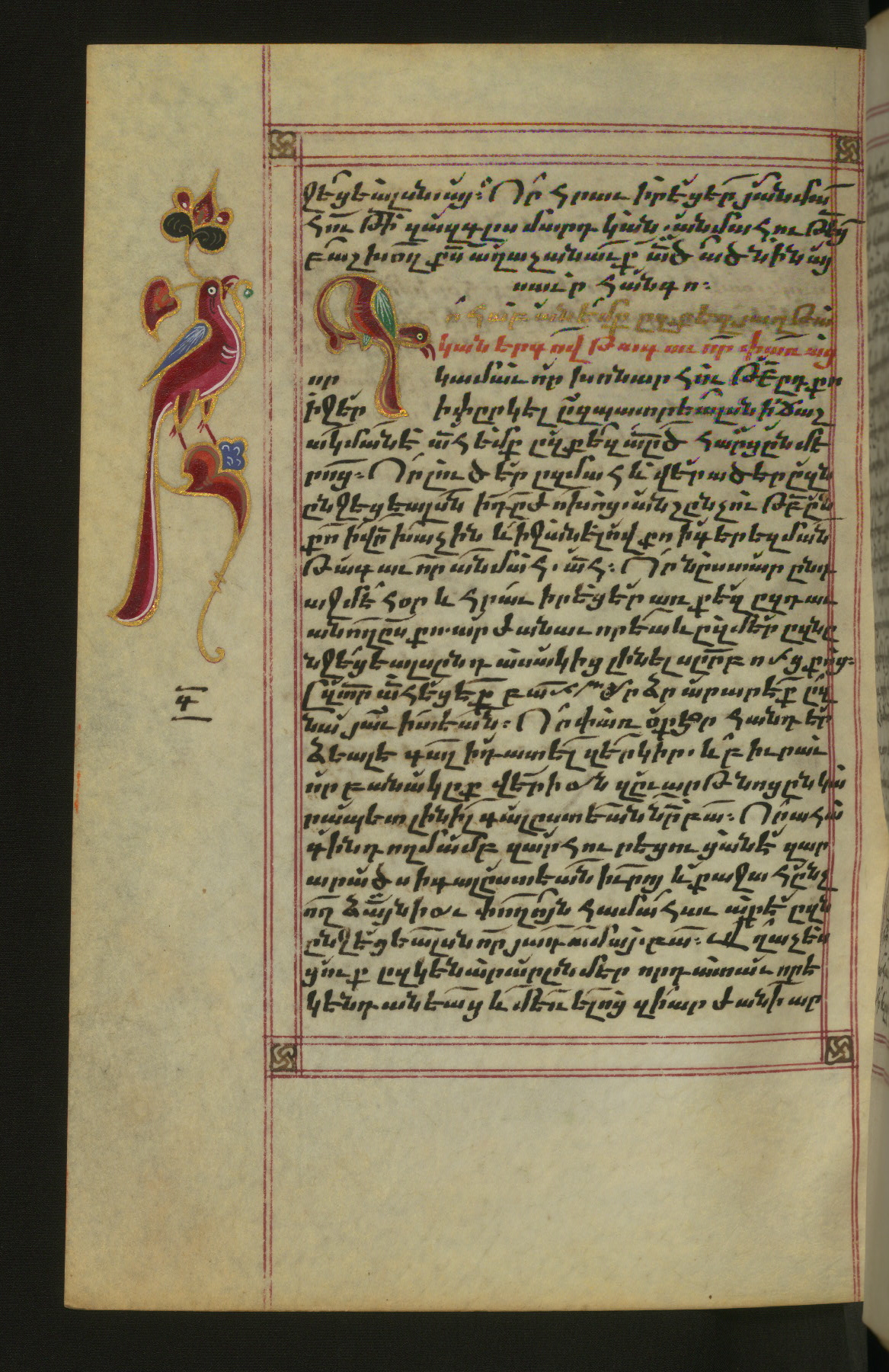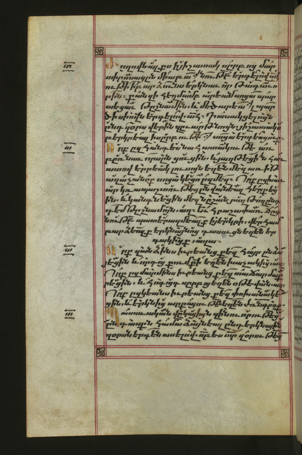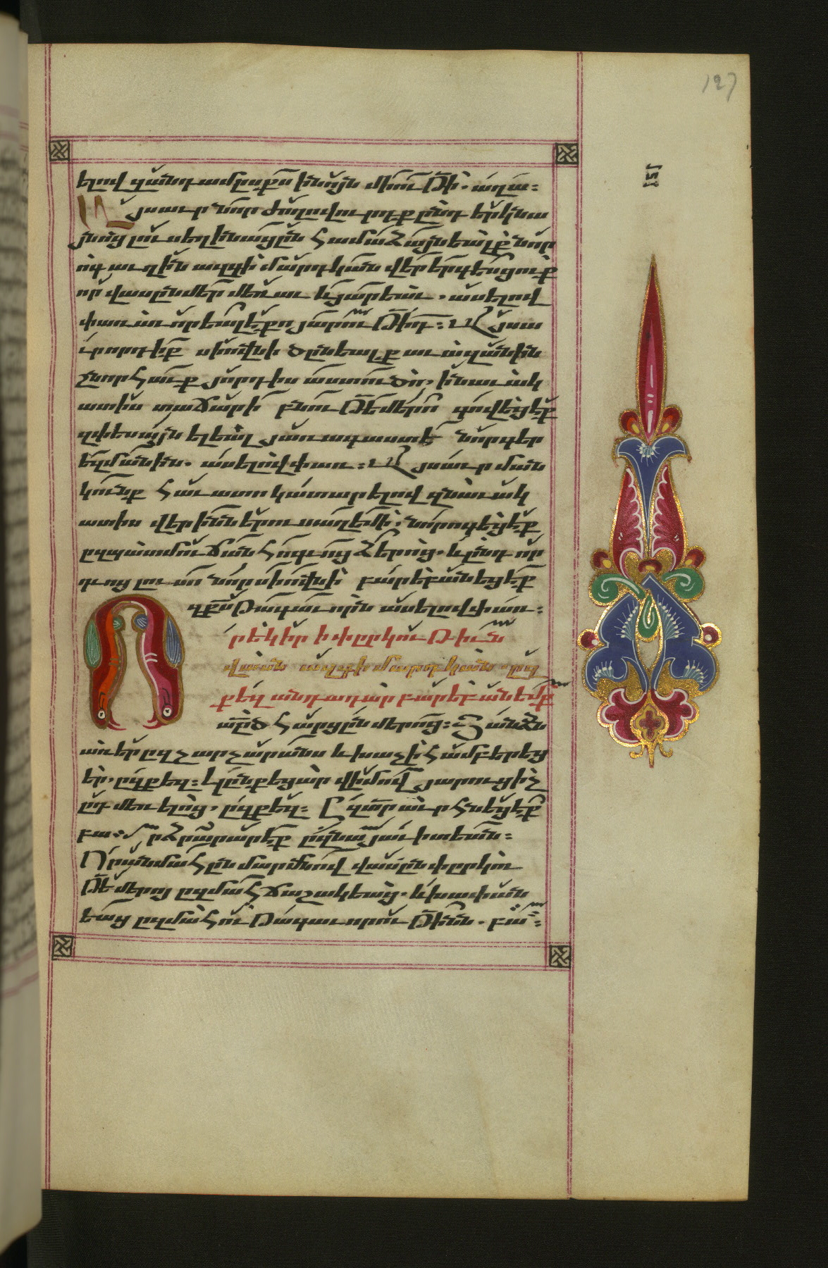 This hymnal was completed in Constantinople on August 15, 1678 [AE 1127], by the priest Yakob Pēligratc‘i, having been commissioned by Člav, son of Nawasard, as a dedication to his sons, Astuacatur and Sahak. The structure of the hymns adheres approximately to the standard Armenian hymnal (Շաբակնոց), with minor variations in order and a few substitutions (see Sanjian in the bibliography). The book is illuminated extensively, with thirty-eight full- and half-page polychrome miniatures against gold backgrounds, eight decorated head-pieces marking the principal divisions of the hymnal, and numerous marginal miniatures marking individual hymns, including biblical figures, saints, bishops, and vignettes. The style of the miniatures is largely in imitation of western European models, though more traditional Armenian and Byzantine influences stand out, such as the vibrant color palette, an iconic frontality for depictions of saints and bishops, and the highly abstracted floral motifs and zoomorphic incipits marking hymn divisions.