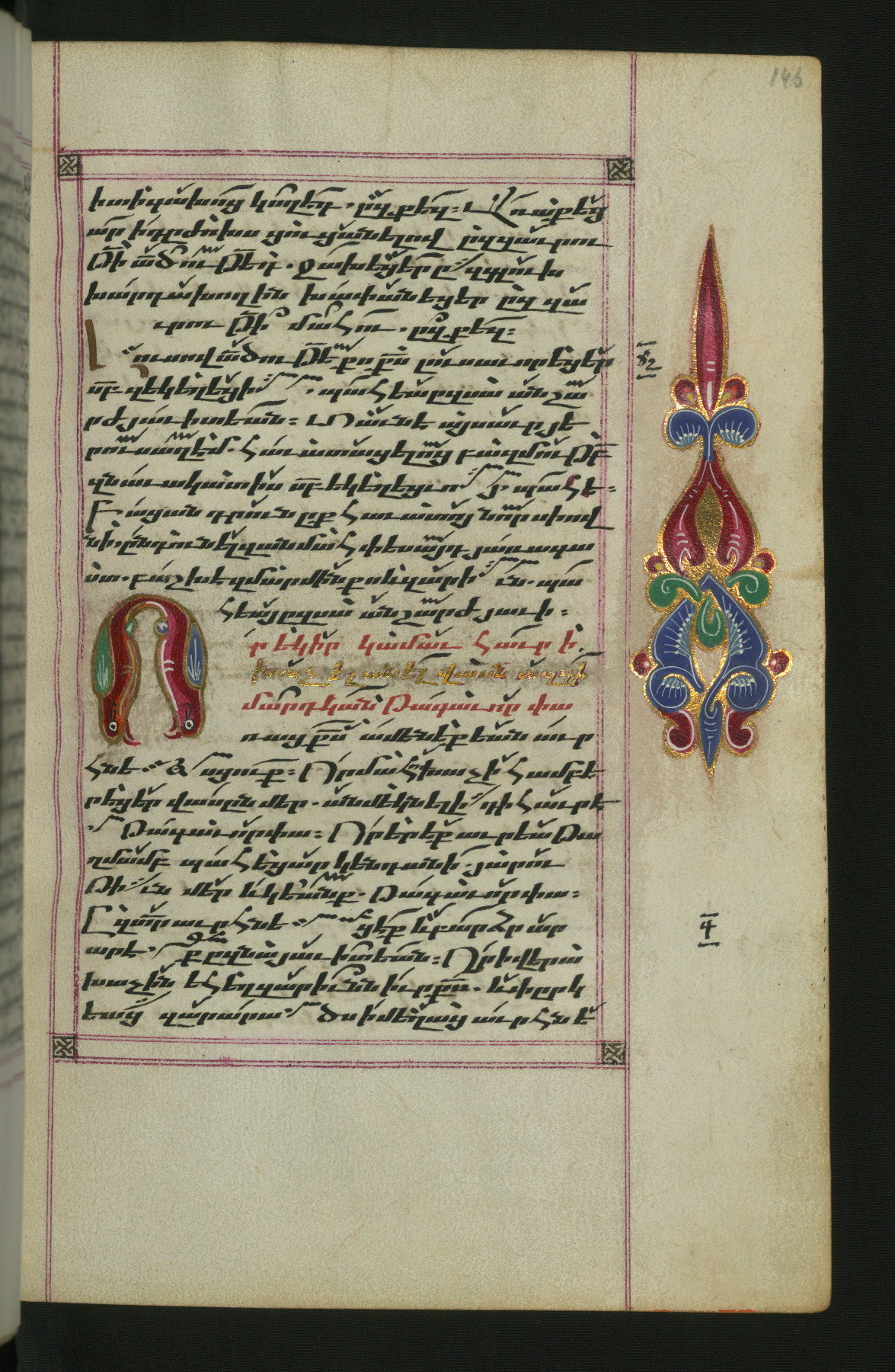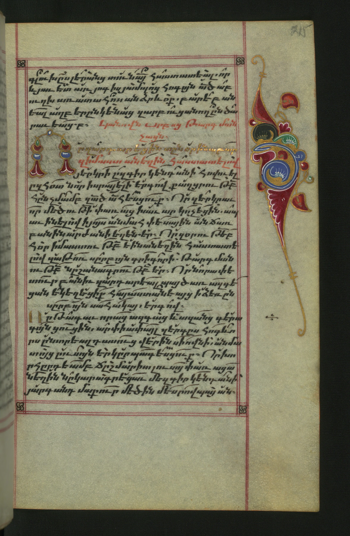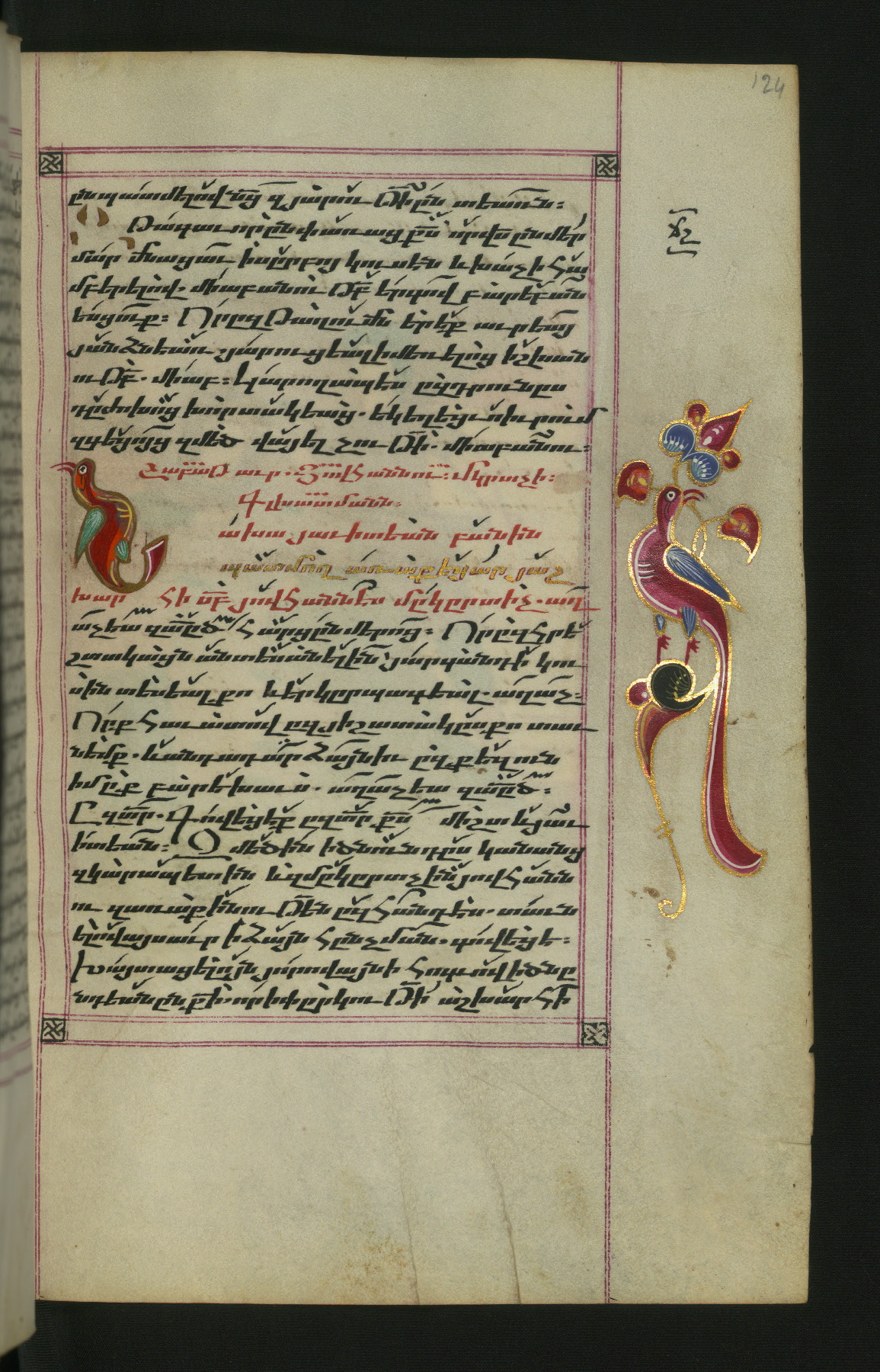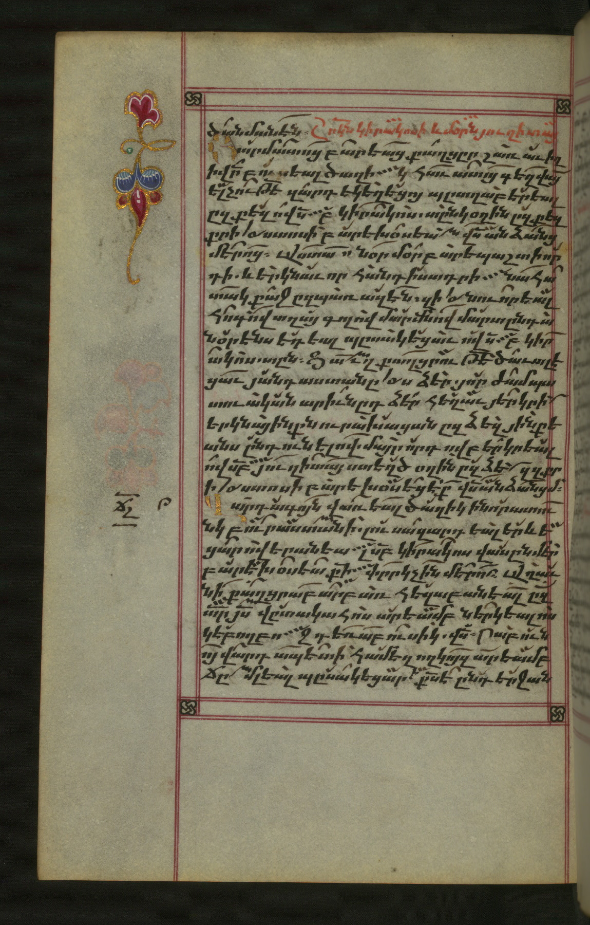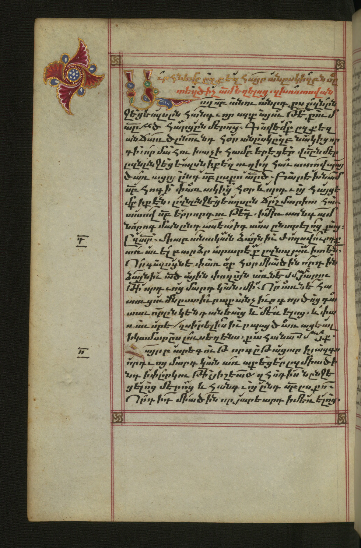 This hymnal was completed in Constantinople on August 15, 1678 [AE 1127], by the priest Yakob Pēligratc‘i, having been commissioned by Člav, son of Nawasard, as a dedication to his sons, Astuacatur and Sahak. The structure of the hymns adheres approximately to the standard Armenian hymnal (Շաբակնոց), with minor variations in order and a few substitutions (see Sanjian in the bibliography). The book is illuminated extensively, with thirty-eight full- and half-page polychrome miniatures against gold backgrounds, eight decorated head-pieces marking the principal divisions of the hymnal, and numerous marginal miniatures marking individual hymns, including biblical figures, saints, bishops, and vignettes. The style of the miniatures is largely in imitation of western European models, though more traditional Armenian and Byzantine influences stand out, such as the vibrant color palette, an iconic frontality for depictions of saints and bishops, and the highly abstracted floral motifs and zoomorphic incipits marking hymn divisions.