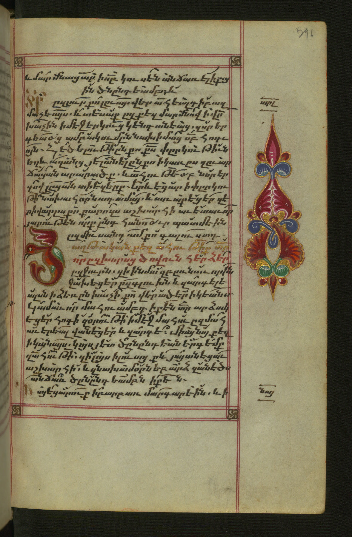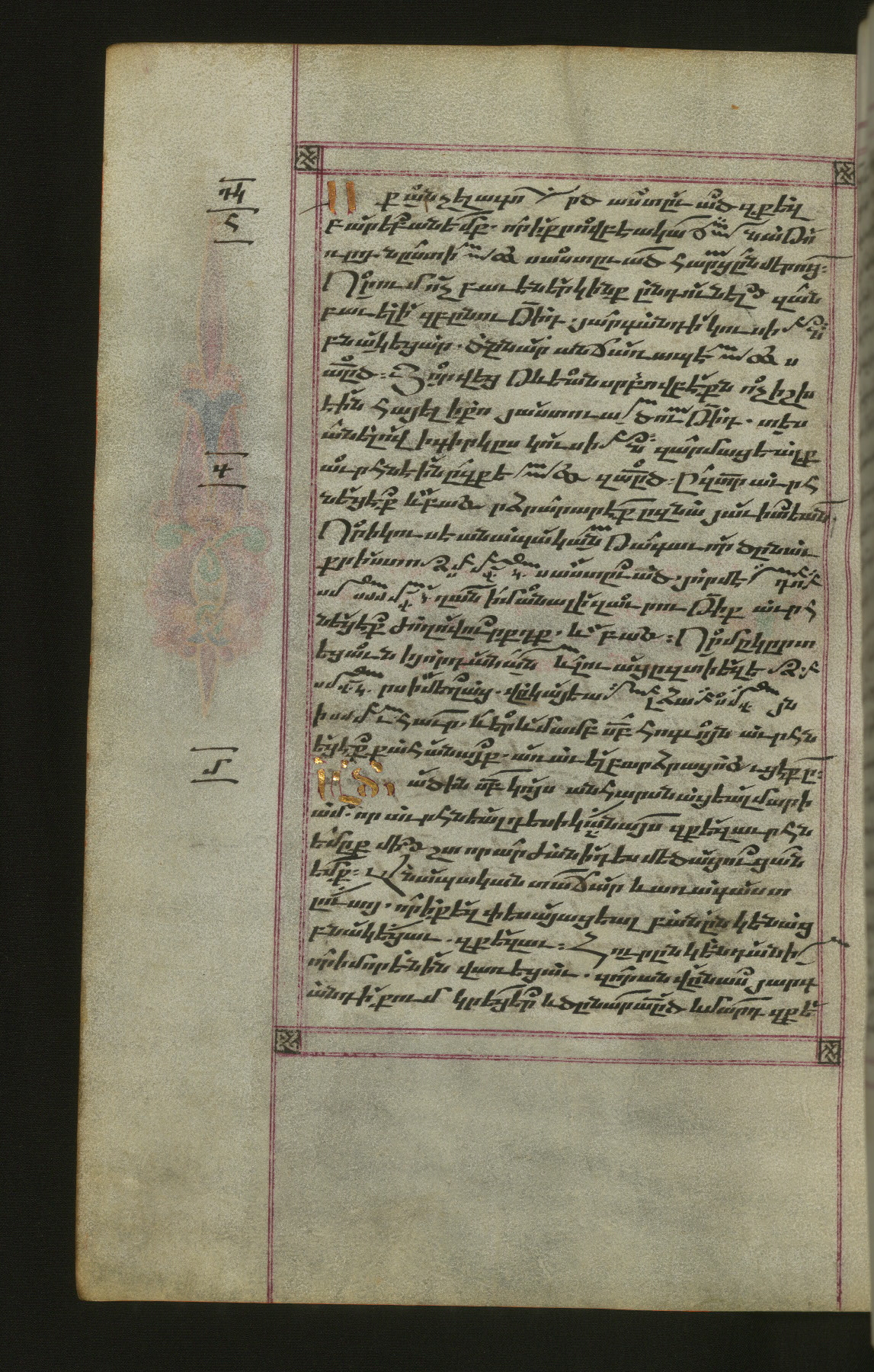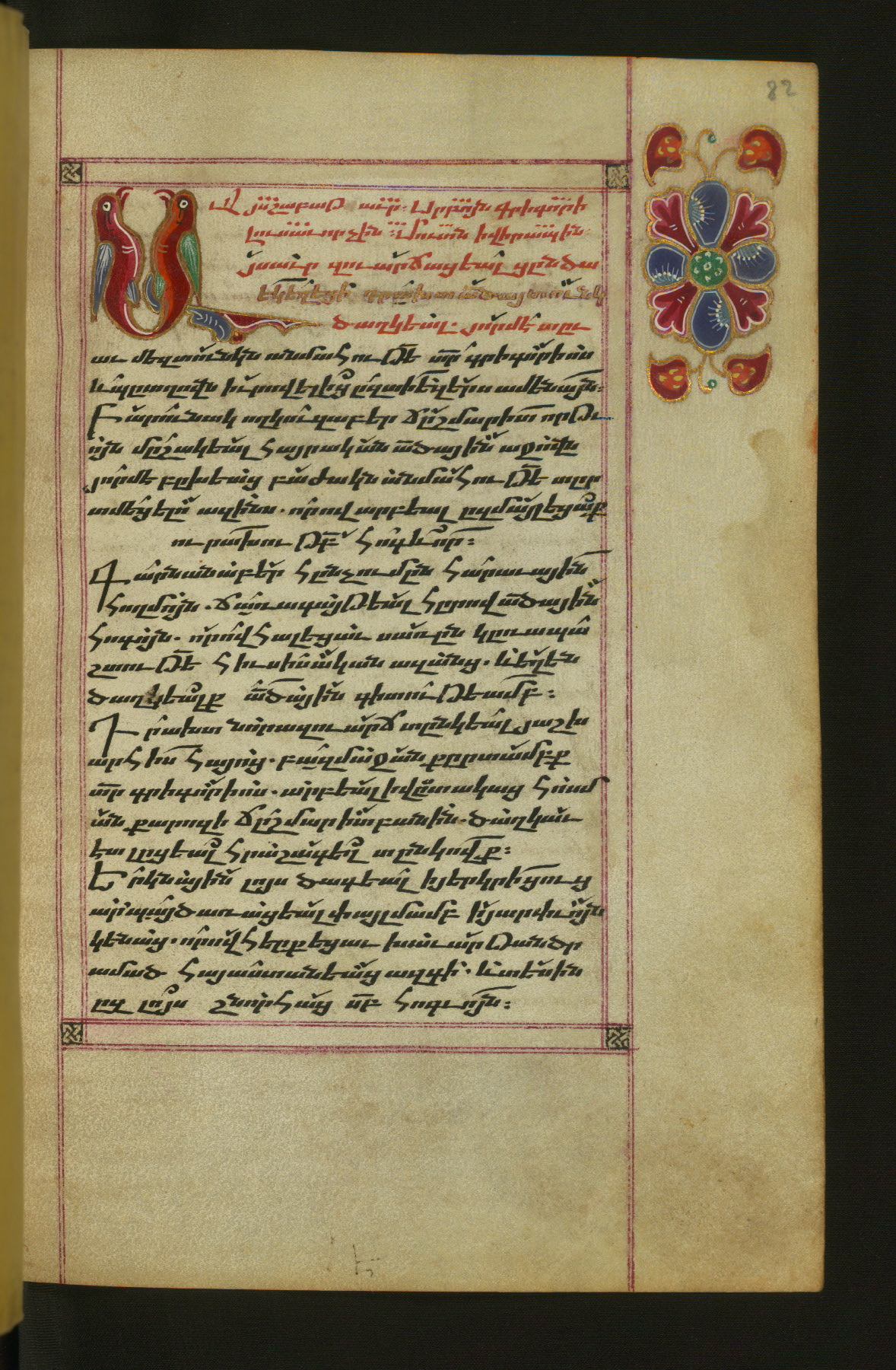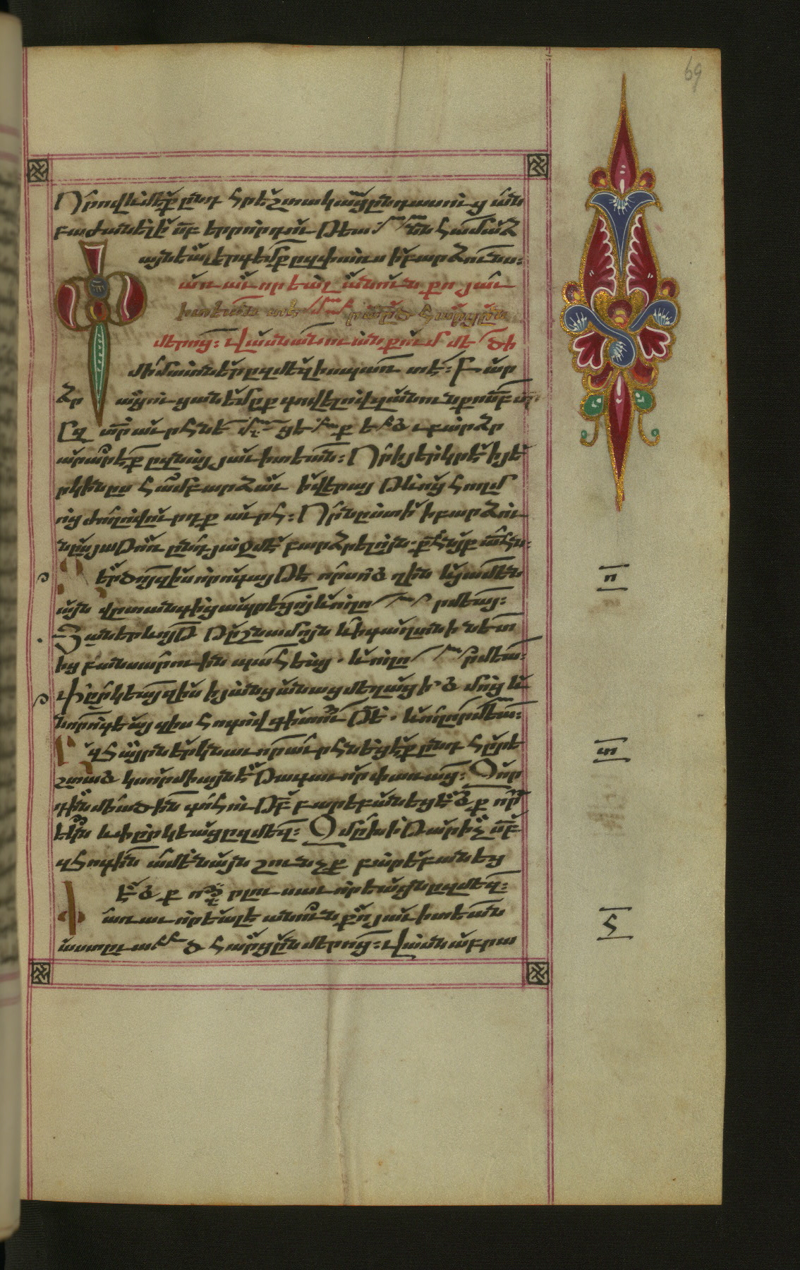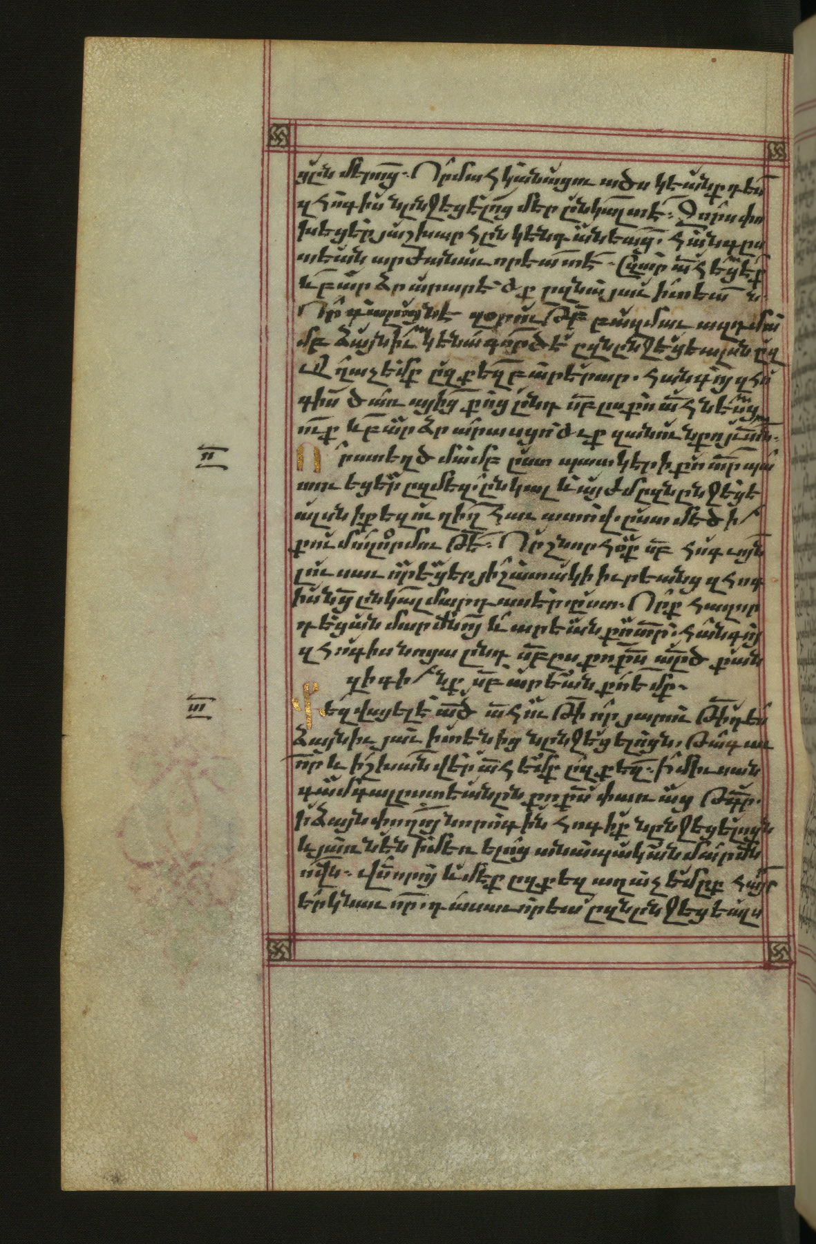 This hymnal was completed in Constantinople on August 15, 1678 [AE 1127], by the priest Yakob Pēligratc‘i, having been commissioned by Člav, son of Nawasard, as a dedication to his sons, Astuacatur and Sahak. The structure of the hymns adheres approximately to the standard Armenian hymnal (Շաբակնոց), with minor variations in order and a few substitutions (see Sanjian in the bibliography). The book is illuminated extensively, with thirty-eight full- and half-page polychrome miniatures against gold backgrounds, eight decorated head-pieces marking the principal divisions of the hymnal, and numerous marginal miniatures marking individual hymns, including biblical figures, saints, bishops, and vignettes. The style of the miniatures is largely in imitation of western European models, though more traditional Armenian and Byzantine influences stand out, such as the vibrant color palette, an iconic frontality for depictions of saints and bishops, and the highly abstracted floral motifs and zoomorphic incipits marking hymn divisions.