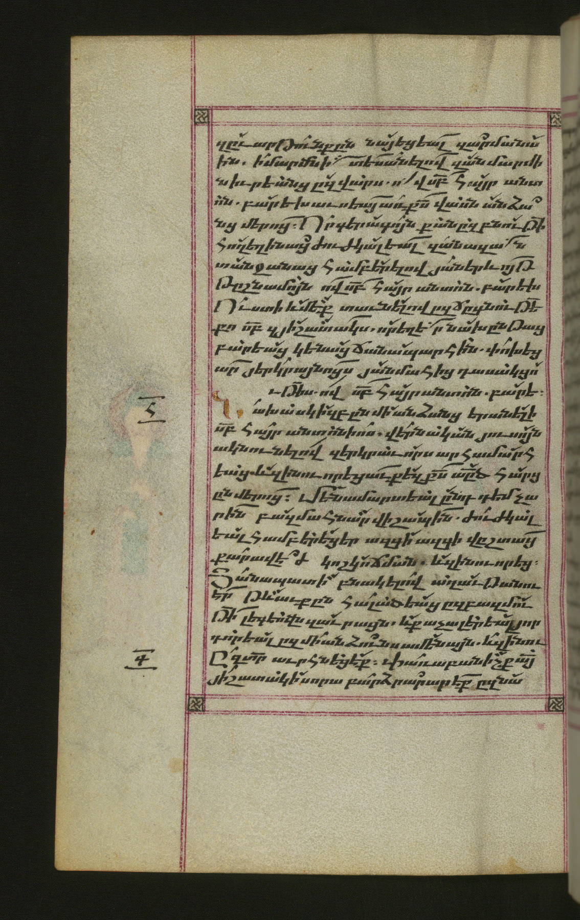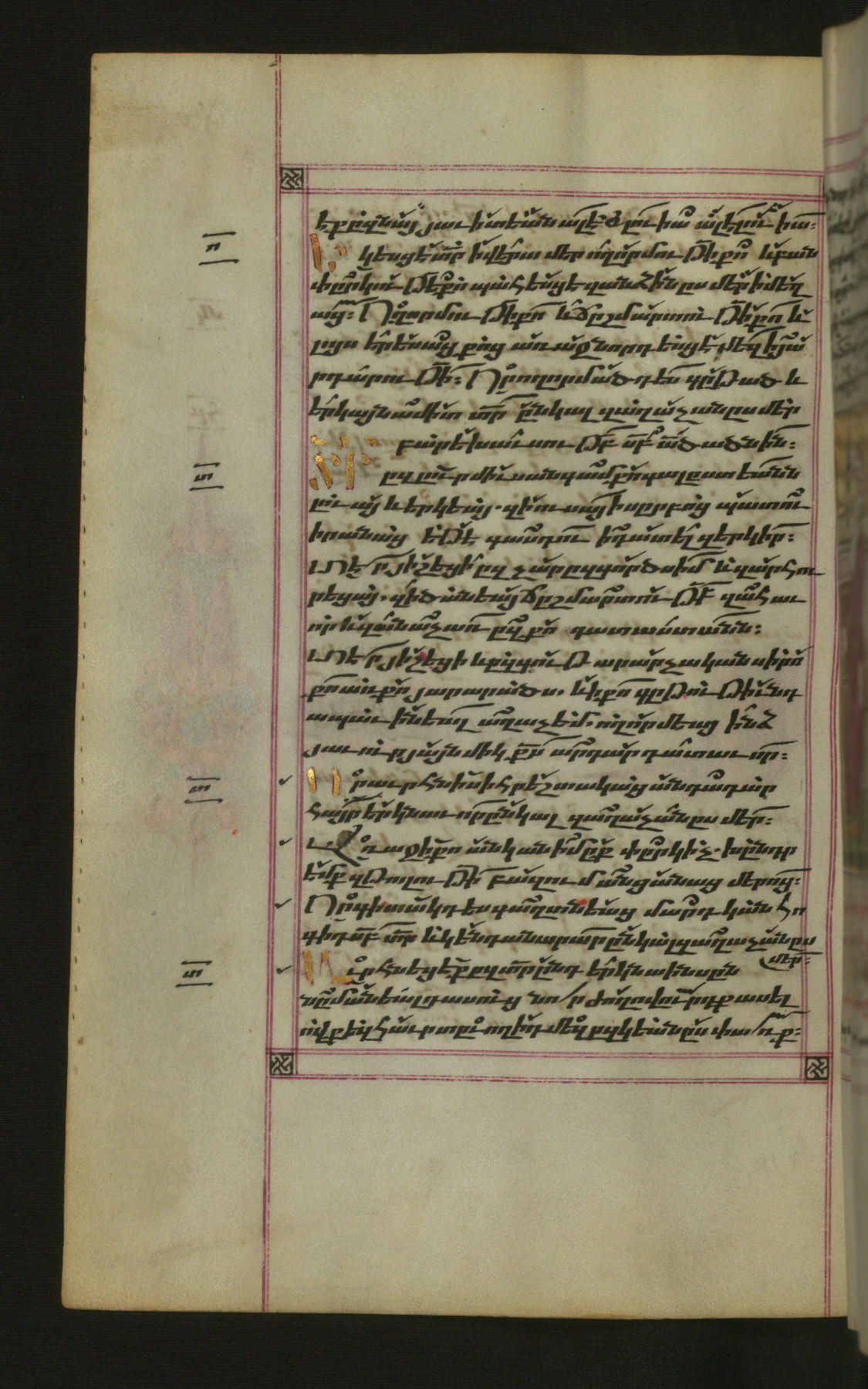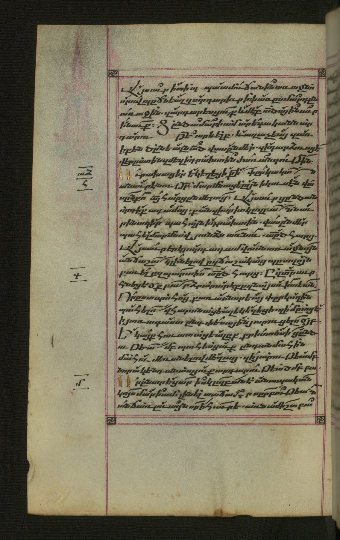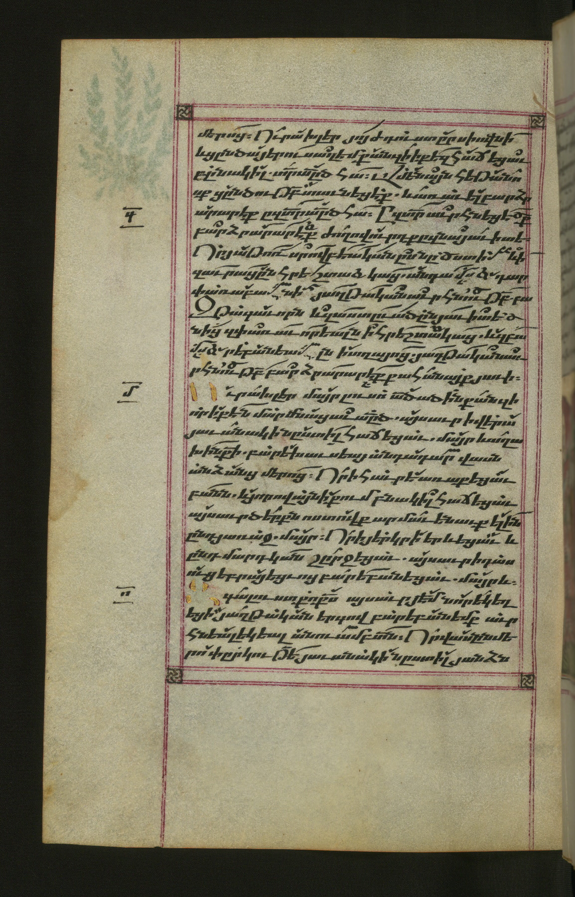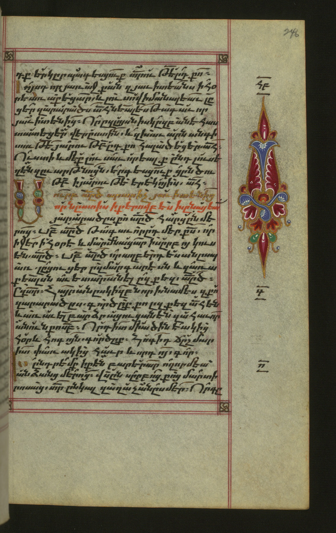 This hymnal was completed in Constantinople on August 15, 1678 [AE 1127], by the priest Yakob Pēligratc‘i, having been commissioned by Člav, son of Nawasard, as a dedication to his sons, Astuacatur and Sahak. The structure of the hymns adheres approximately to the standard Armenian hymnal (Շաբակնոց), with minor variations in order and a few substitutions (see Sanjian in the bibliography). The book is illuminated extensively, with thirty-eight full- and half-page polychrome miniatures against gold backgrounds, eight decorated head-pieces marking the principal divisions of the hymnal, and numerous marginal miniatures marking individual hymns, including biblical figures, saints, bishops, and vignettes. The style of the miniatures is largely in imitation of western European models, though more traditional Armenian and Byzantine influences stand out, such as the vibrant color palette, an iconic frontality for depictions of saints and bishops, and the highly abstracted floral motifs and zoomorphic incipits marking hymn divisions.