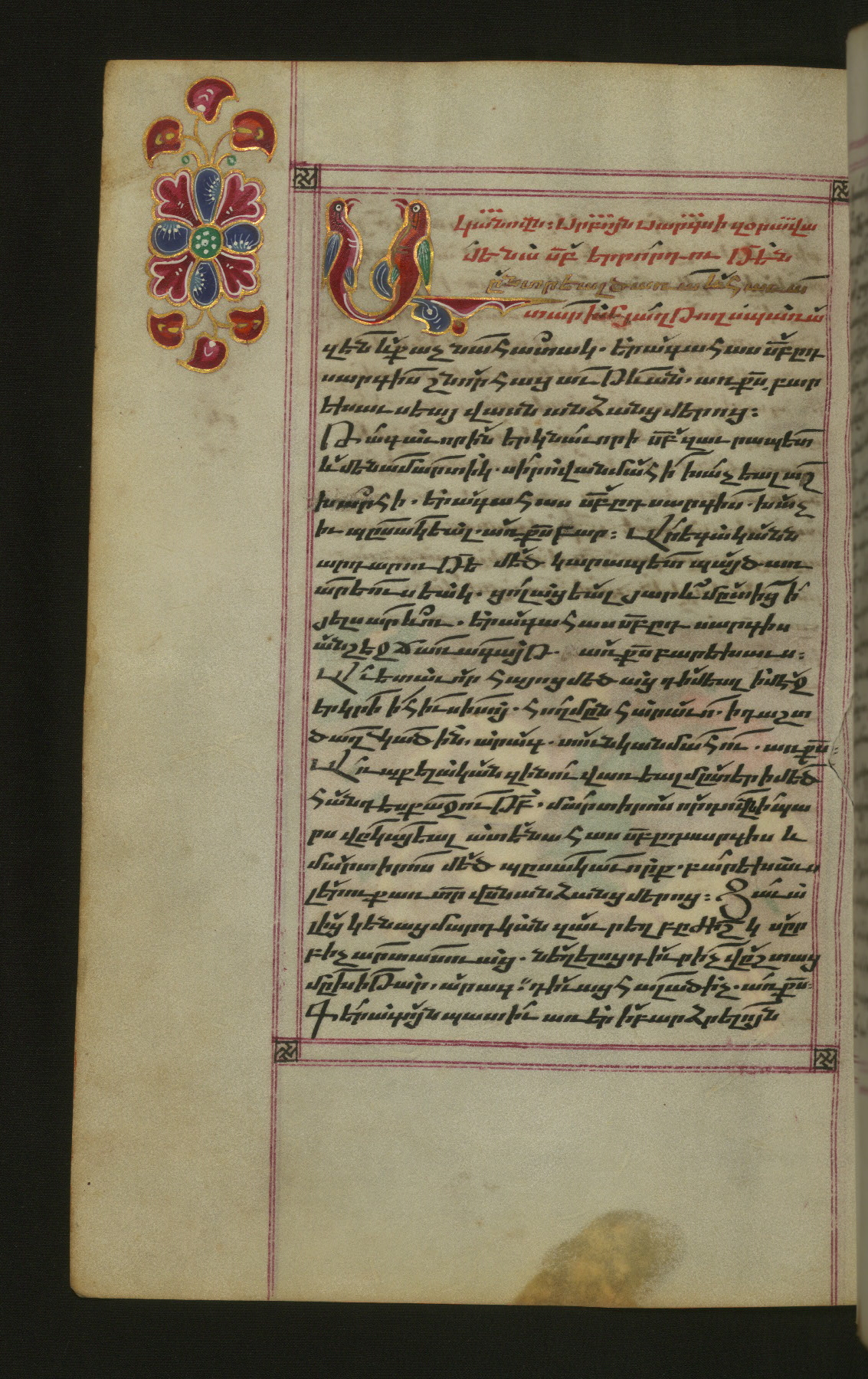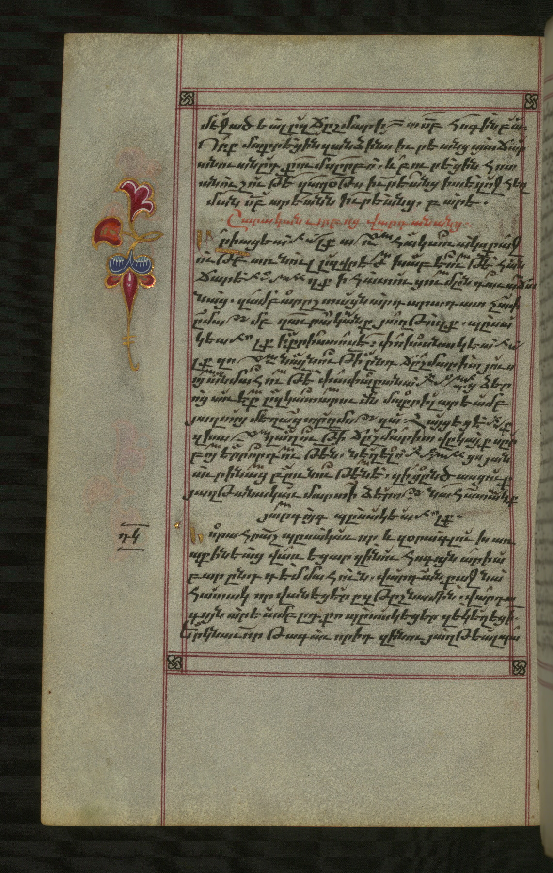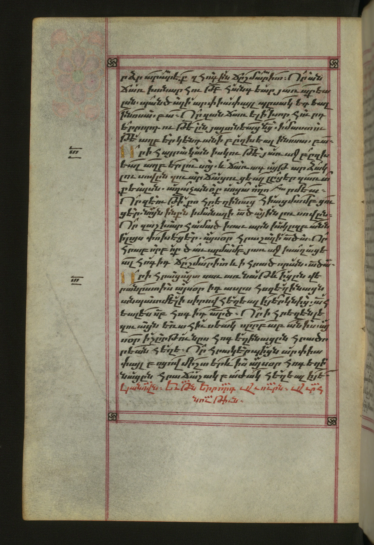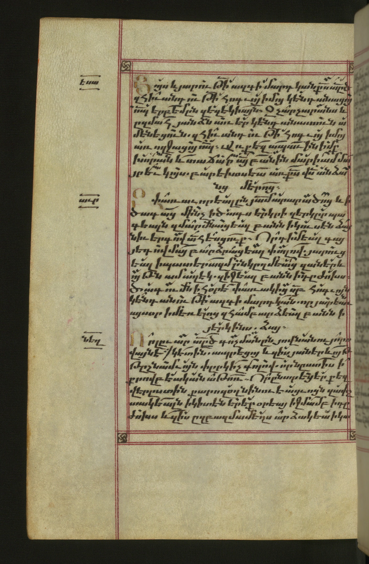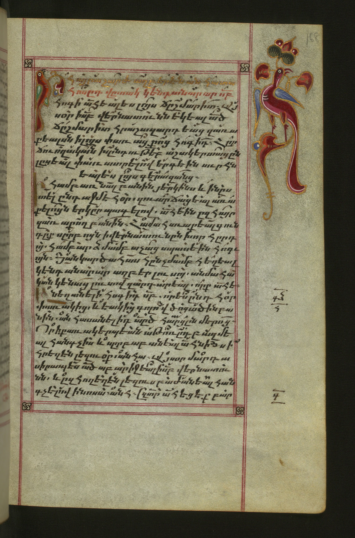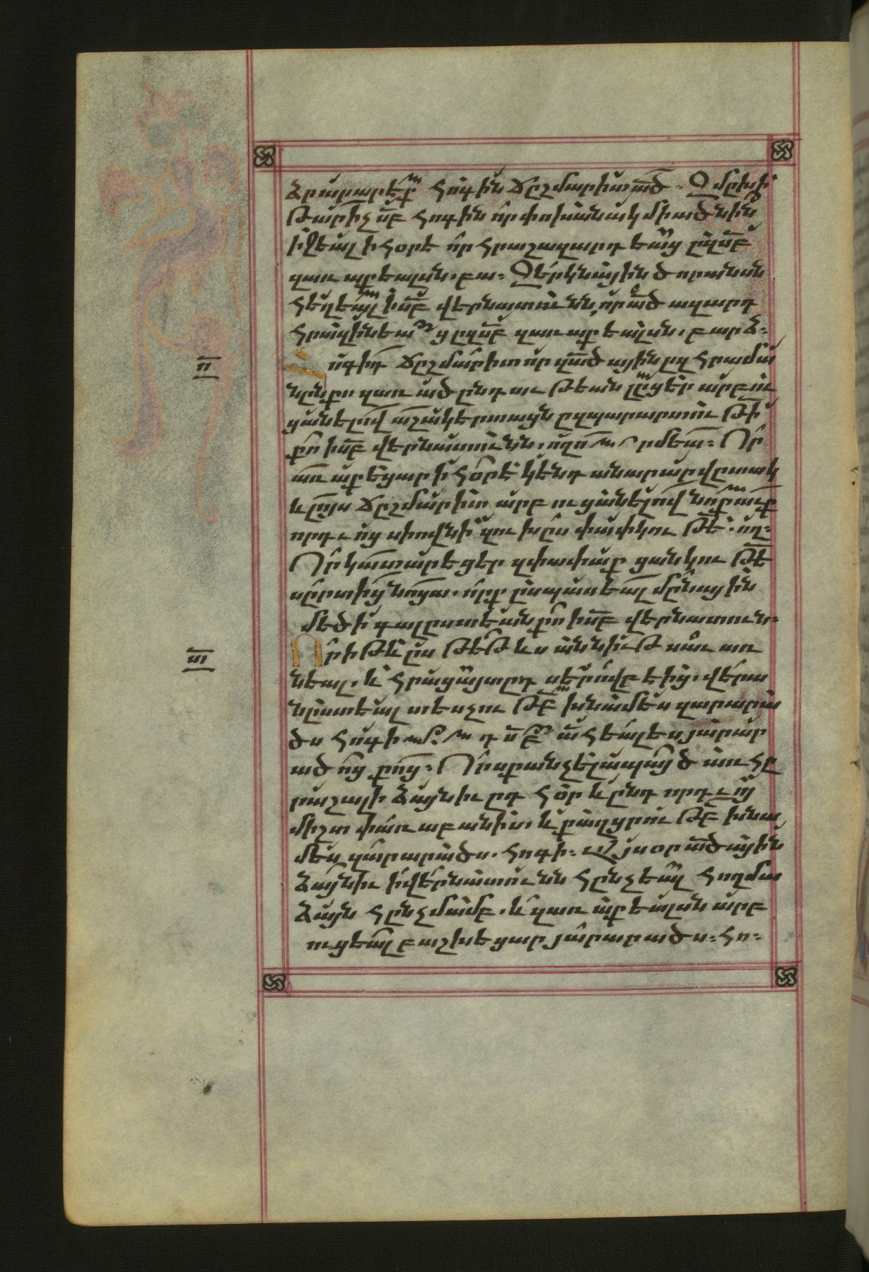 This hymnal was completed in Constantinople on August 15, 1678 [AE 1127], by the priest Yakob Pēligratc‘i, having been commissioned by Člav, son of Nawasard, as a dedication to his sons, Astuacatur and Sahak. The structure of the hymns adheres approximately to the standard Armenian hymnal (Շաբակնոց), with minor variations in order and a few substitutions (see Sanjian in the bibliography). The book is illuminated extensively, with thirty-eight full- and half-page polychrome miniatures against gold backgrounds, eight decorated head-pieces marking the principal divisions of the hymnal, and numerous marginal miniatures marking individual hymns, including biblical figures, saints, bishops, and vignettes. The style of the miniatures is largely in imitation of western European models, though more traditional Armenian and Byzantine influences stand out, such as the vibrant color palette, an iconic frontality for depictions of saints and bishops, and the highly abstracted floral motifs and zoomorphic incipits marking hymn divisions.