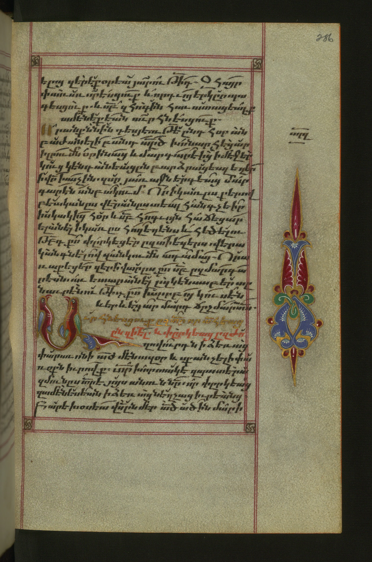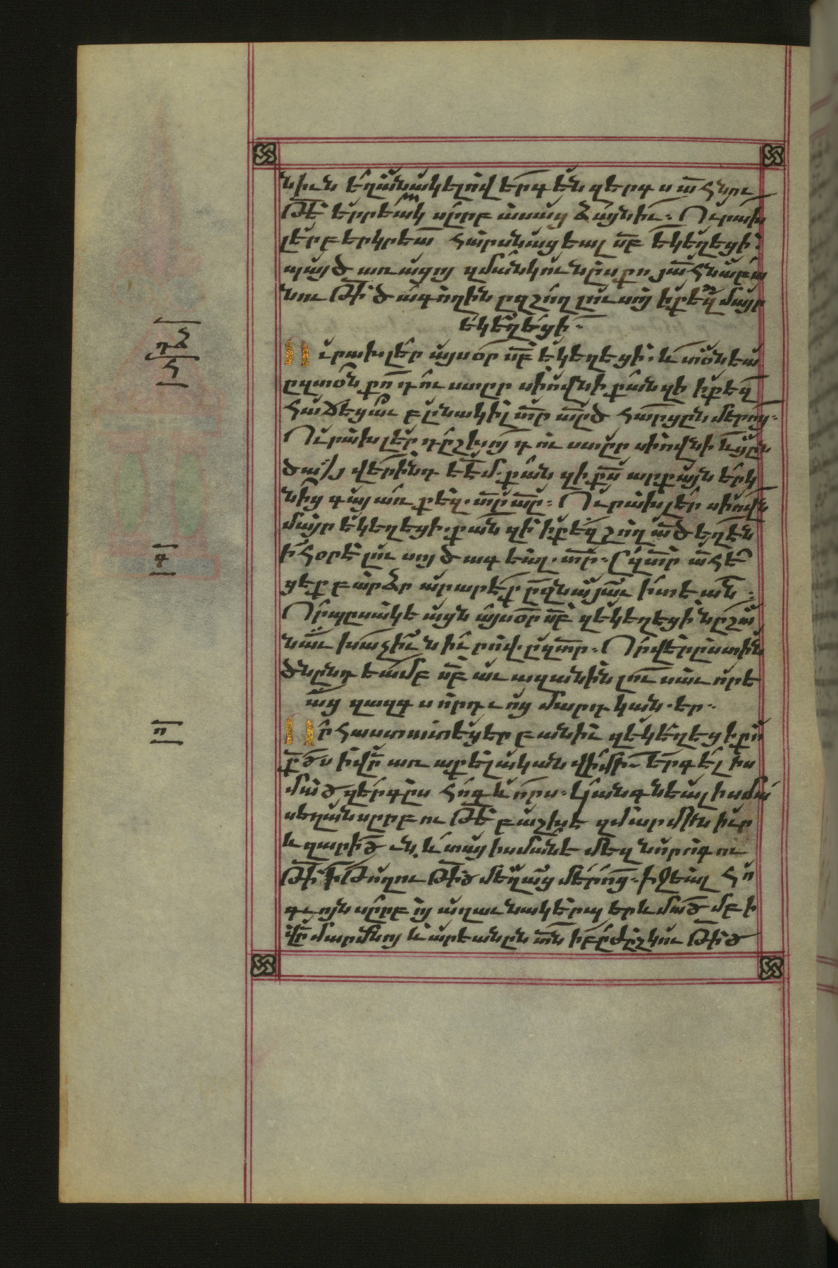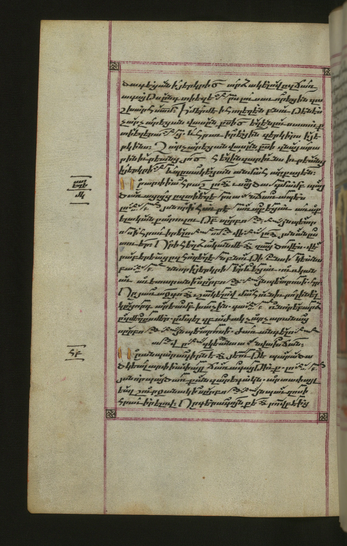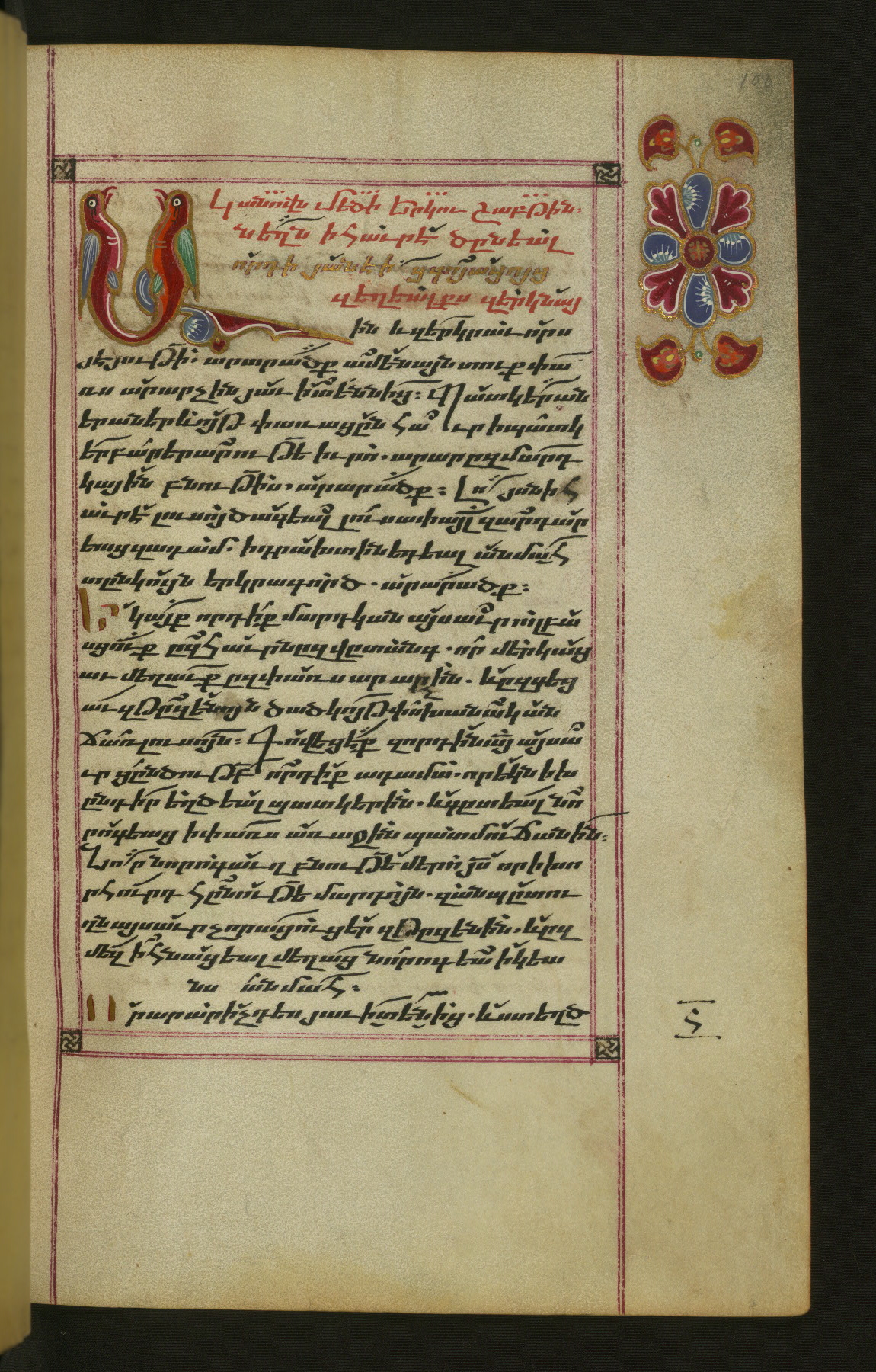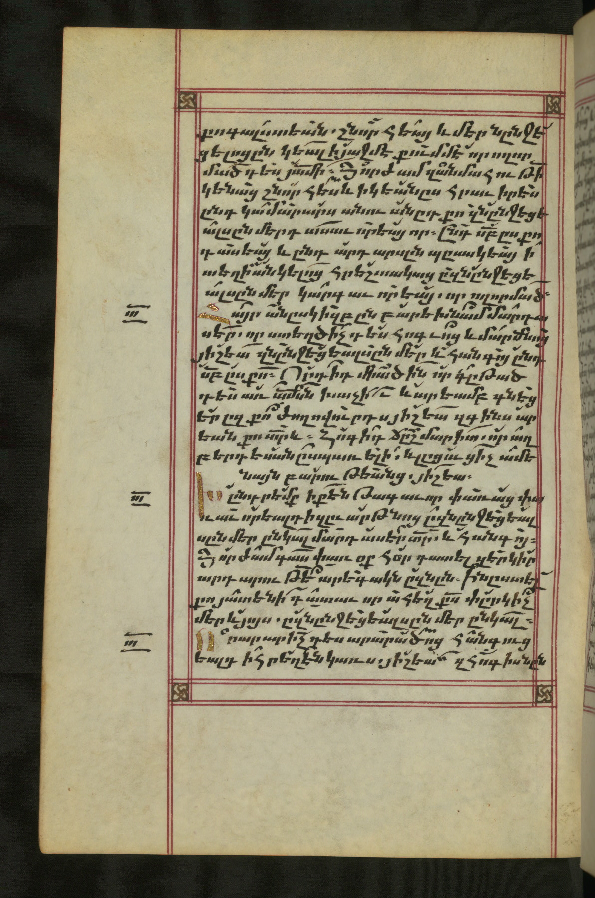 This hymnal was completed in Constantinople on August 15, 1678 [AE 1127], by the priest Yakob Pēligratc‘i, having been commissioned by Člav, son of Nawasard, as a dedication to his sons, Astuacatur and Sahak. The structure of the hymns adheres approximately to the standard Armenian hymnal (Շաբակնոց), with minor variations in order and a few substitutions (see Sanjian in the bibliography). The book is illuminated extensively, with thirty-eight full- and half-page polychrome miniatures against gold backgrounds, eight decorated head-pieces marking the principal divisions of the hymnal, and numerous marginal miniatures marking individual hymns, including biblical figures, saints, bishops, and vignettes. The style of the miniatures is largely in imitation of western European models, though more traditional Armenian and Byzantine influences stand out, such as the vibrant color palette, an iconic frontality for depictions of saints and bishops, and the highly abstracted floral motifs and zoomorphic incipits marking hymn divisions.