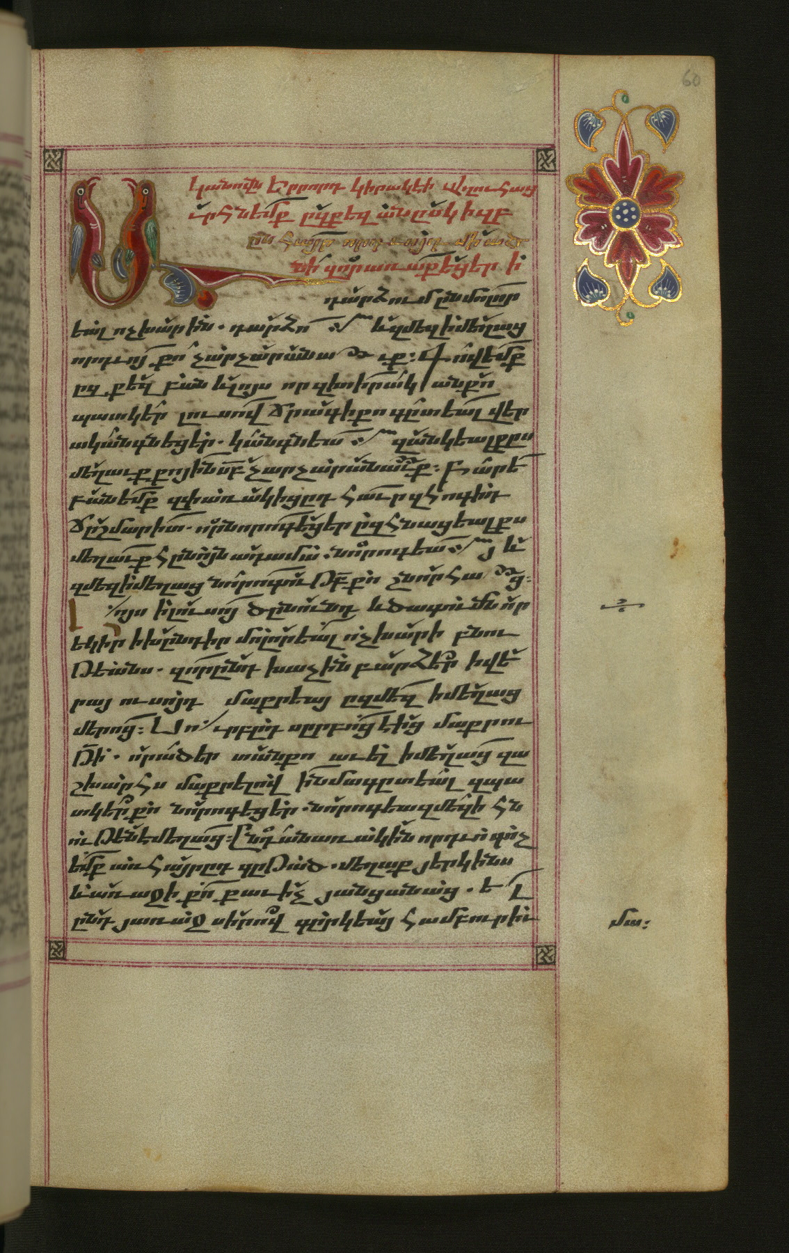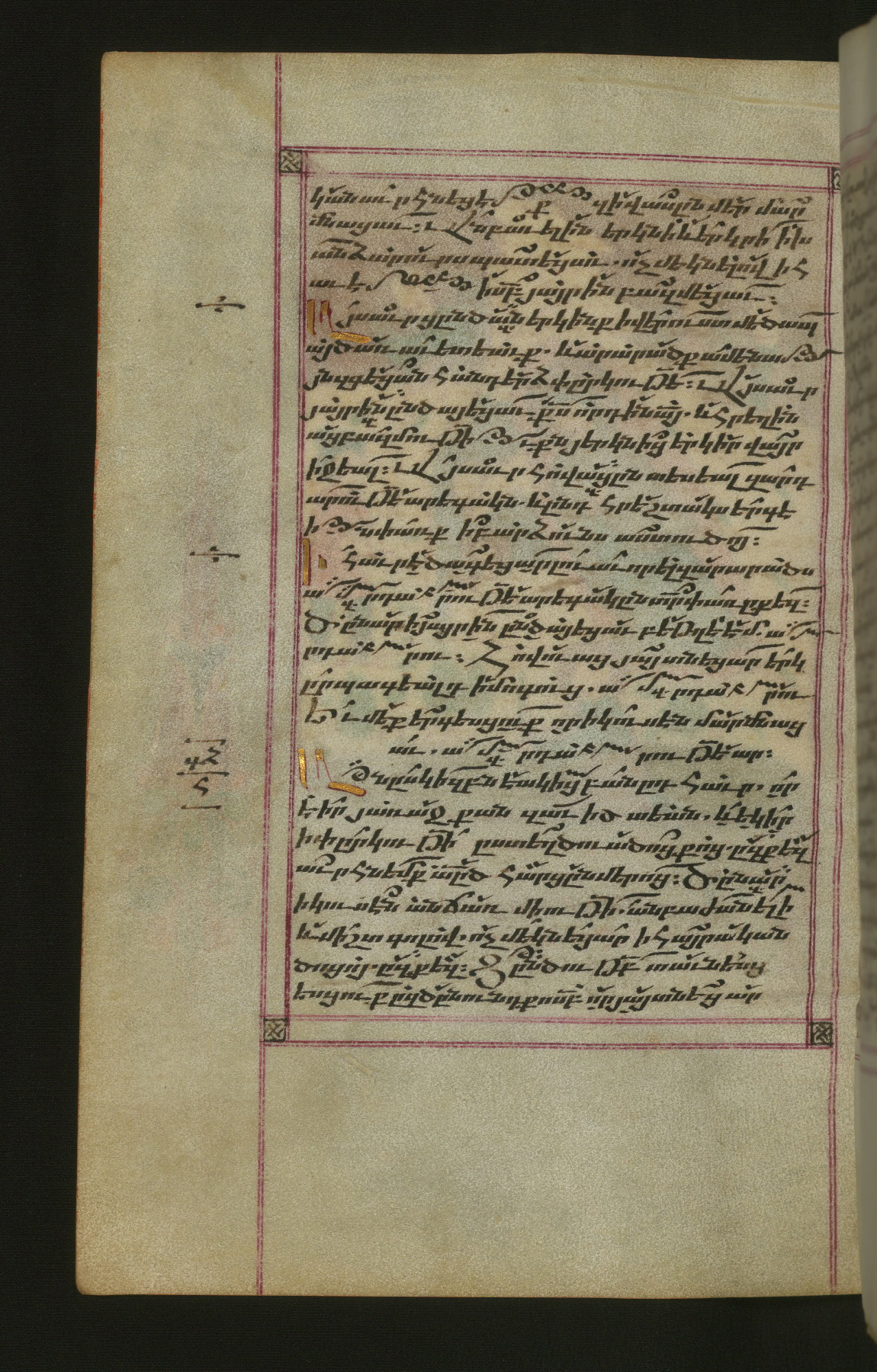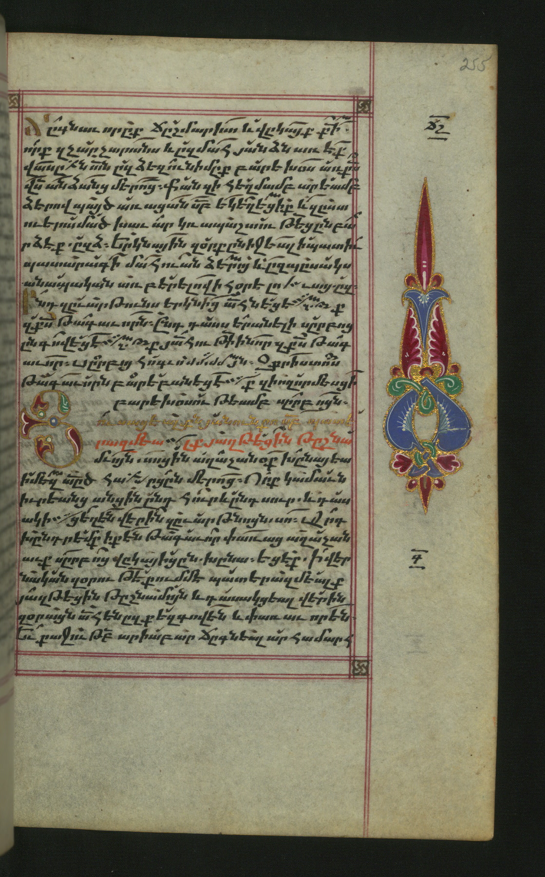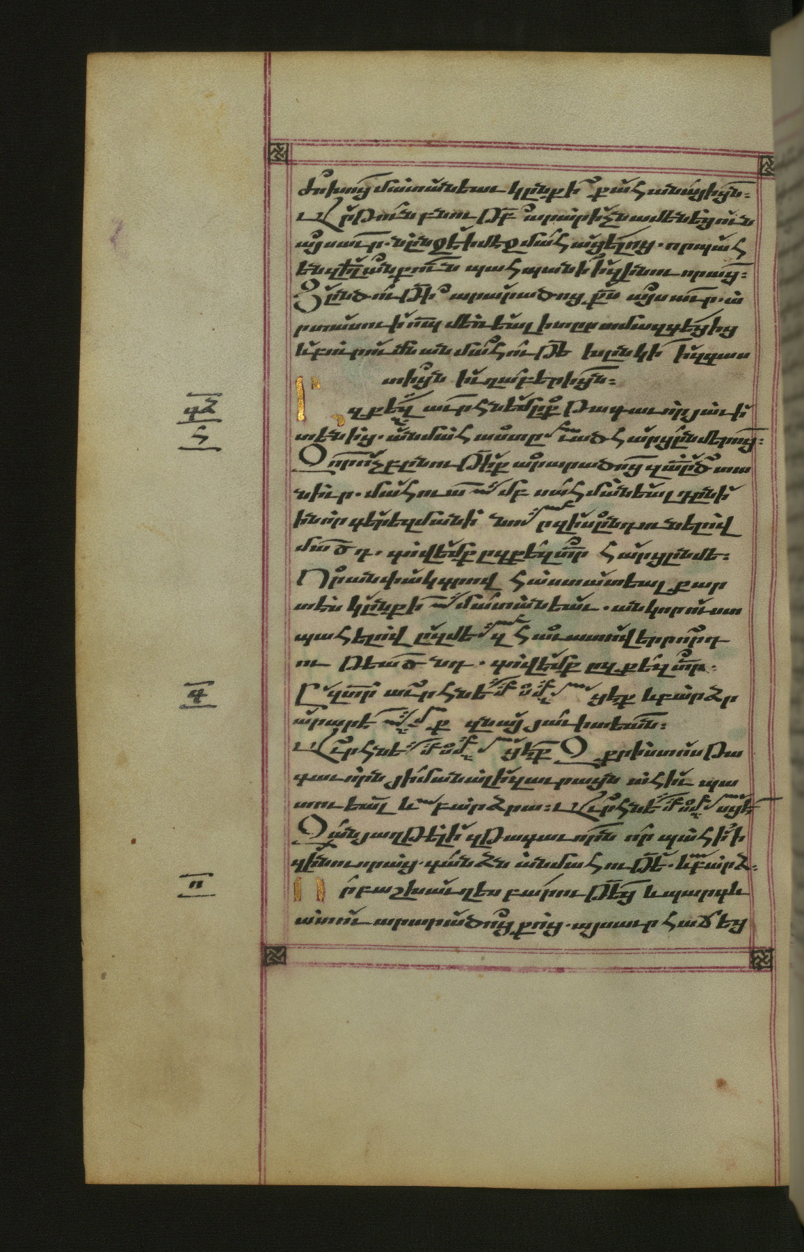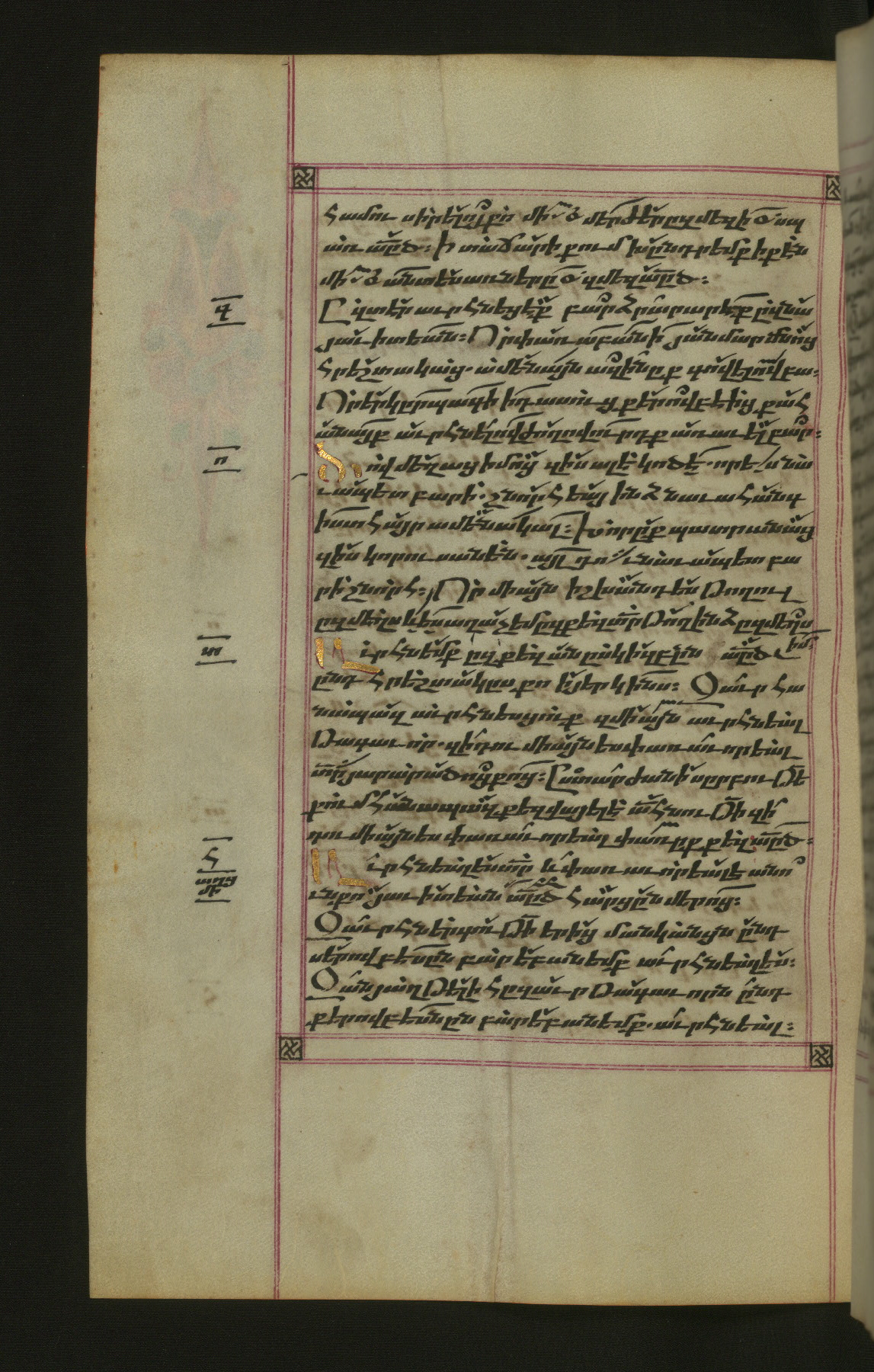 This hymnal was completed in Constantinople on August 15, 1678 [AE 1127], by the priest Yakob Pēligratc‘i, having been commissioned by Člav, son of Nawasard, as a dedication to his sons, Astuacatur and Sahak. The structure of the hymns adheres approximately to the standard Armenian hymnal (Շաբակնոց), with minor variations in order and a few substitutions (see Sanjian in the bibliography). The book is illuminated extensively, with thirty-eight full- and half-page polychrome miniatures against gold backgrounds, eight decorated head-pieces marking the principal divisions of the hymnal, and numerous marginal miniatures marking individual hymns, including biblical figures, saints, bishops, and vignettes. The style of the miniatures is largely in imitation of western European models, though more traditional Armenian and Byzantine influences stand out, such as the vibrant color palette, an iconic frontality for depictions of saints and bishops, and the highly abstracted floral motifs and zoomorphic incipits marking hymn divisions.