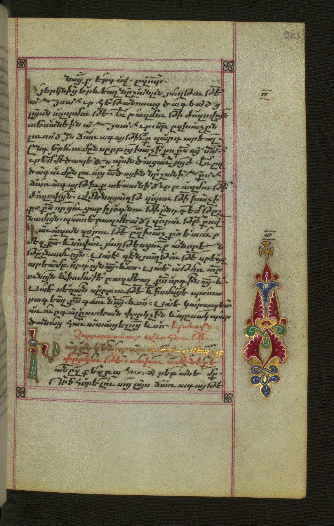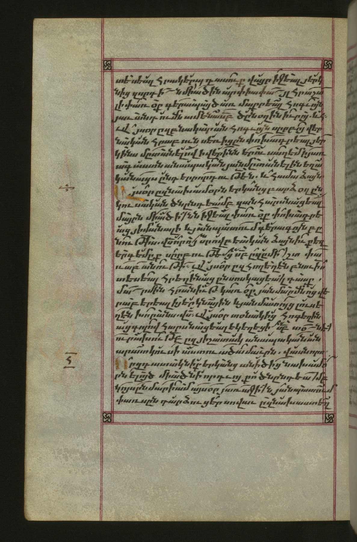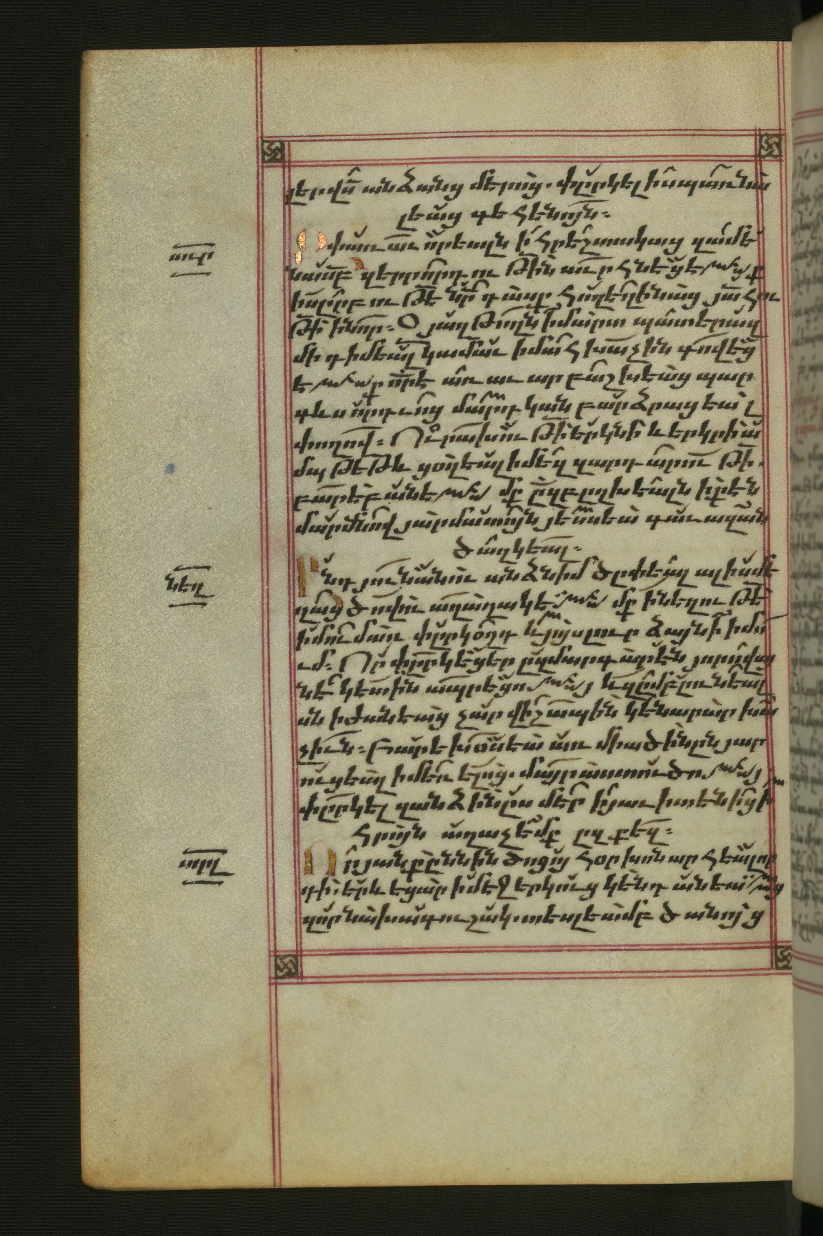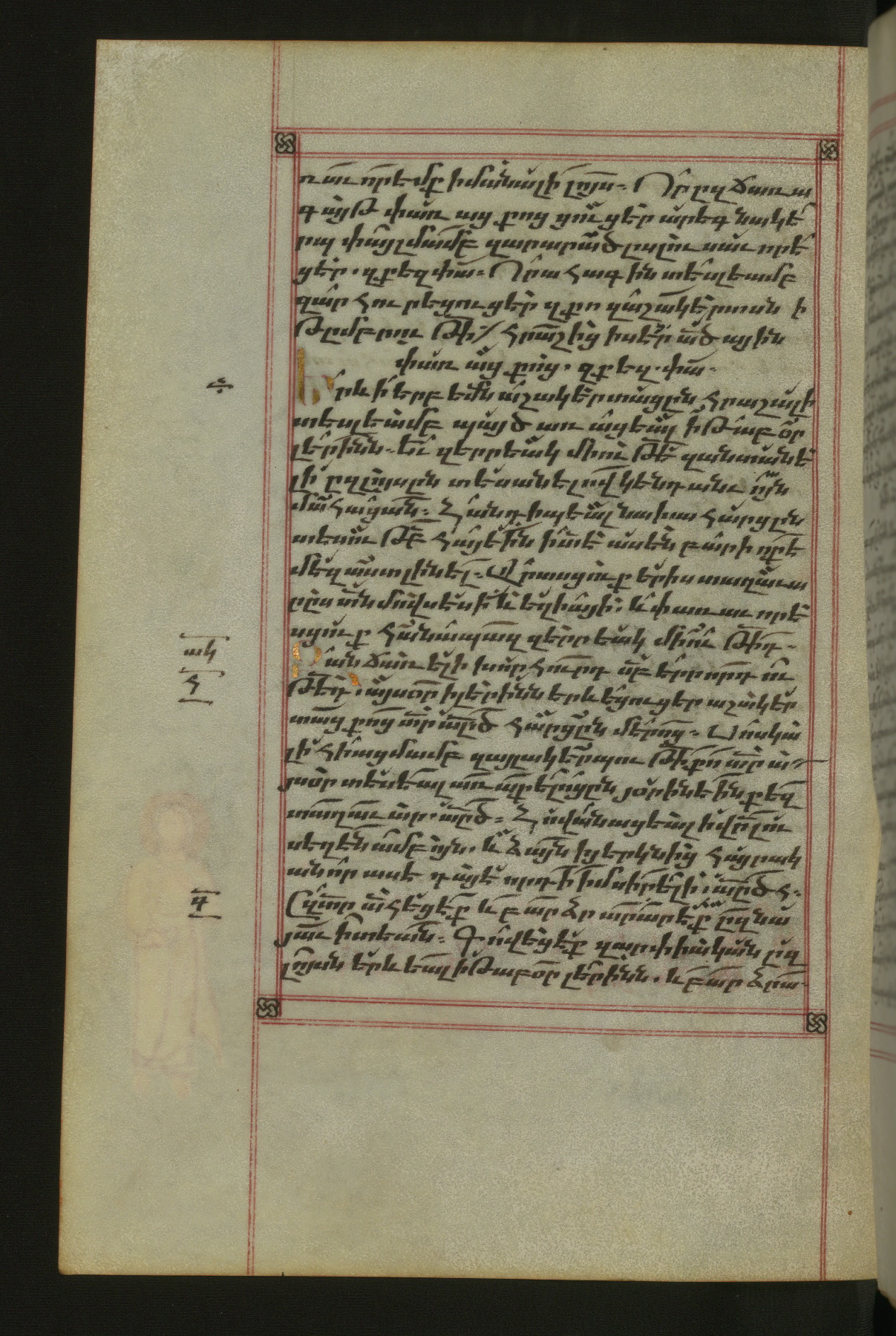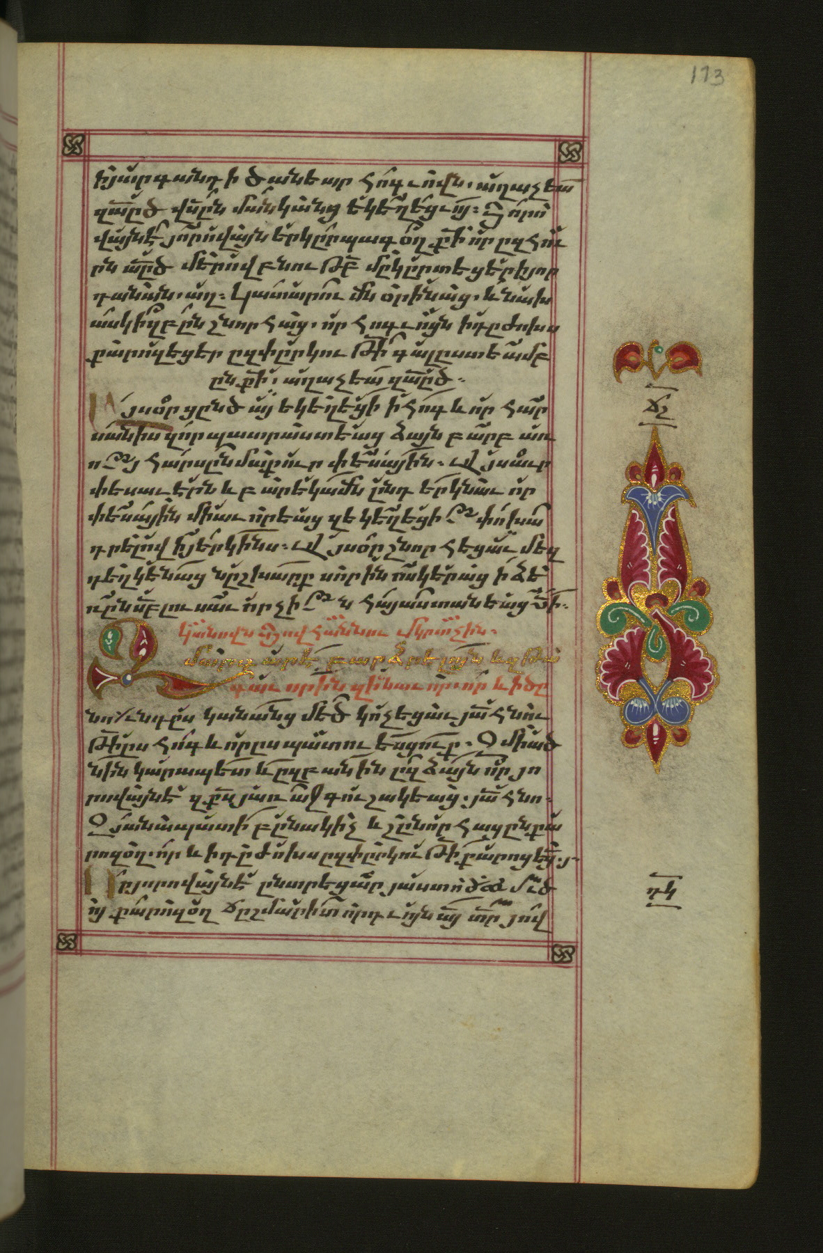 This hymnal was completed in Constantinople on August 15, 1678 [AE 1127], by the priest Yakob Pēligratc‘i, having been commissioned by Člav, son of Nawasard, as a dedication to his sons, Astuacatur and Sahak. The structure of the hymns adheres approximately to the standard Armenian hymnal (Շաբակնոց), with minor variations in order and a few substitutions (see Sanjian in the bibliography). The book is illuminated extensively, with thirty-eight full- and half-page polychrome miniatures against gold backgrounds, eight decorated head-pieces marking the principal divisions of the hymnal, and numerous marginal miniatures marking individual hymns, including biblical figures, saints, bishops, and vignettes. The style of the miniatures is largely in imitation of western European models, though more traditional Armenian and Byzantine influences stand out, such as the vibrant color palette, an iconic frontality for depictions of saints and bishops, and the highly abstracted floral motifs and zoomorphic incipits marking hymn divisions.
