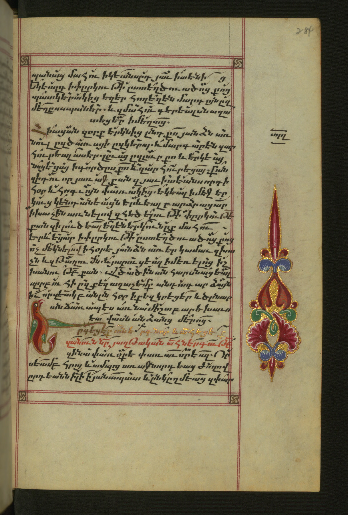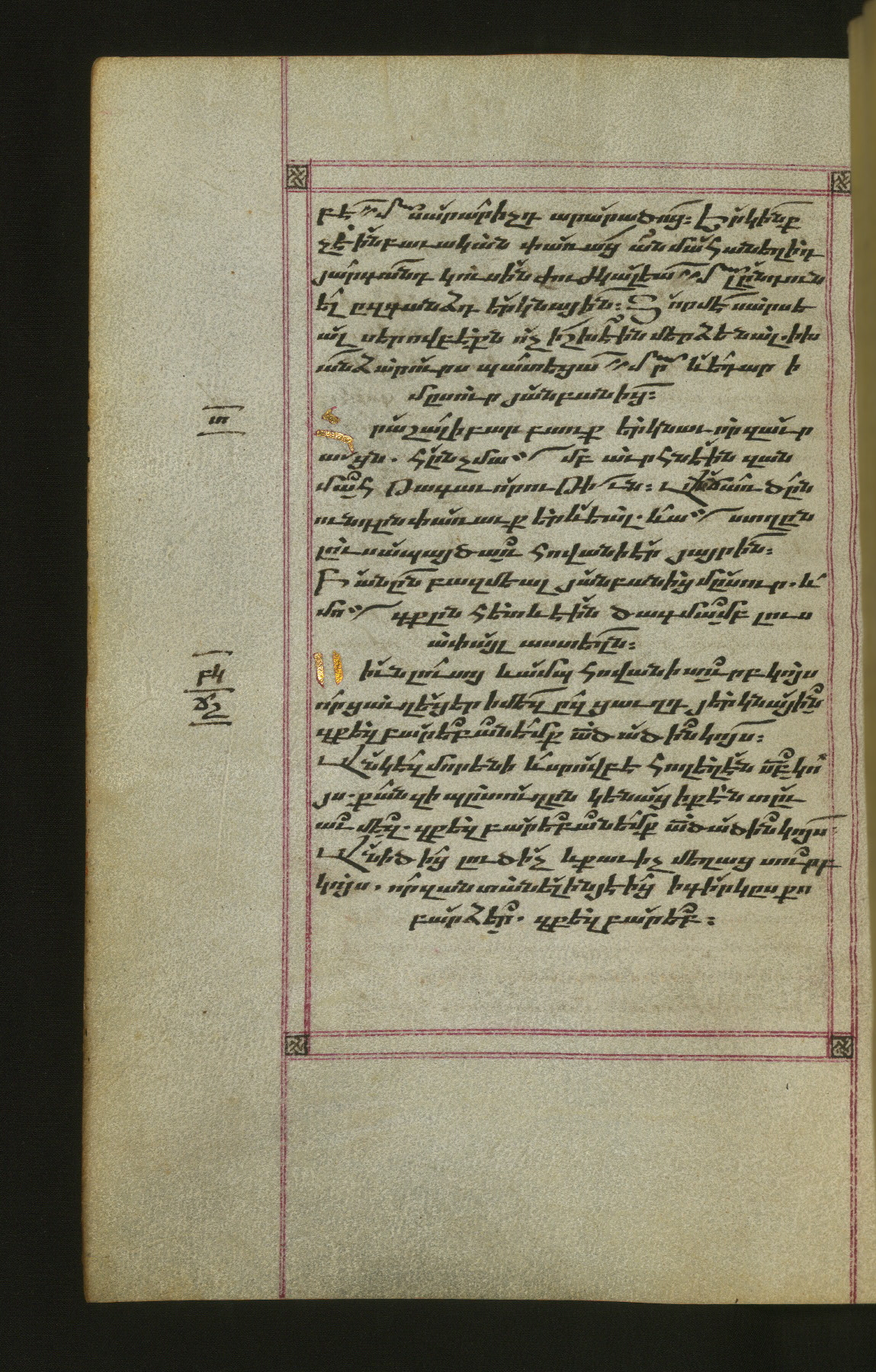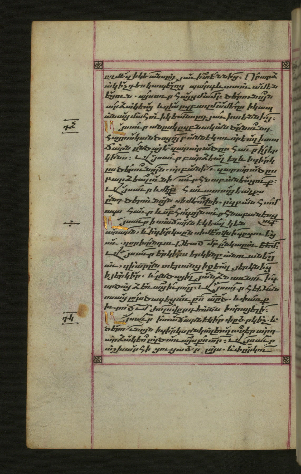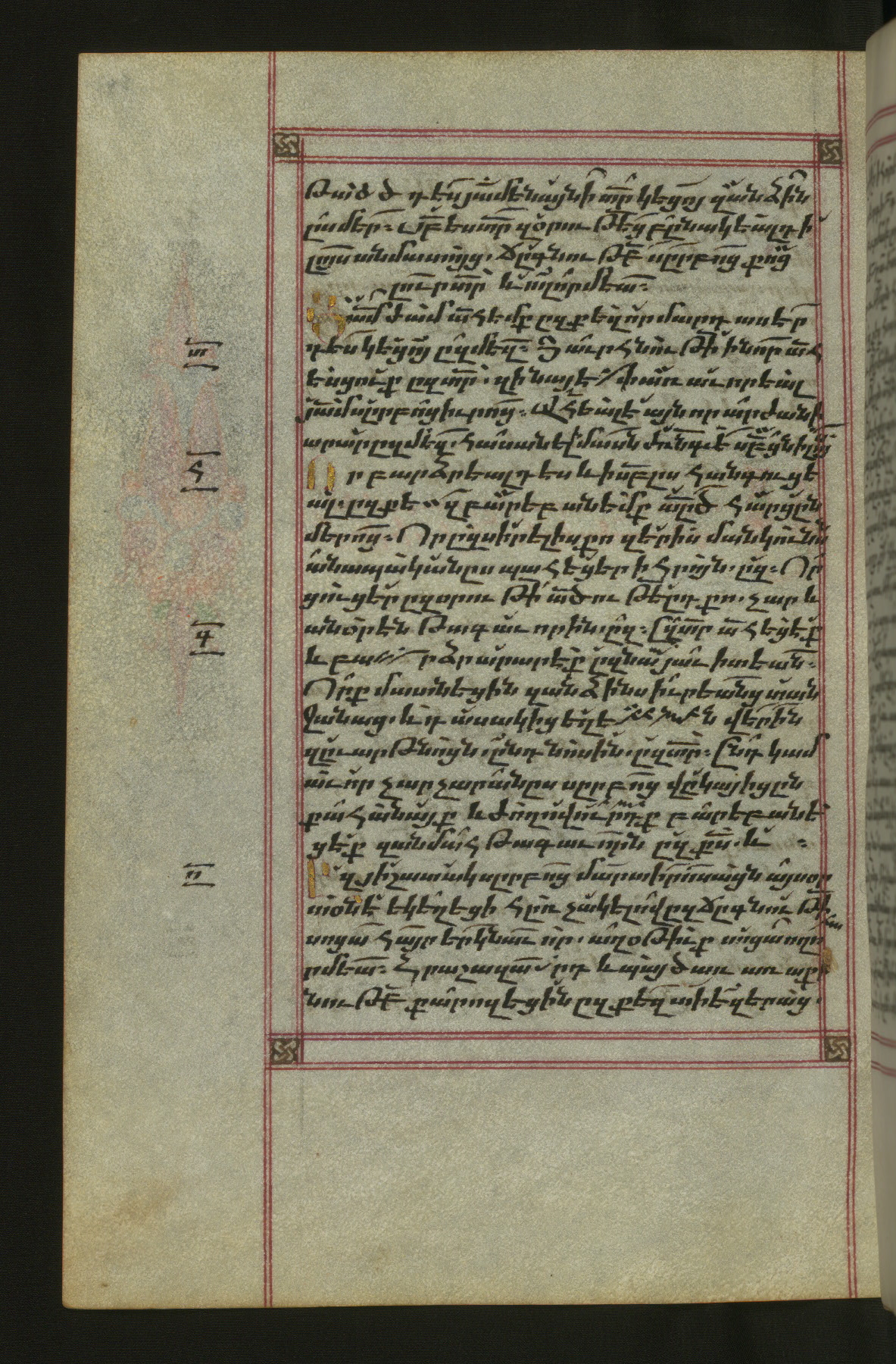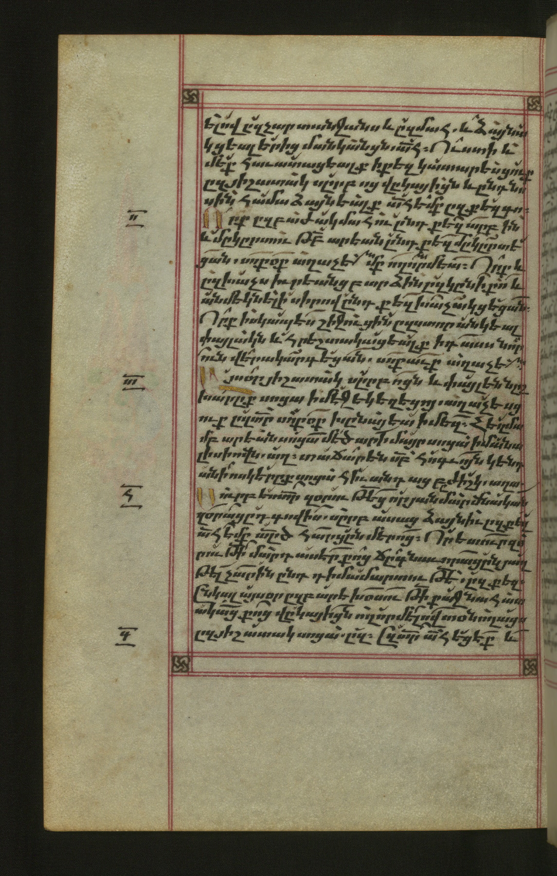 This hymnal was completed in Constantinople on August 15, 1678 [AE 1127], by the priest Yakob Pēligratc‘i, having been commissioned by Člav, son of Nawasard, as a dedication to his sons, Astuacatur and Sahak. The structure of the hymns adheres approximately to the standard Armenian hymnal (Շաբակնոց), with minor variations in order and a few substitutions (see Sanjian in the bibliography). The book is illuminated extensively, with thirty-eight full- and half-page polychrome miniatures against gold backgrounds, eight decorated head-pieces marking the principal divisions of the hymnal, and numerous marginal miniatures marking individual hymns, including biblical figures, saints, bishops, and vignettes. The style of the miniatures is largely in imitation of western European models, though more traditional Armenian and Byzantine influences stand out, such as the vibrant color palette, an iconic frontality for depictions of saints and bishops, and the highly abstracted floral motifs and zoomorphic incipits marking hymn divisions.