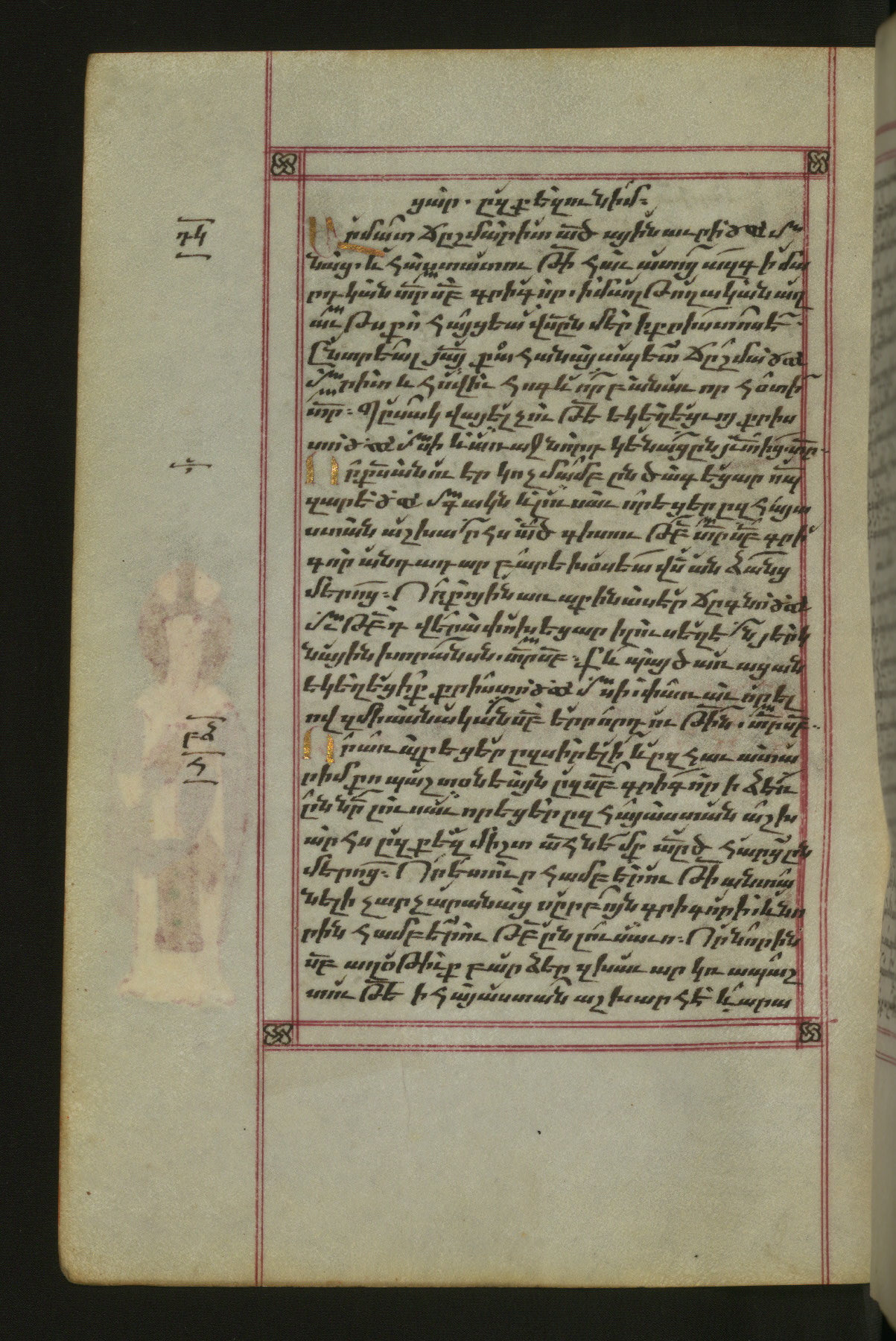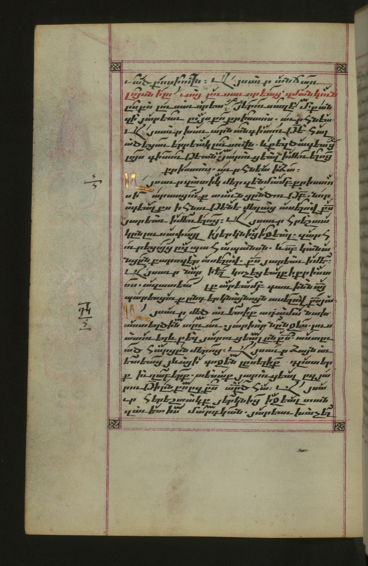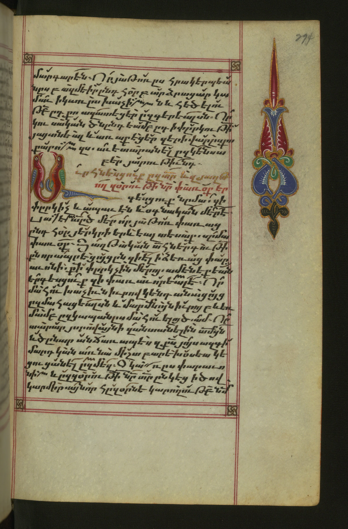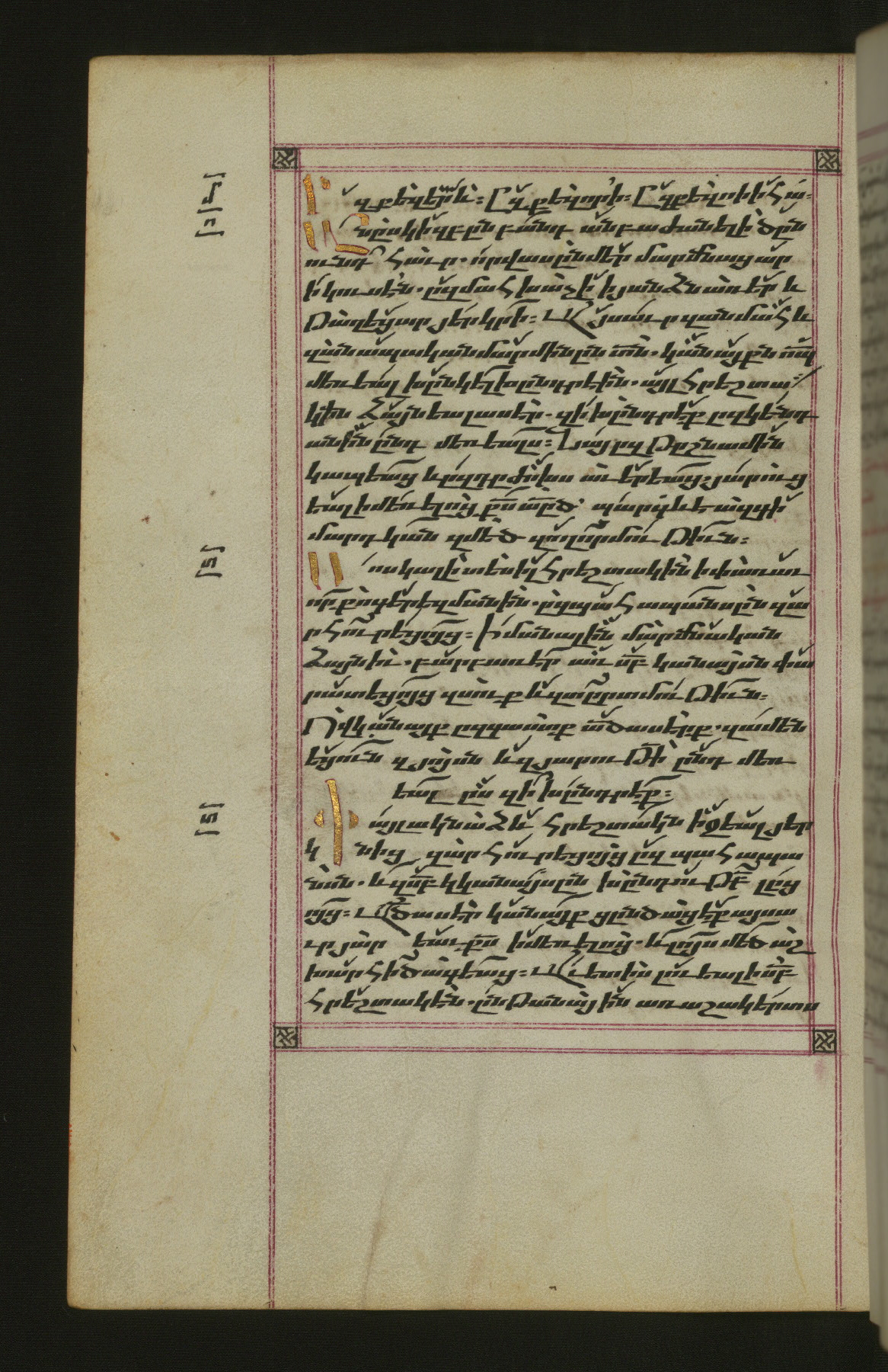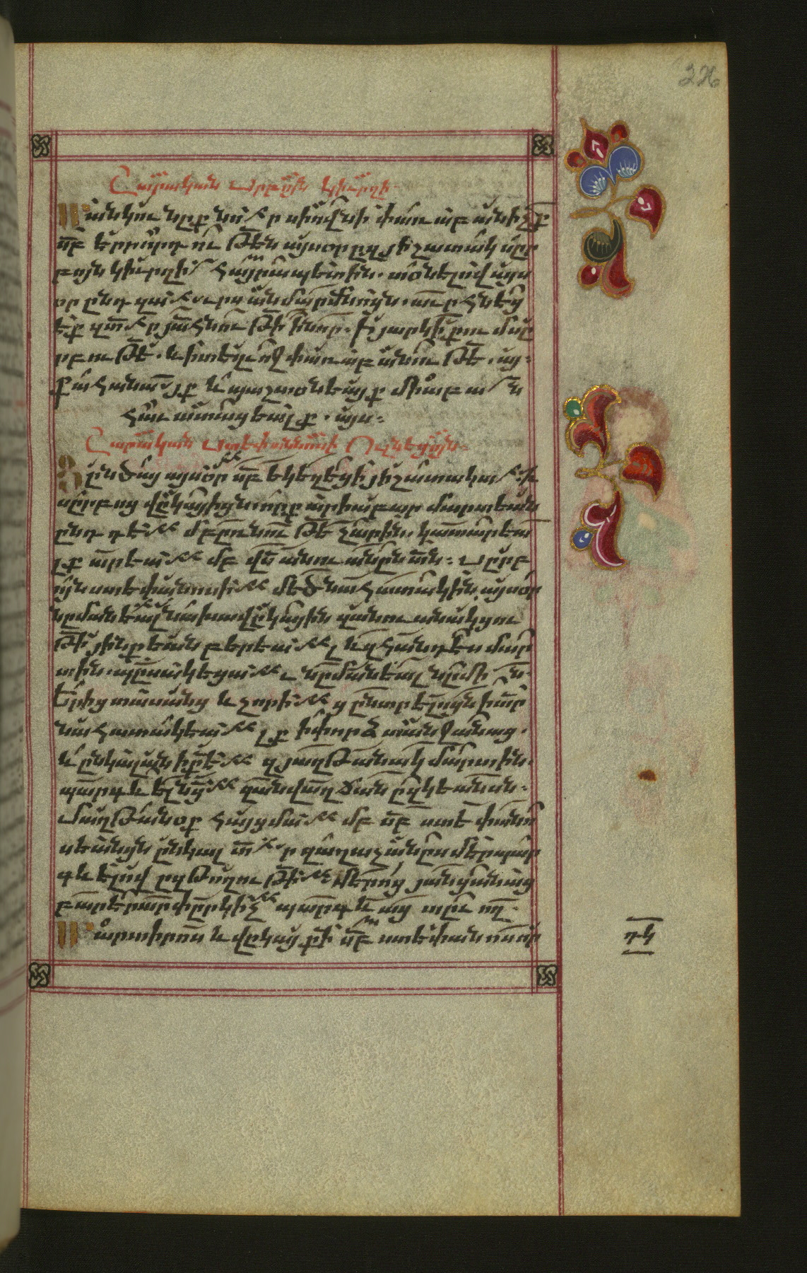 This hymnal was completed in Constantinople on August 15, 1678 [AE 1127], by the priest Yakob Pēligratc‘i, having been commissioned by Člav, son of Nawasard, as a dedication to his sons, Astuacatur and Sahak. The structure of the hymns adheres approximately to the standard Armenian hymnal (Շաբակնոց), with minor variations in order and a few substitutions (see Sanjian in the bibliography). The book is illuminated extensively, with thirty-eight full- and half-page polychrome miniatures against gold backgrounds, eight decorated head-pieces marking the principal divisions of the hymnal, and numerous marginal miniatures marking individual hymns, including biblical figures, saints, bishops, and vignettes. The style of the miniatures is largely in imitation of western European models, though more traditional Armenian and Byzantine influences stand out, such as the vibrant color palette, an iconic frontality for depictions of saints and bishops, and the highly abstracted floral motifs and zoomorphic incipits marking hymn divisions.